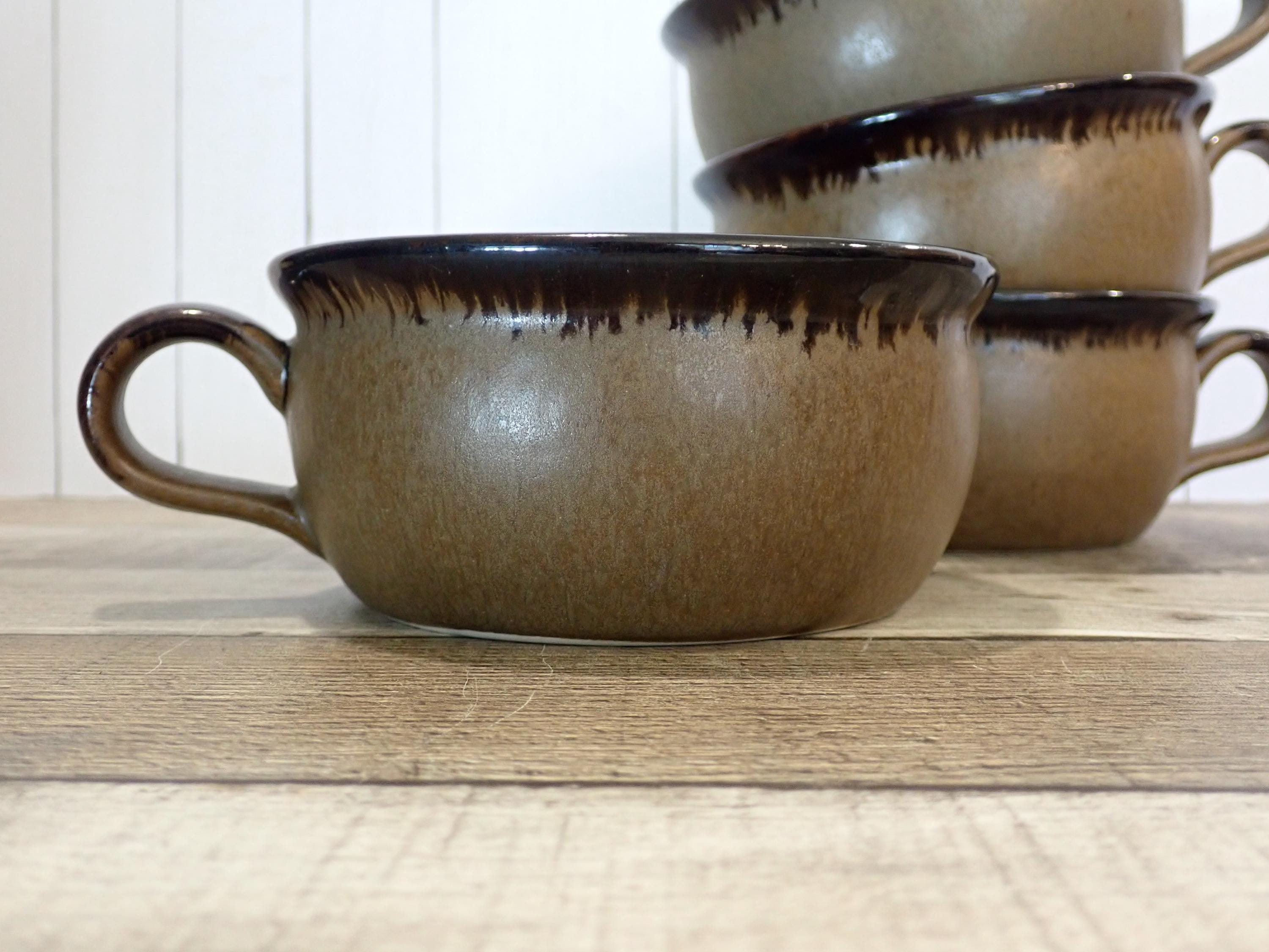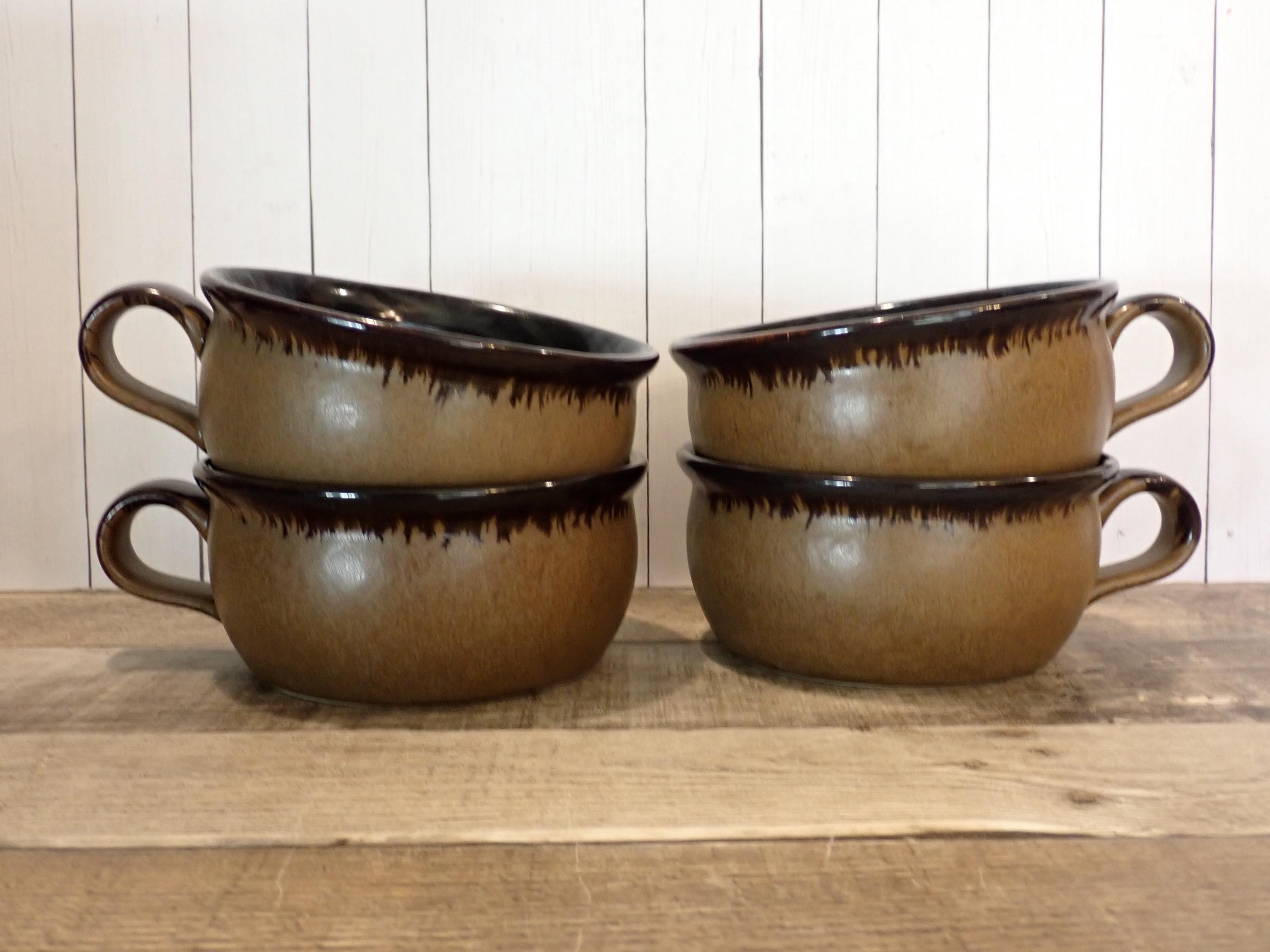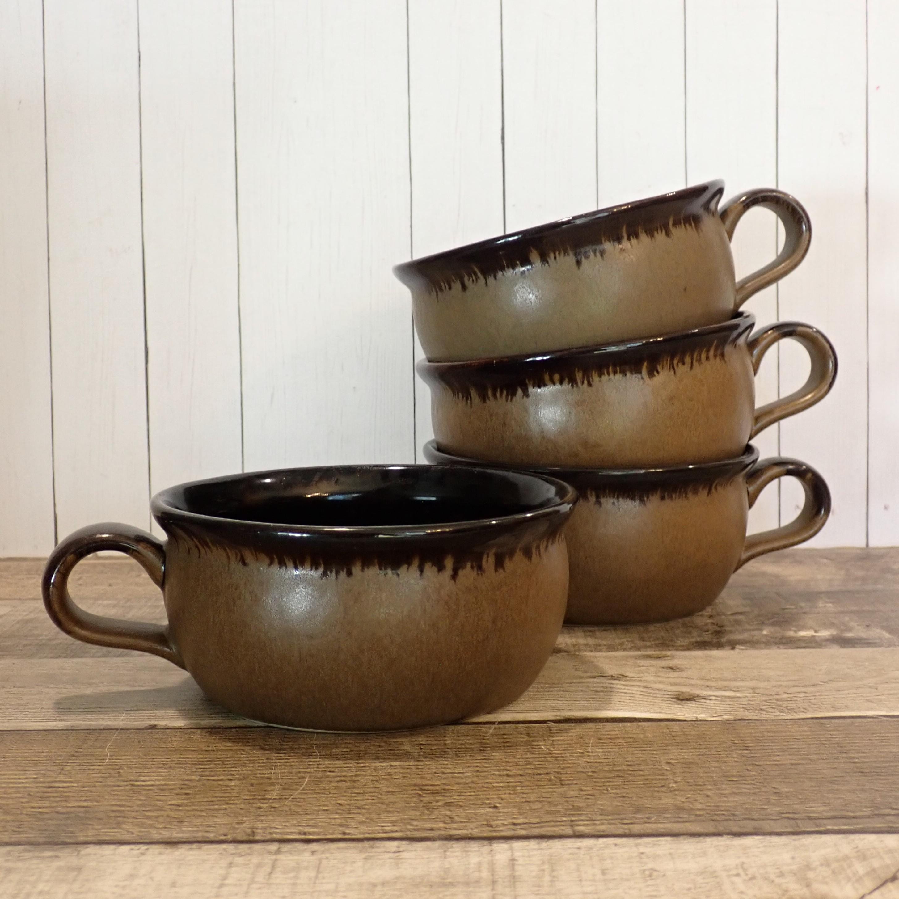 This set of ceramic soup bowls includes 4 matching bowls in the same pattern. They are 5.5" in diameter (7" wide with the handle), and 2.5" high. They are a brown and tan stoneware with a brown drip edge. All 4 bowls are in very good condition with no chips or cracks.