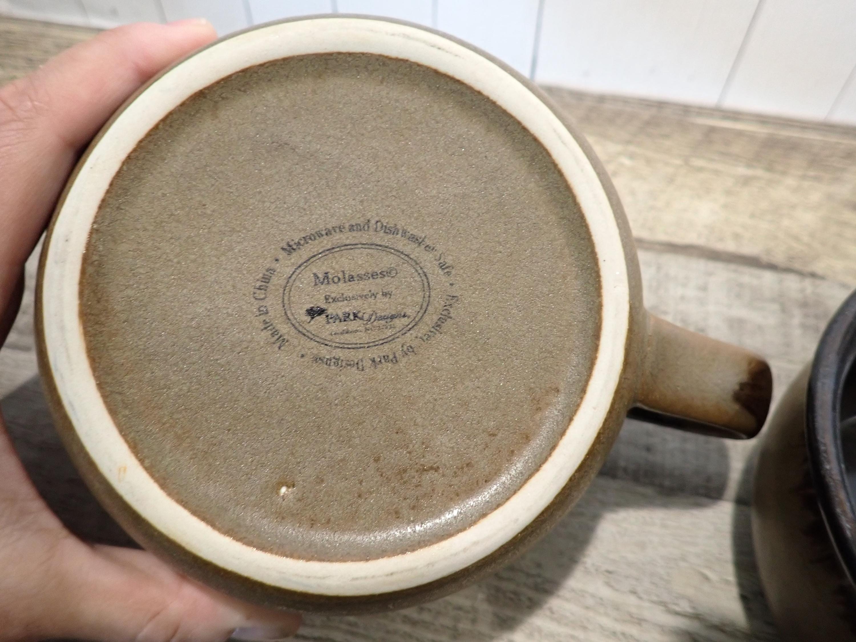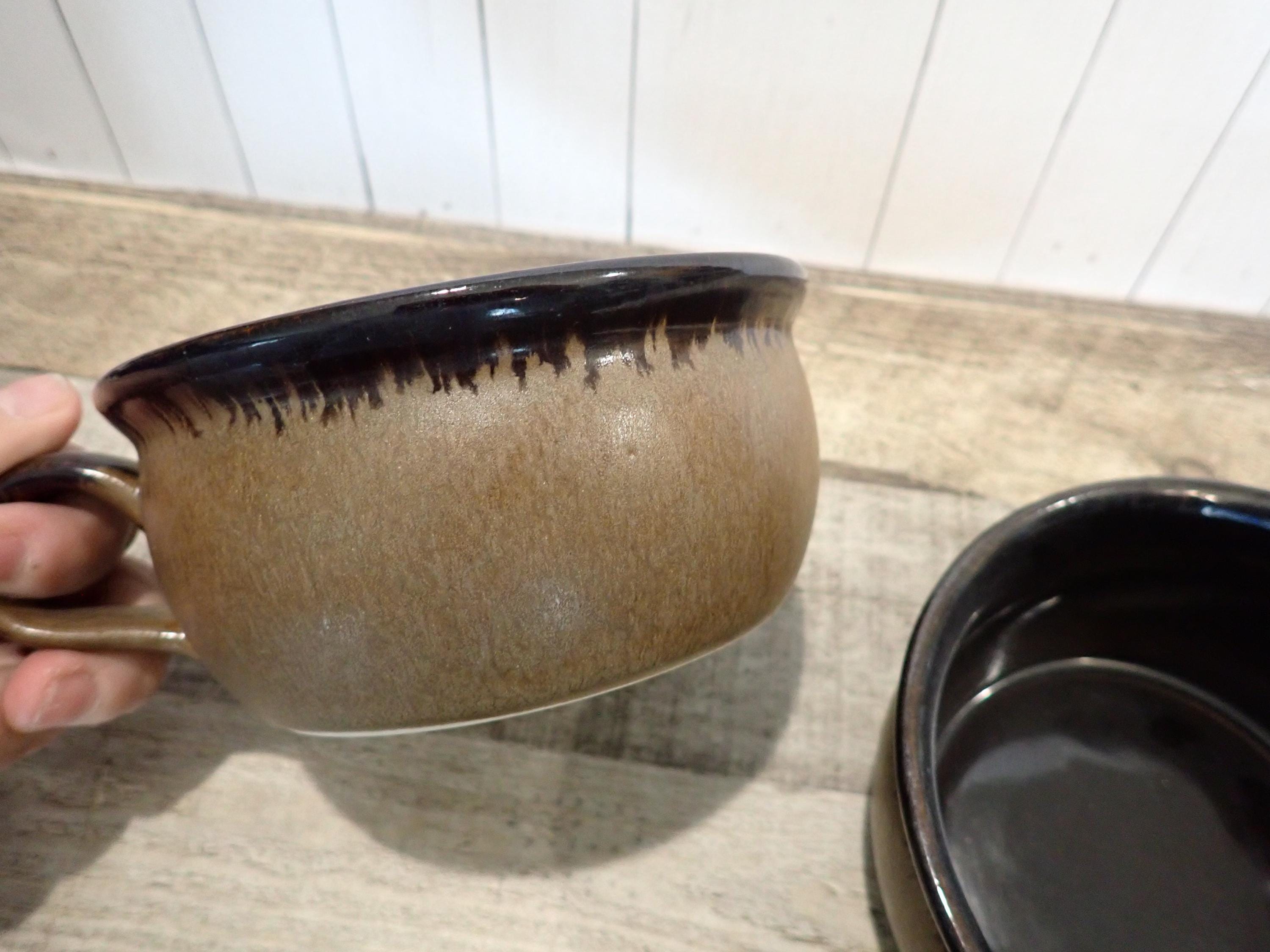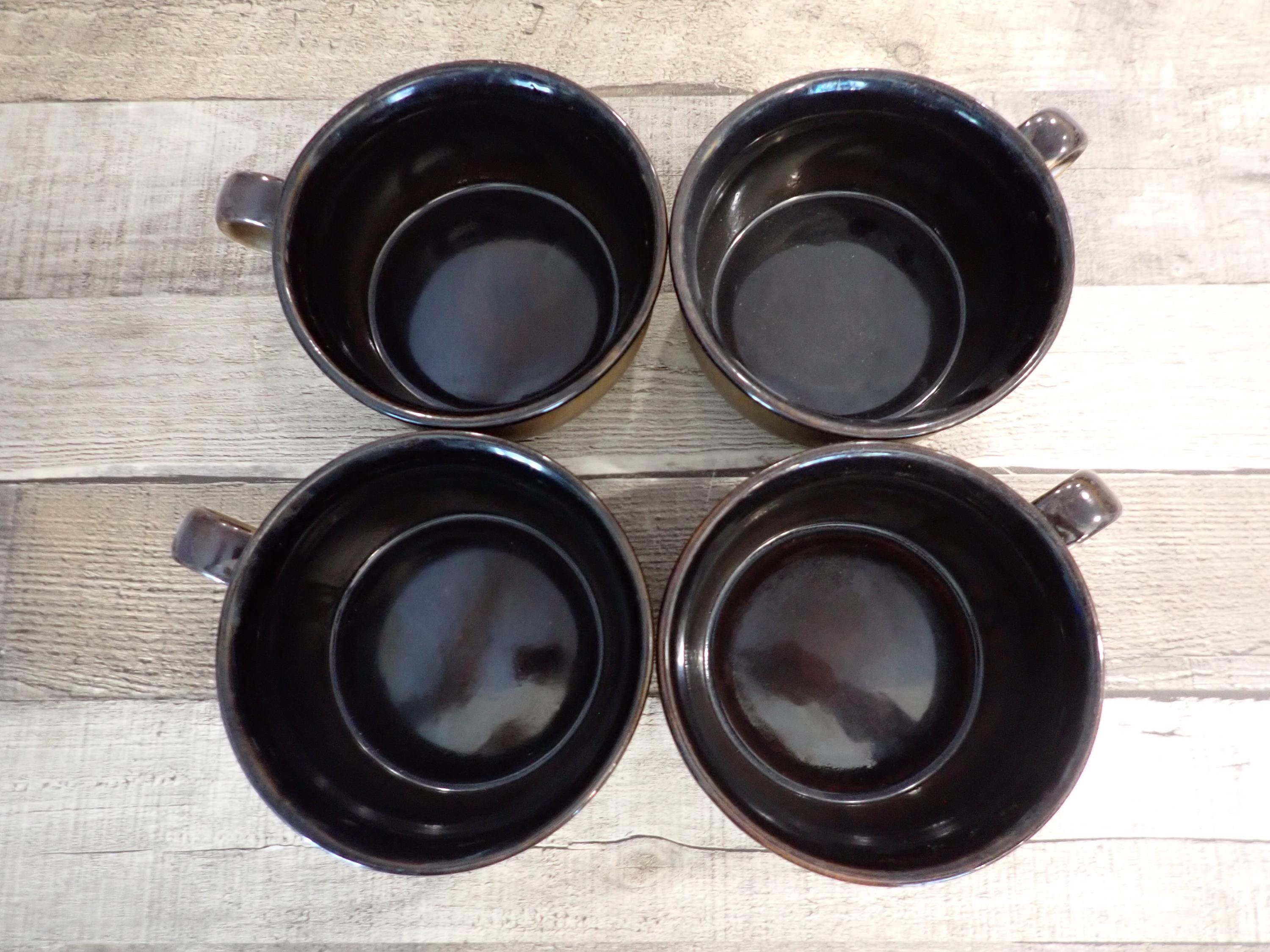 This set of ceramic soup bowls includes 4 matching bowls in the same pattern. They are 5.5" in diameter (7" wide with the handle), and 2.5" high. They are a brown and tan stoneware with a brown drip edge. All 4 bowls are in very good condition with no chips or cracks.