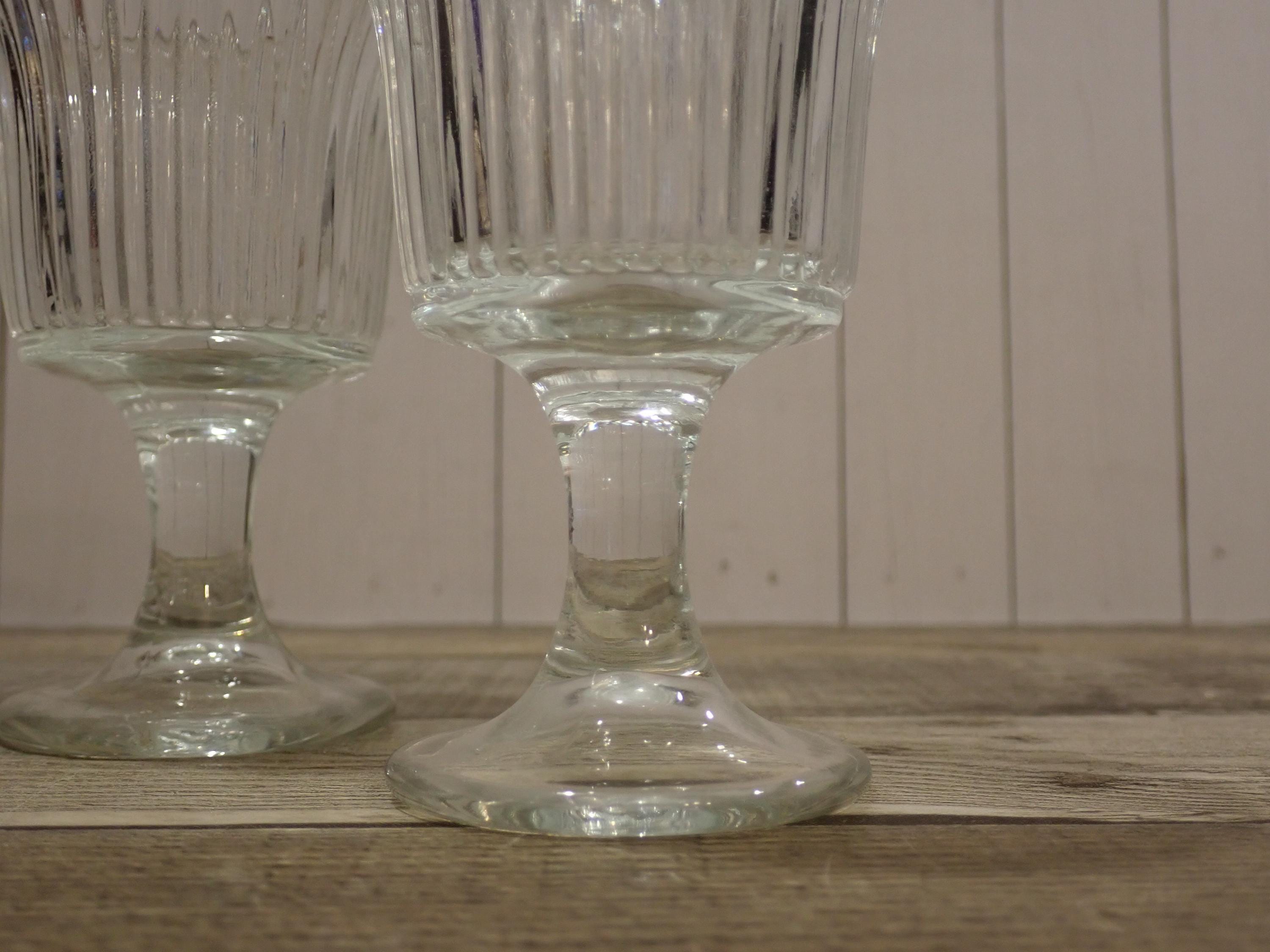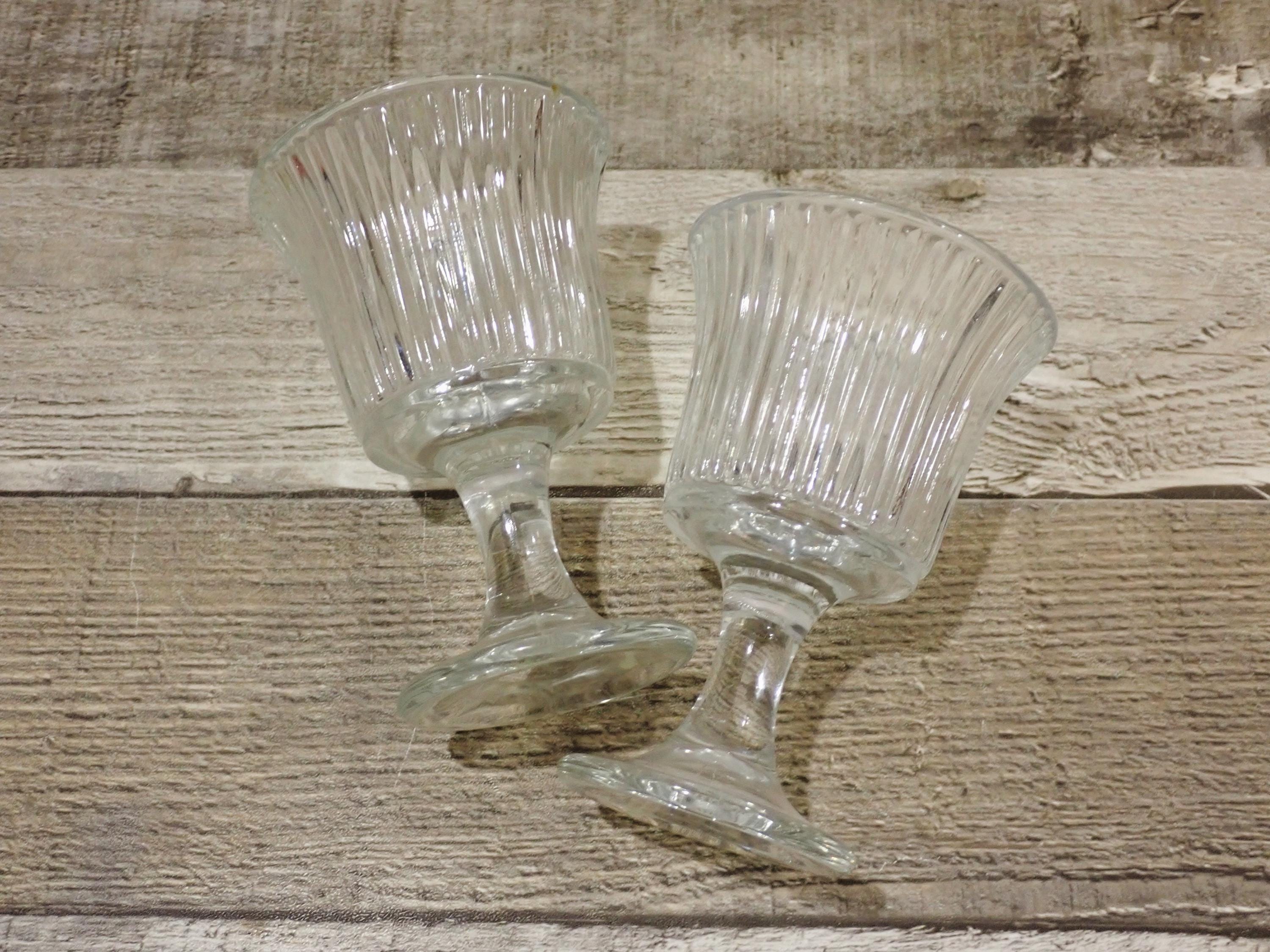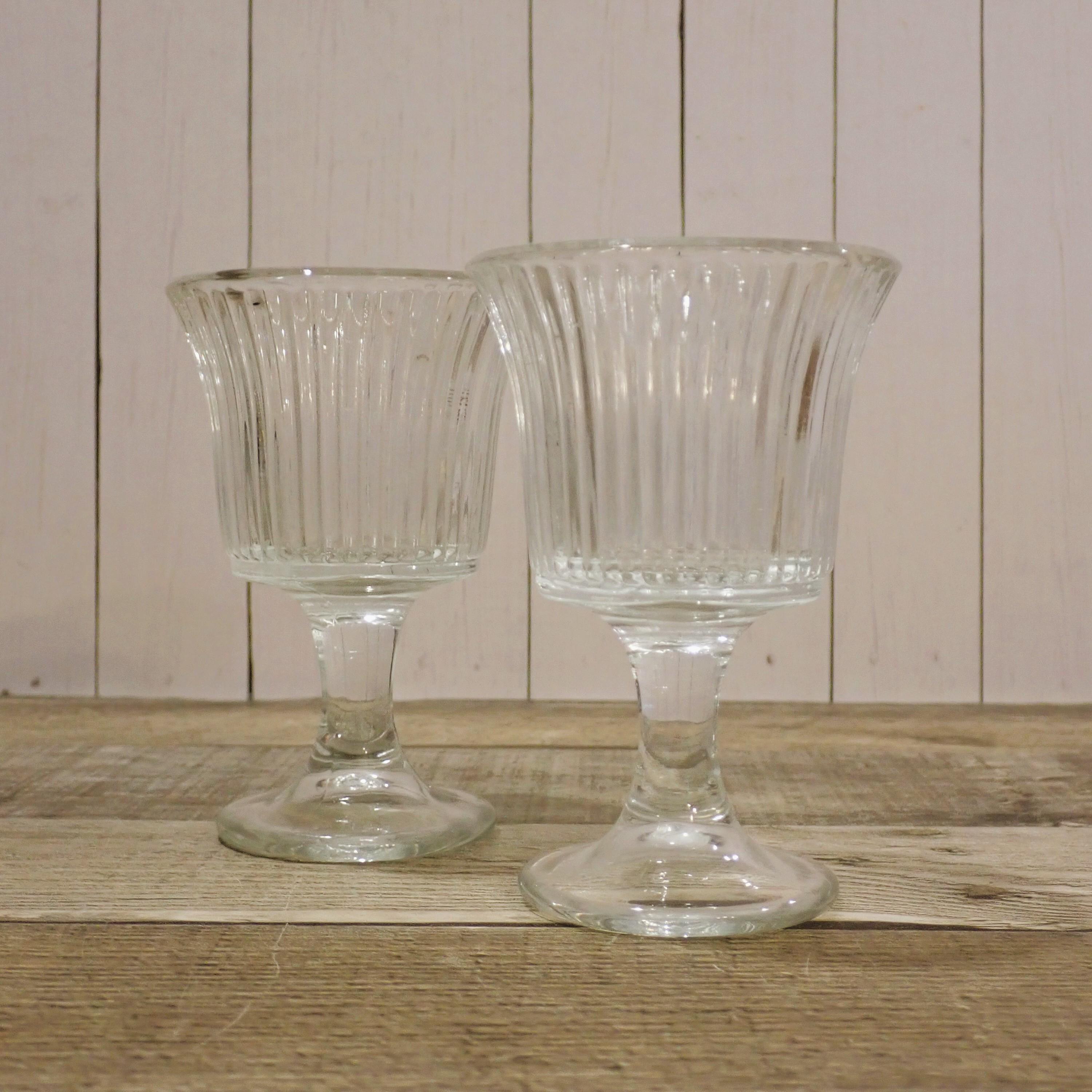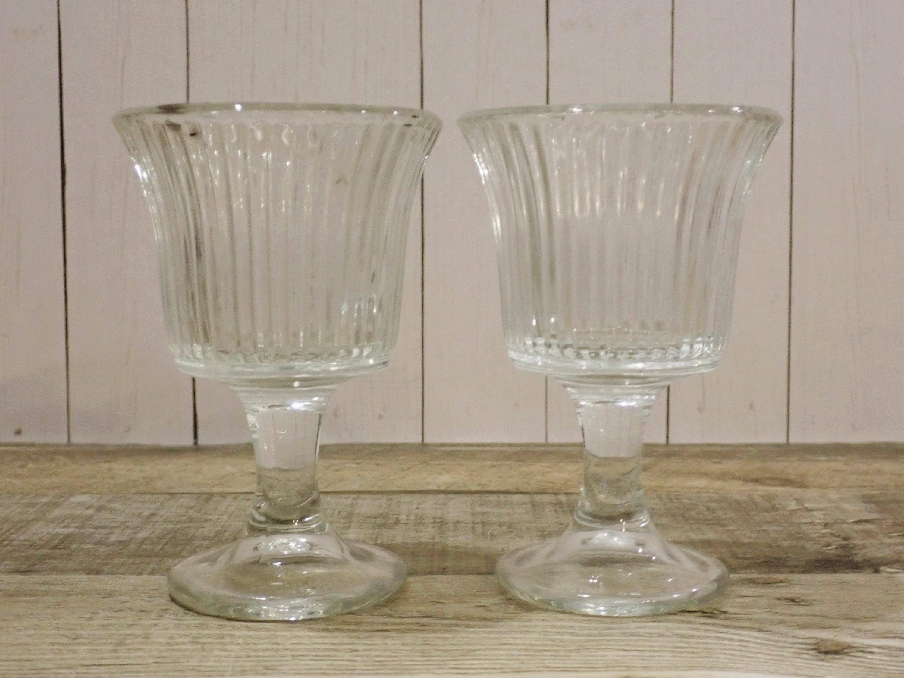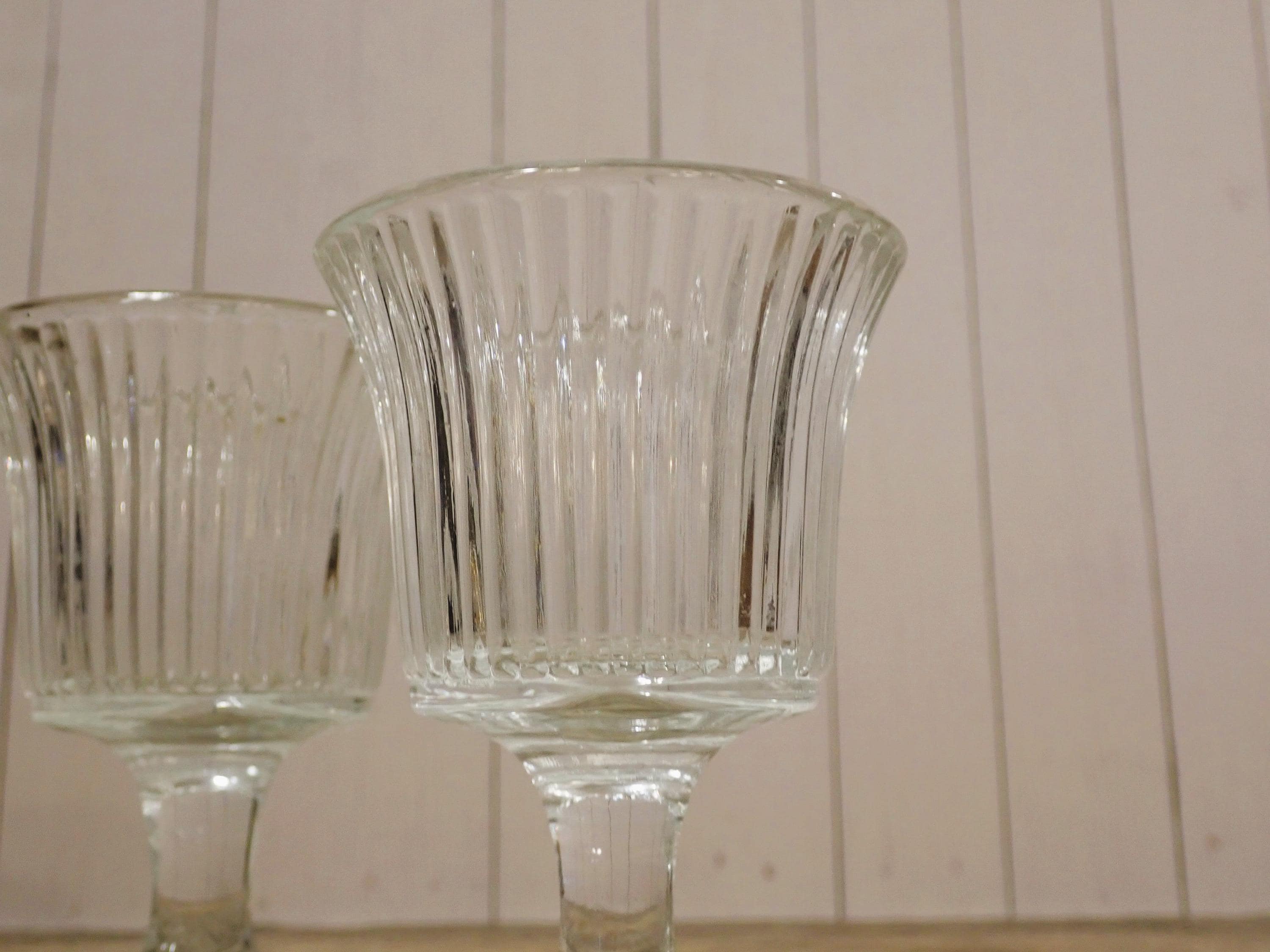 This set of candle holders includes 2 matching clear glass candle holders with a round footed base. They are 4.25" tall and 2.75" in diameter. They are a clear glass with a round footed base and a vertical ribbed design in the glass. The opening is 2.25" in diameter to hold a tealight candle or a votive candle. The candle holders are in very nice condition with no chips or cracks.