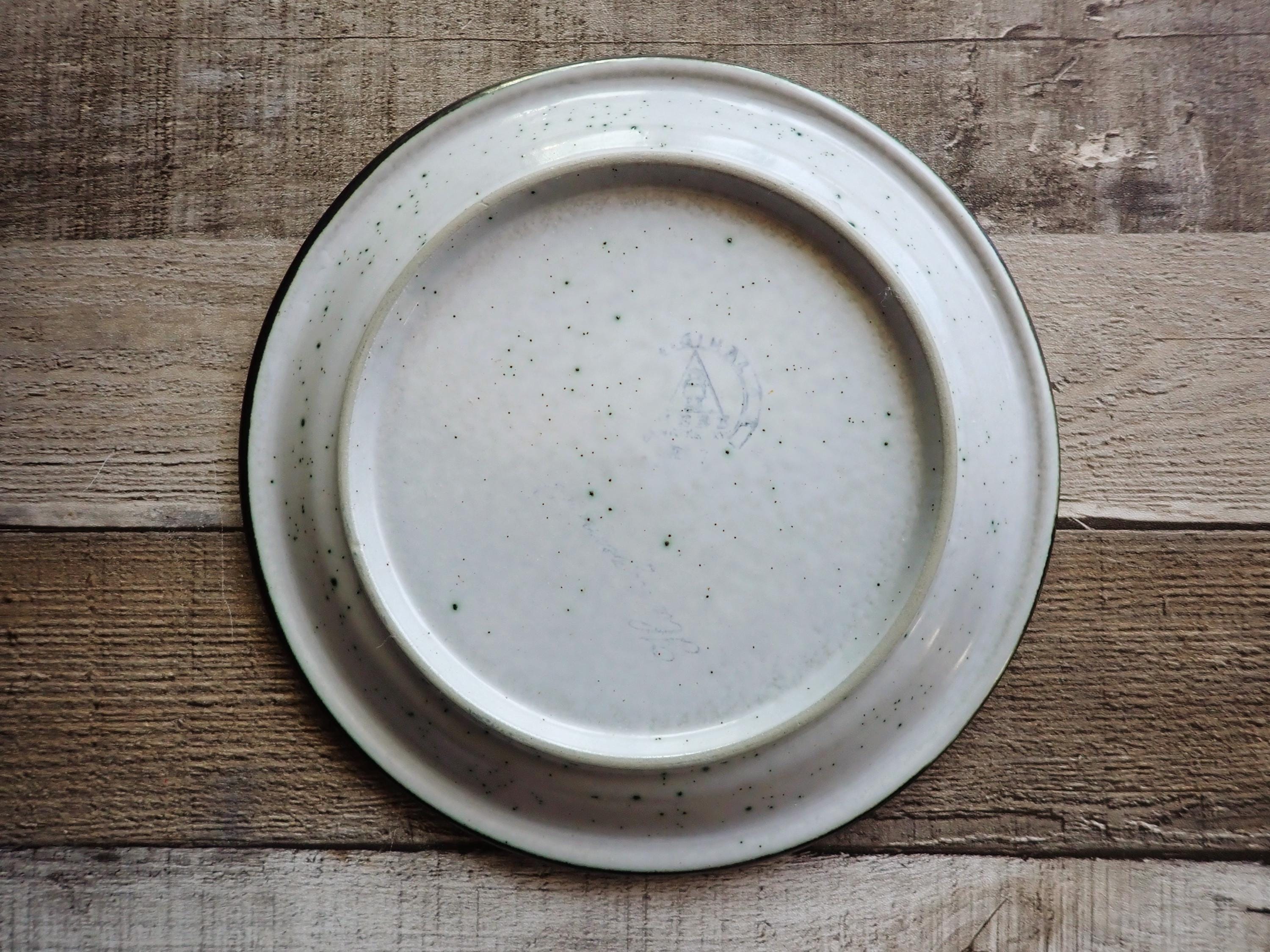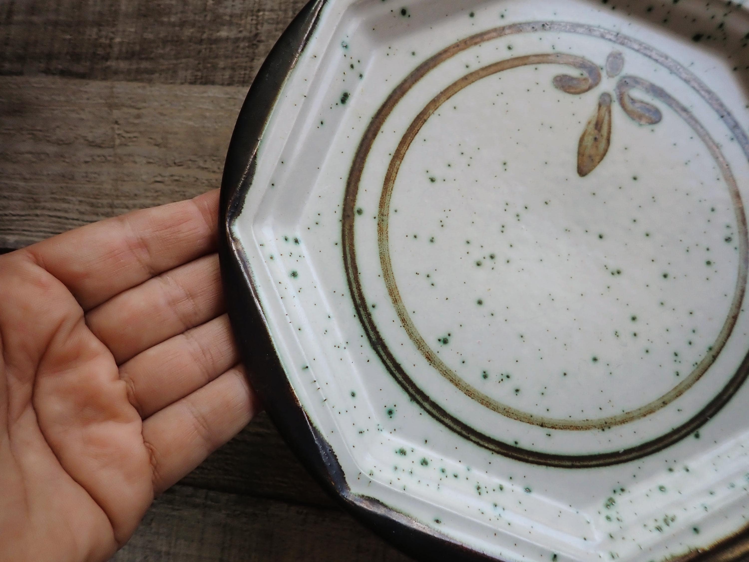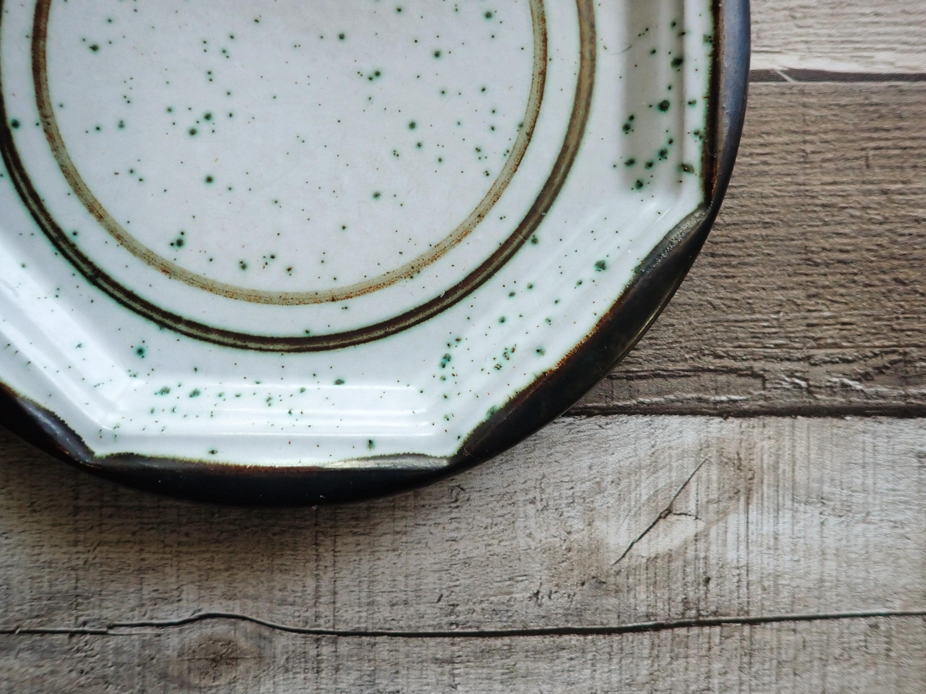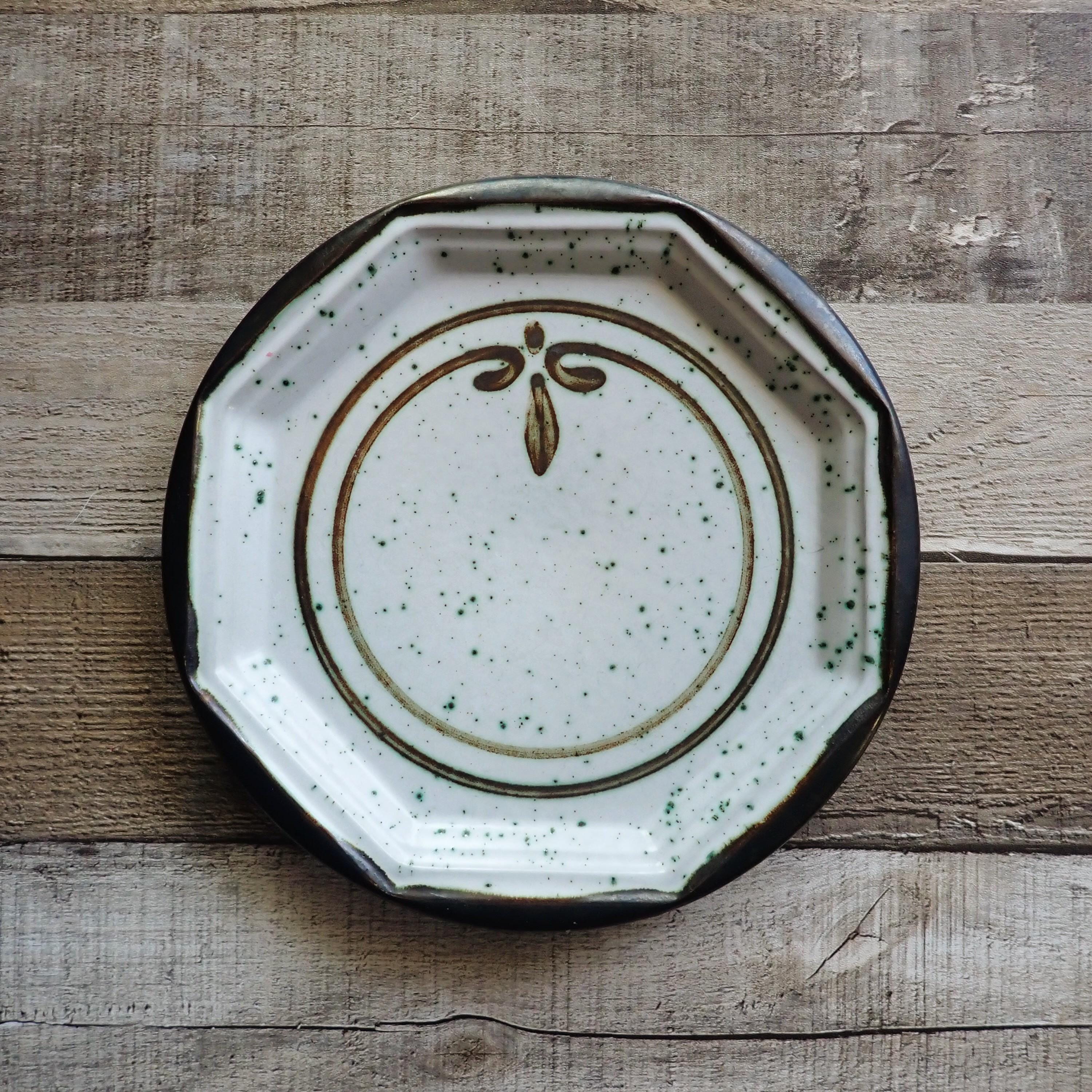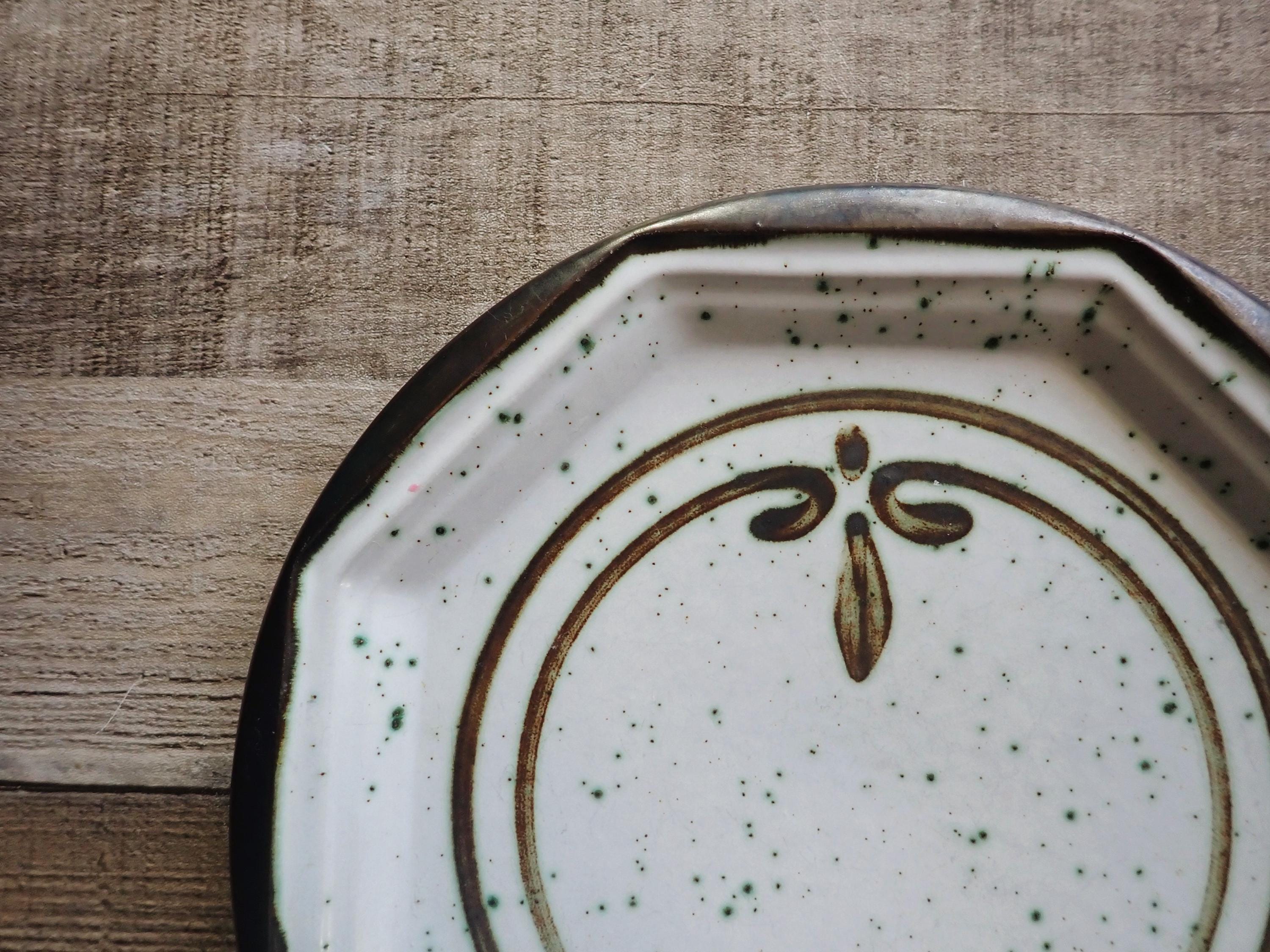 This singe stoneware plate by Gerzit is 8.25" in diameter and is a brown and white plate with a circle design. The plate is round with an octagon edge inside the rim. The back is marked with a makers logo. The plate is in very nice condition with no chips or cracks. There are some light scratches from use.