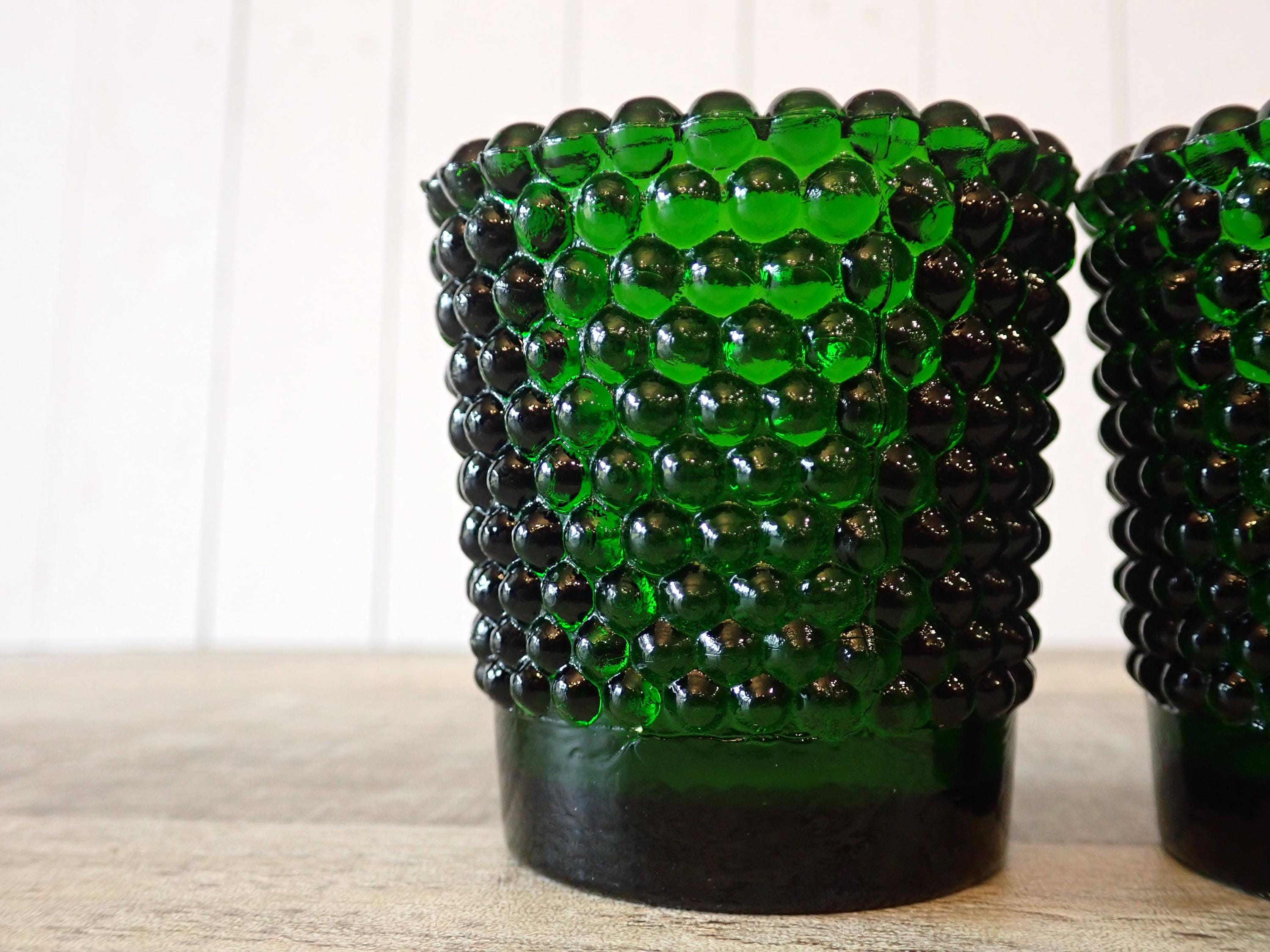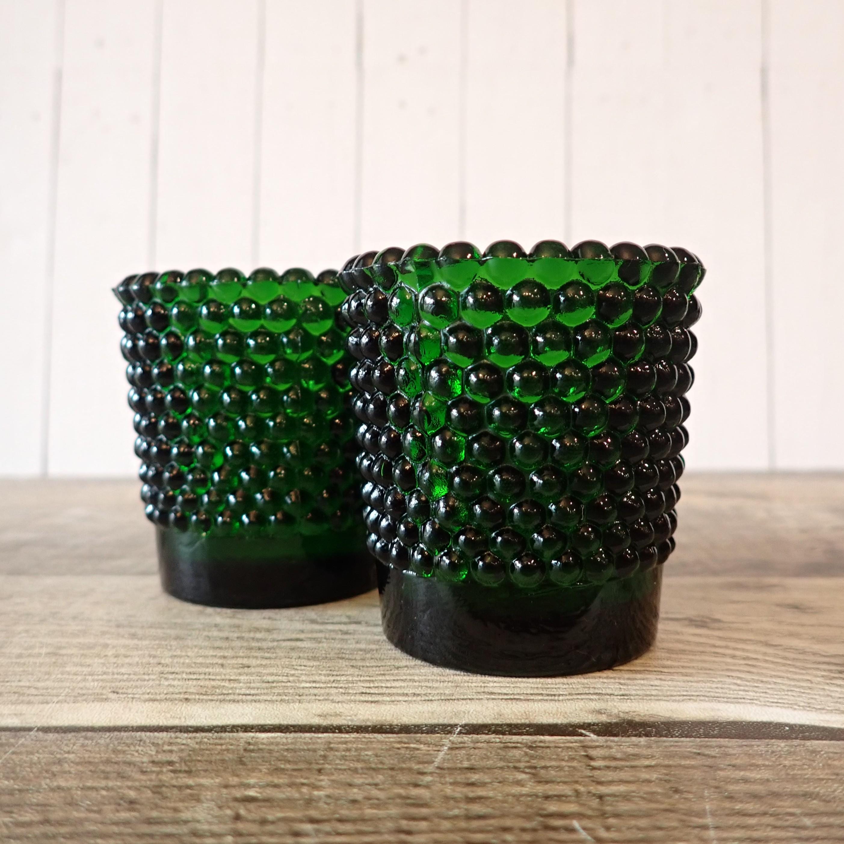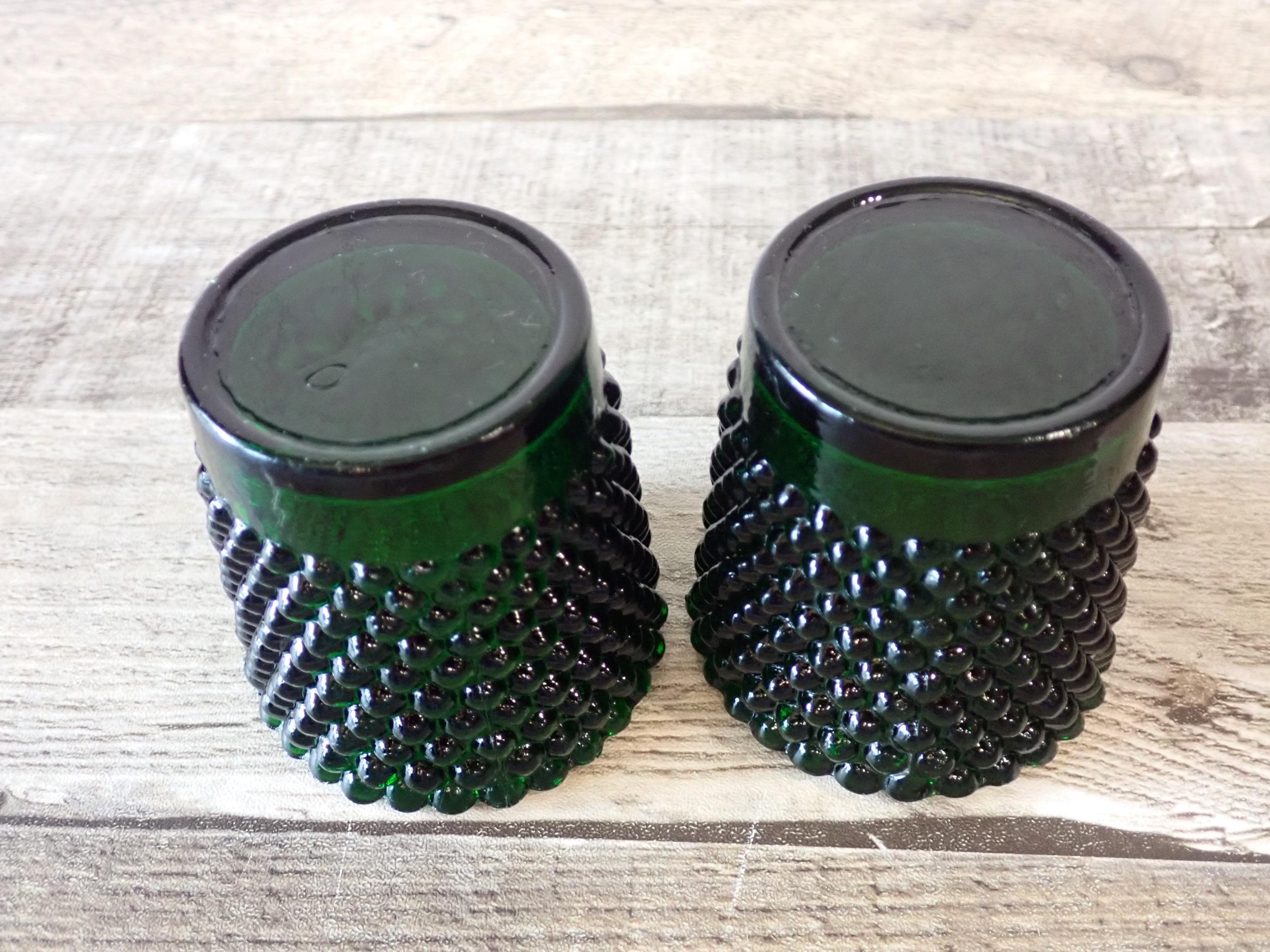 This set of candle holders includes 2 matching green glass candle holders in a Hobnail pattern. They are 2.5" tall and 2.25" in diameter. They are a green glass with a round base. The opening it 1.75" in diameter to hold a tealight candle or a votive candle. The candle holders are in very nice condition with no chips or cracks.