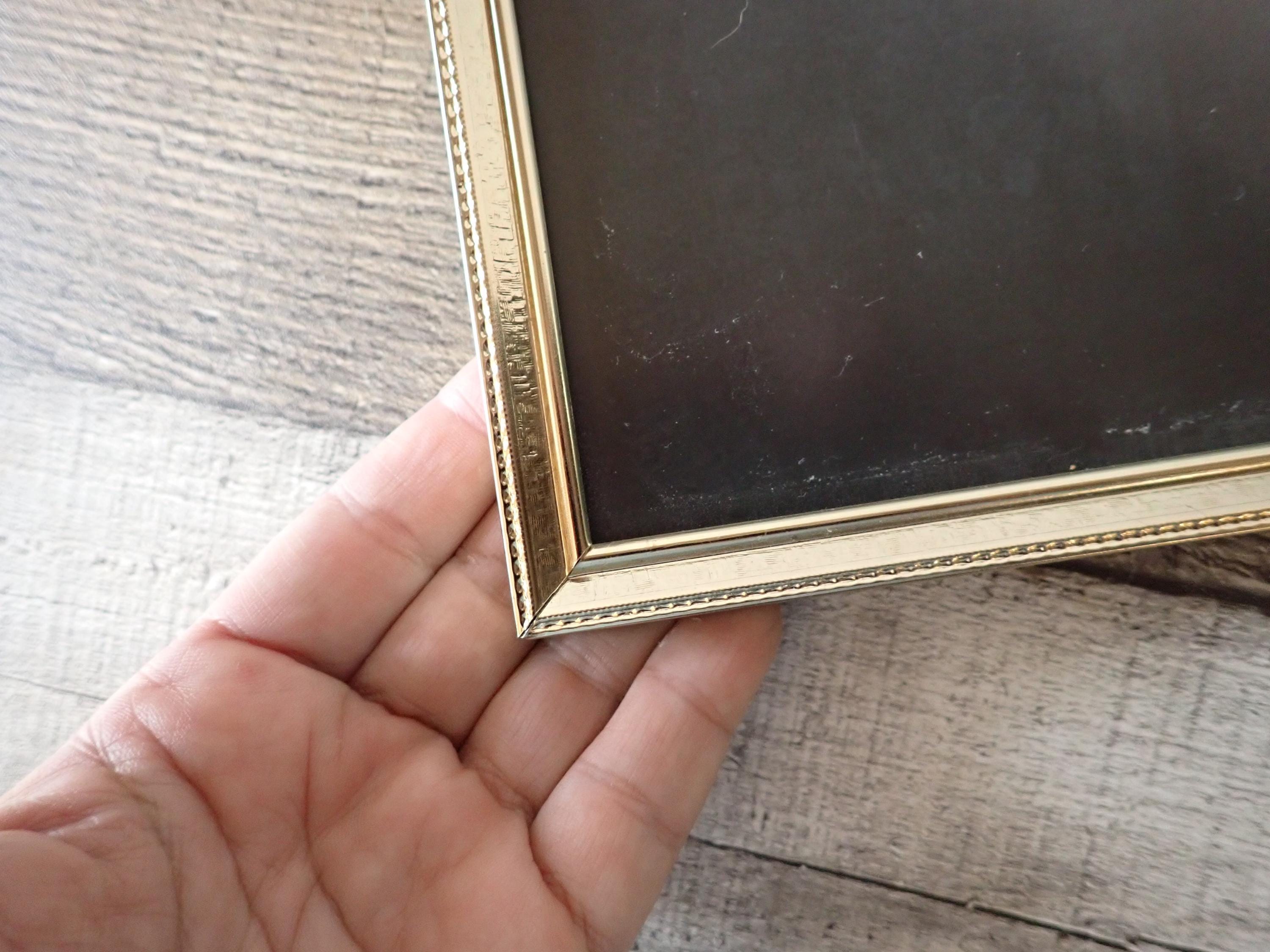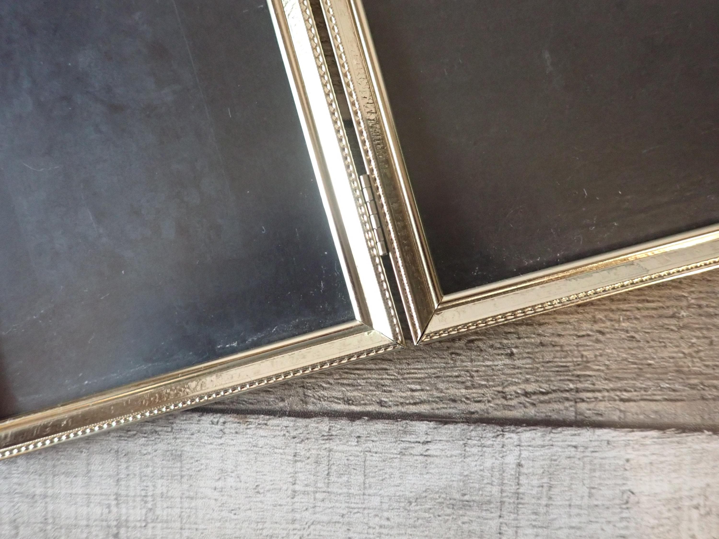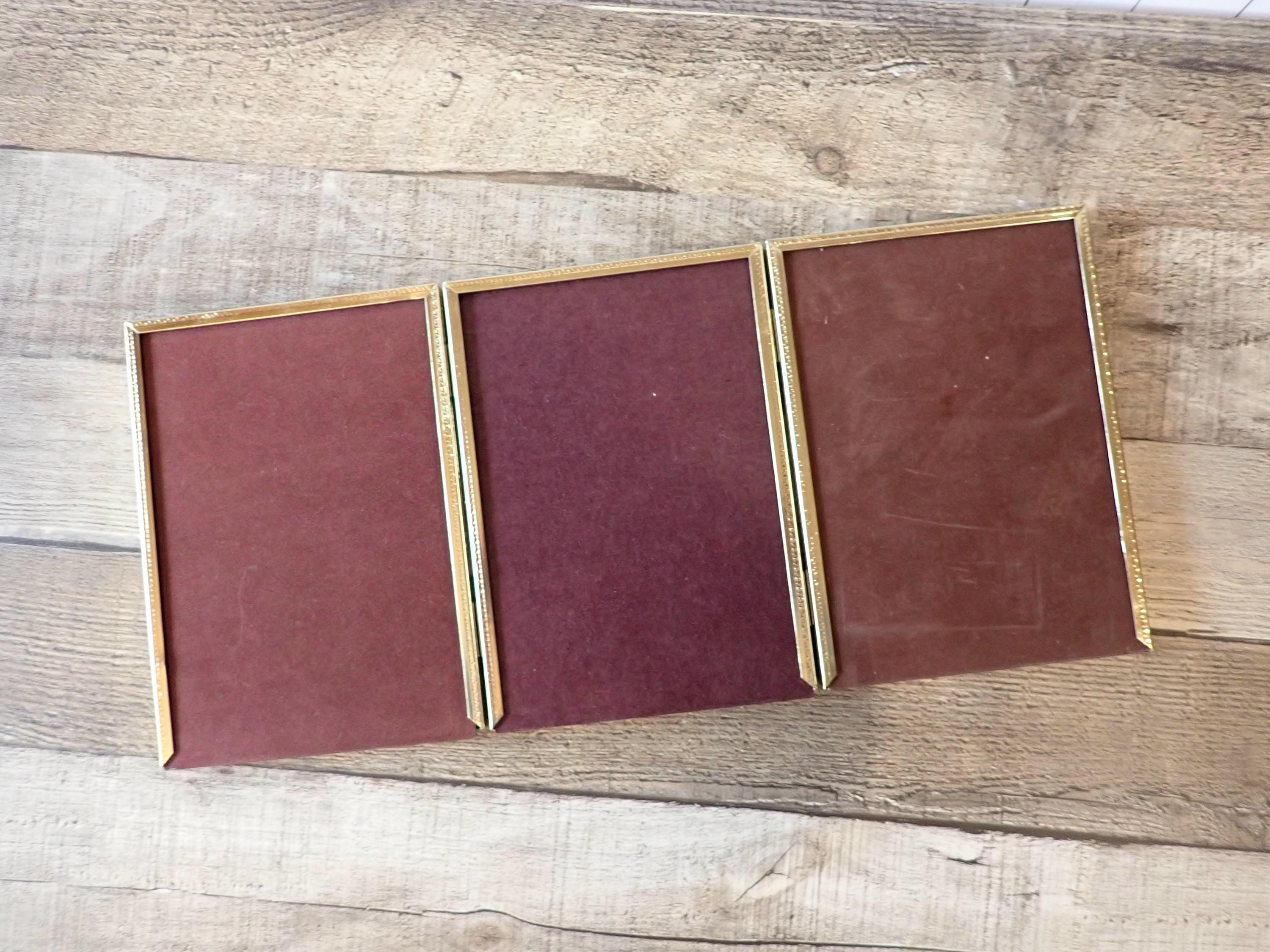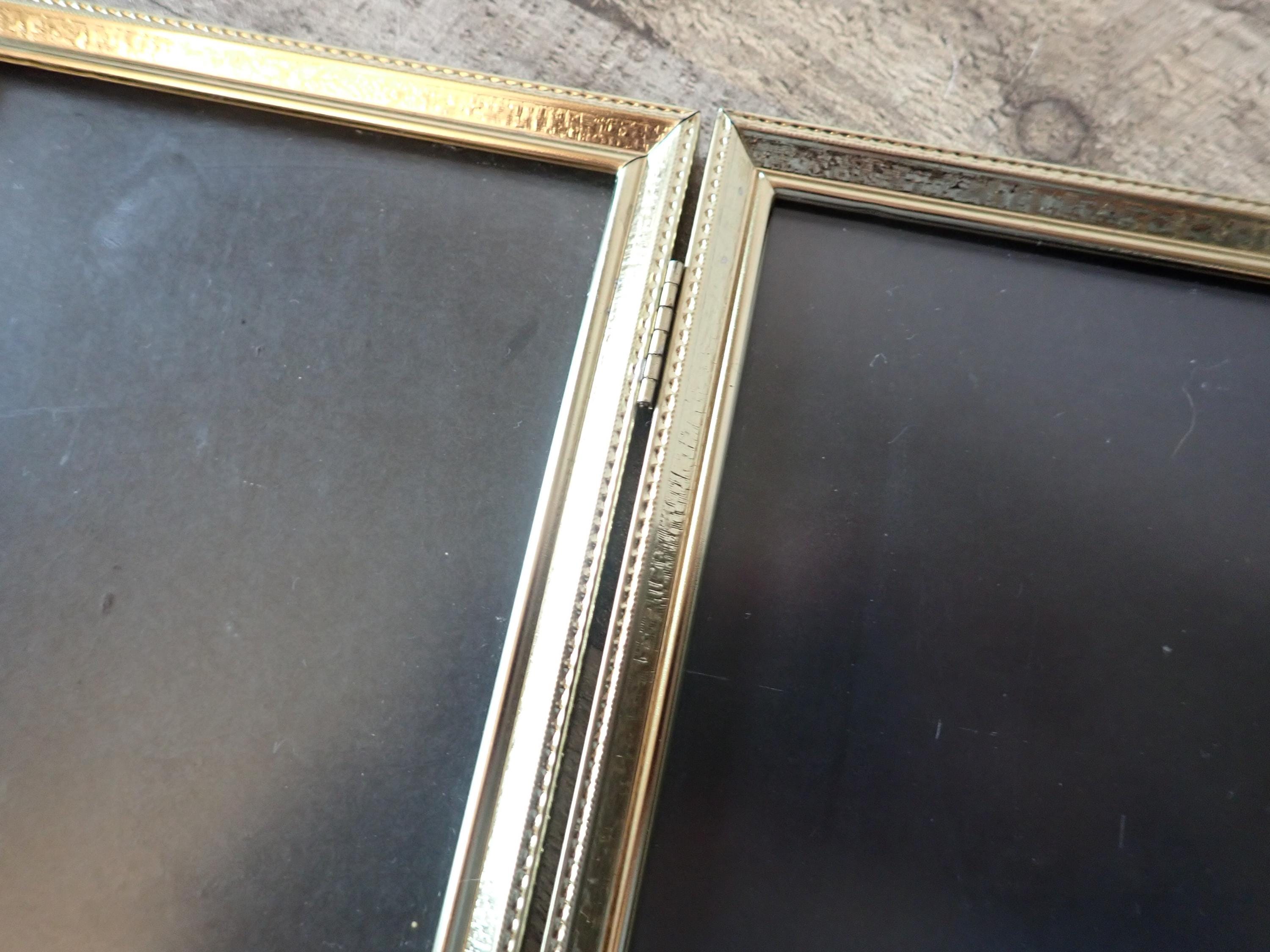 This 5x7 brass colored metal photo frames is a 3-part hinged frame with 3 5x7 frames. The frame is nicely detailed with etched designs along the front and sides of the frames. The frame is in very nice condition with no damage, and has clear glass inserts over the photo openings and cardboard backing pieces on all 3 frame sections.