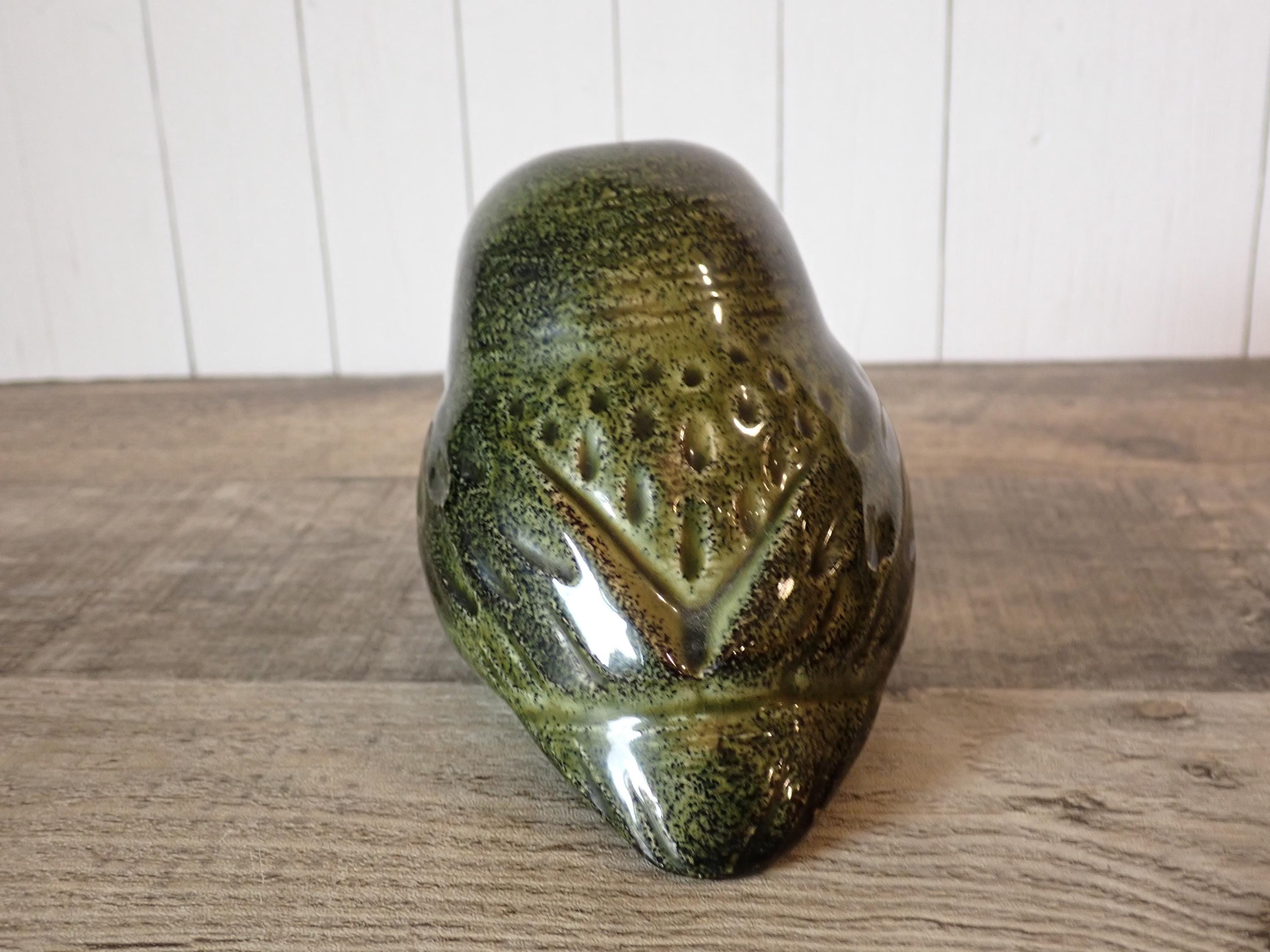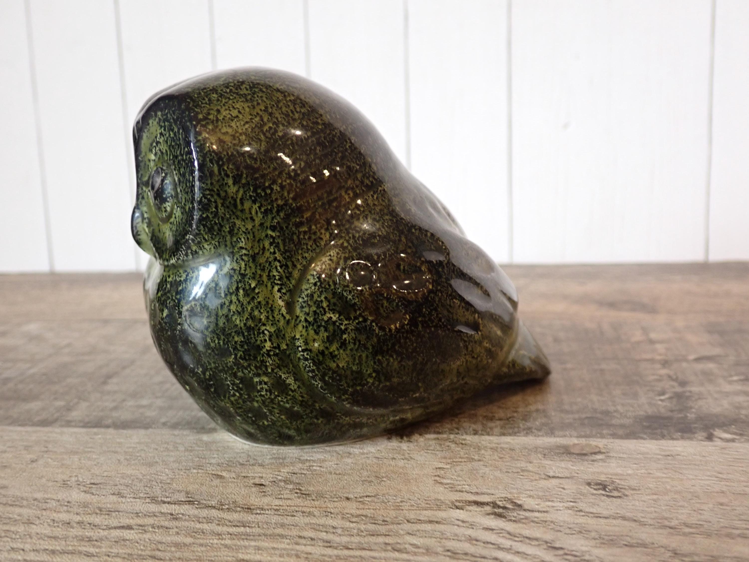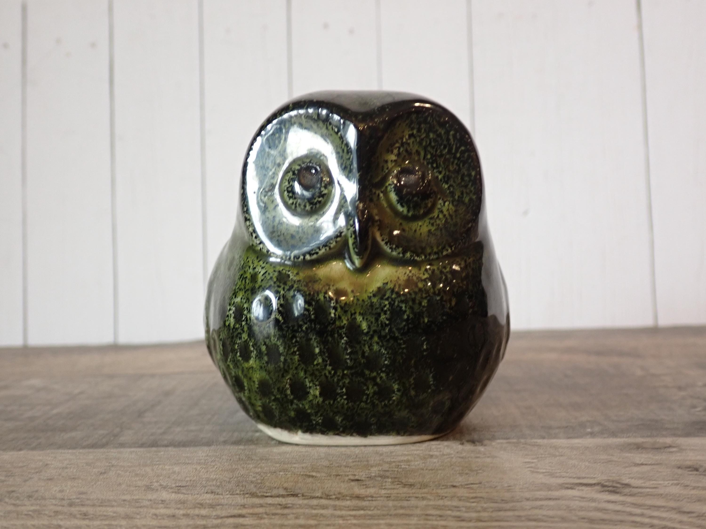This small ceramic owl figurine is 3.5" tall, 4" long, and 3" wide. It is ceramic piece with a dark green glaze and has subtle etched accents on the owls body. The owl is in very nice condition with no chips or cracks.