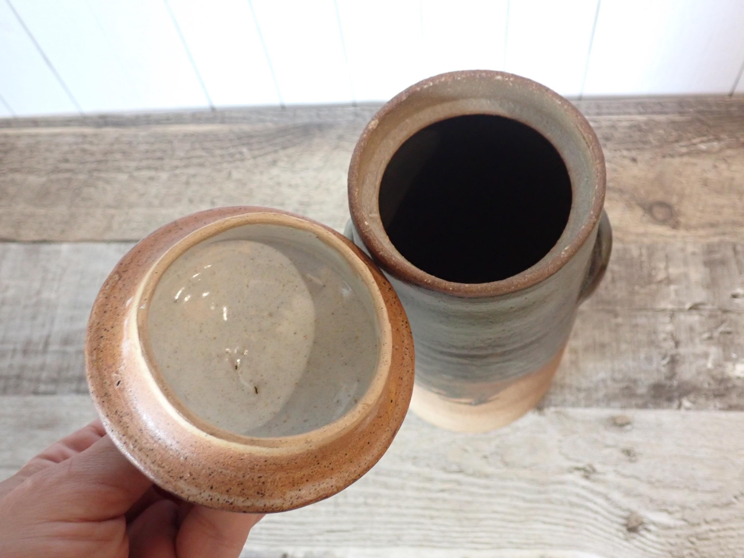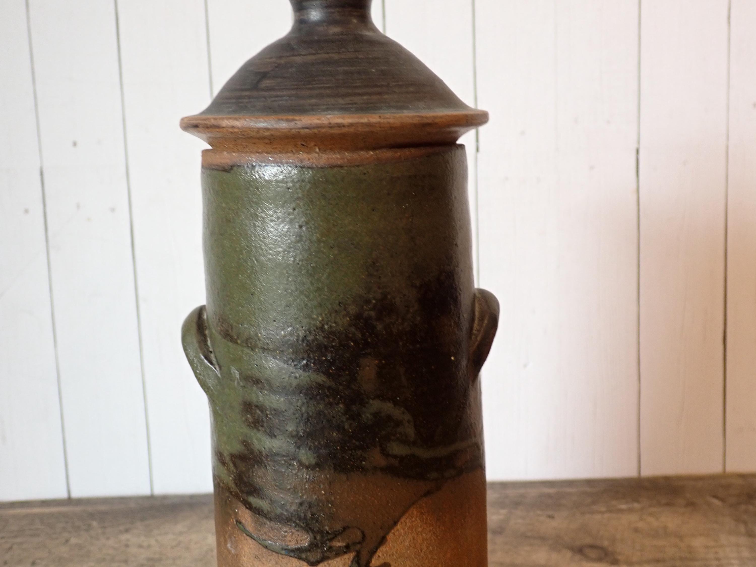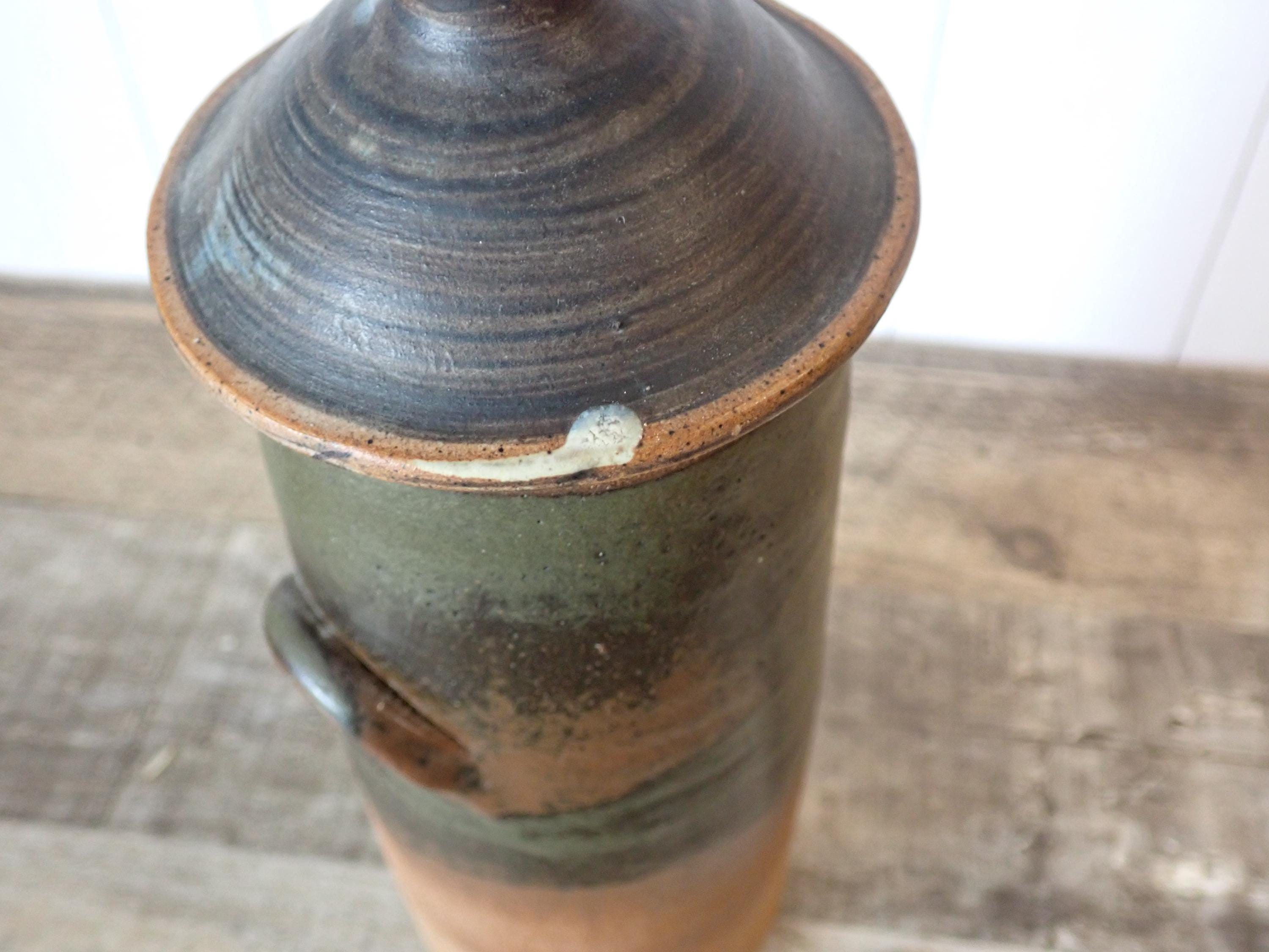 This stoneware jar with lid is 9.5" tall with the lid and 3.5" in diameter at the base. It is a tan stoneware piece with green and brown glazes. The jat has a lid with a round knob style handle. The bottom of the jar is stamped with an anchor shaped makers mark and the word HAYLE. The jar is in very good condition, however there are 2 very small nicks on the inner rim as shown in the photos. There is also one spot of a white glaze on the lid.
