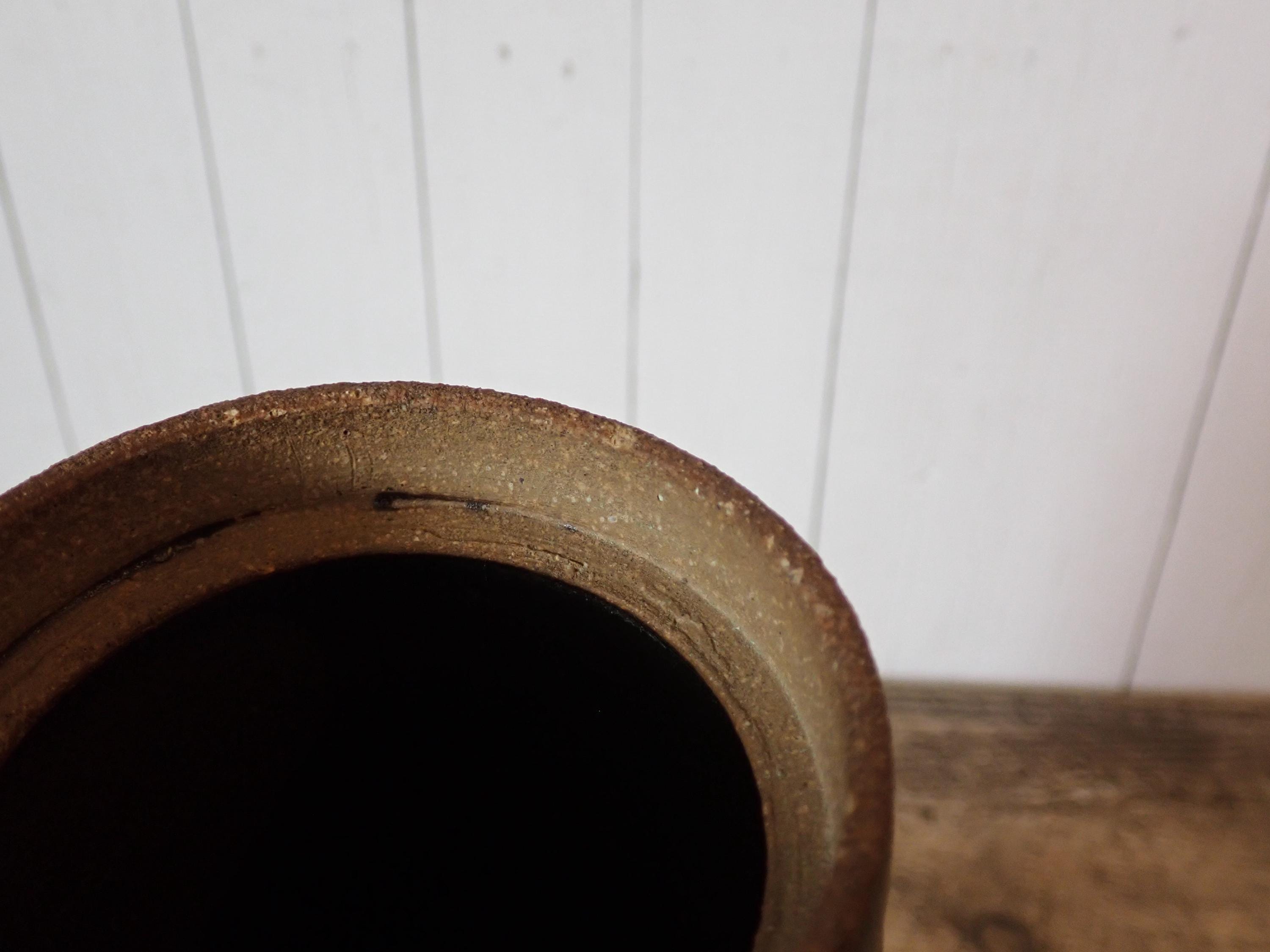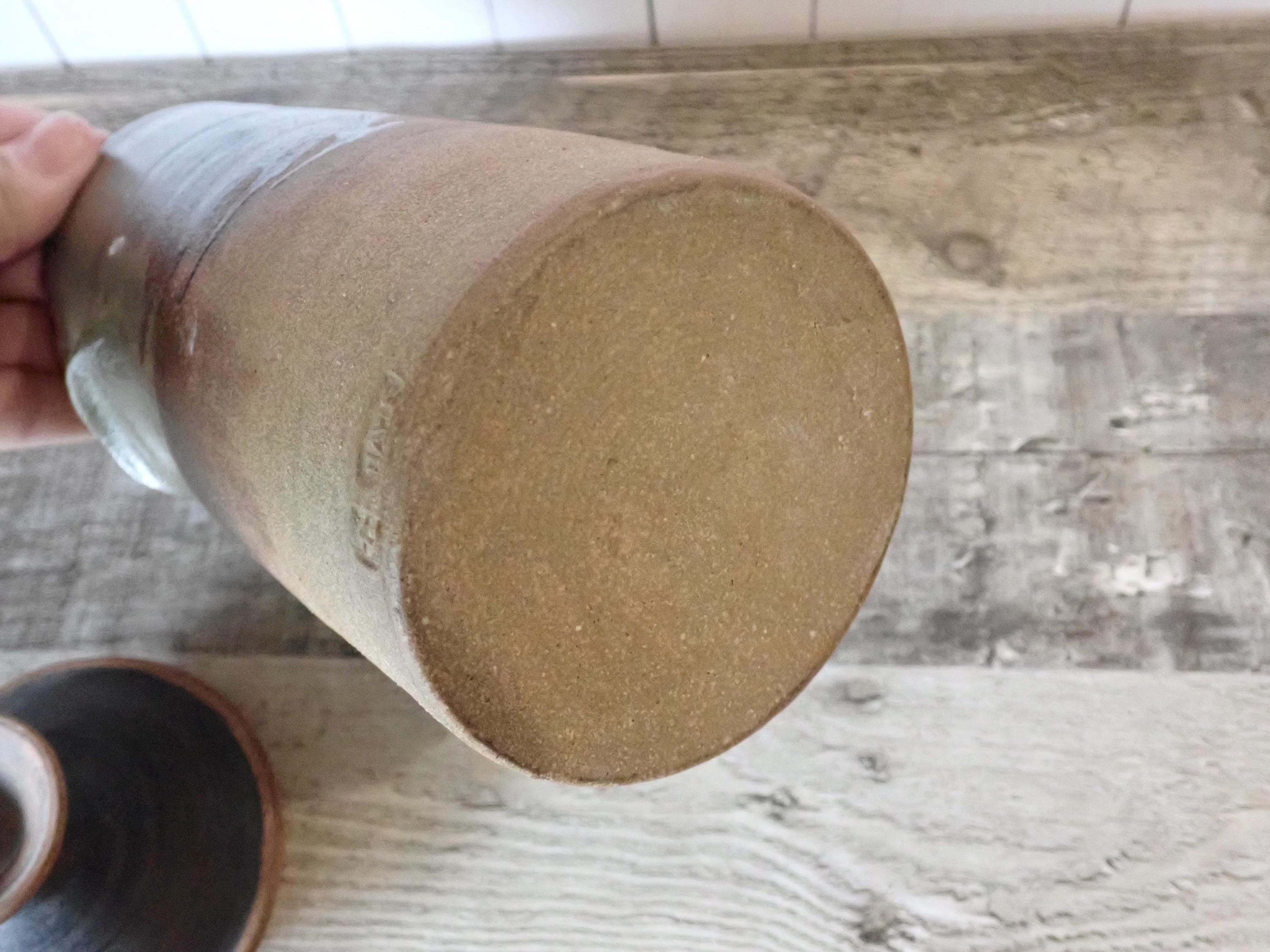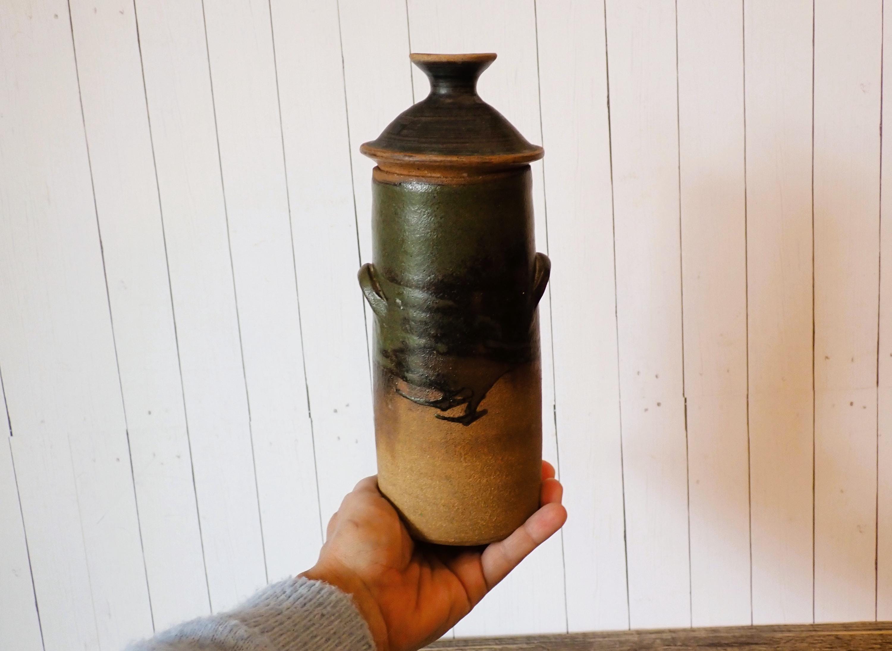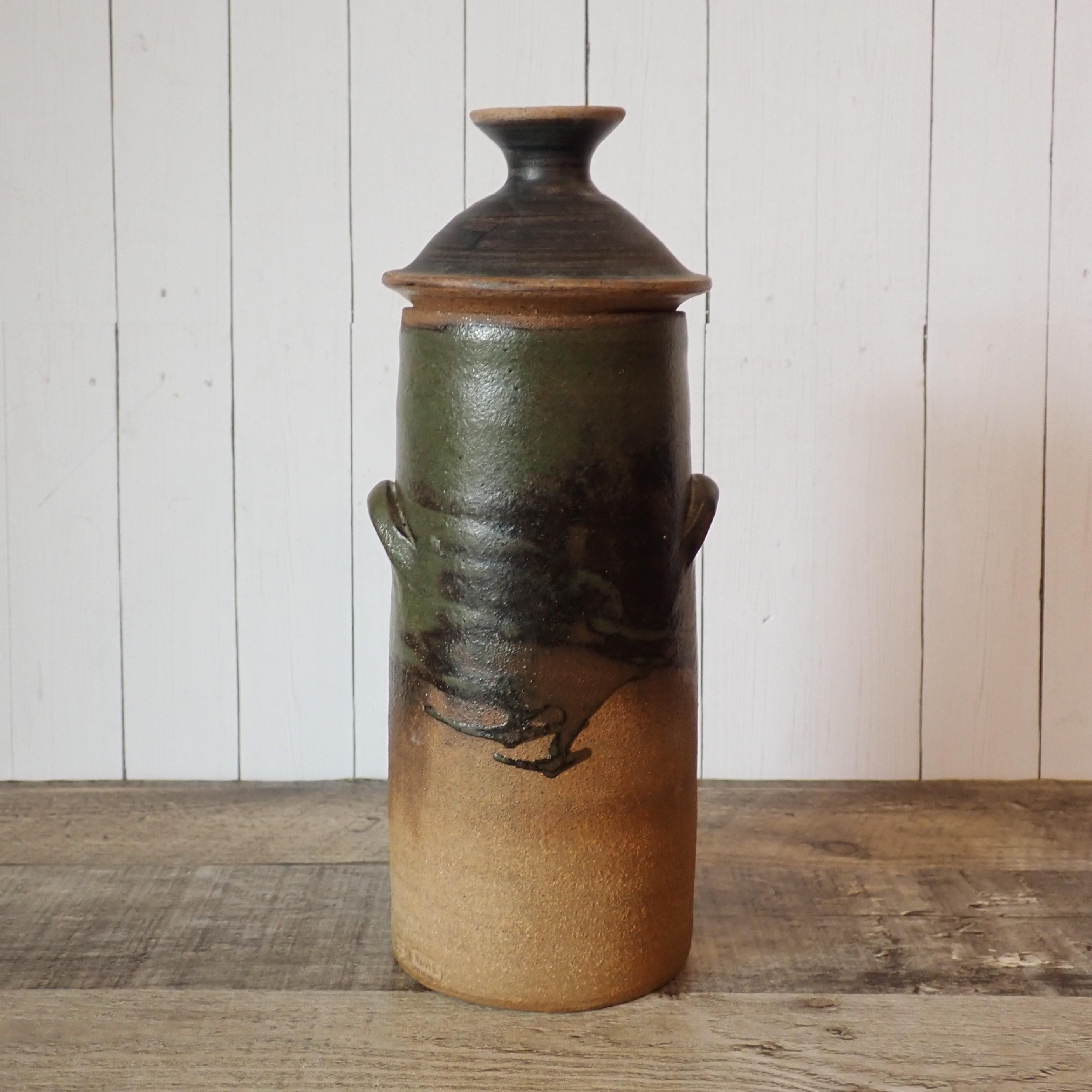 This stoneware jar with lid is 9.5" tall with the lid and 3.5" in diameter at the base. It is a tan stoneware piece with green and brown glazes. The jat has a lid with a round knob style handle. The bottom of the jar is stamped with an anchor shaped makers mark and the word HAYLE. The jar is in very good condition, however there are 2 very small nicks on the inner rim as shown in the photos. There is also one spot of a white glaze on the lid.