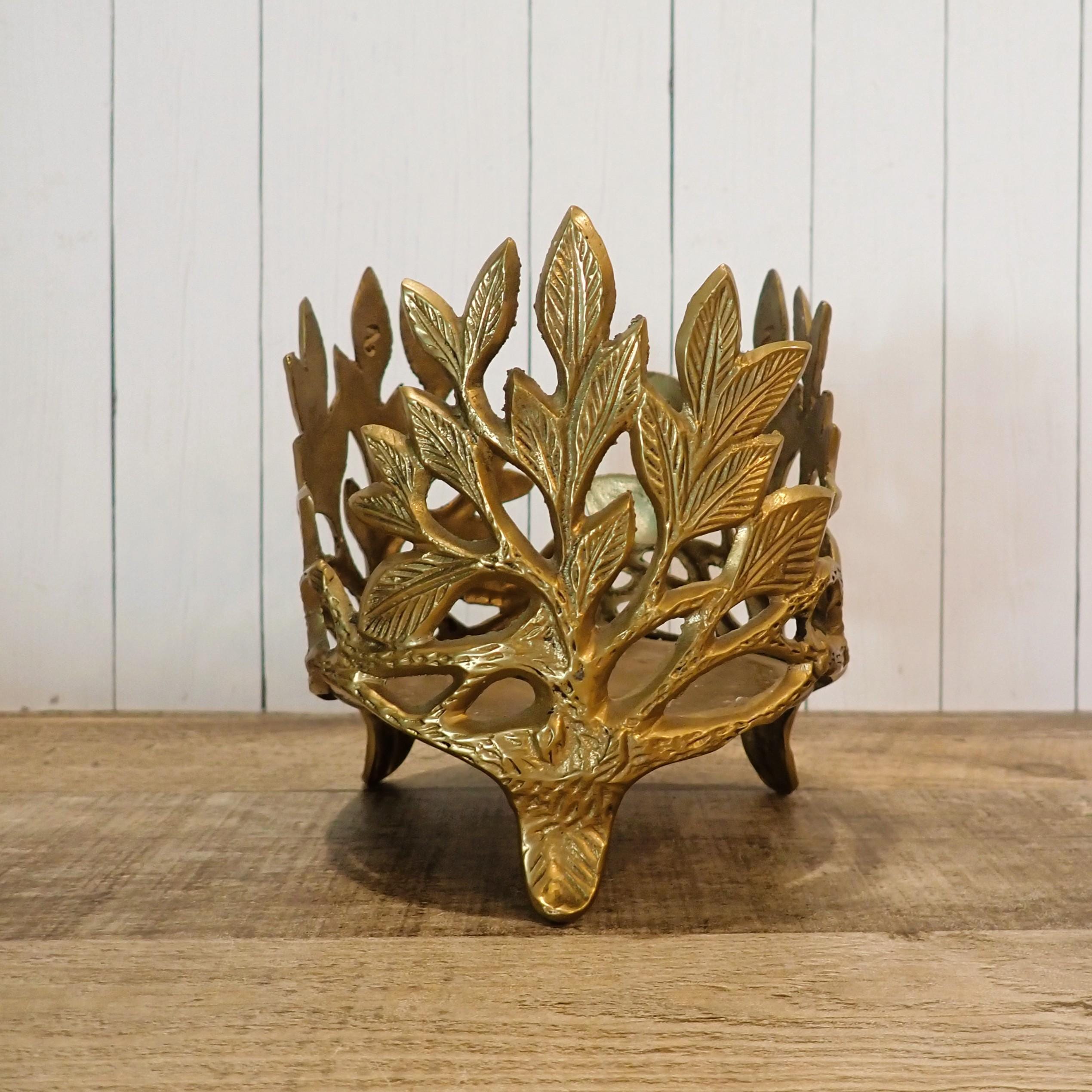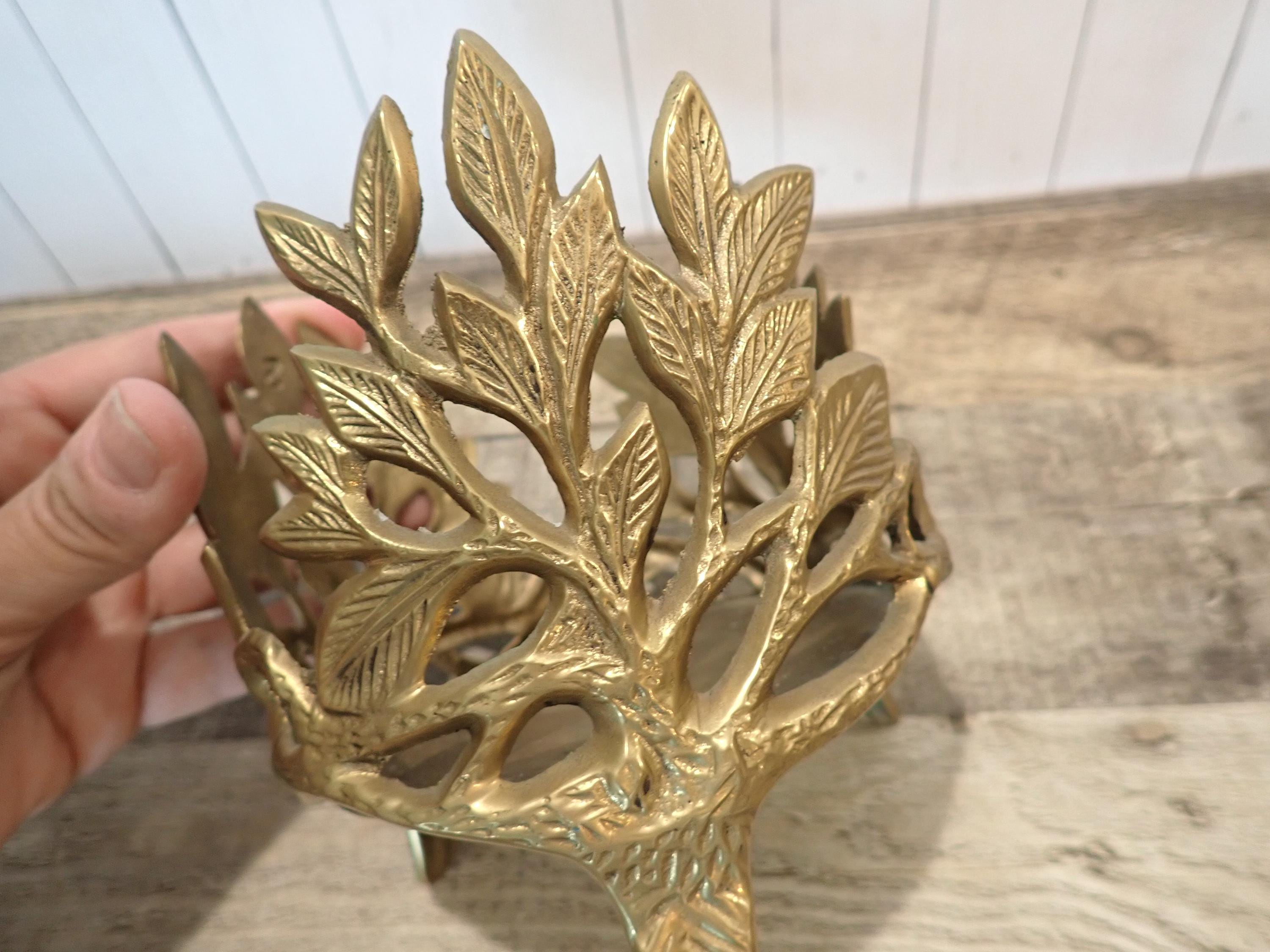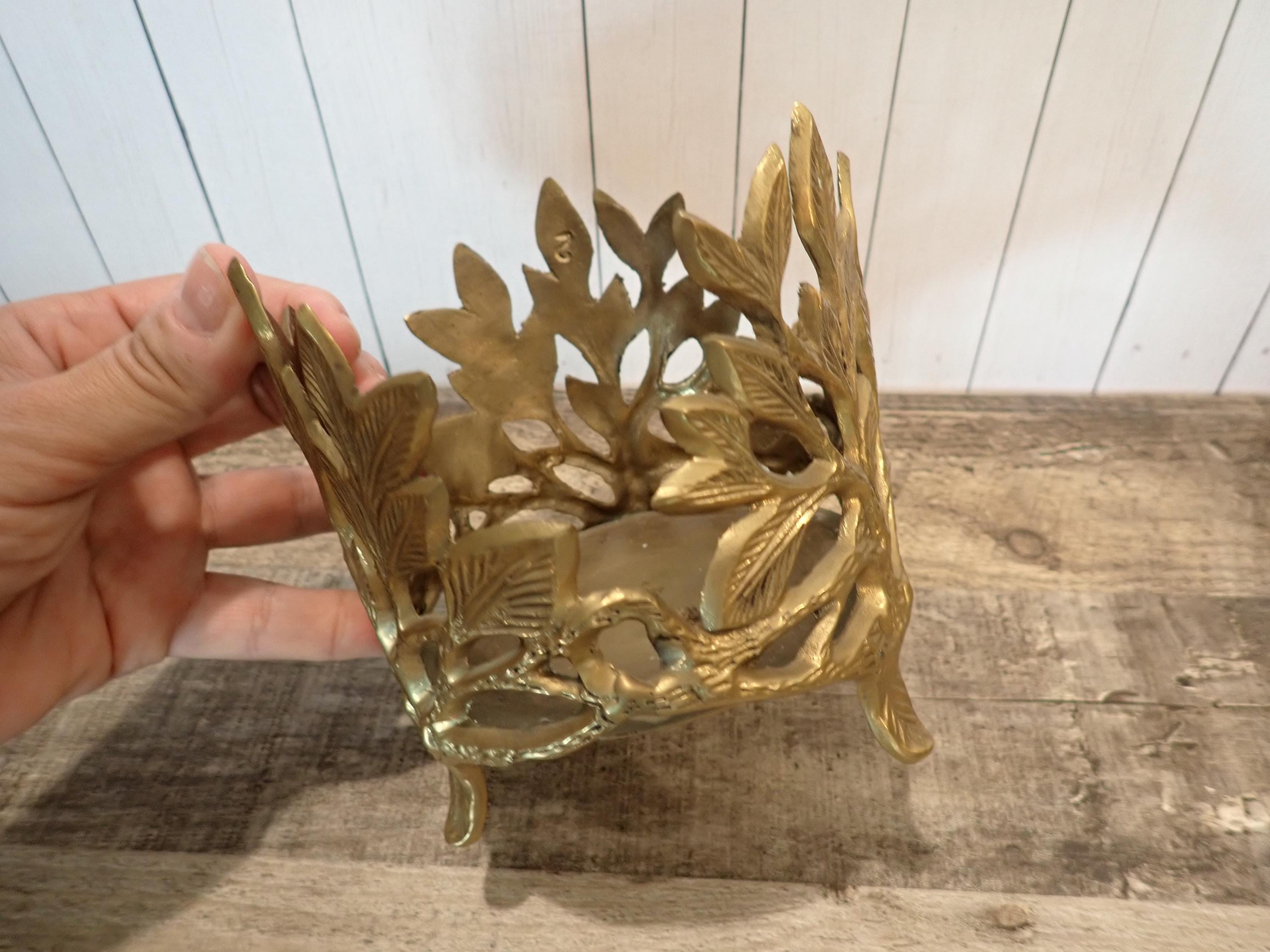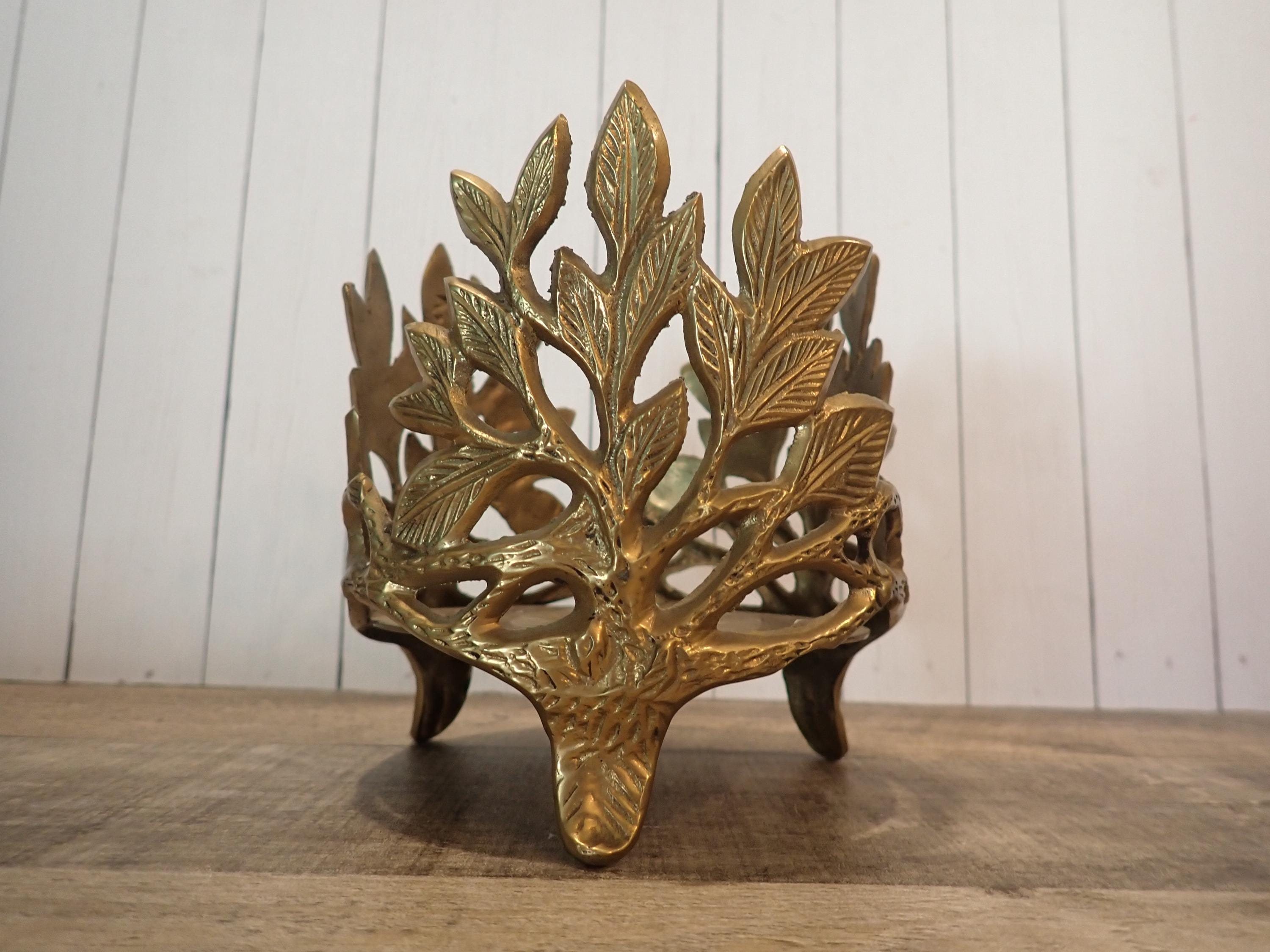 This lovely brass candle holder is 5" tall and 4.5" in diameter and can hold a pillar or jar candle up to 4.25" in diameter. It has a round footed base and a leaf design around the piece. It is in very good condition.
