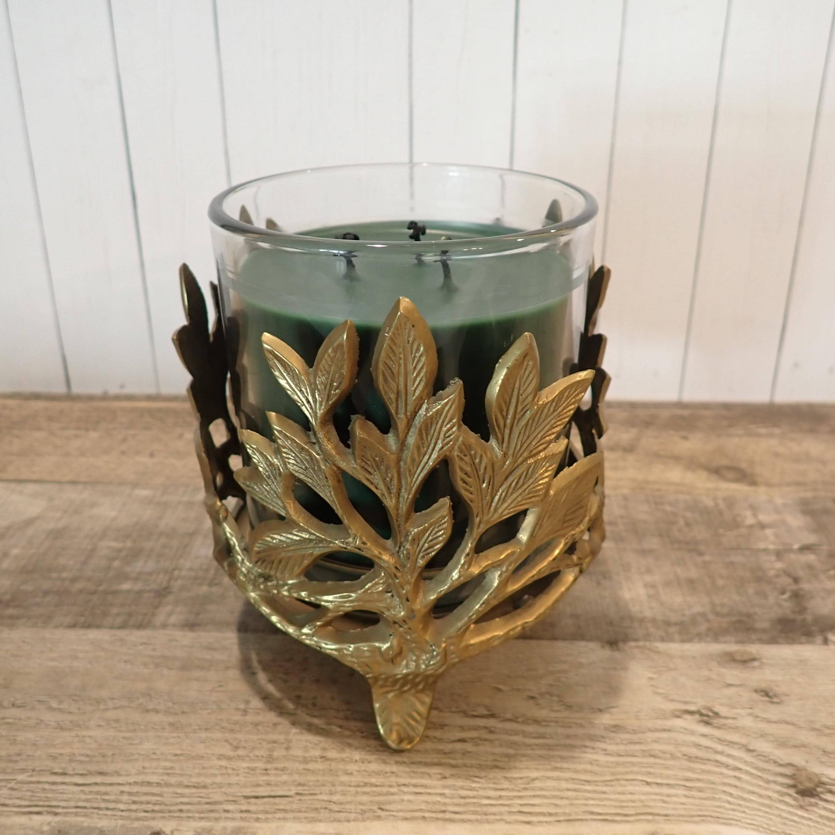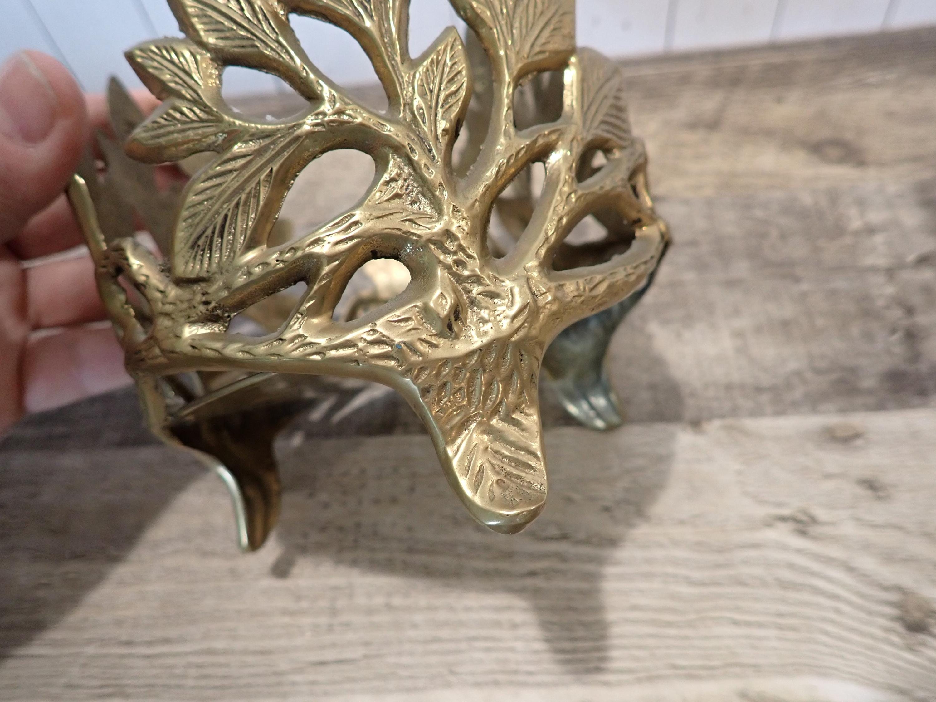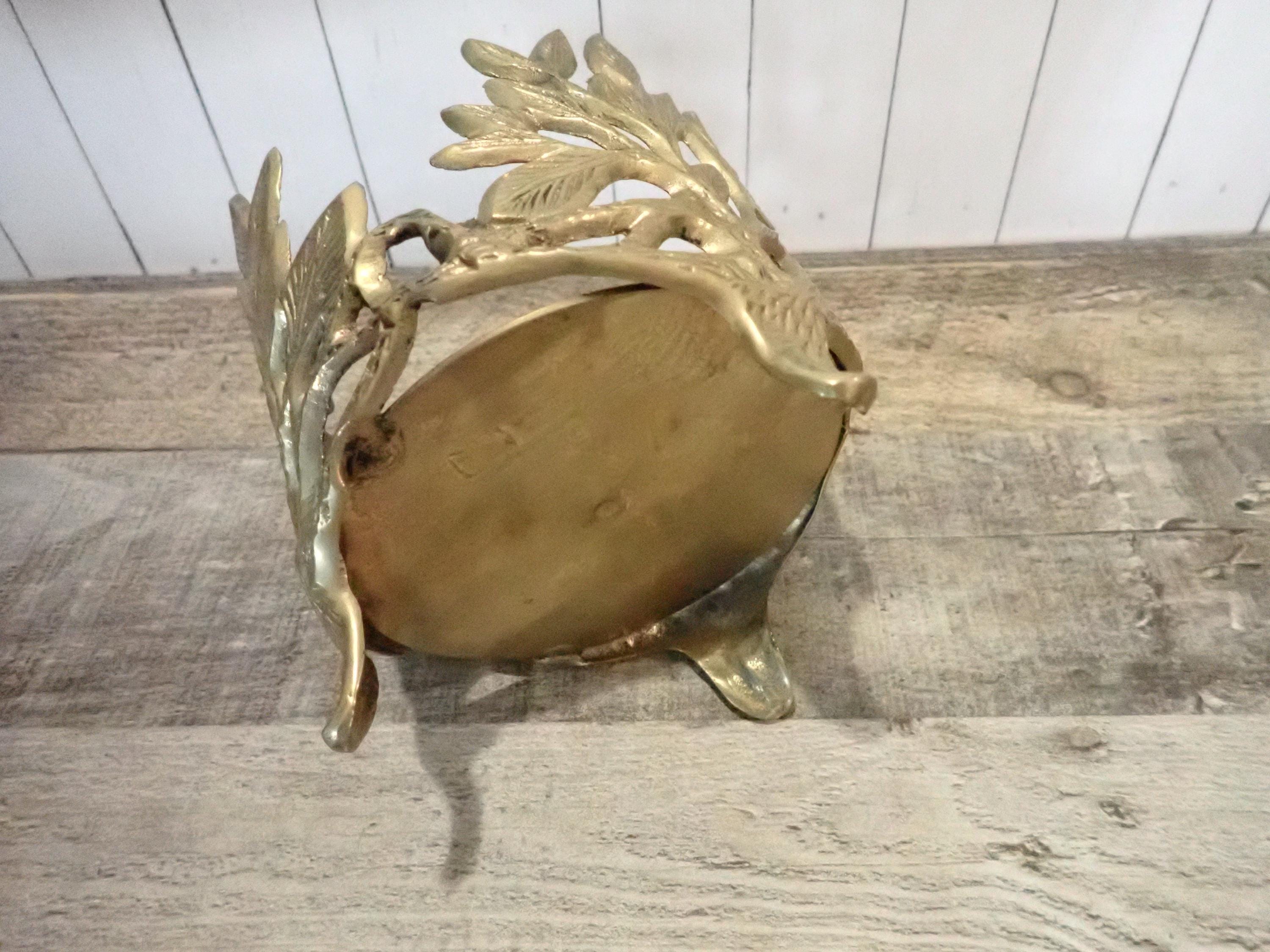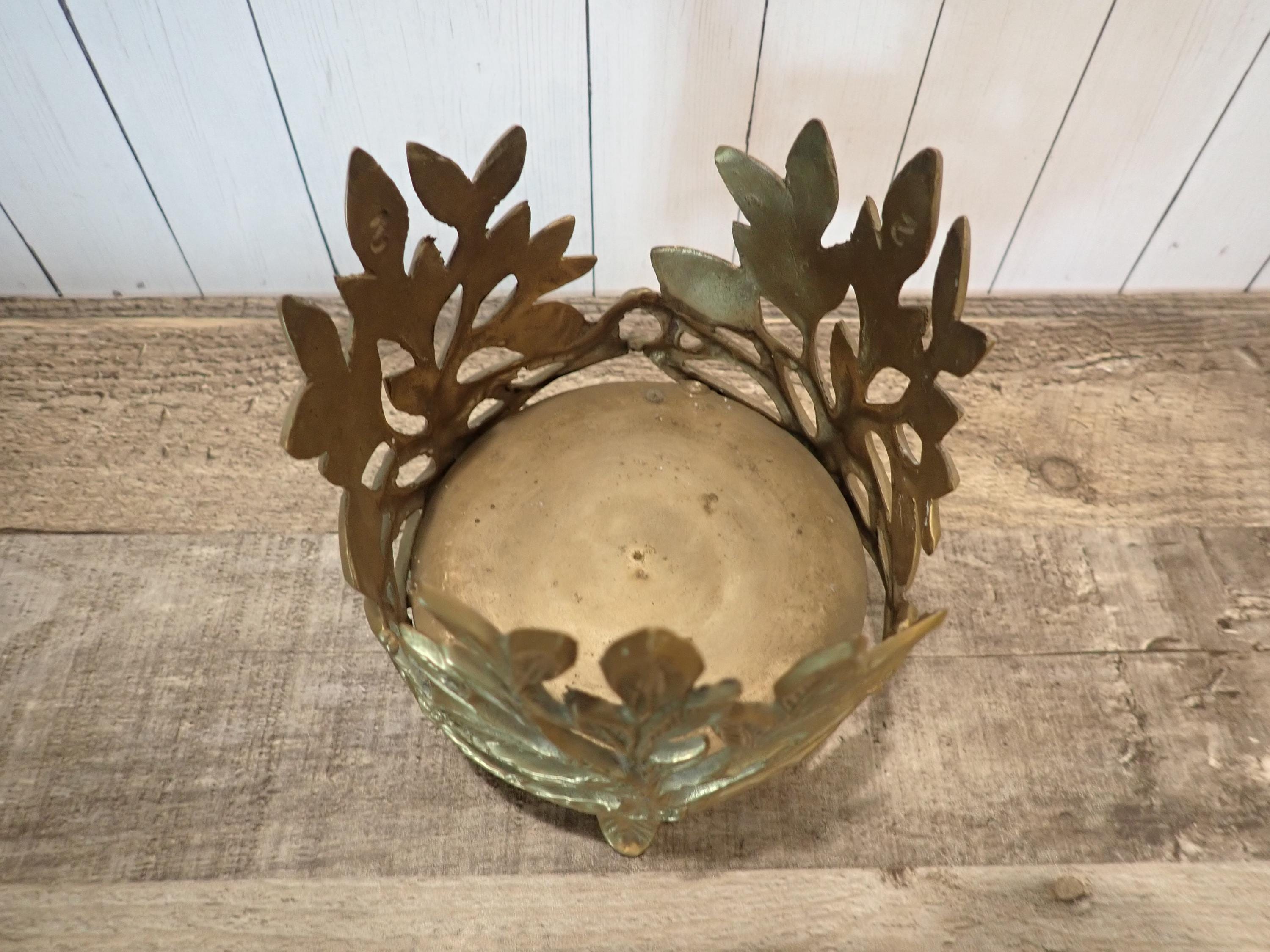 This lovely brass candle holder is 5" tall and 4.5" in diameter and can hold a pillar or jar candle up to 4.25" in diameter. It has a round footed base and a leaf design around the piece. It is in very good condition.