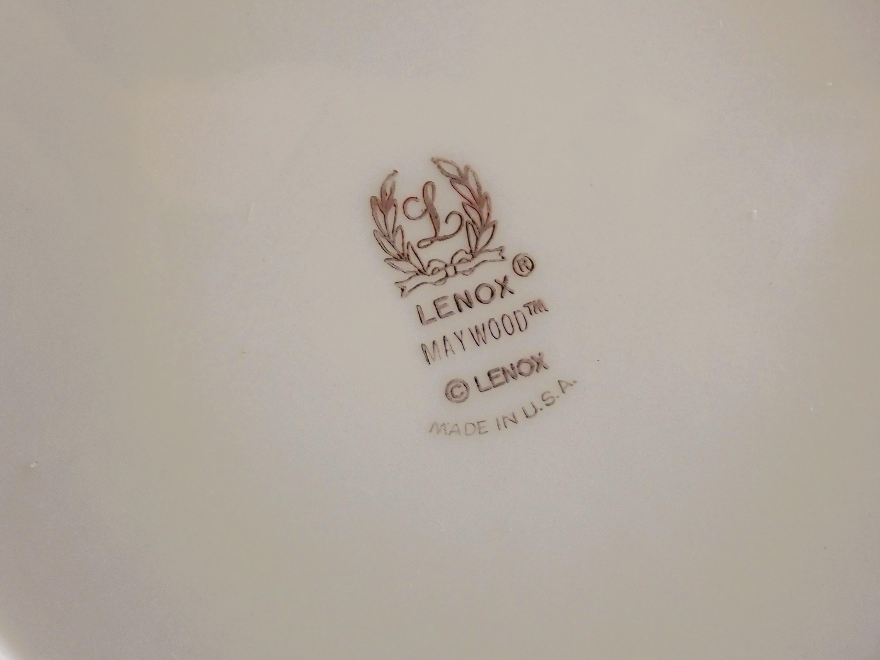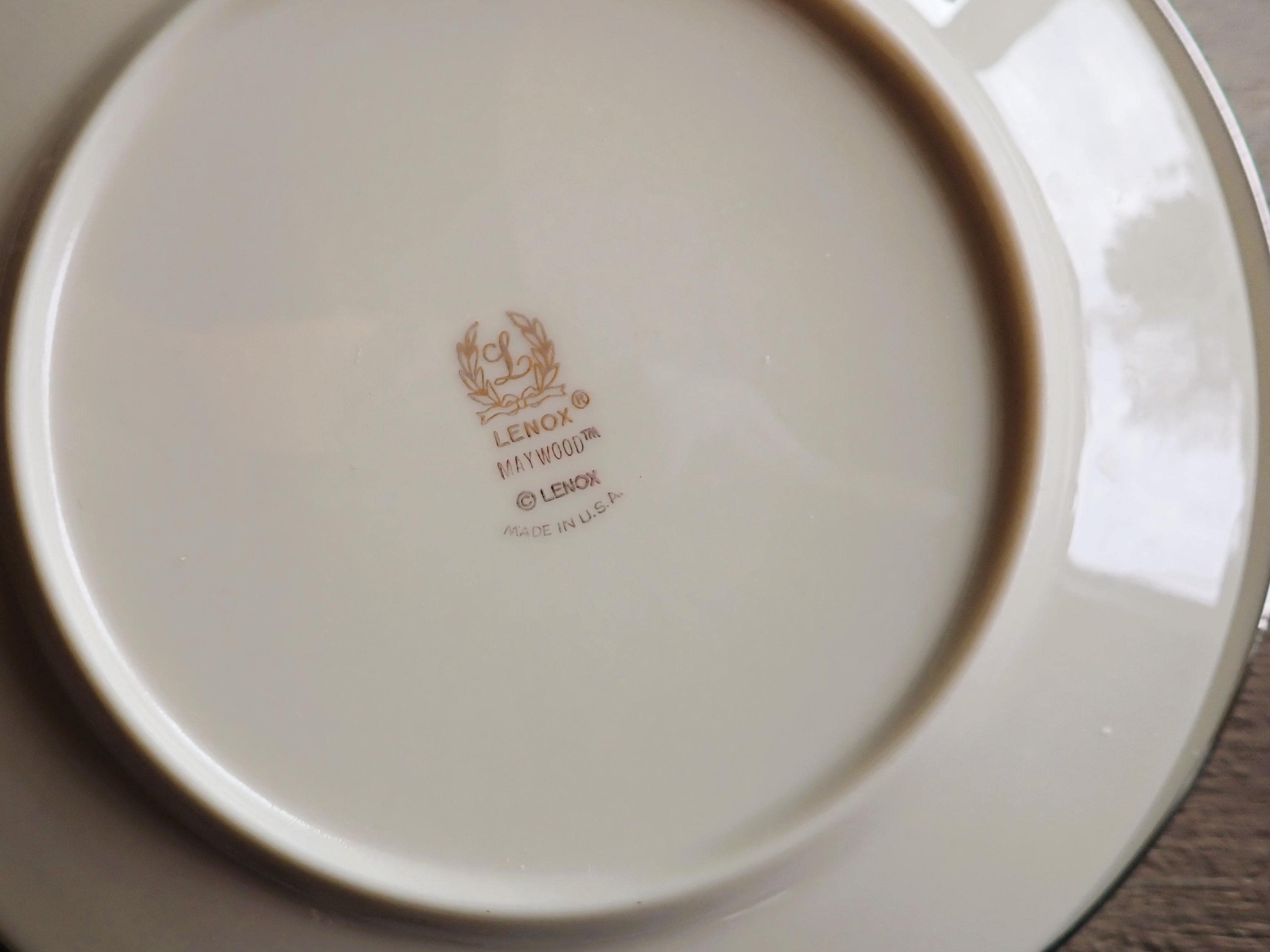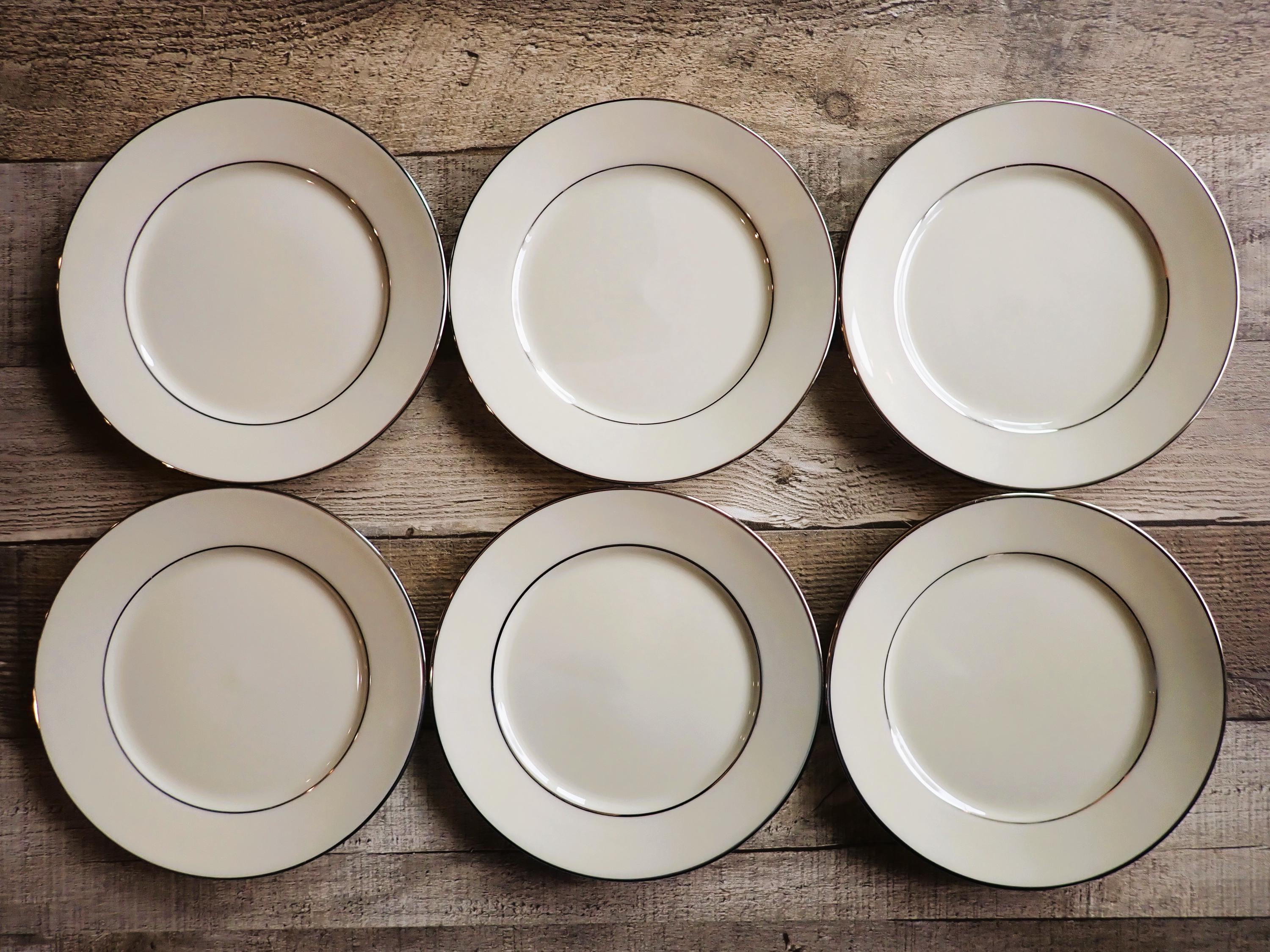 This set of 6 bread plates by Lenox is in the Maywood pattern and are 6.5" in diameter. The plates are an ivory color with a silver band around the rim. The bottoms are marked: LENOX / MAYWOOD / LENOX / MADE IN USA. All 6 plates are in very good condition with no chips or cracks.