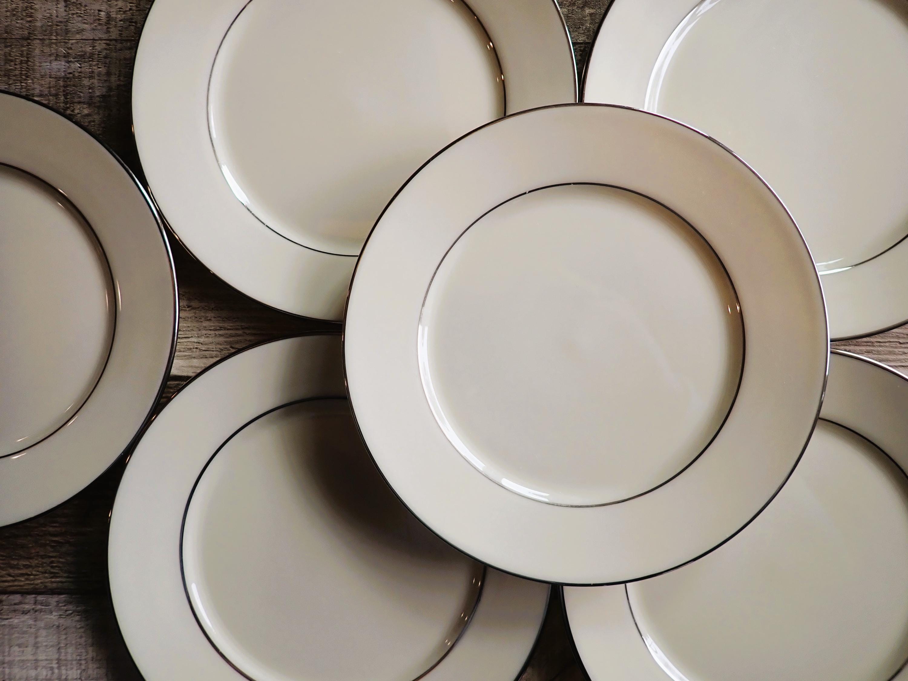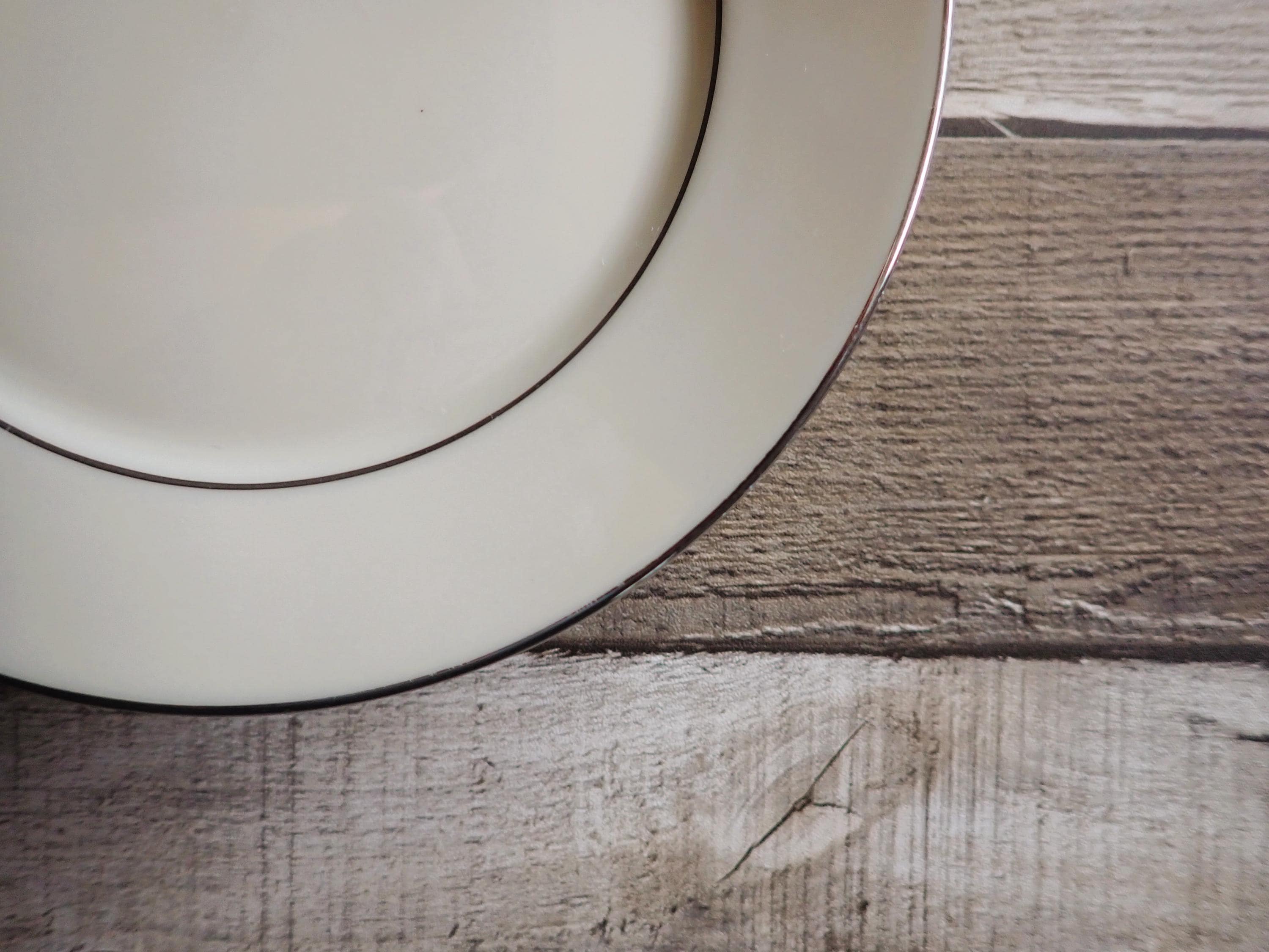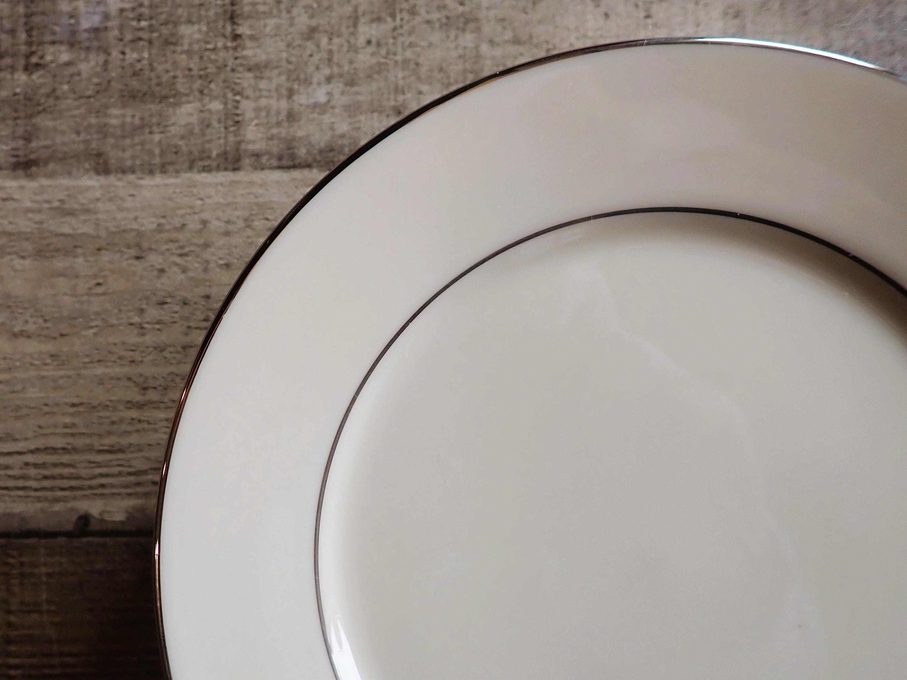 This set of 6 bread plates by Lenox is in the Maywood pattern and are 6.5" in diameter. The plates are an ivory color with a silver band around the rim. The bottoms are marked: LENOX / MAYWOOD / LENOX / MADE IN USA. All 6 plates are in very good condition with no chips or cracks.