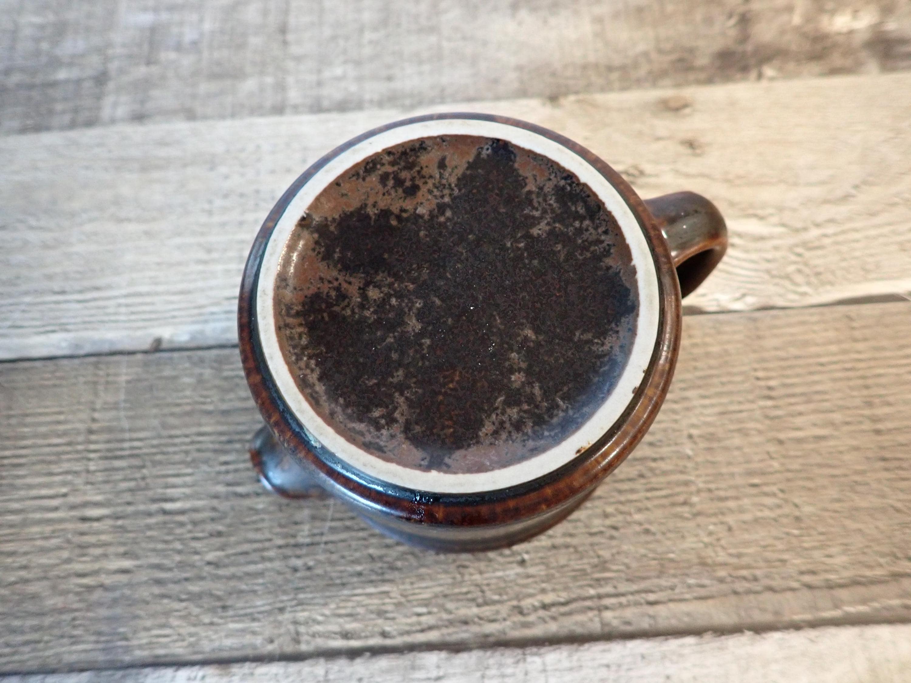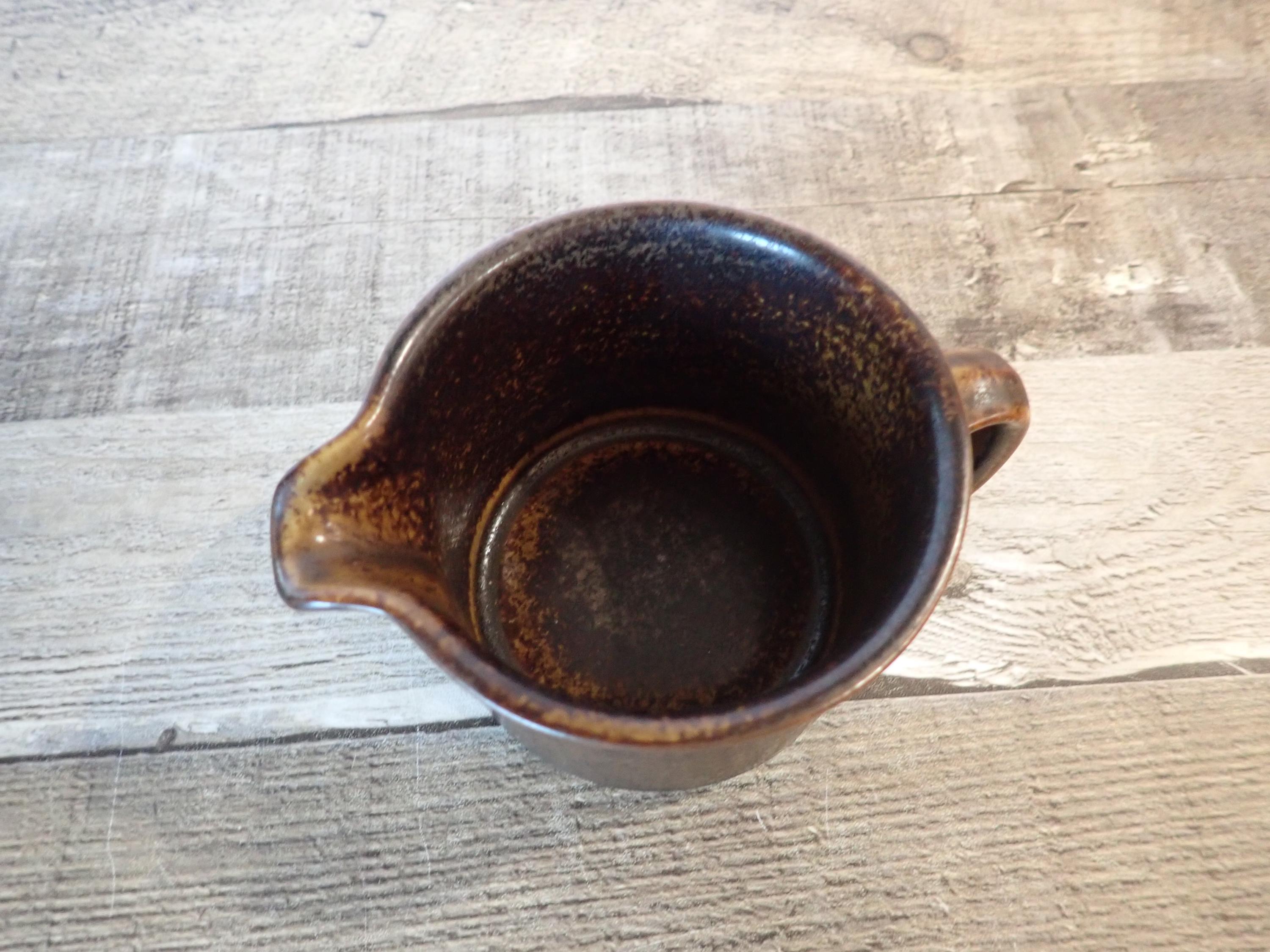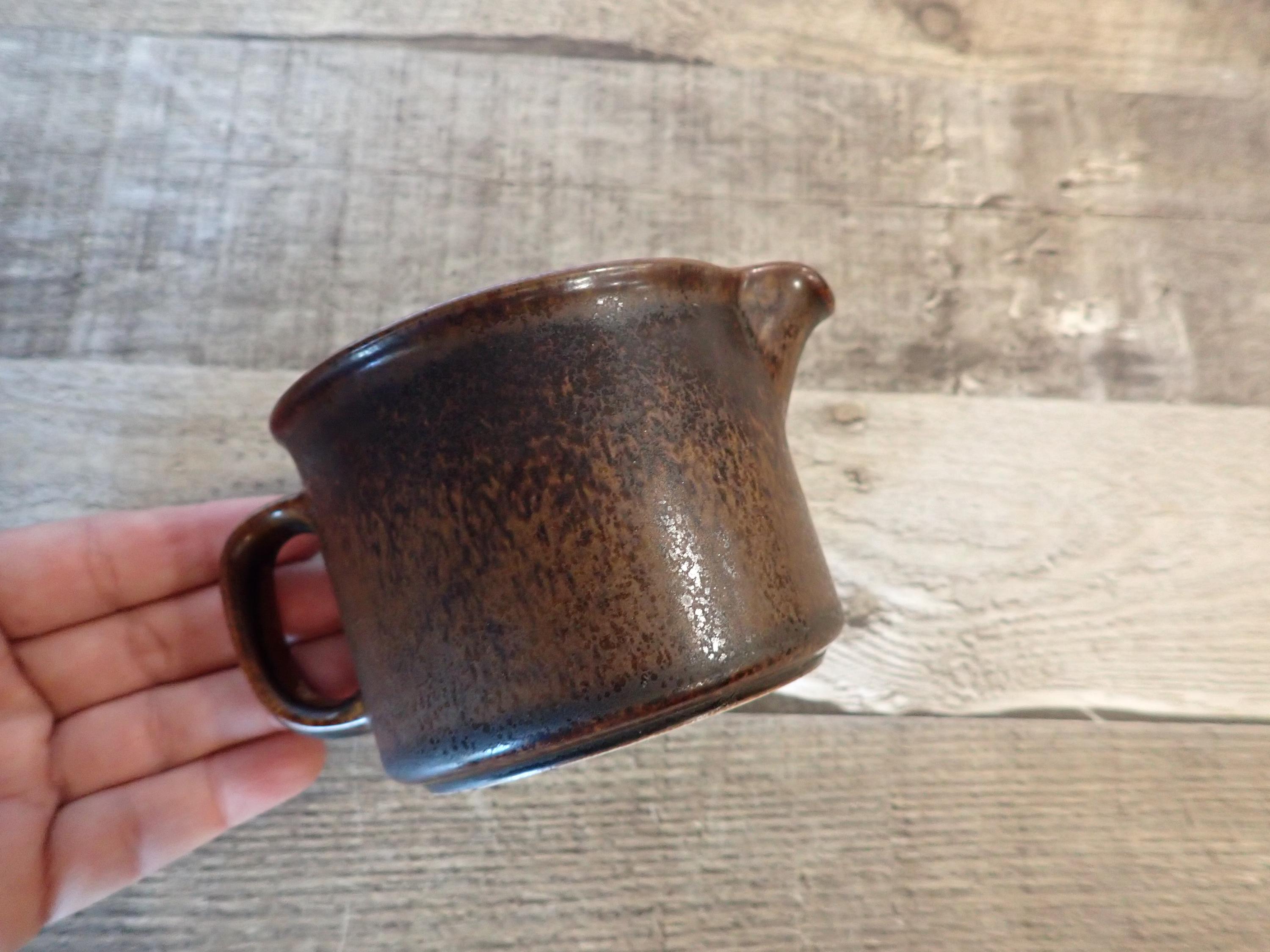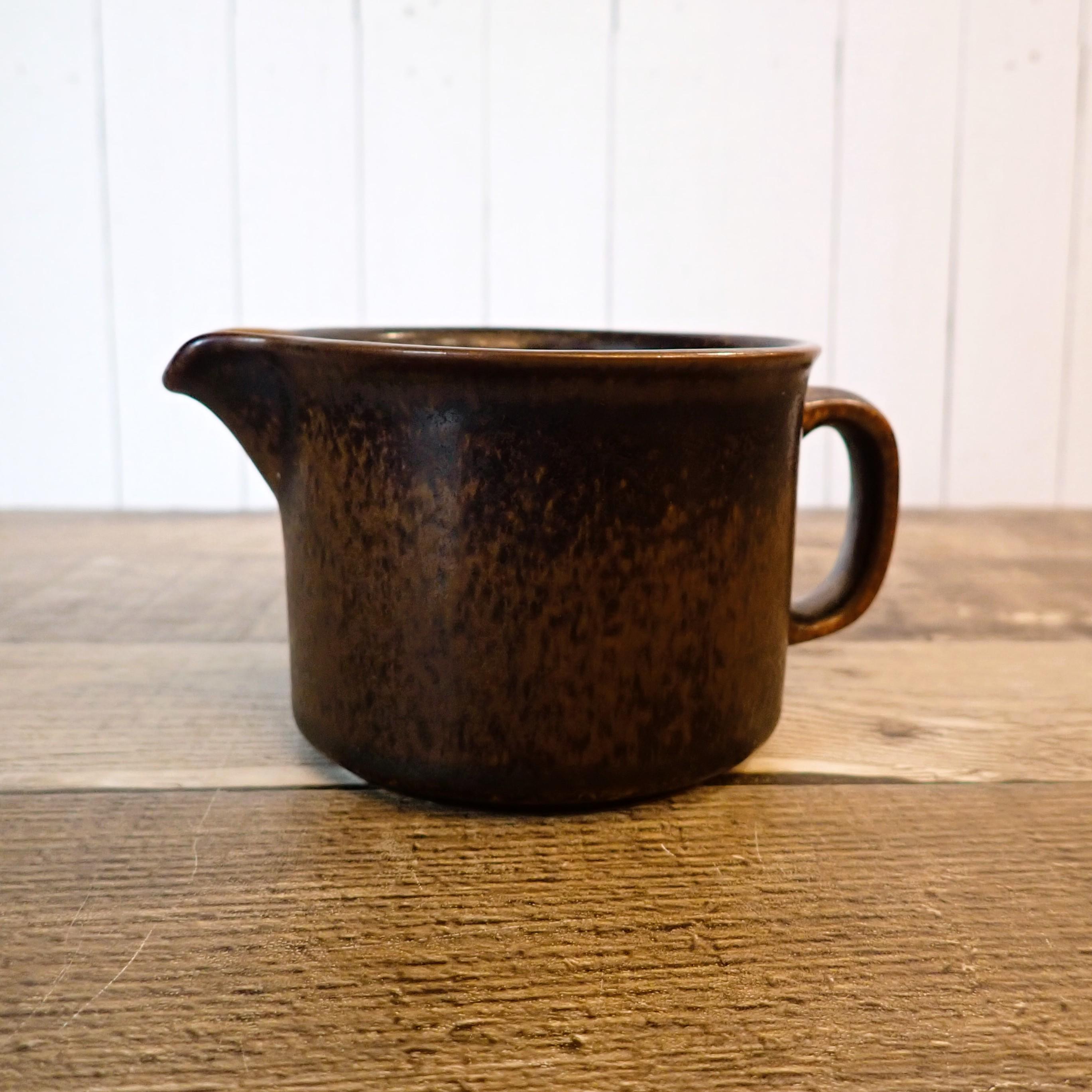 This creamer by Arabia is in the Ruska pattern and is 2.75" tall and 3.5" in diameter. It is a dark brown stoneware with a darker brown glaze, creating a mottled finish. The creamer is not marked with any makers marks. The creamer is in very good condition with no chips or cracks. There are color variations on the piece - some are a darker brown and some are lighter brown.