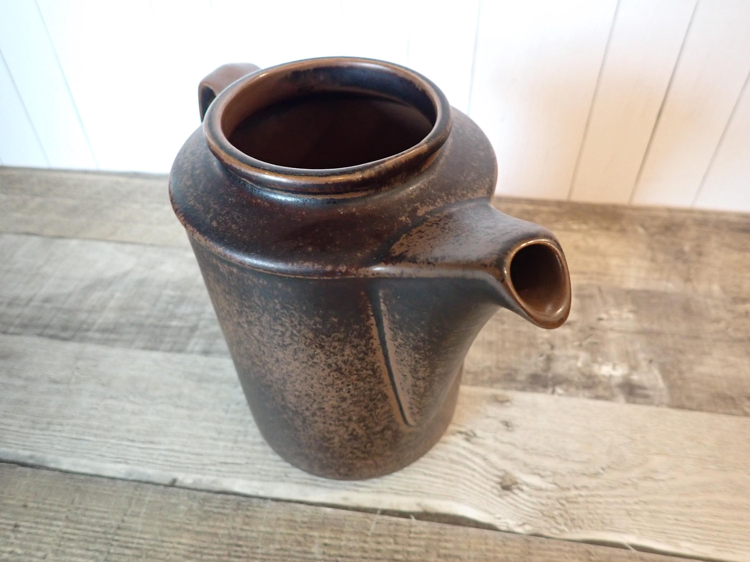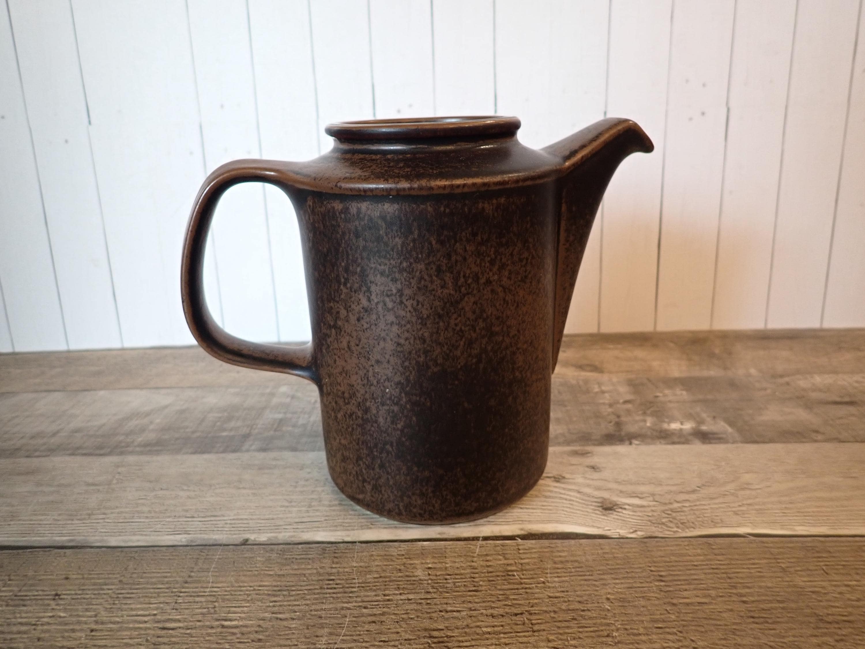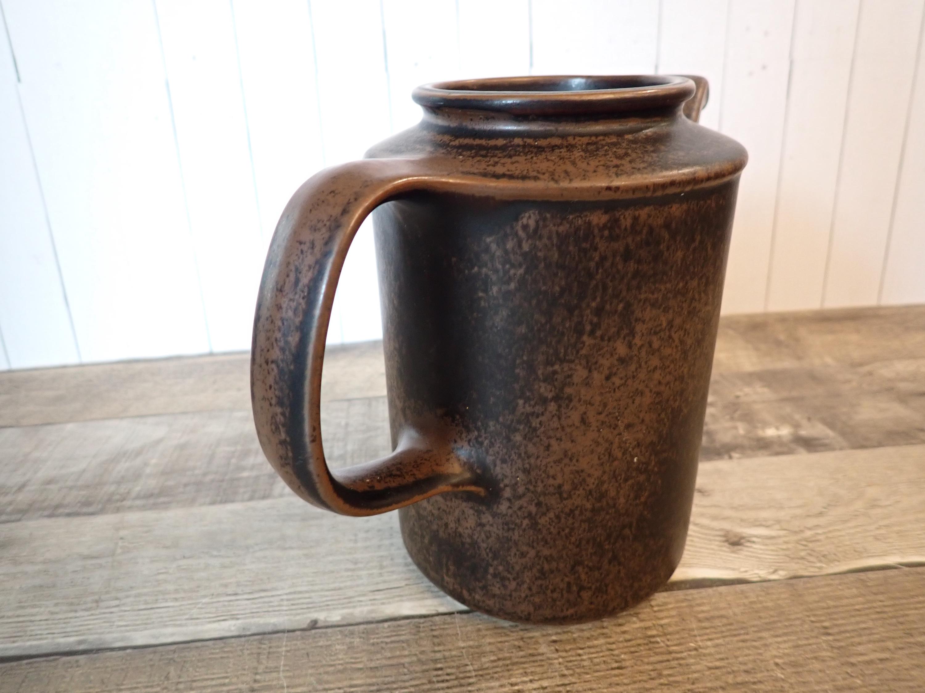 This stoneware coffee pot by Arabia is in the Ruska pattern and is 6.75" tall and 4.25" in diameter. It is a dark brown stoneware with a darker brown glaze, creating a mottled finish. The coffee pot does not include a lid but can make a nice pitcher. It is in very good condition with no chips or cracks.