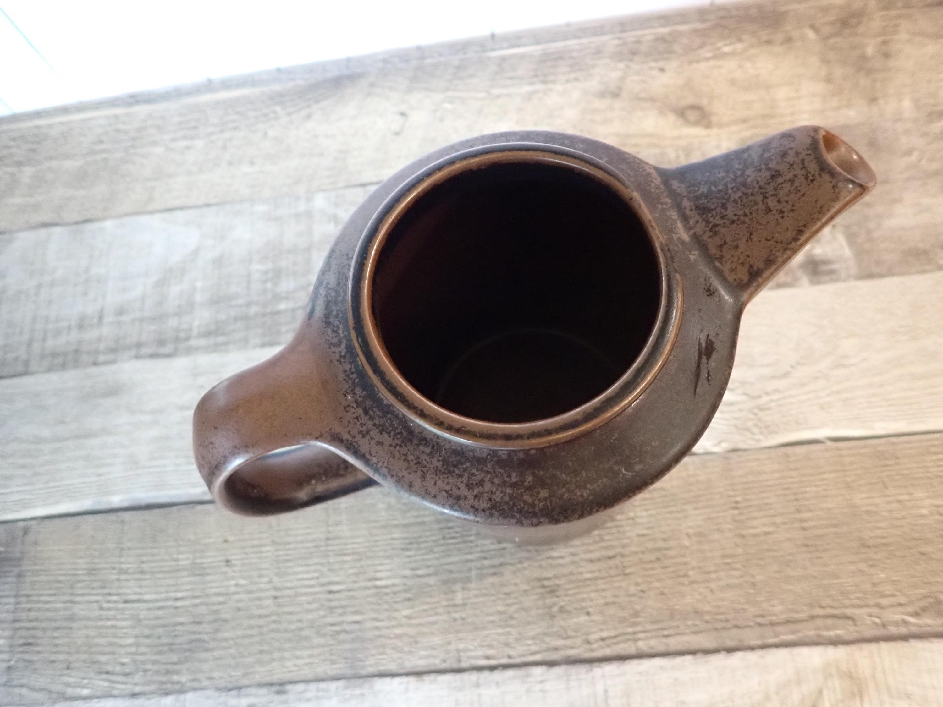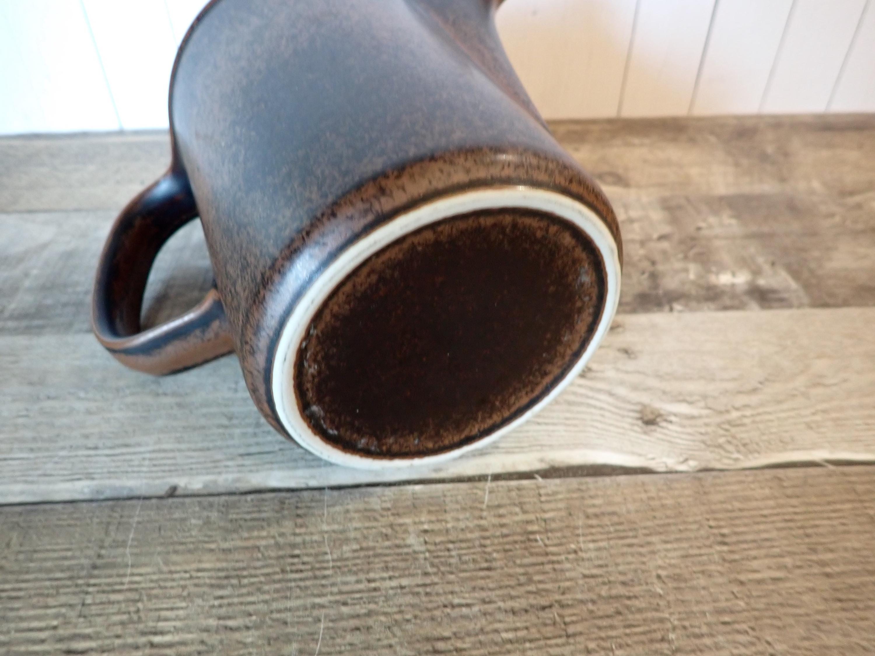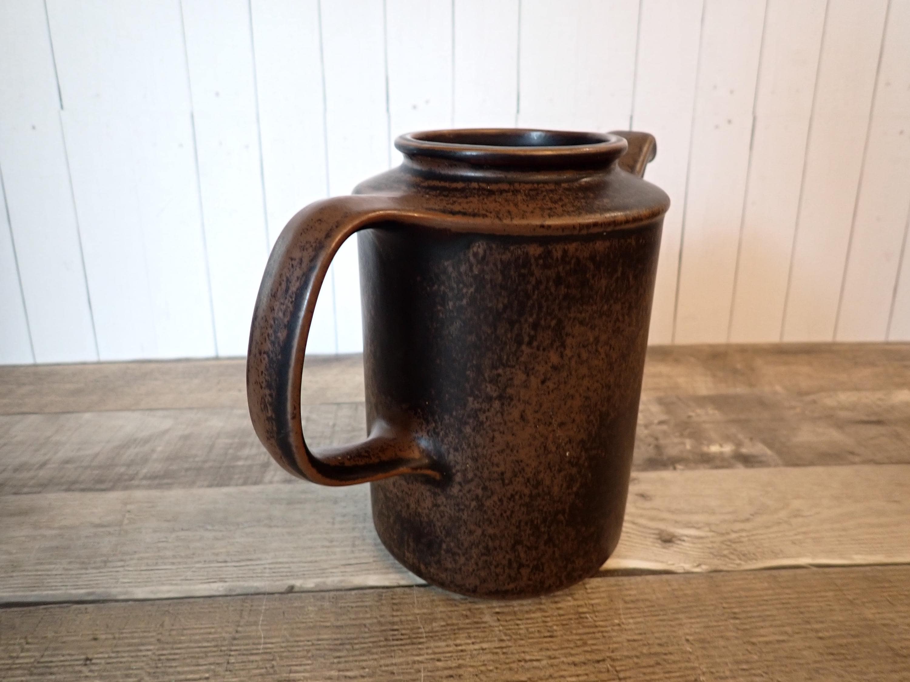 This stoneware coffee pot by Arabia is in the Ruska pattern and is 6.75" tall and 4.25" in diameter. It is a dark brown stoneware with a darker brown glaze, creating a mottled finish. The coffee pot does not include a lid but can make a nice pitcher. It is in very good condition with no chips or cracks.