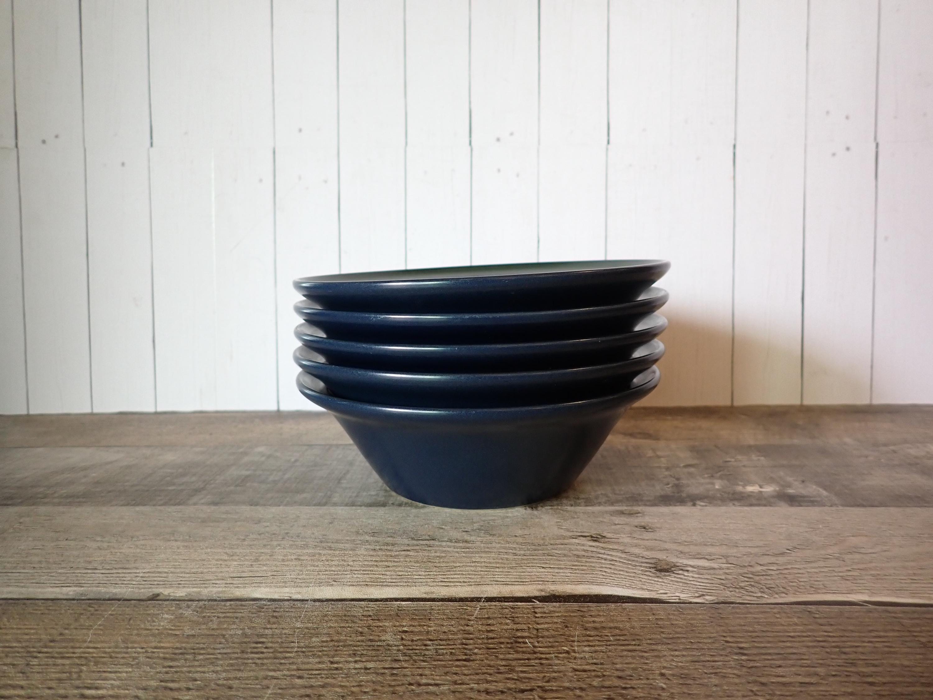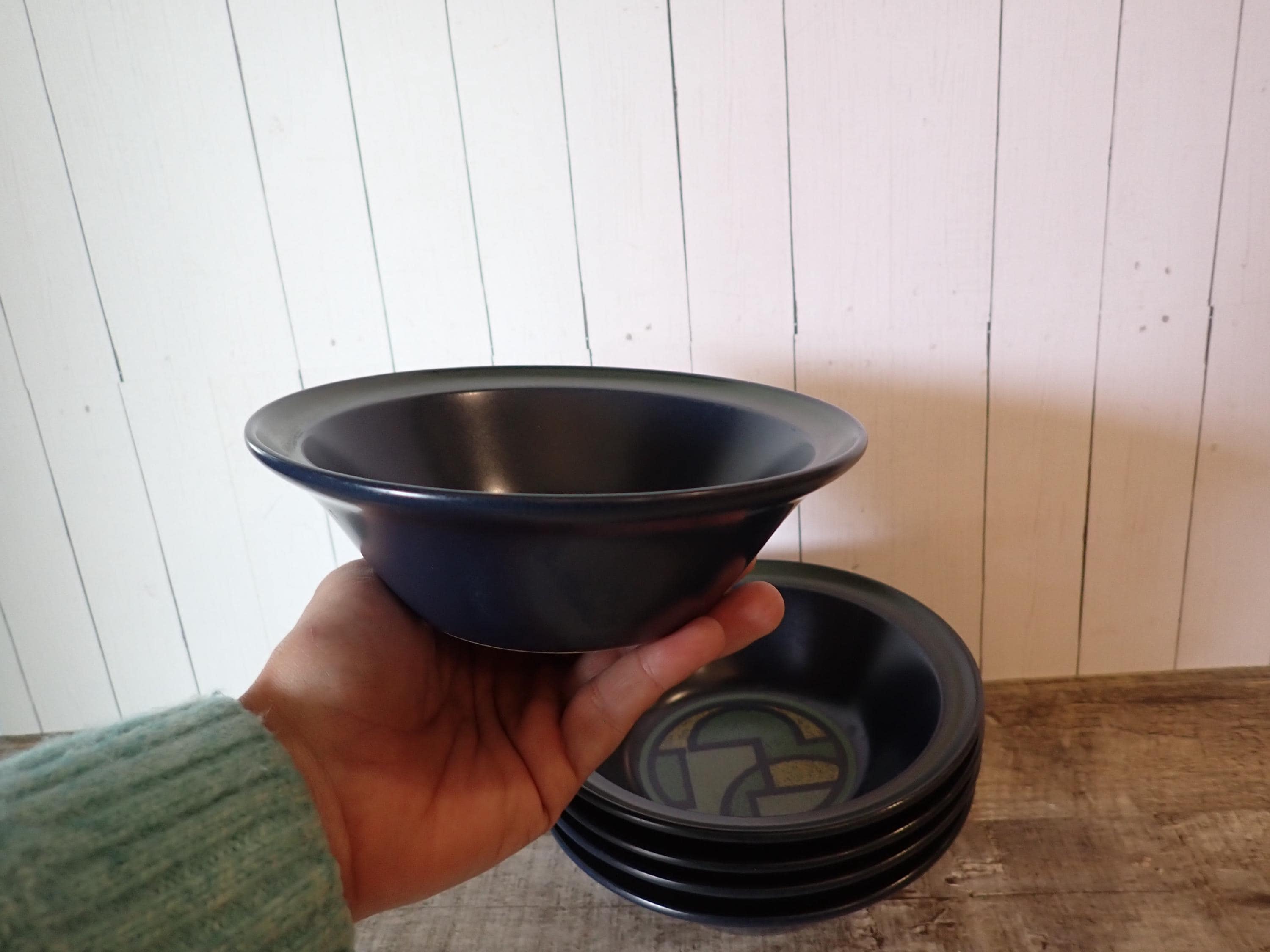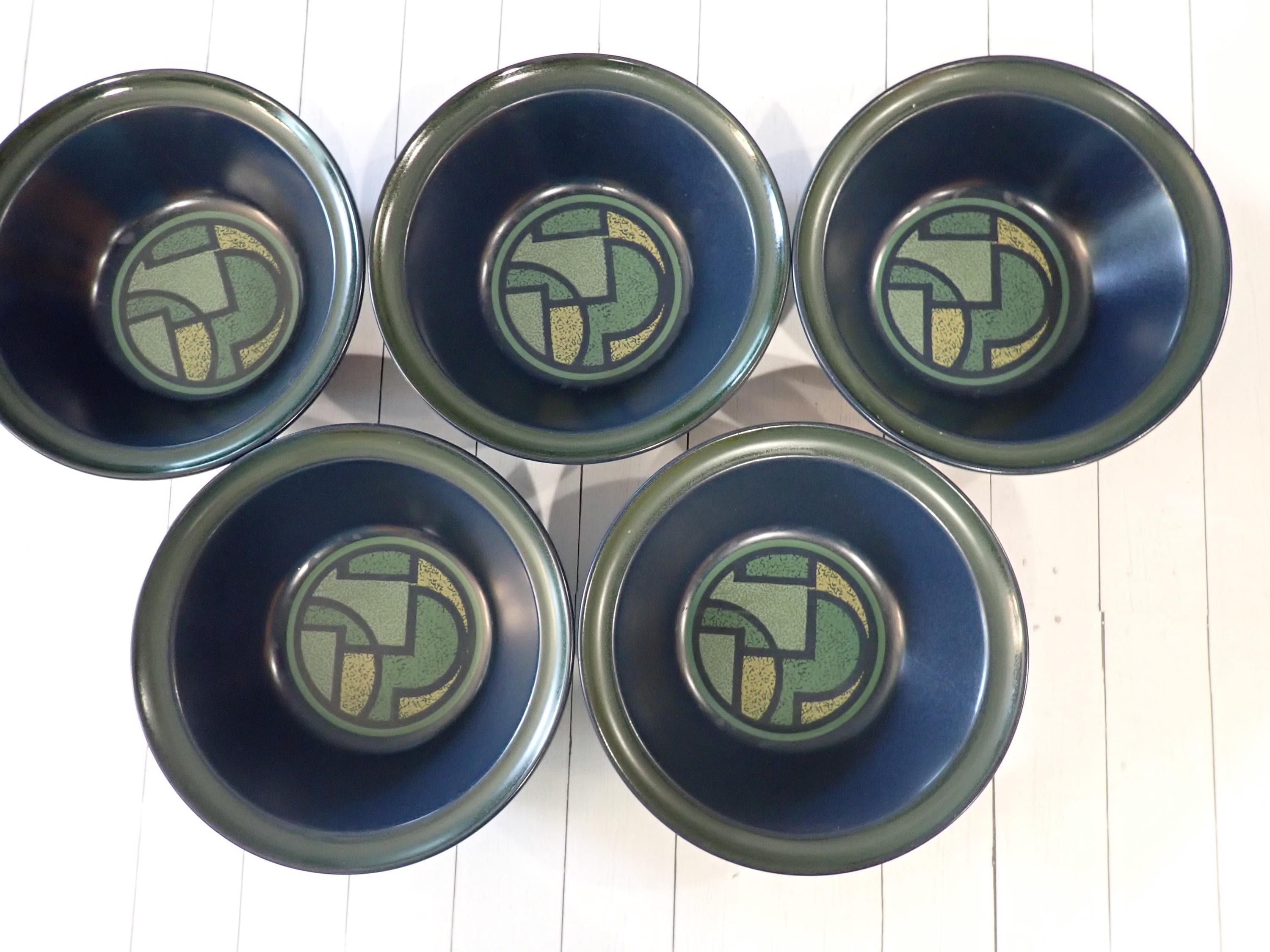 This set of 5 stoneware bowls by Noritake are in the Bay Roc pattern. This pattern was produced from 1972 to 1977. This is set of 5 cereal bowls and they are each 6.5" in diameter and 2" high. They are a bark blue stoneware with a green and blue geometric patten of circles and squares in the center. The bottoms are marked NORITAKE / PRIMASTONE / GENUINE STONEWARE / JAPAN / BAY ROC / 8303. All 5 bowl are in very good condition with no chips or cracks. There are some light surface scratches from use.