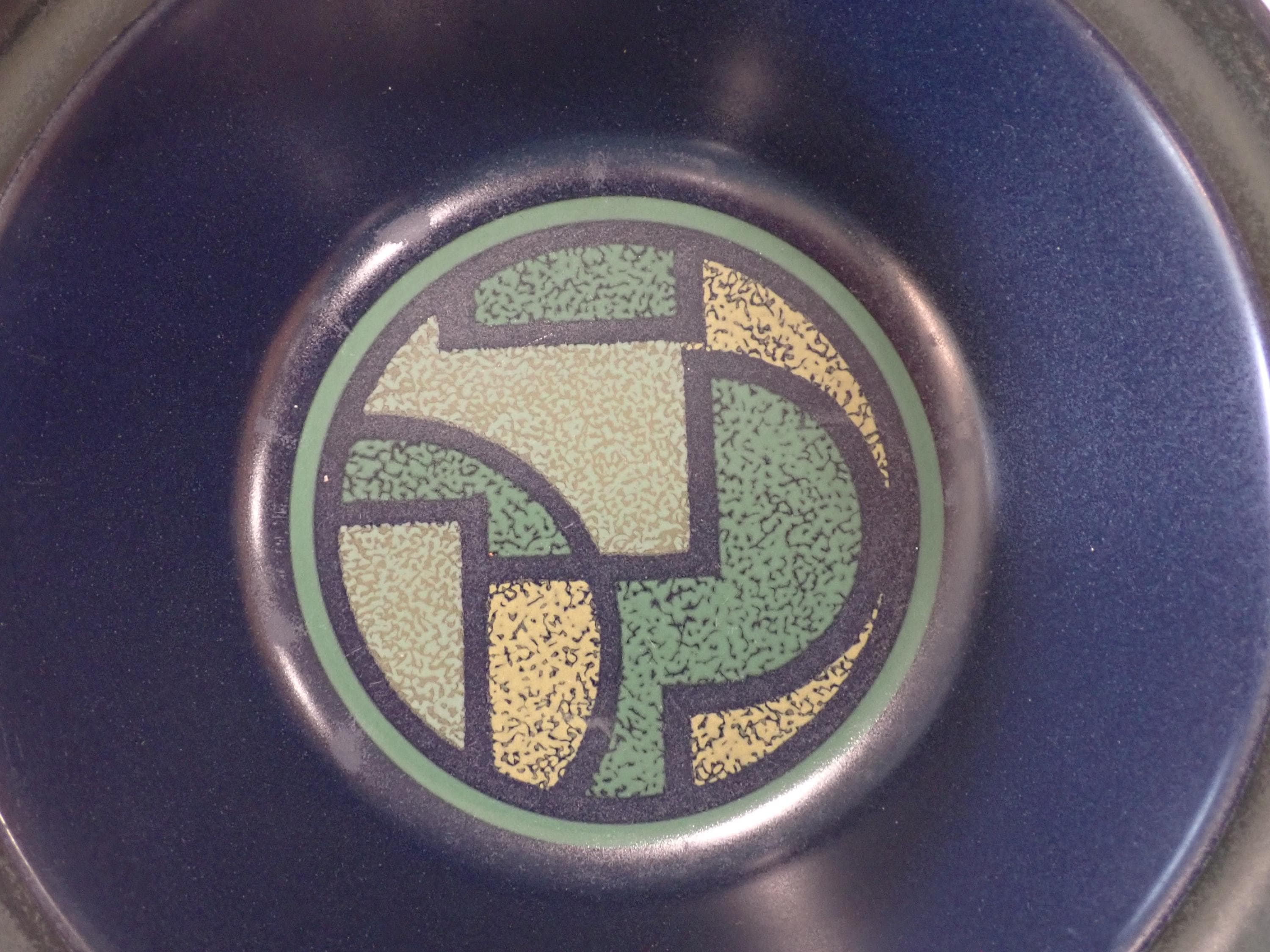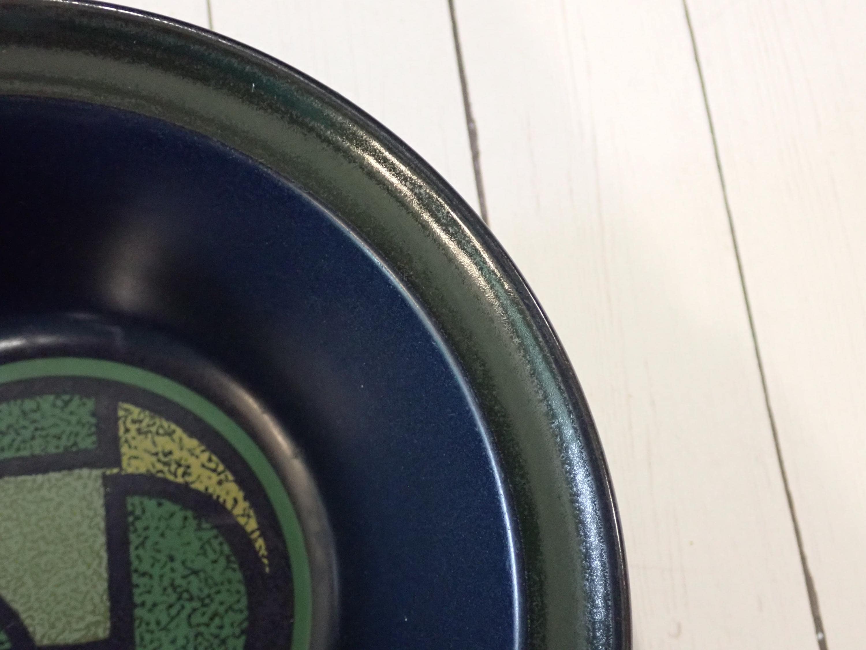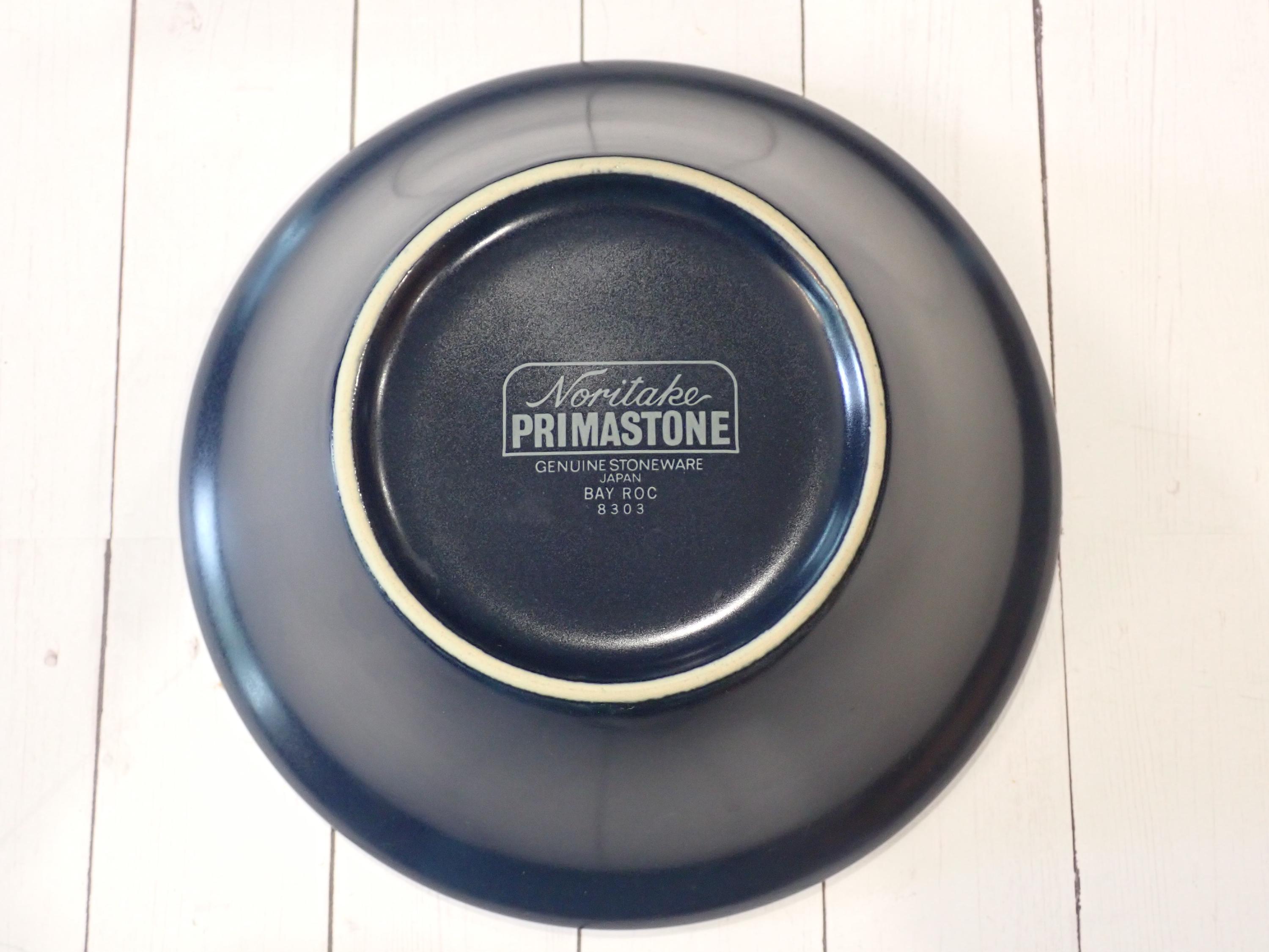 This set of 5 stoneware bowls by Noritake are in the Bay Roc pattern. This pattern was produced from 1972 to 1977. This is set of 5 cereal bowls and they are each 6.5" in diameter and 2" high. They are a bark blue stoneware with a green and blue geometric patten of circles and squares in the center. The bottoms are marked NORITAKE / PRIMASTONE / GENUINE STONEWARE / JAPAN / BAY ROC / 8303. All 5 bowl are in very good condition with no chips or cracks. There are some light surface scratches from use.