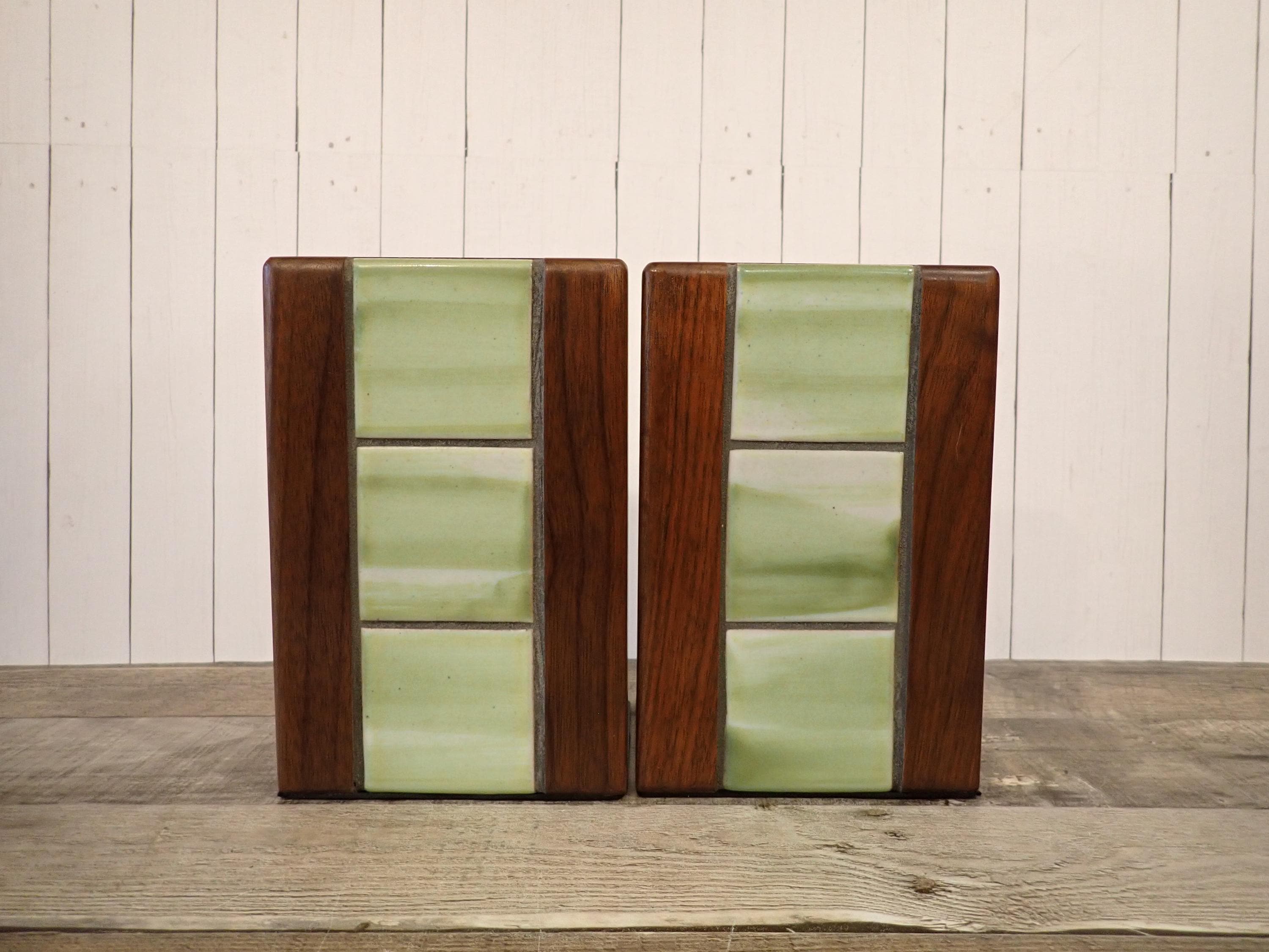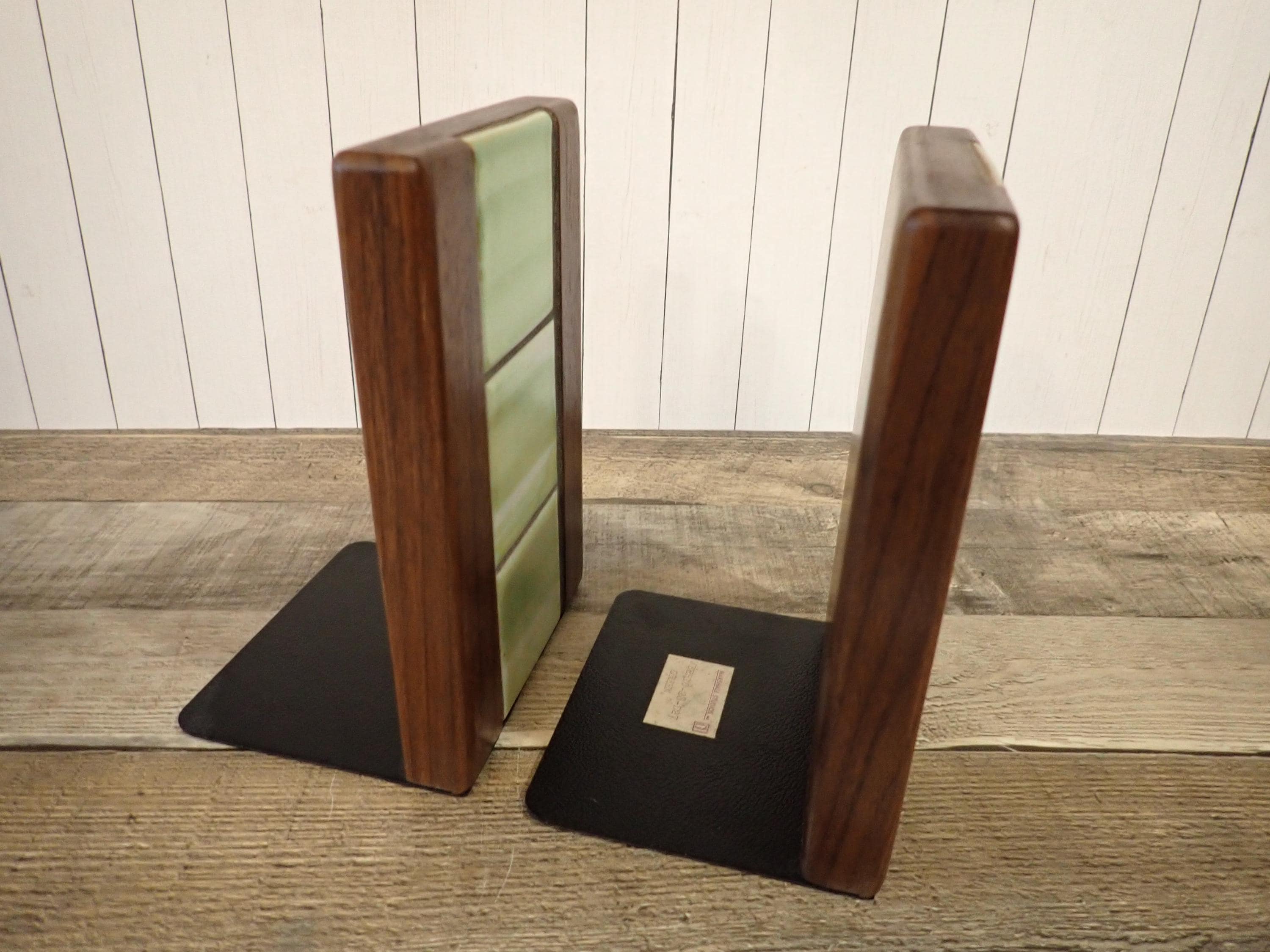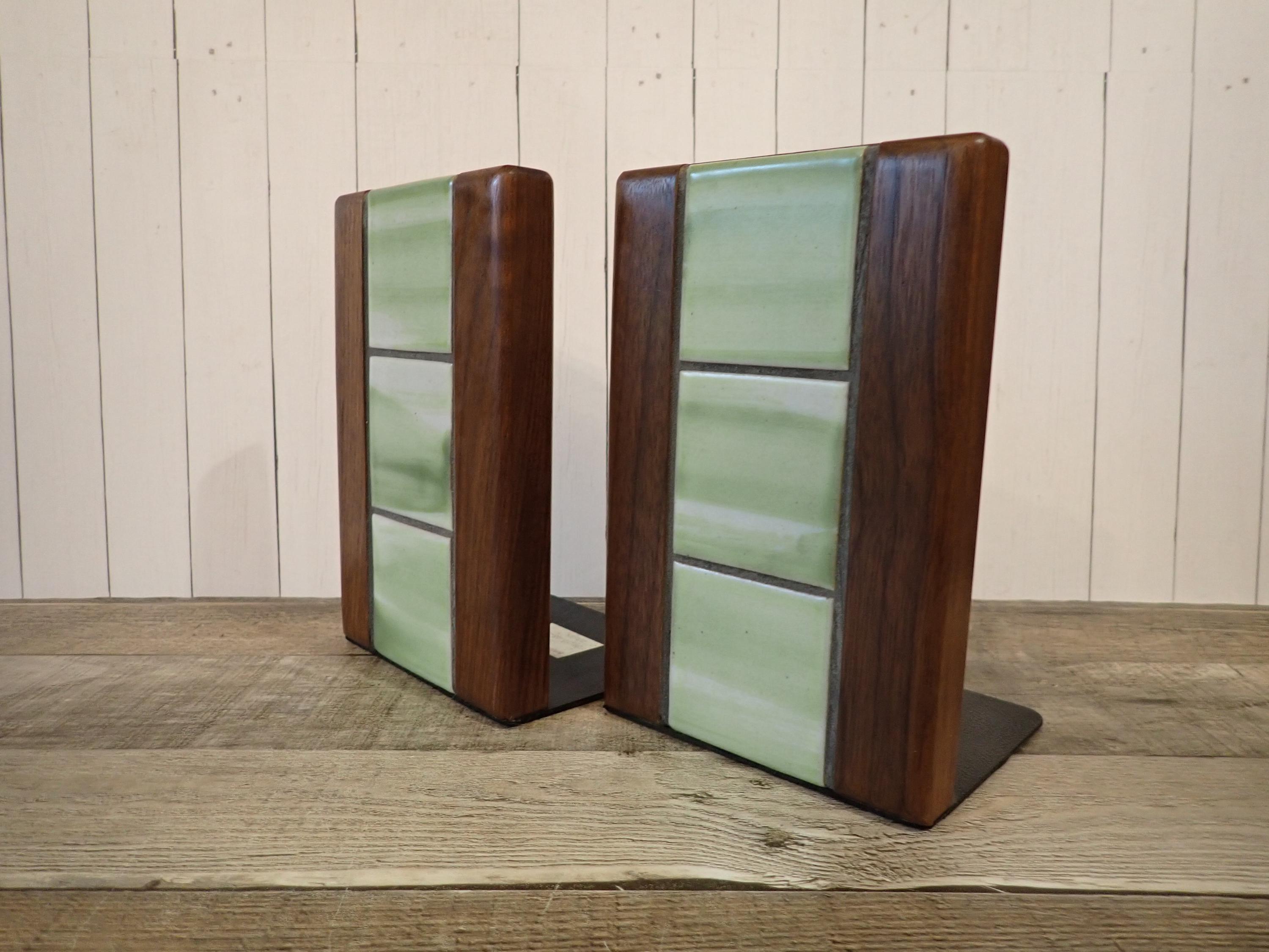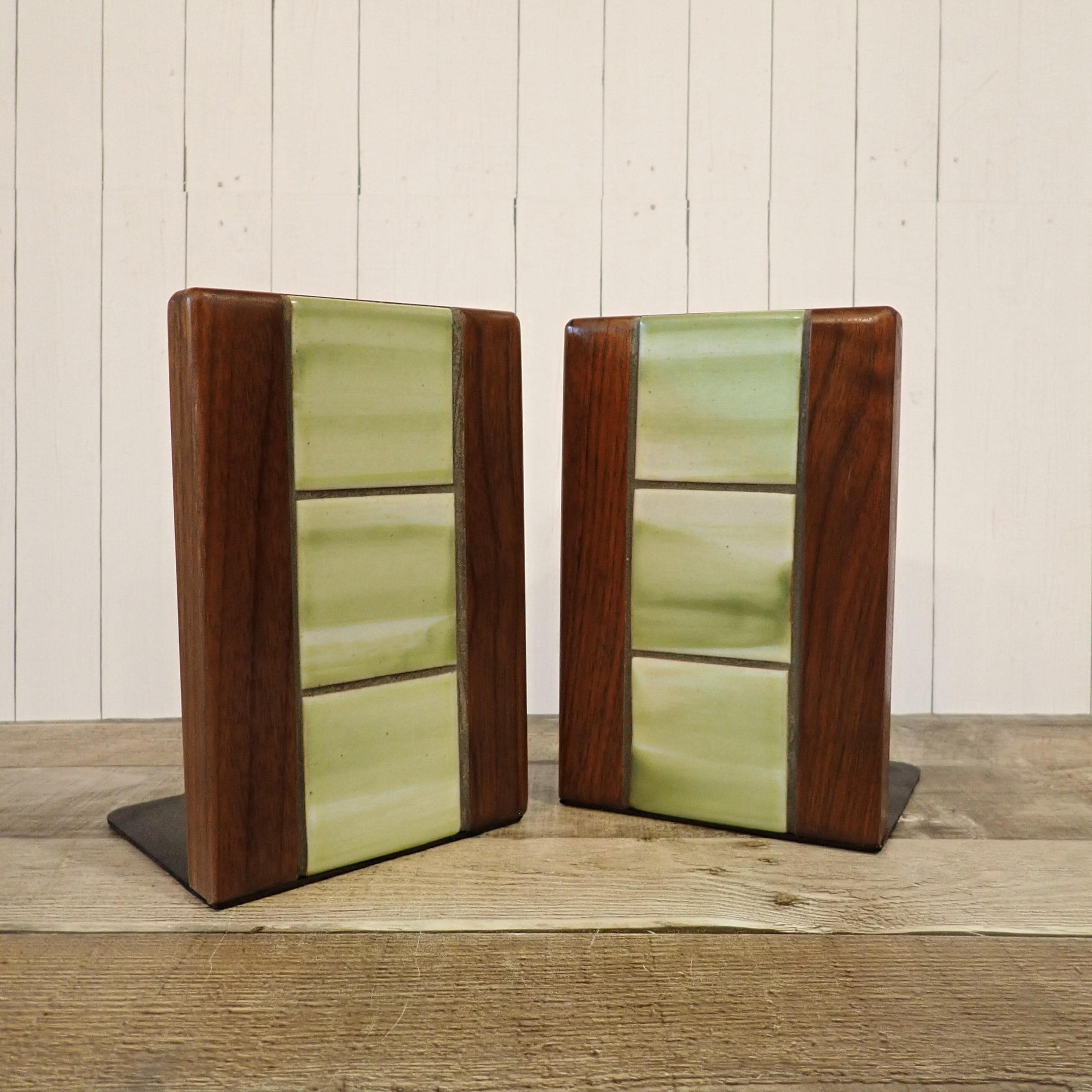 This pair of walnut and ceramic bookends were designed by Jane and Gordon Martz for Marshall Studios of Indiana. They are made of a 1" thick x 5" wide x 7.5" high piece of solid walnut with a row of 3 square green ceramic tiles. The overall dimensions are 5" wide x 7.5" high x 4.5" deep base plate. The bookends are in very good condition. The foam bottoms are intact for protection.