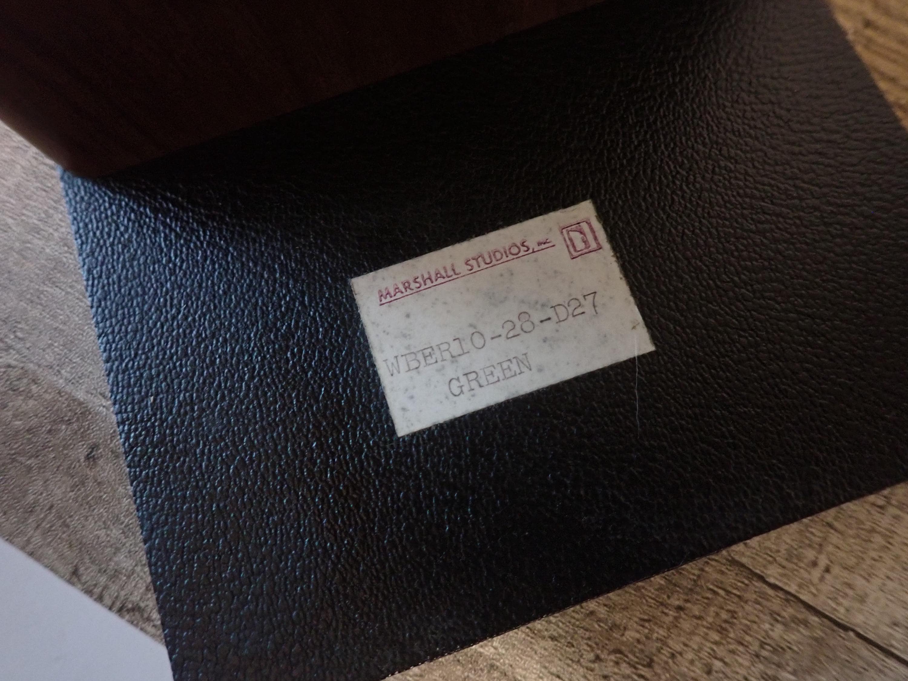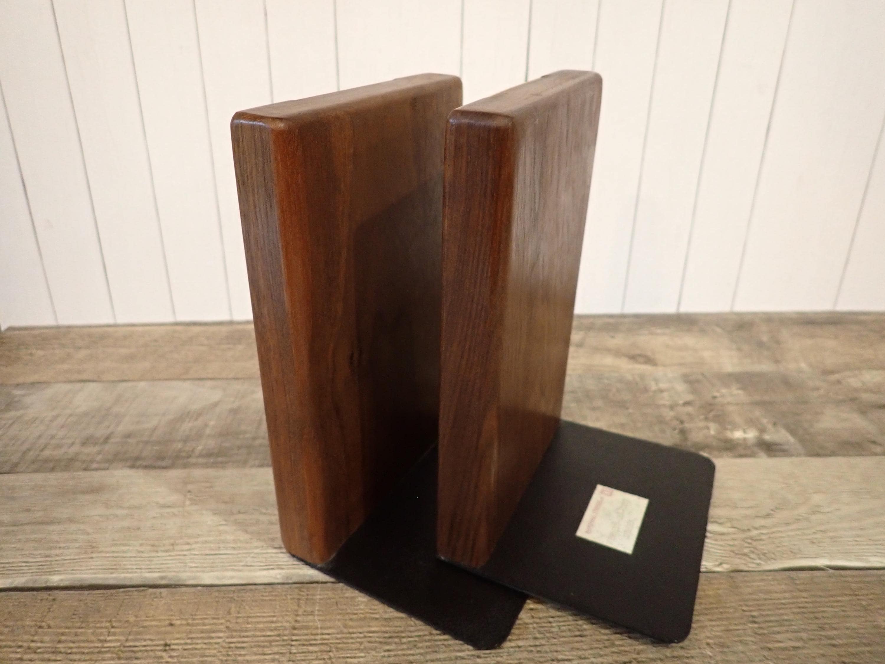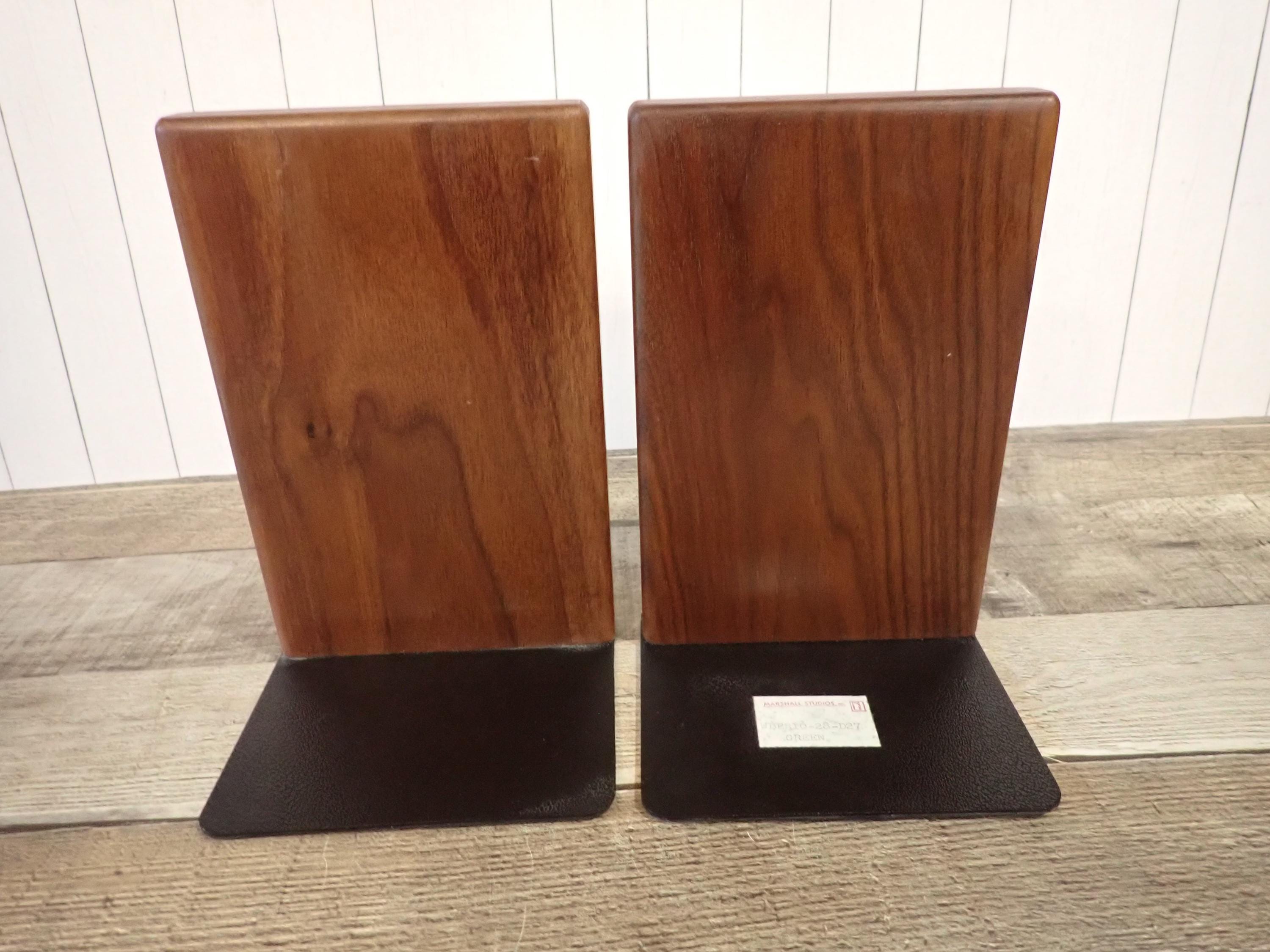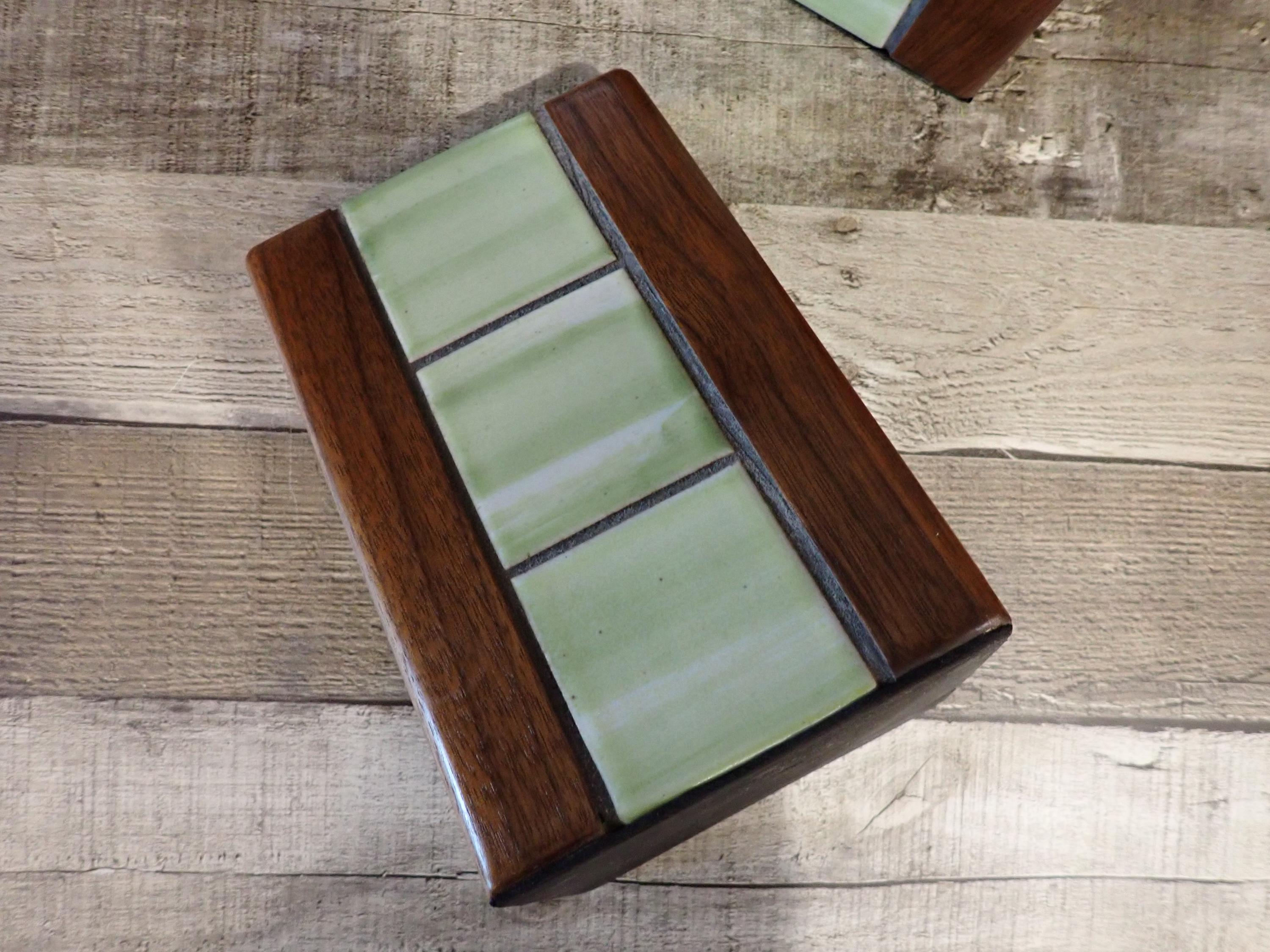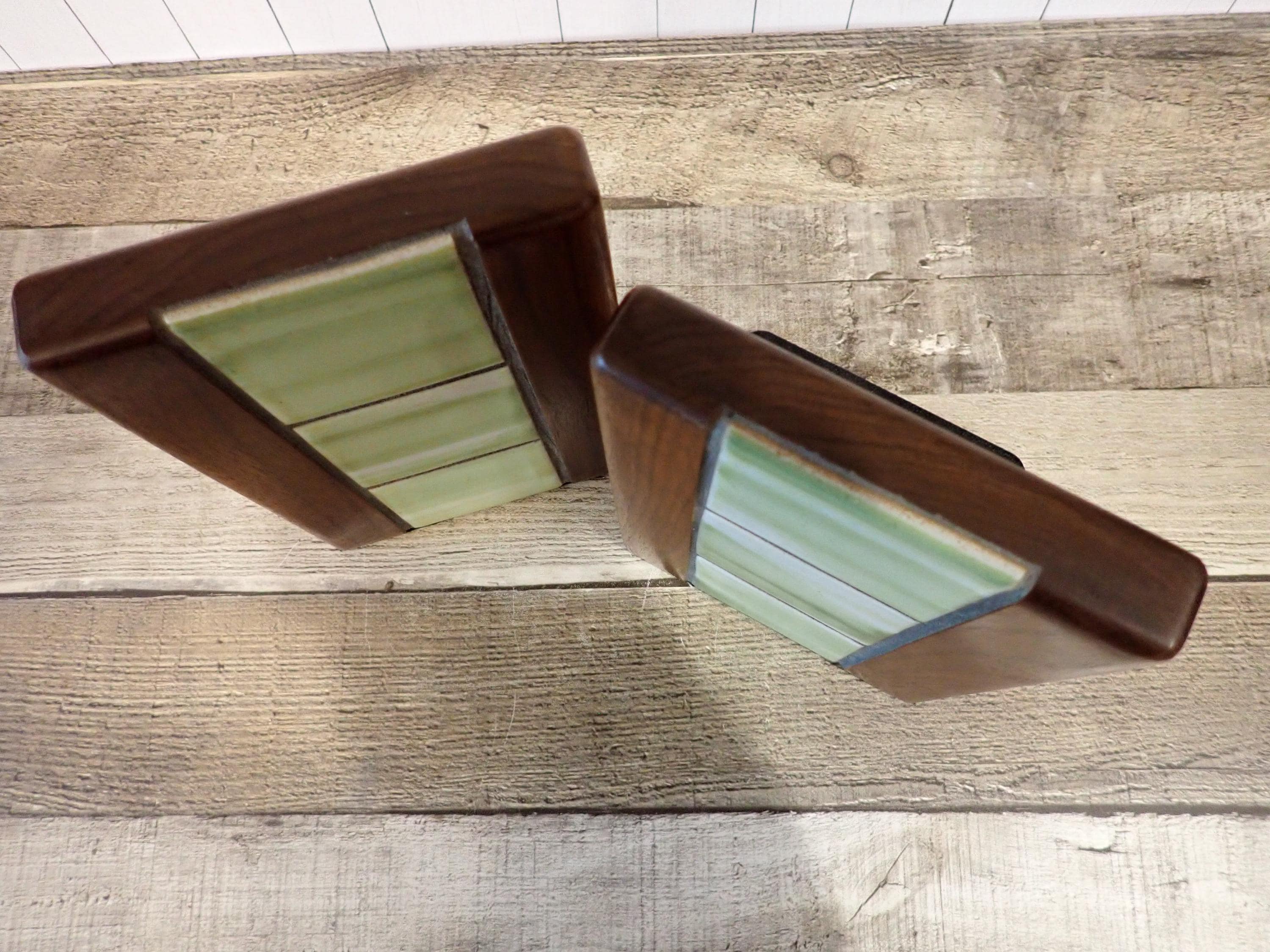 This pair of walnut and ceramic bookends were designed by Jane and Gordon Martz for Marshall Studios of Indiana. They are made of a 1" thick x 5" wide x 7.5" high piece of solid walnut with a row of 3 square green ceramic tiles. The overall dimensions are 5" wide x 7.5" high x 4.5" deep base plate. The bookends are in very good condition. The foam bottoms are intact for protection.