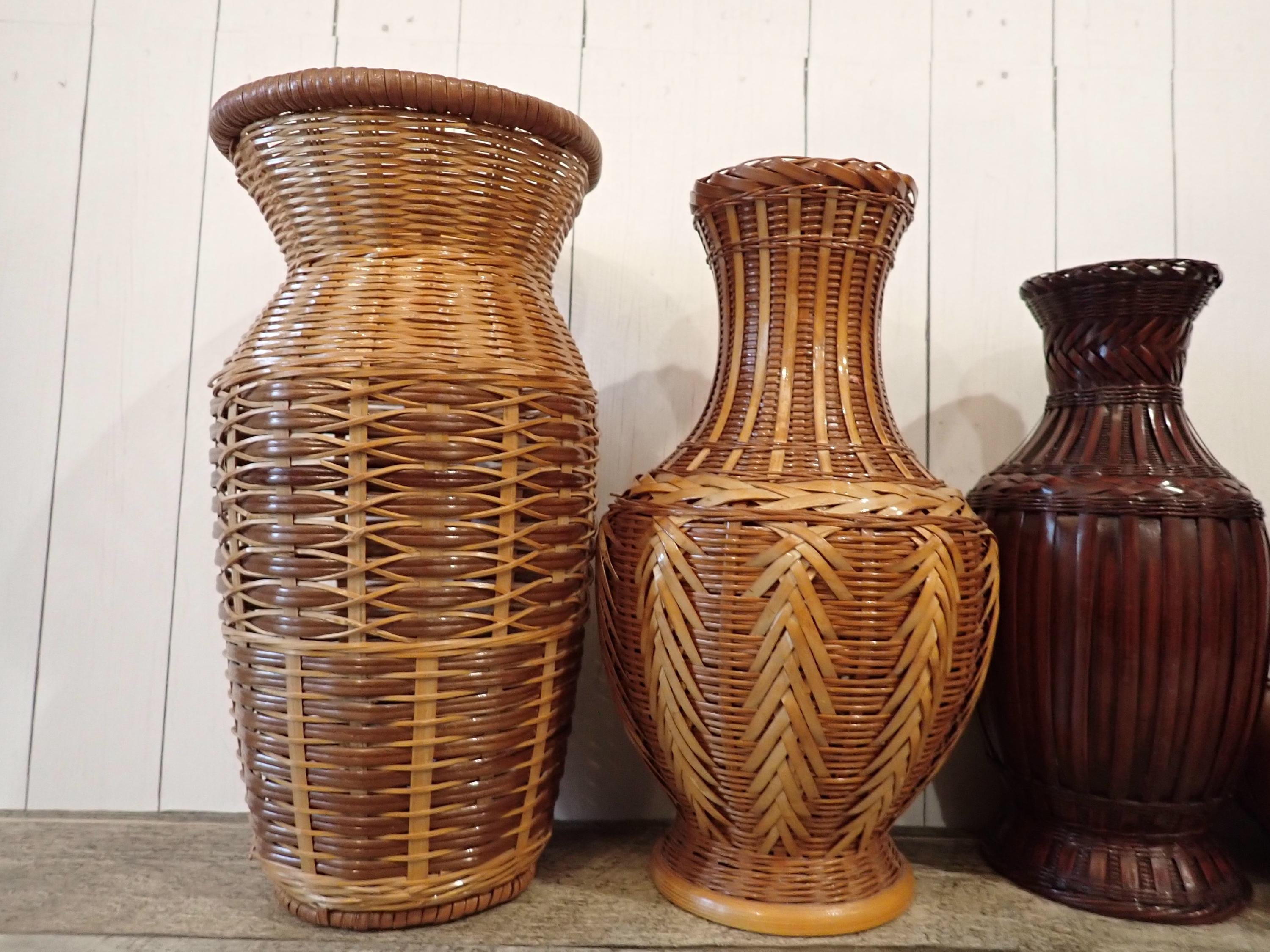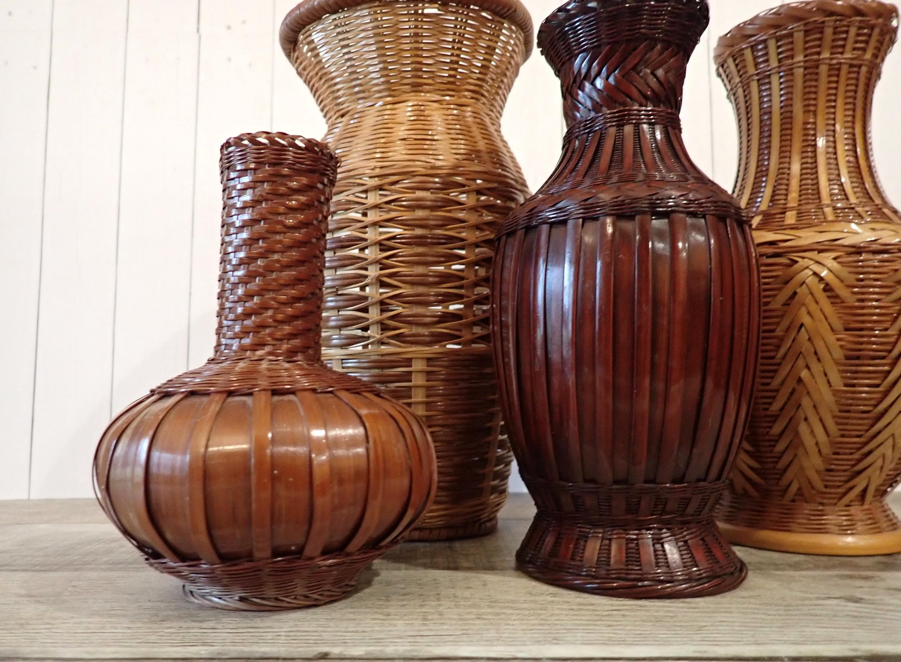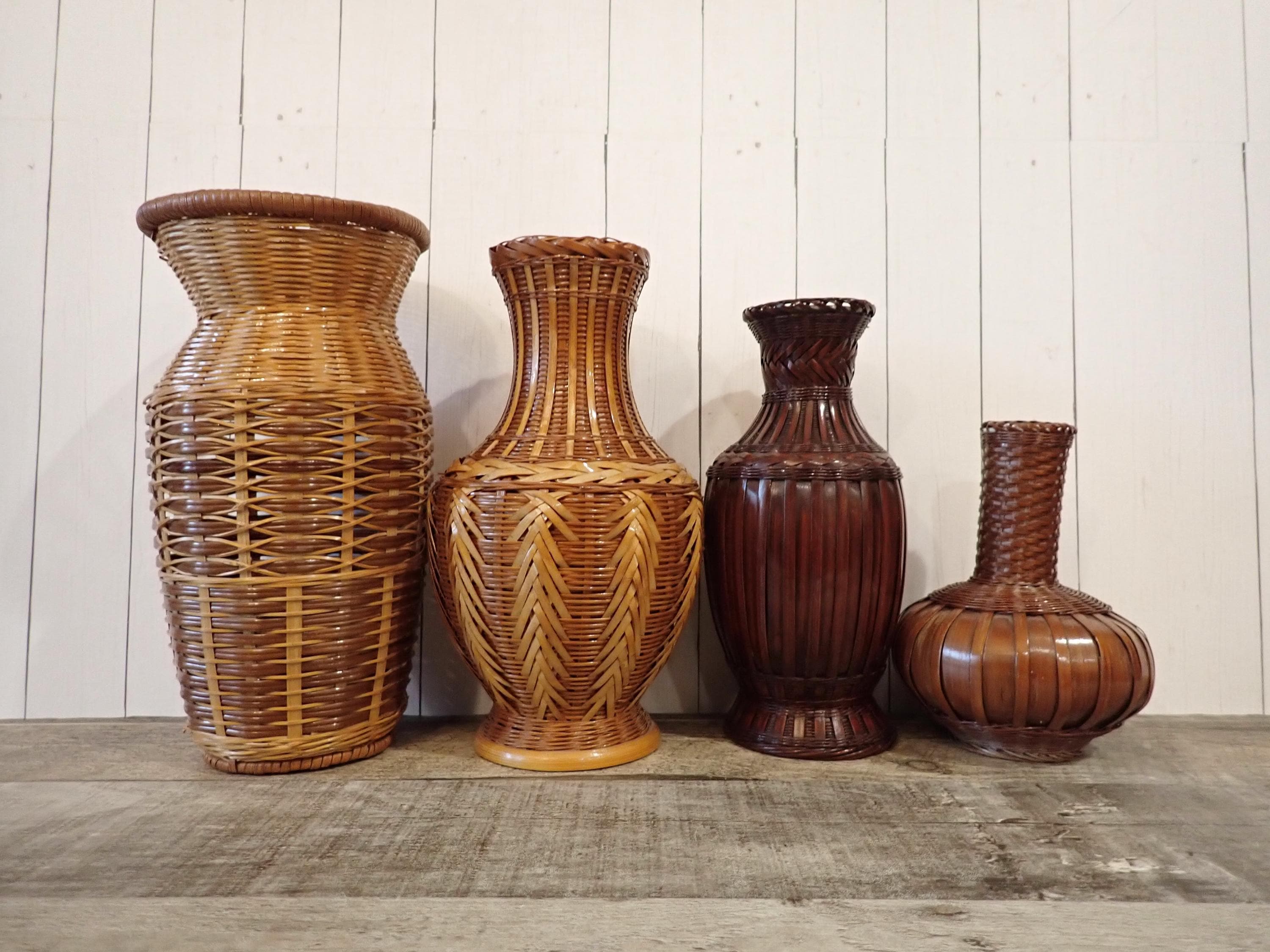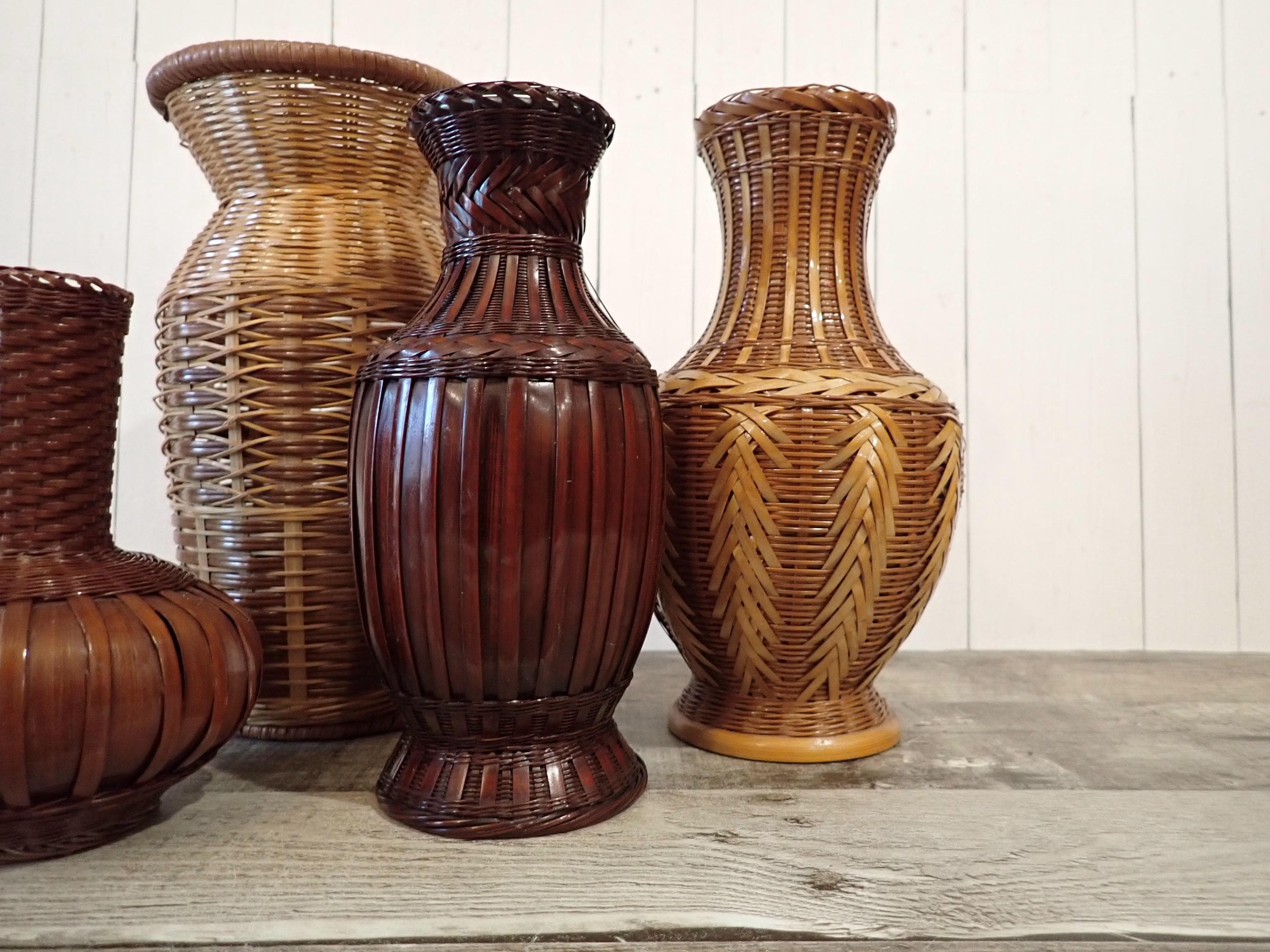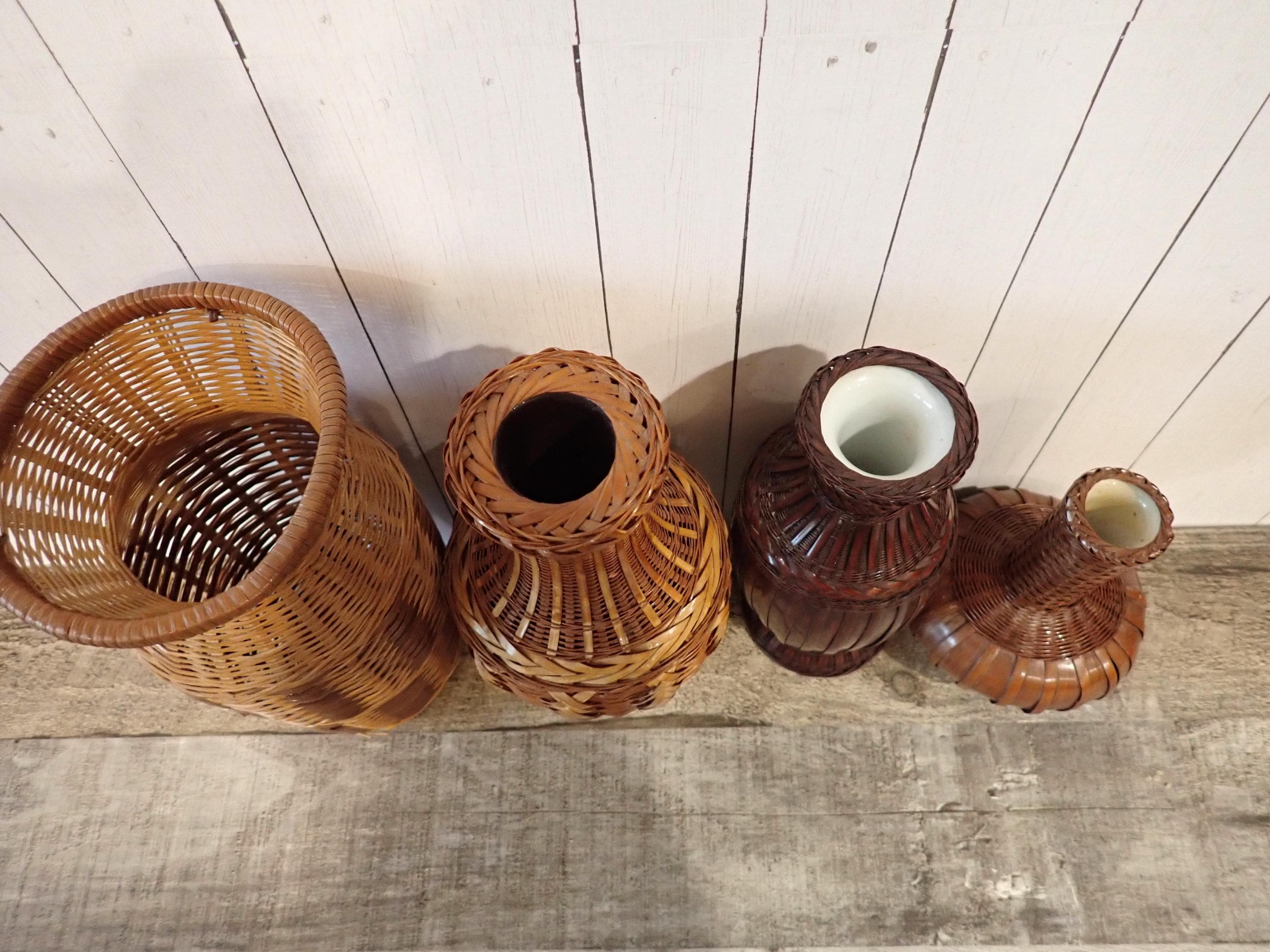 This set of woven wicker vases includes 4 vases in coordinating patterns. The vases are made of an intricately woven wicker creating unique designs in the weaving. The two larger vases are tan, and the two smaller vases are a darker brown color. Three of the vases have a ceramic insert inside the wicker to hold water for live plants - the larges vase does not have this insert and can hold faux or dried flowers. The vases range in height from 5.5" to 8.5" tall, and 3" to 5.5" in diameter. All 4 vases are in very good condition with no breaks or areas of loss in the weaving. Great set of wicker vases for live or faux plants!