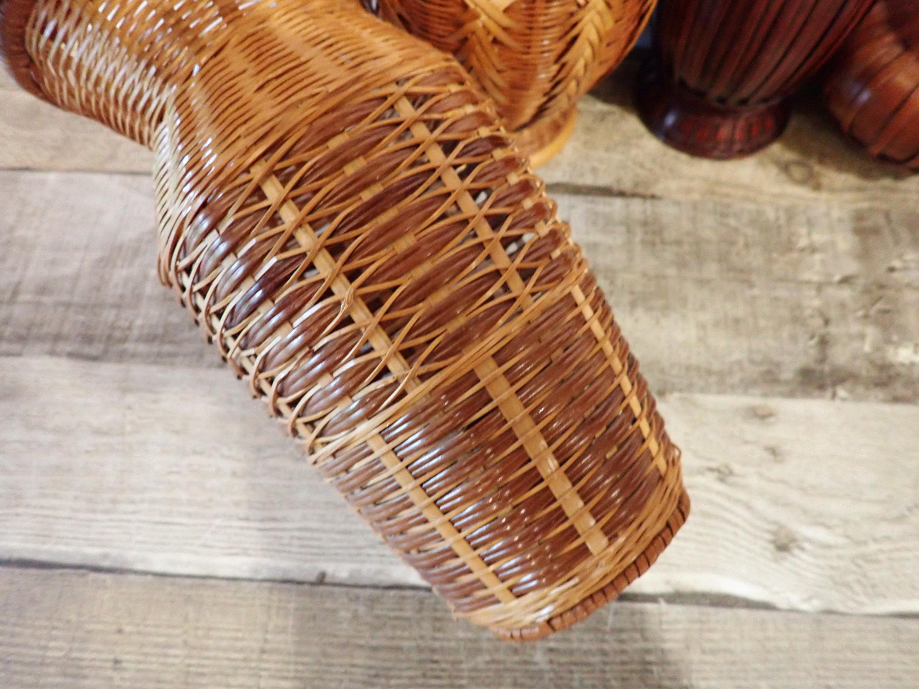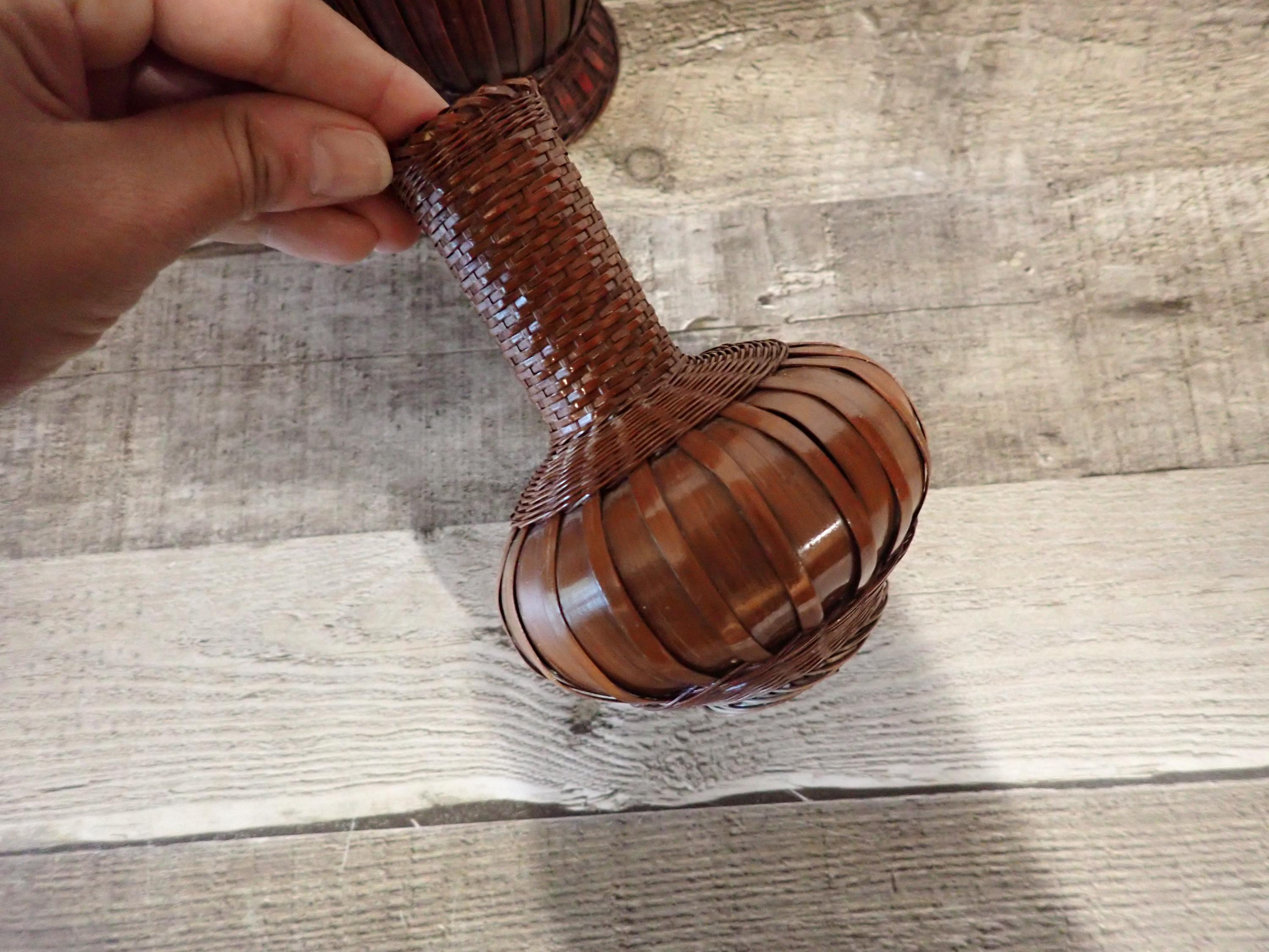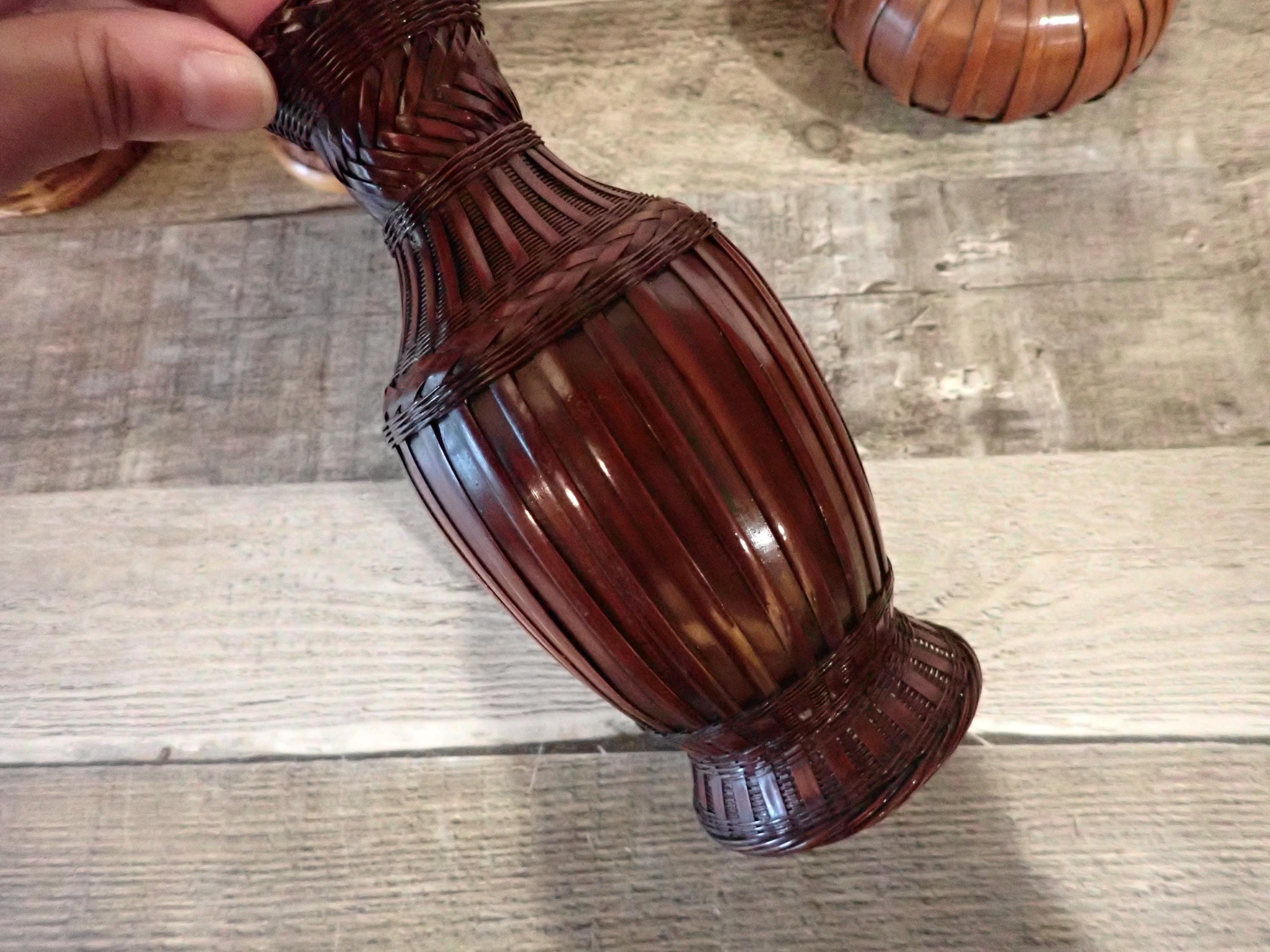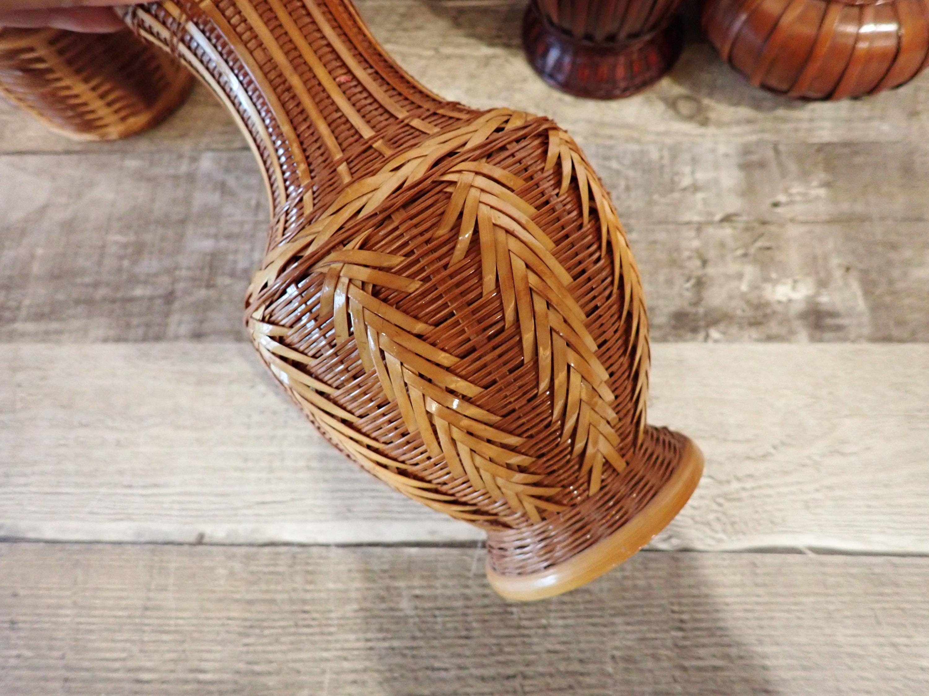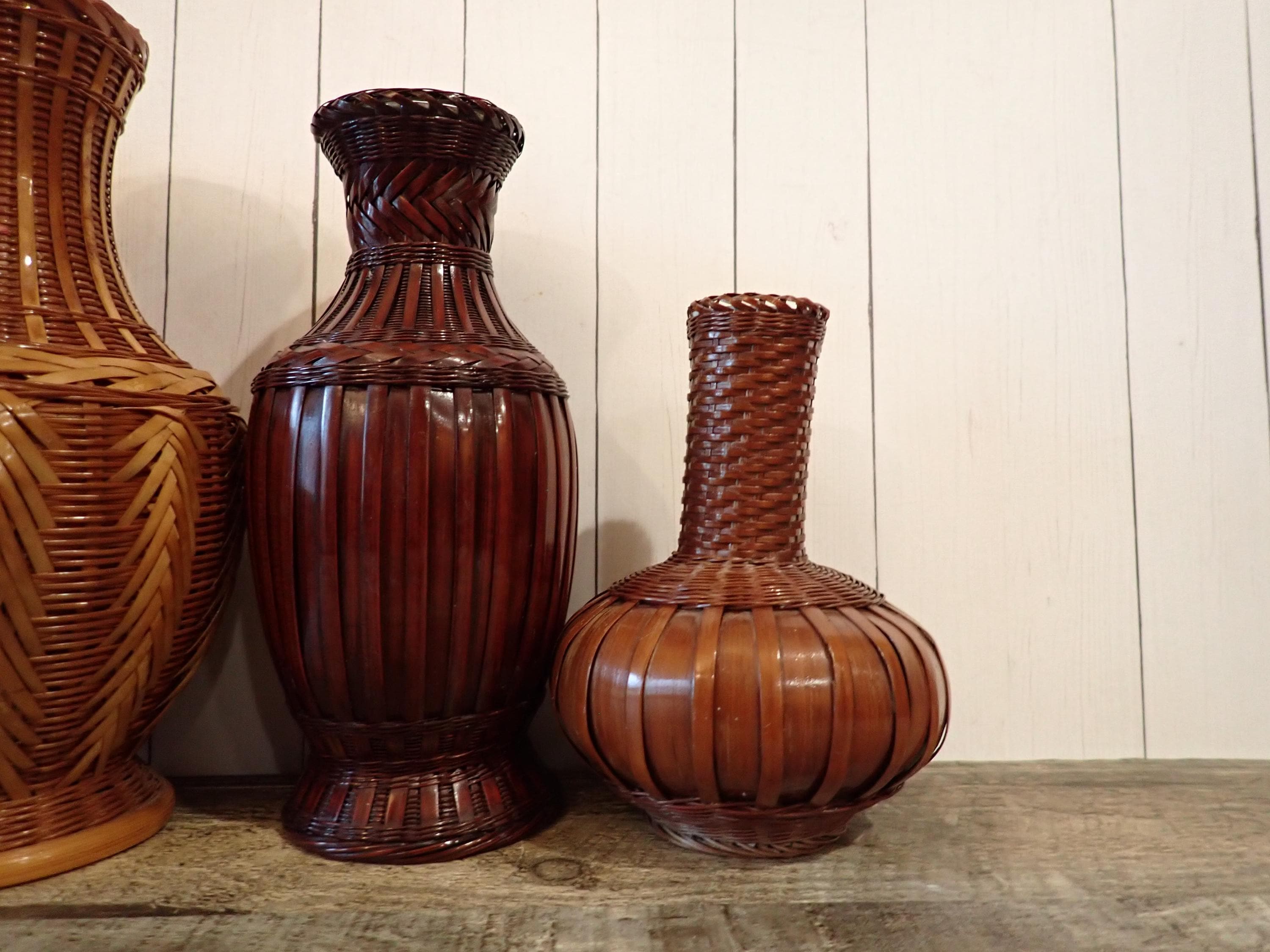 This set of woven wicker vases includes 4 vases in coordinating patterns. The vases are made of an intricately woven wicker creating unique designs in the weaving. The two larger vases are tan, and the two smaller vases are a darker brown color. Three of the vases have a ceramic insert inside the wicker to hold water for live plants - the larges vase does not have this insert and can hold faux or dried flowers. The vases range in height from 5.5" to 8.5" tall, and 3" to 5.5" in diameter. All 4 vases are in very good condition with no breaks or areas of loss in the weaving. Great set of wicker vases for live or faux plants!