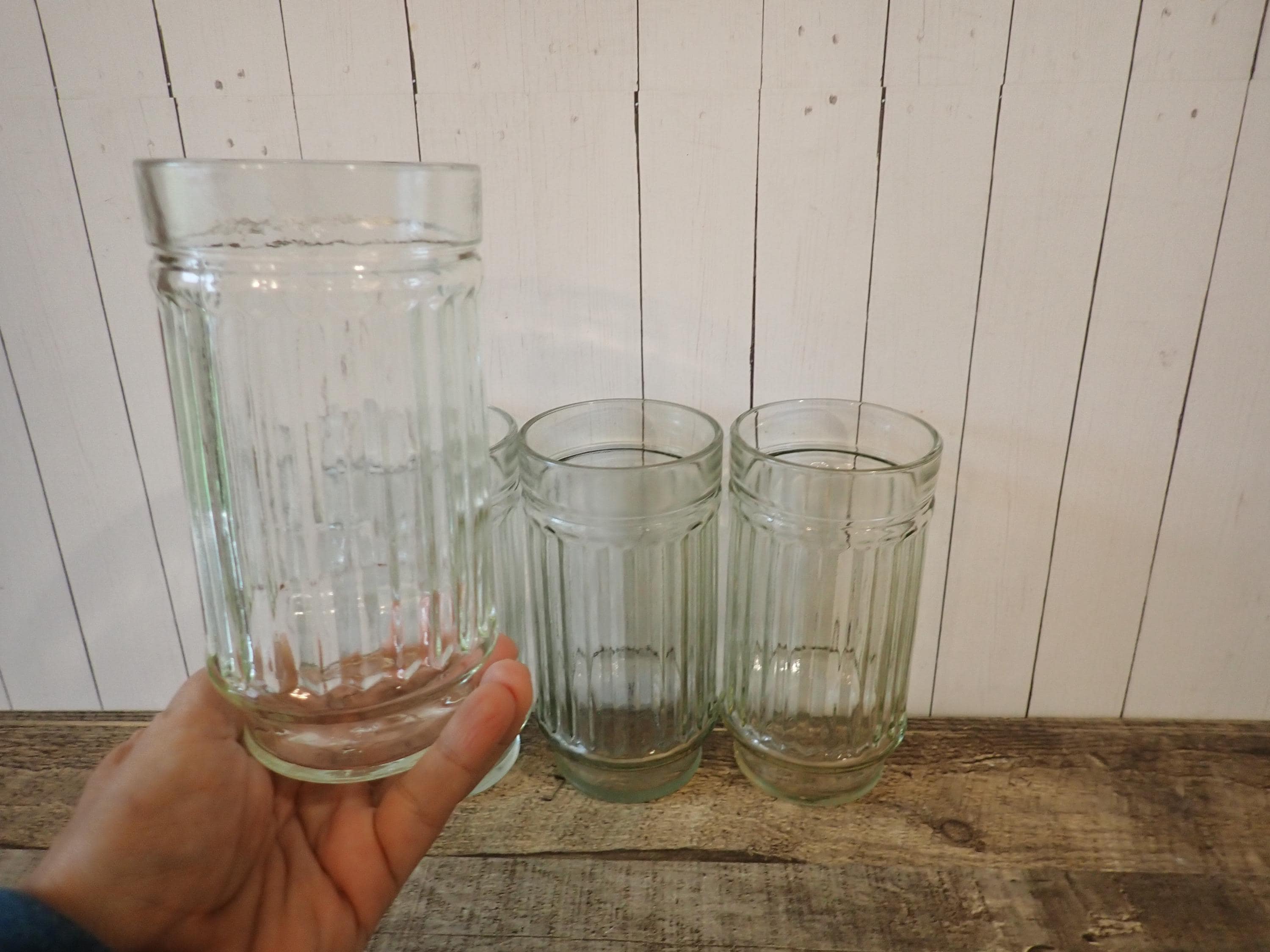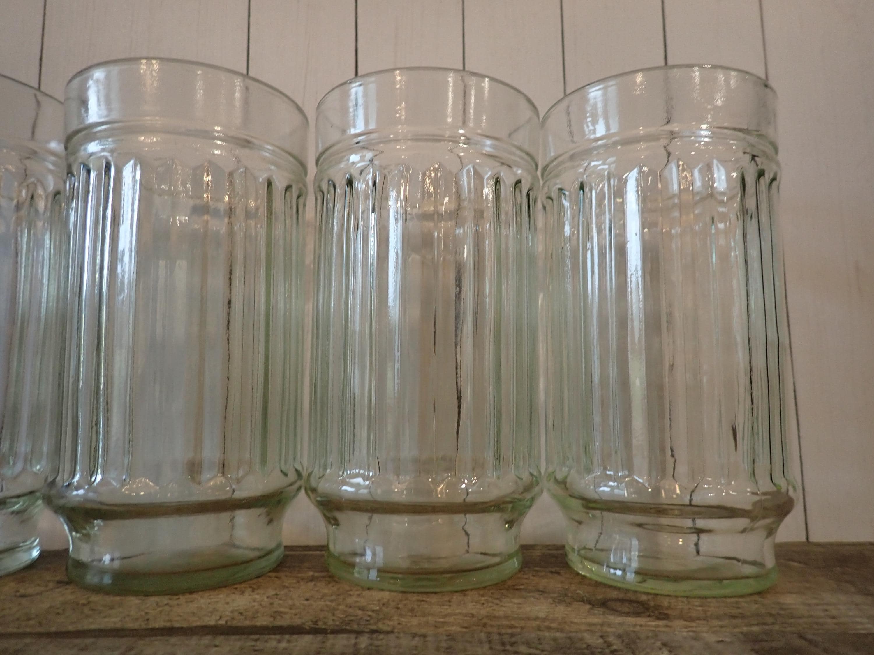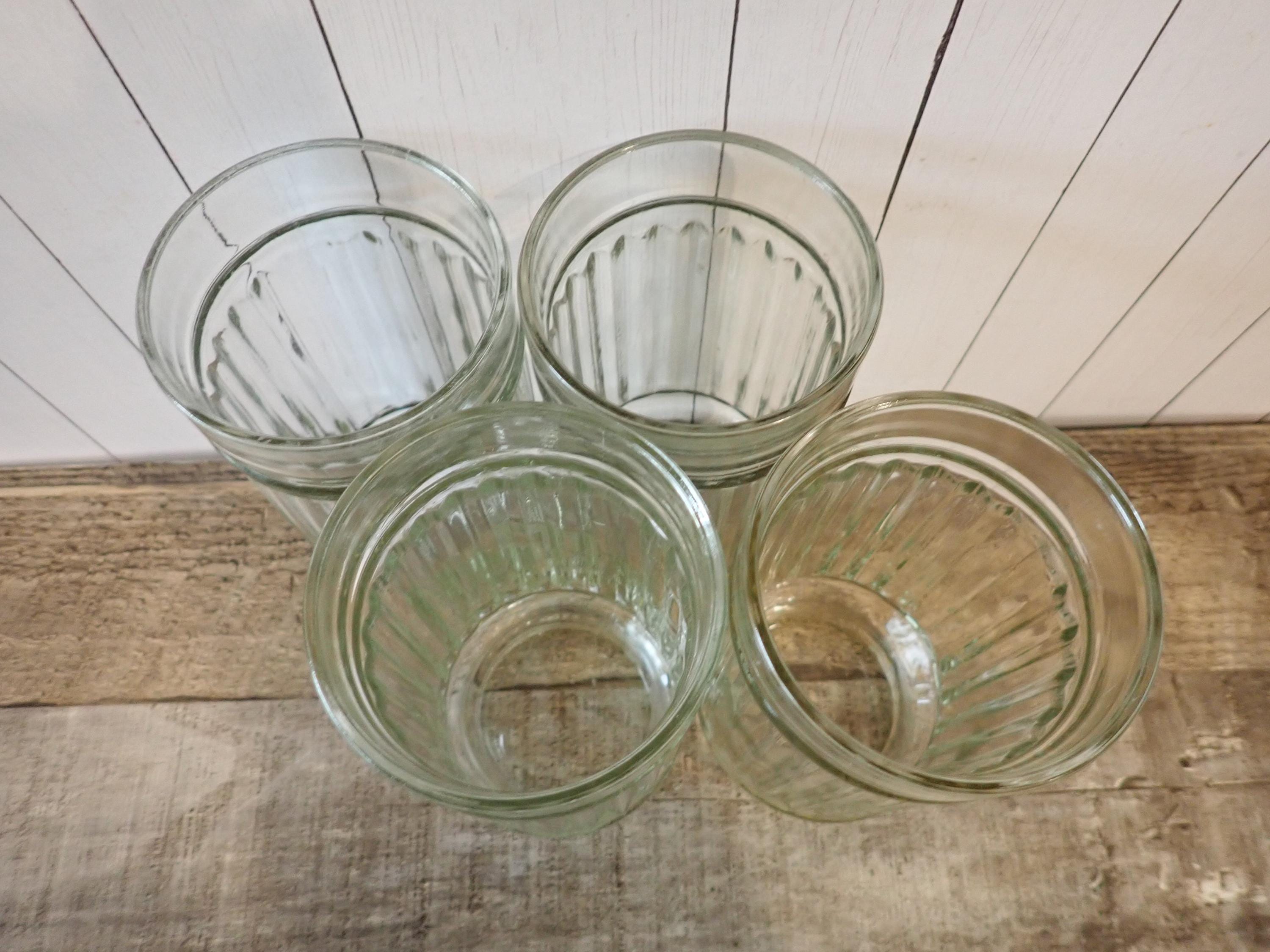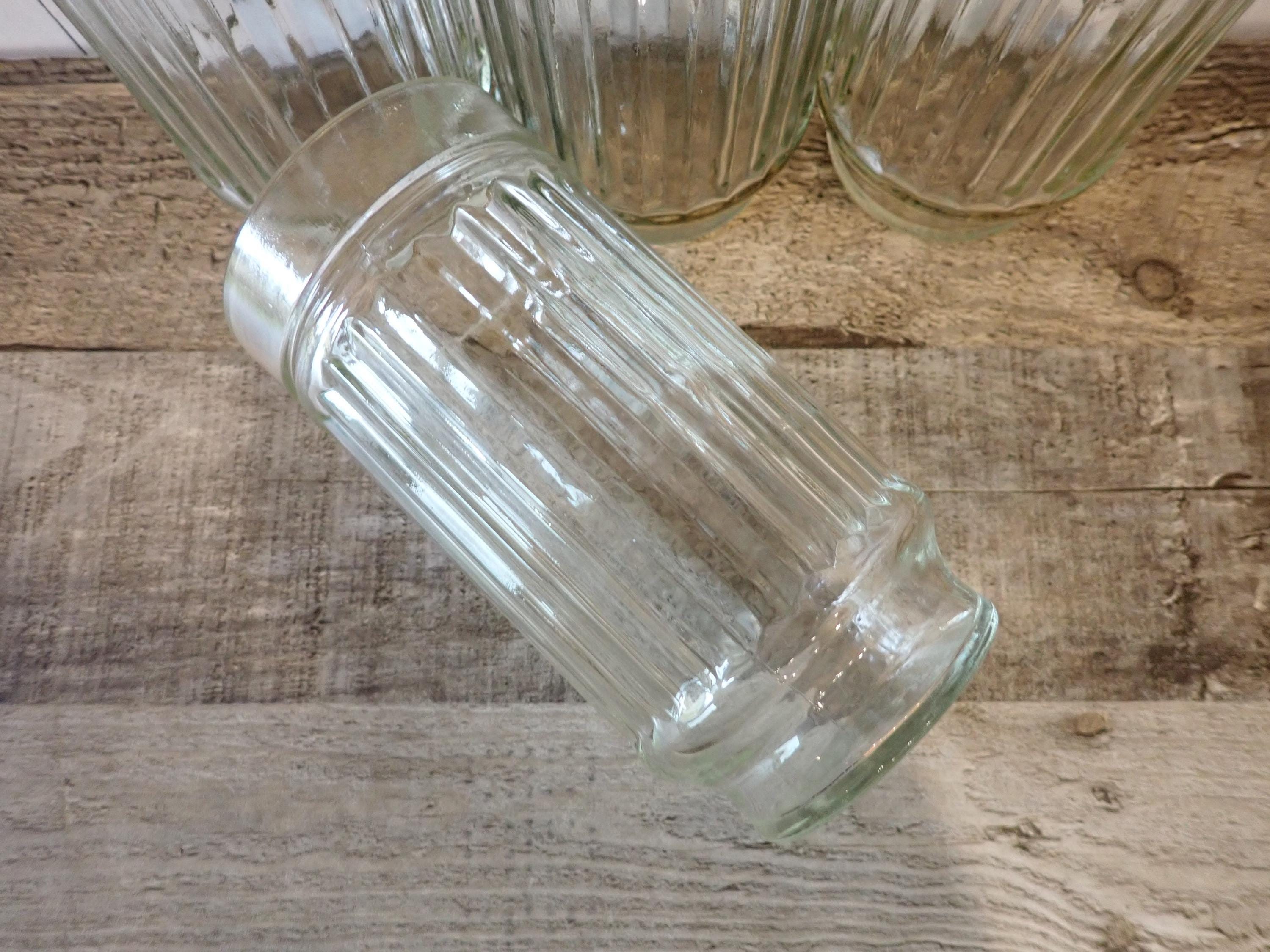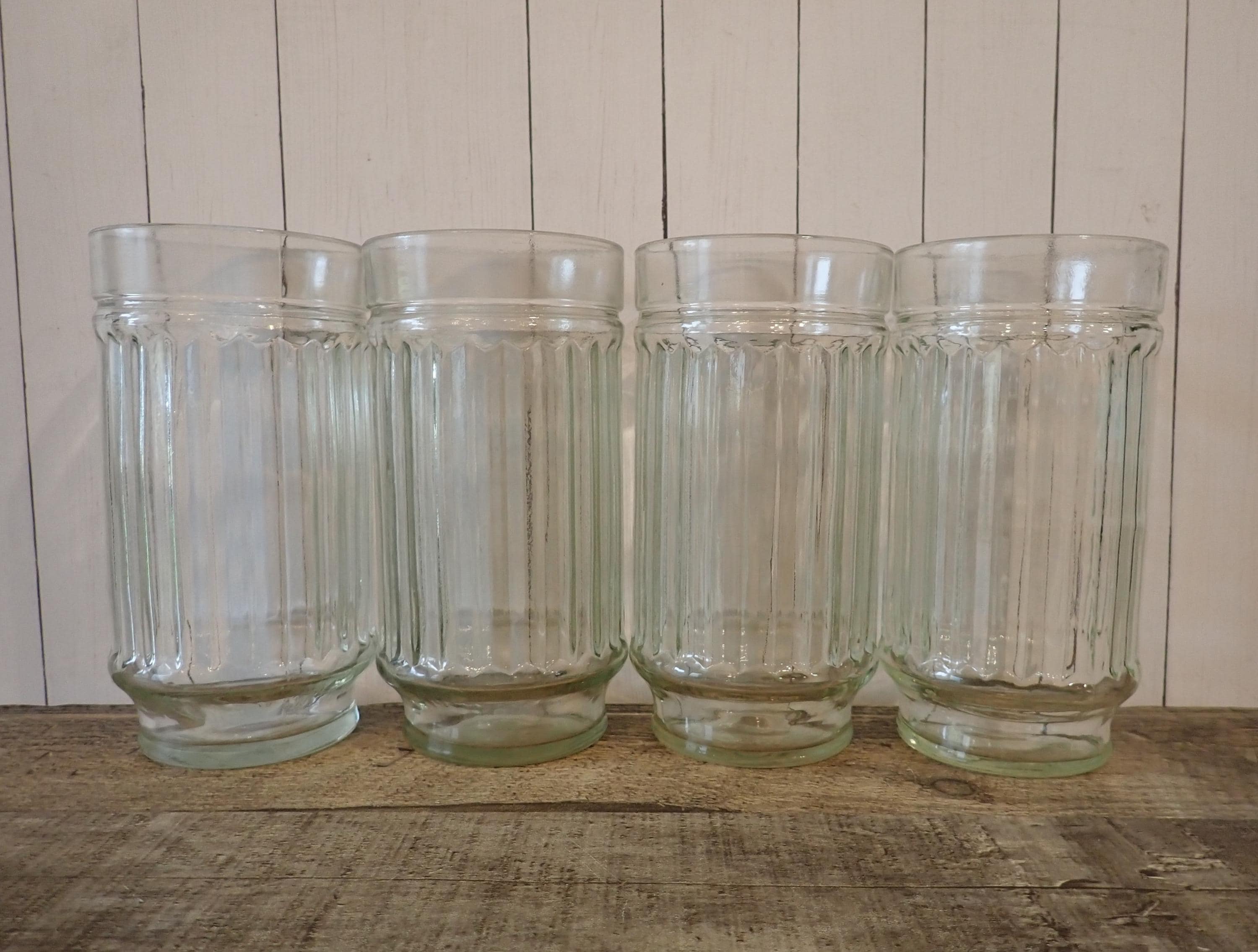 This great set of tumblers by Anchor Hocking are the Line Lites pattern. They are made of a thick, clear glass and have a simple and modern vertical ribbed design around the glass. There is a wide, plain band around the top and bottom. These glasses are the 16 oz. tumblers, and are 6.25" tall and 2.75" in diameter. They can each hold 16 oz. of liquid filled to the rim. All 4 of the glasses are in very good condition with no chips or cracks! Great set of vintage Anchor Hocking!