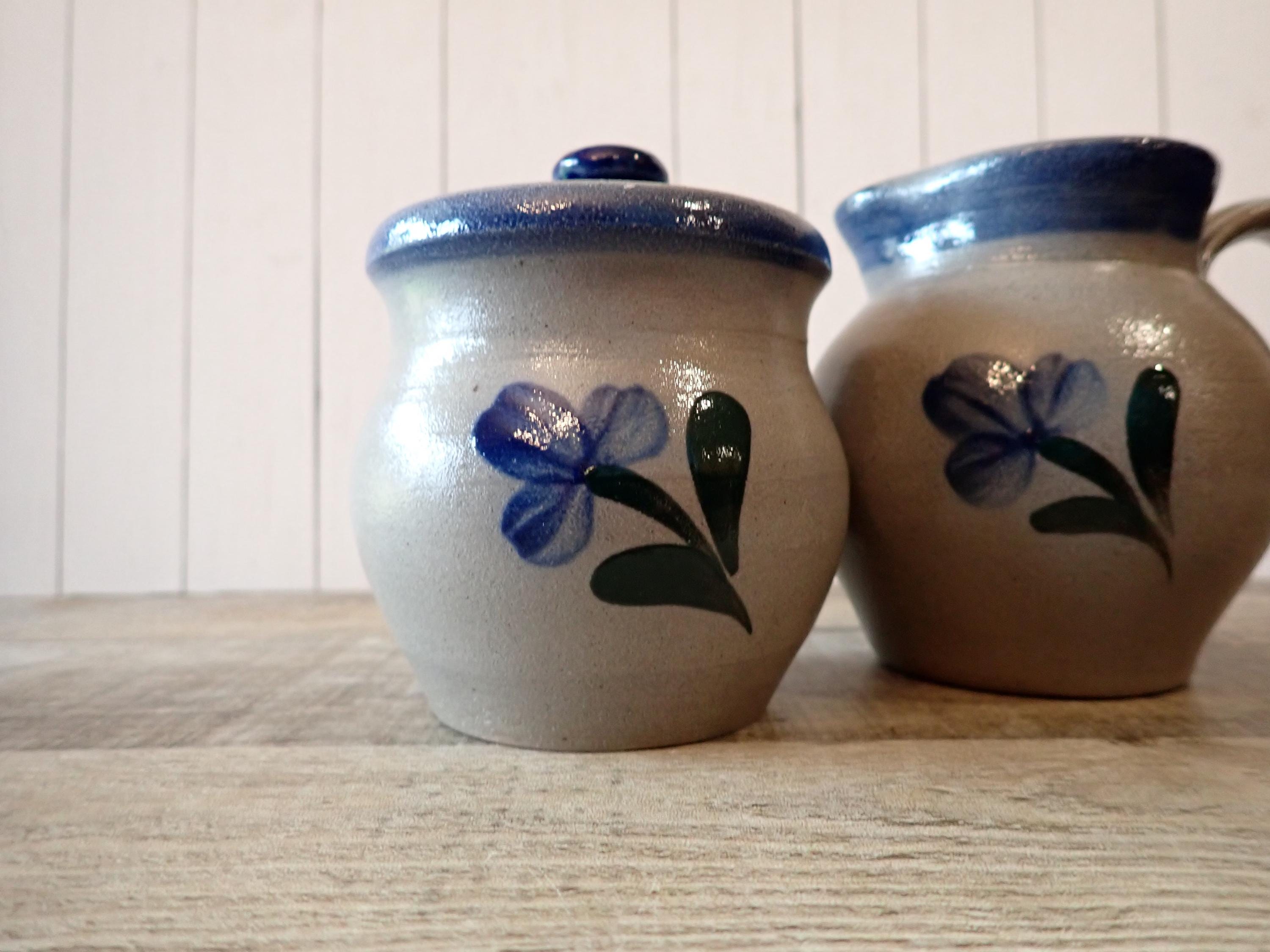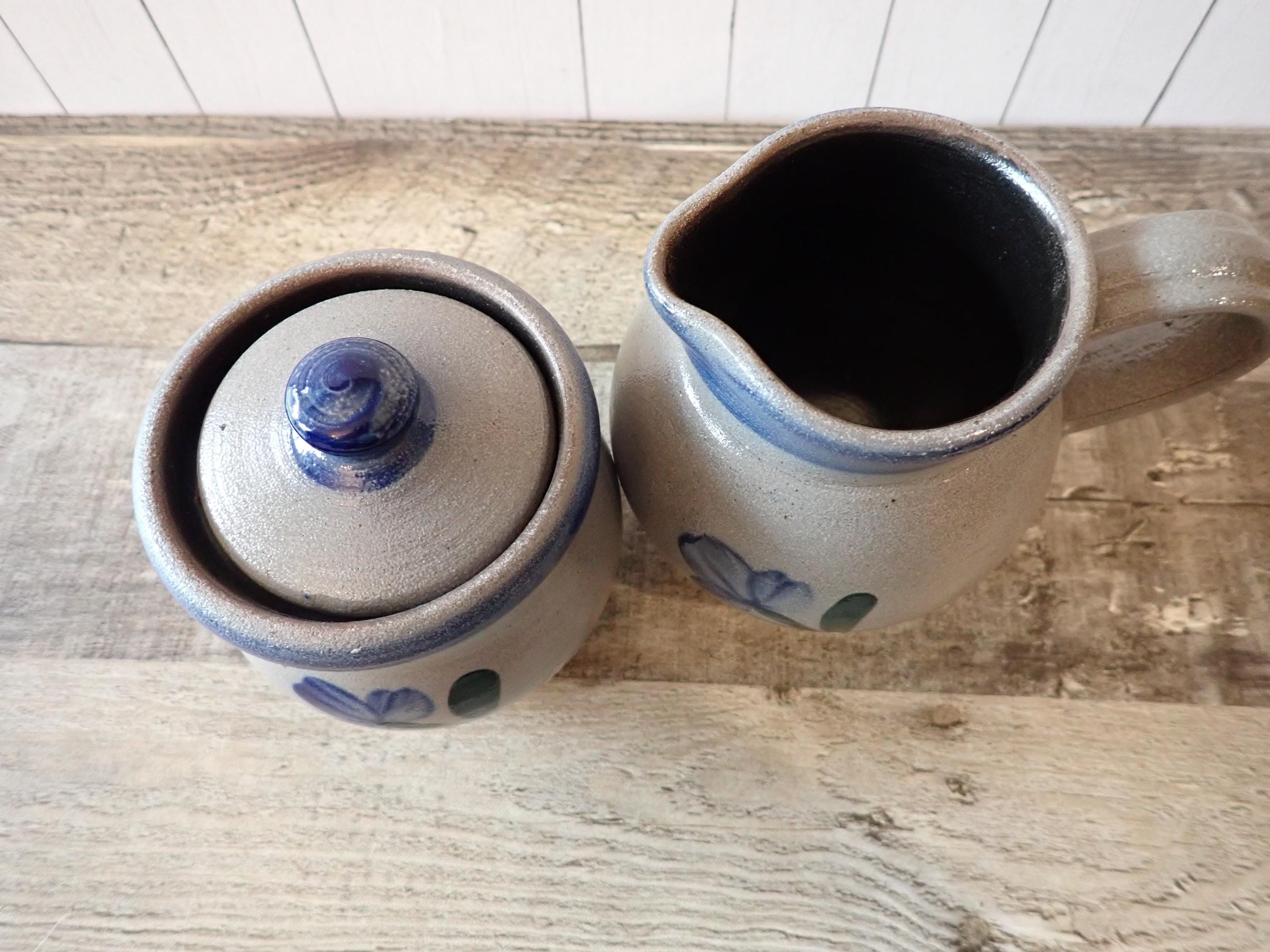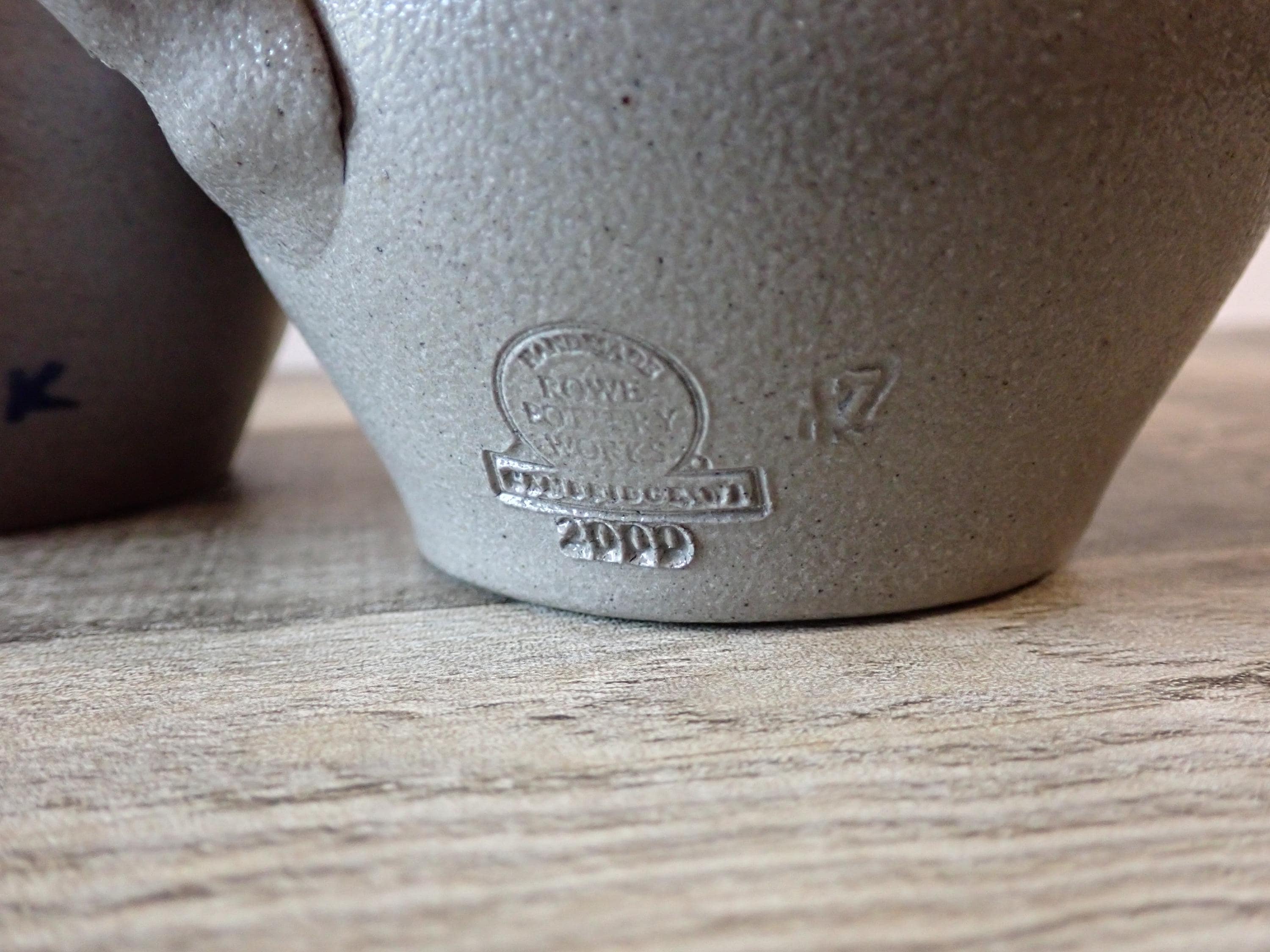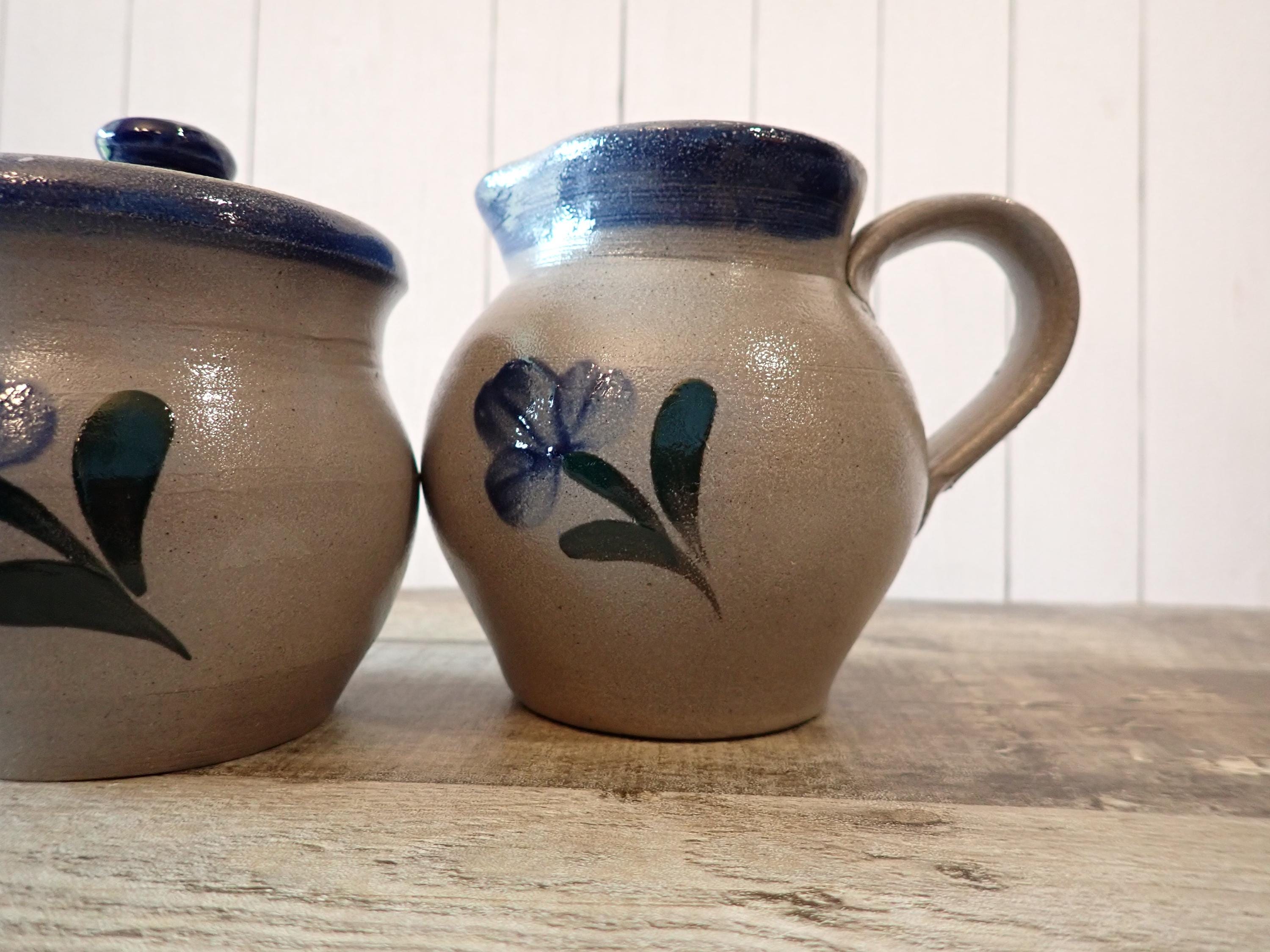 This Rowe Pottery Works sugar bowl and creamer set is from 2000 and has a blue and green flower and leaf pattern. Both pieces are stamped with the Rowe Pottery logo and the year 2000. They are both in very good condition with no chips or cracks.