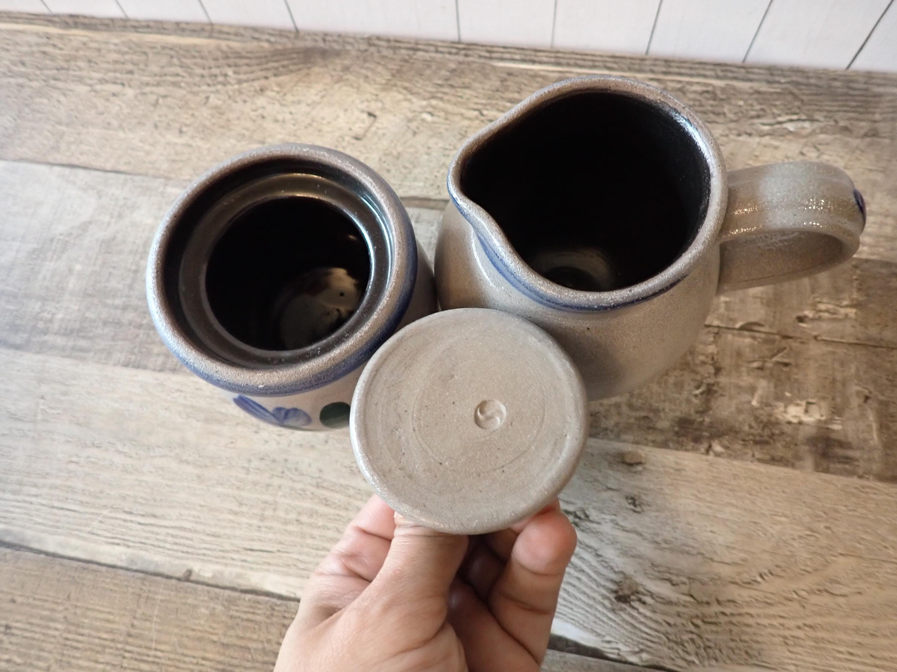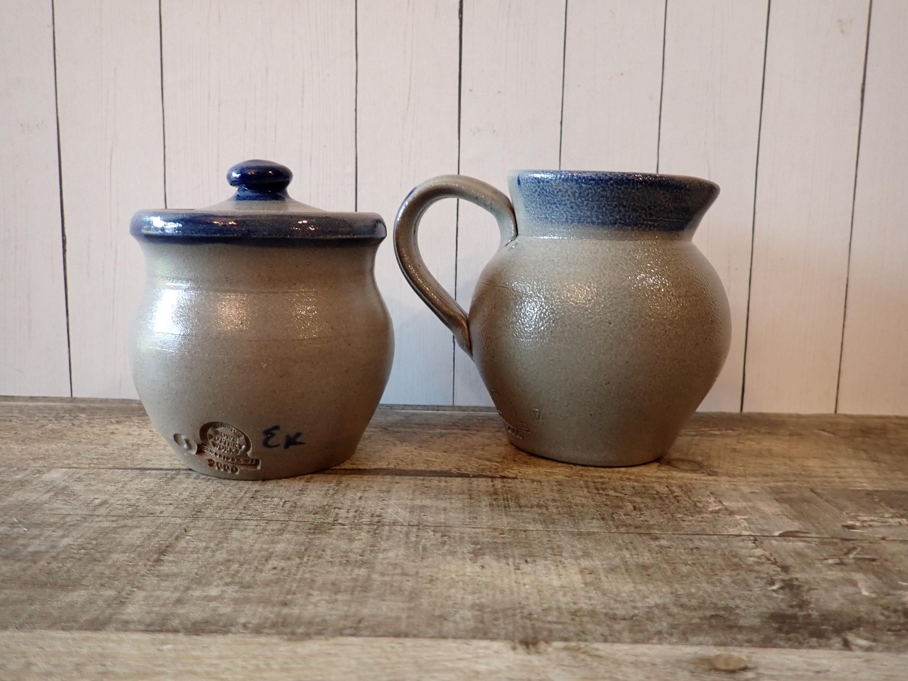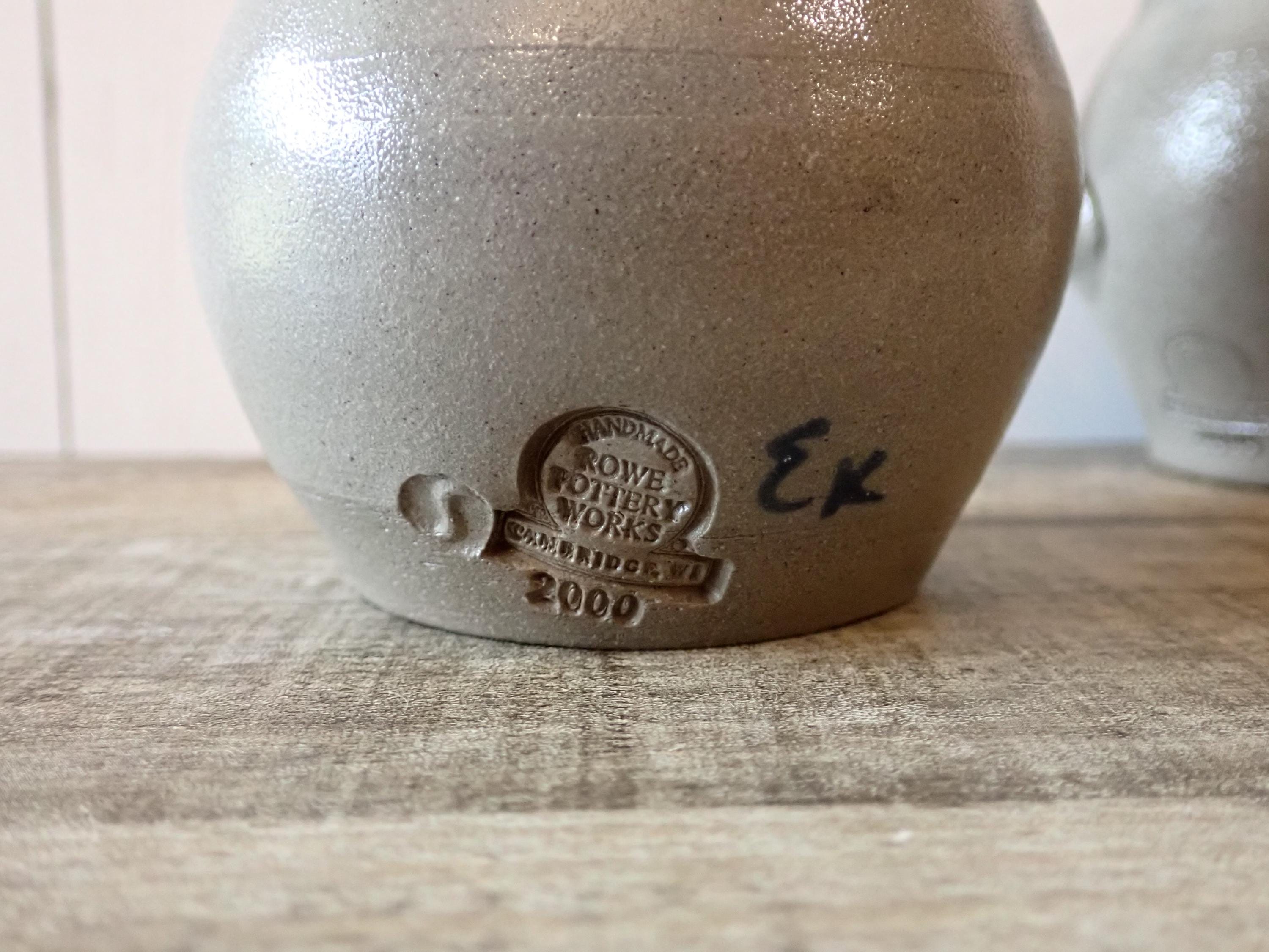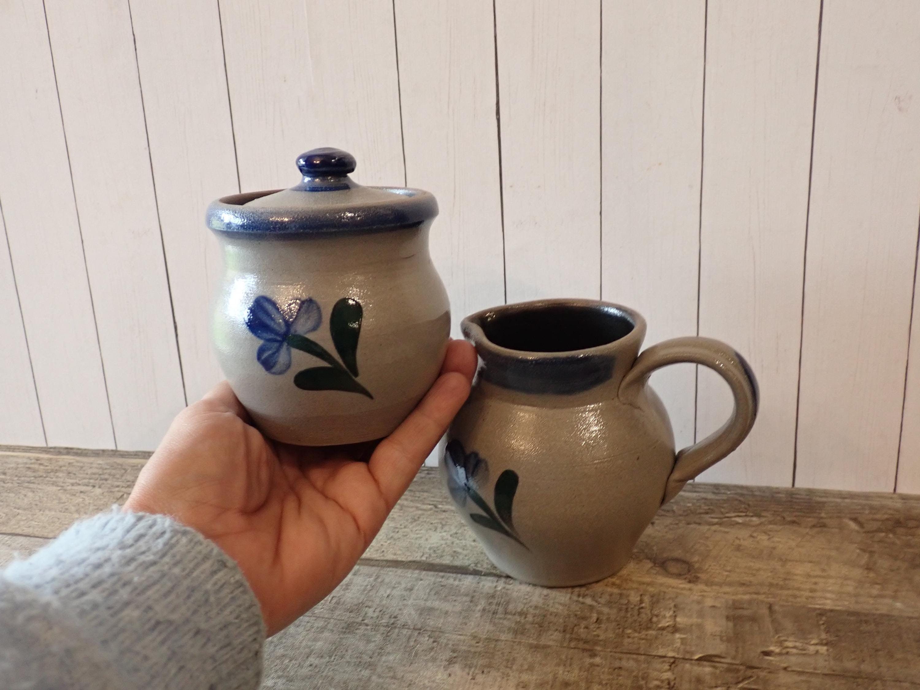 This Rowe Pottery Works sugar bowl and creamer set is from 2000 and has a blue and green flower and leaf pattern. Both pieces are stamped with the Rowe Pottery logo and the year 2000. They are both in very good condition with no chips or cracks.