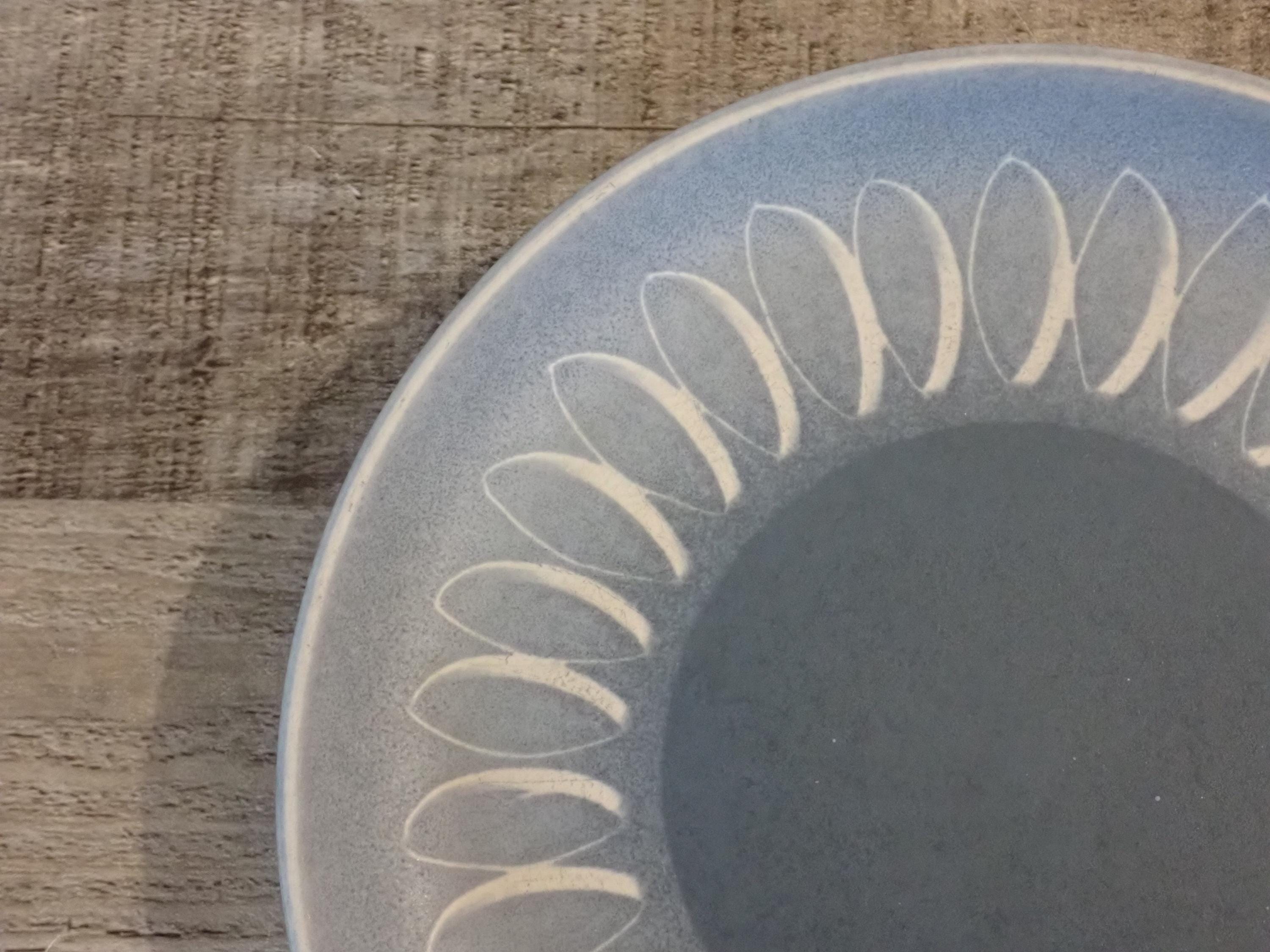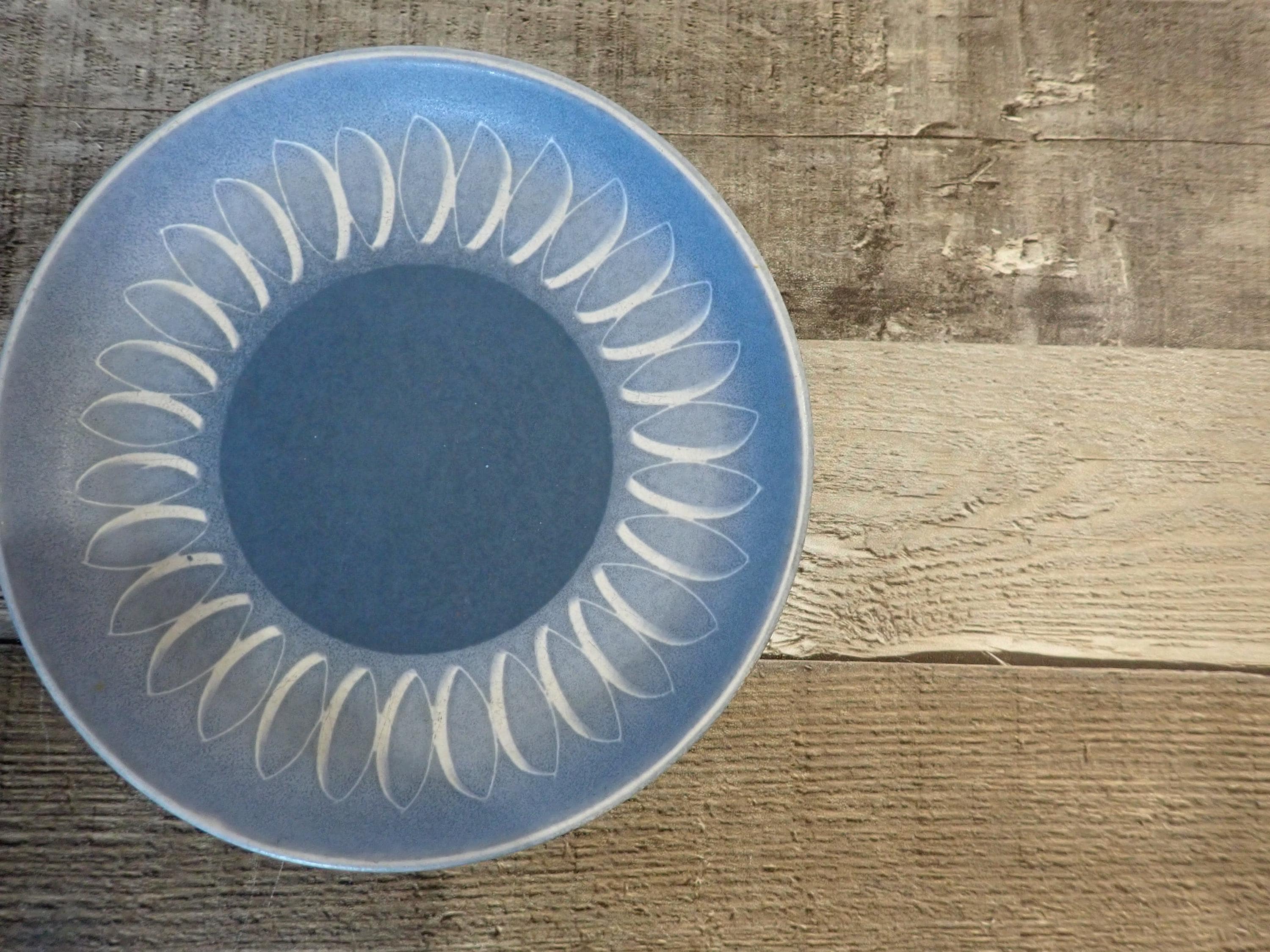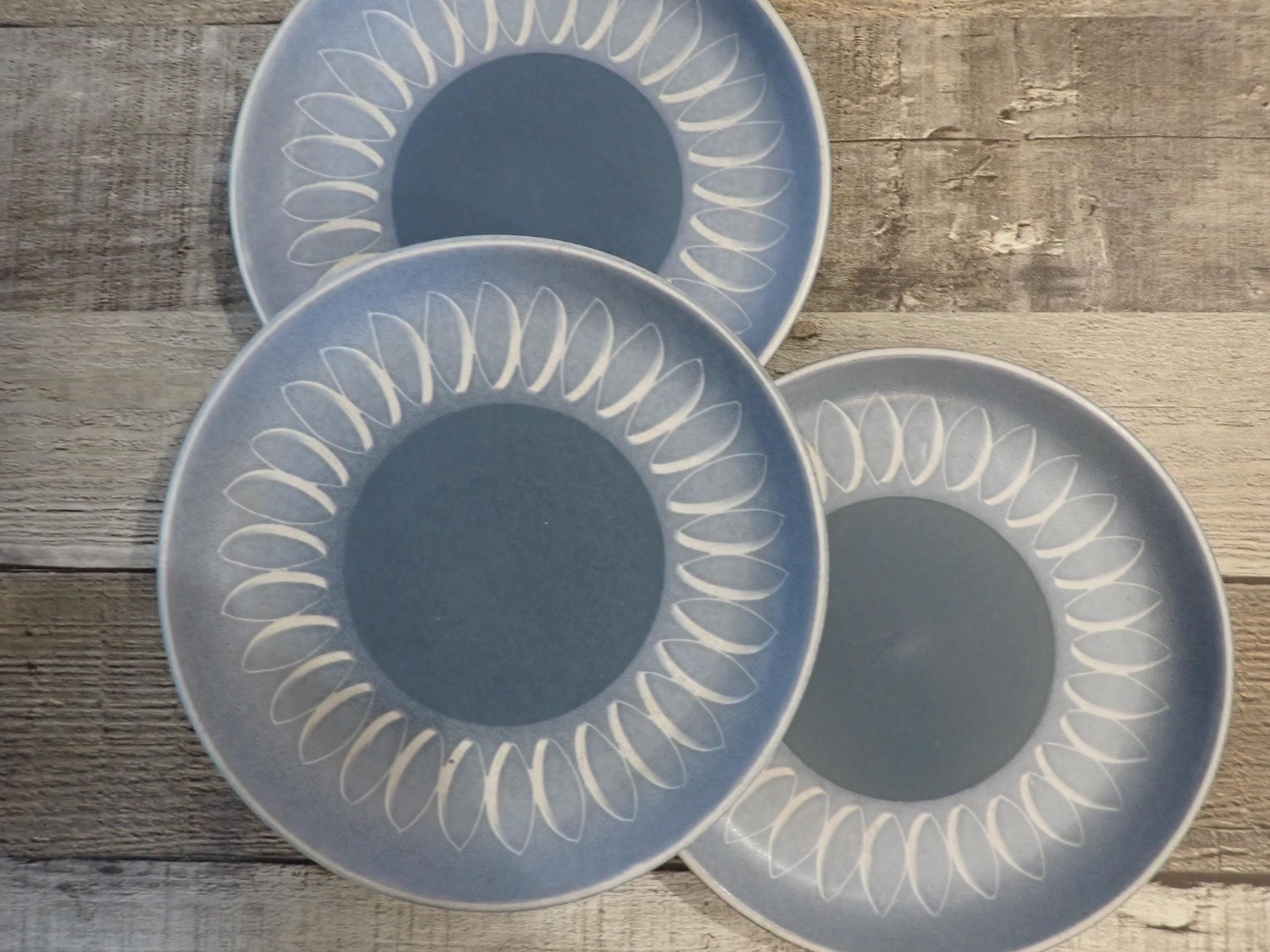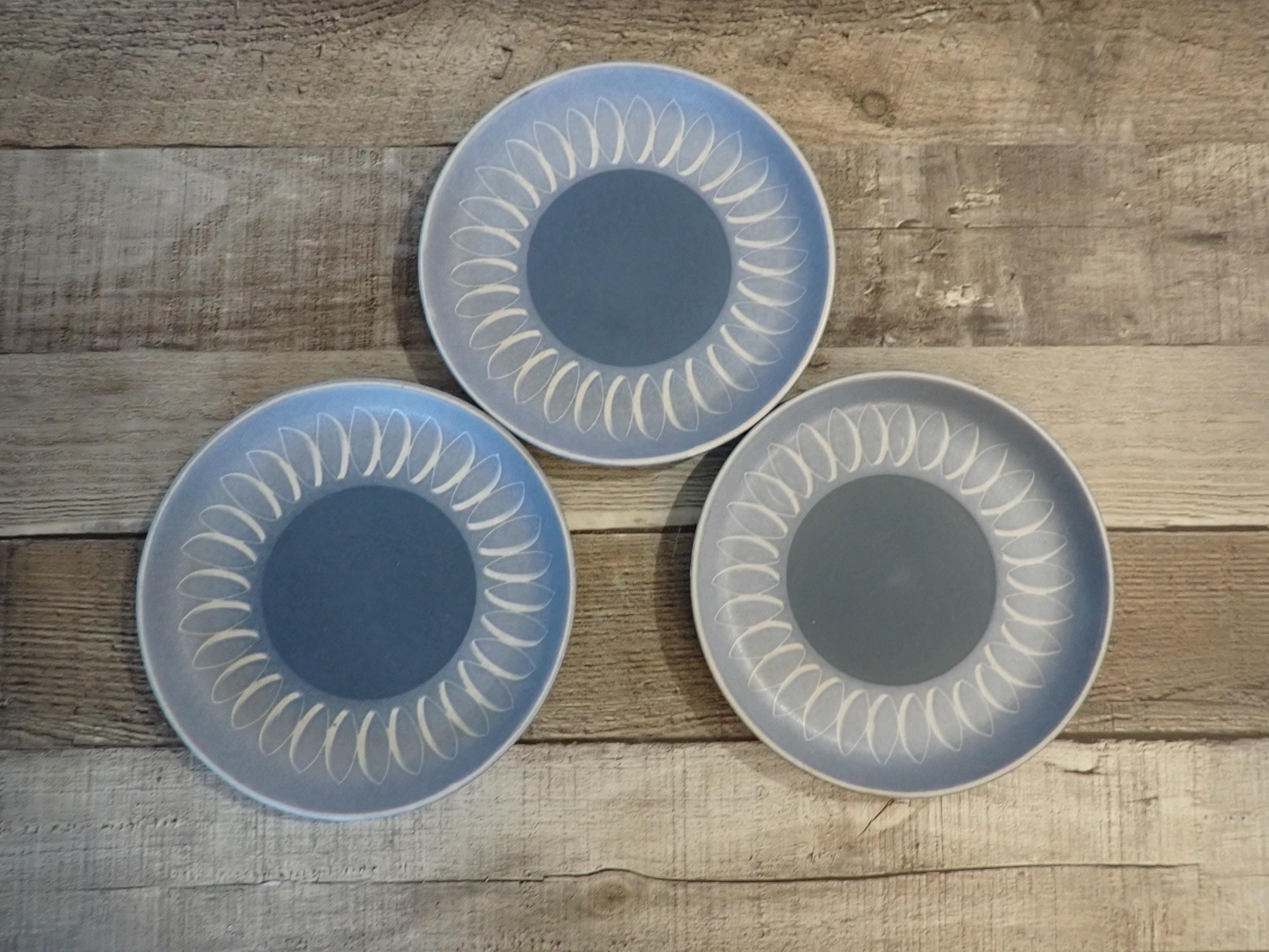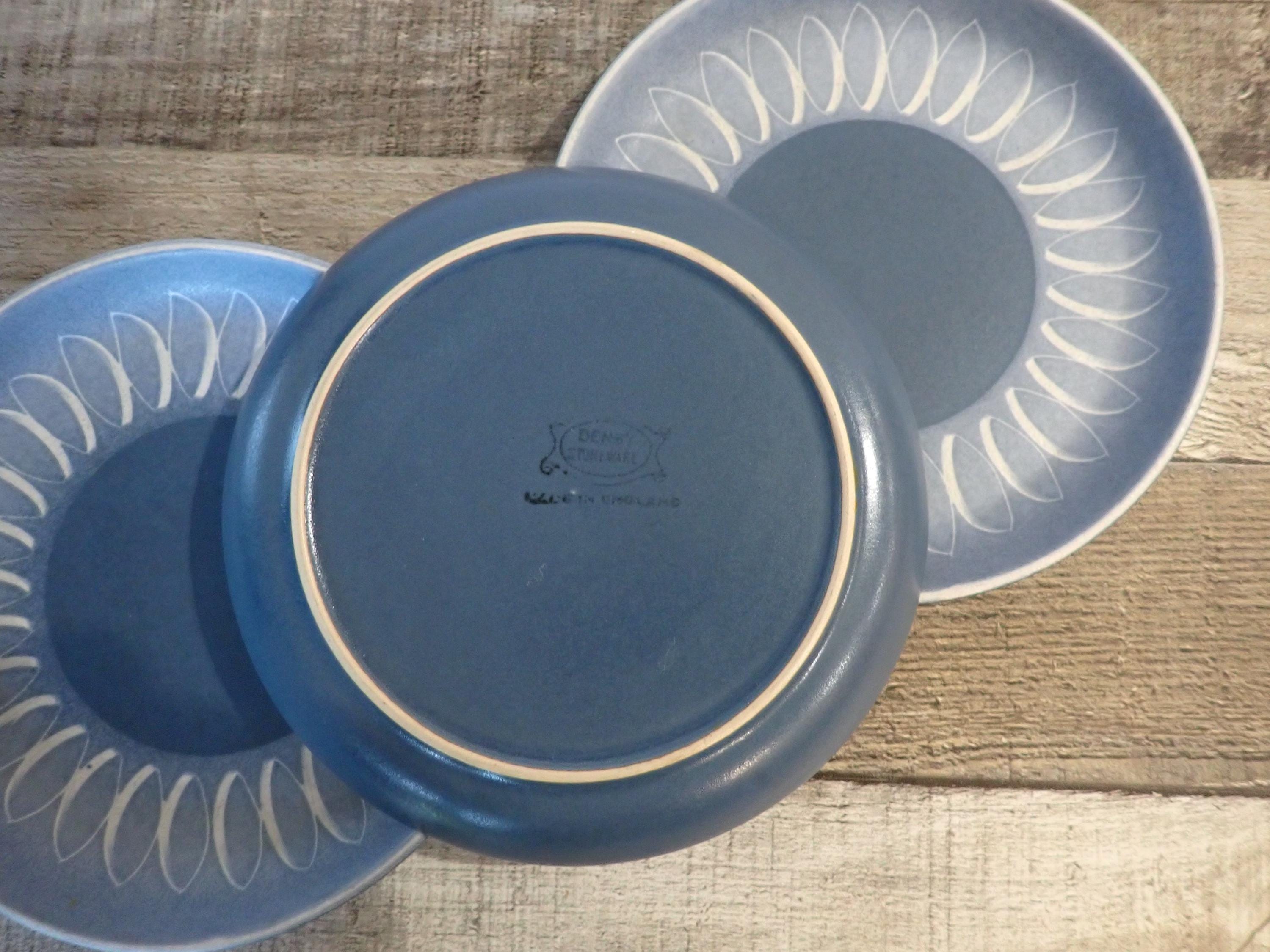 This set of stoneware plates by Denby are in the Blue Echo pattern. These plates are the Bread and Butter Plates and are 6.5" in diameter. They are a blue stoneware with a smooth matte finish, and has a white leaf shaped design around the border. The bottoms are marked with a Denby makers marks. All 3 plates are in very good condition with no chips or cracks, however there are some light surface scratches from use.