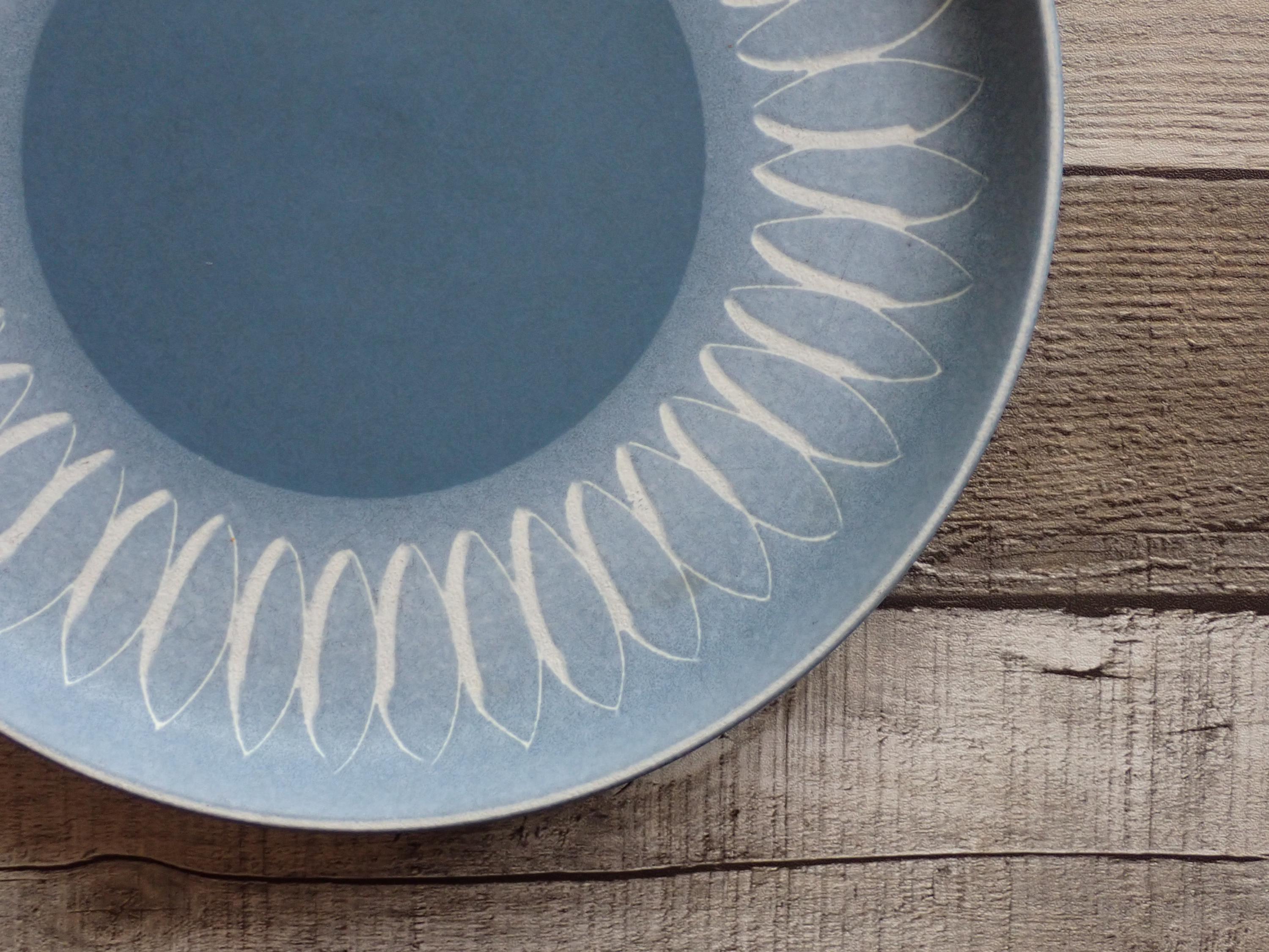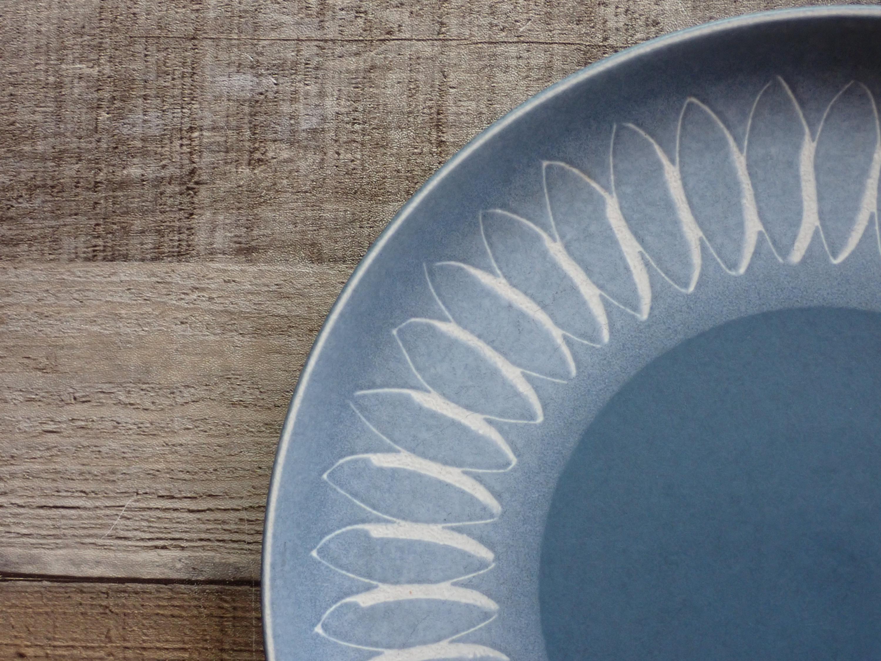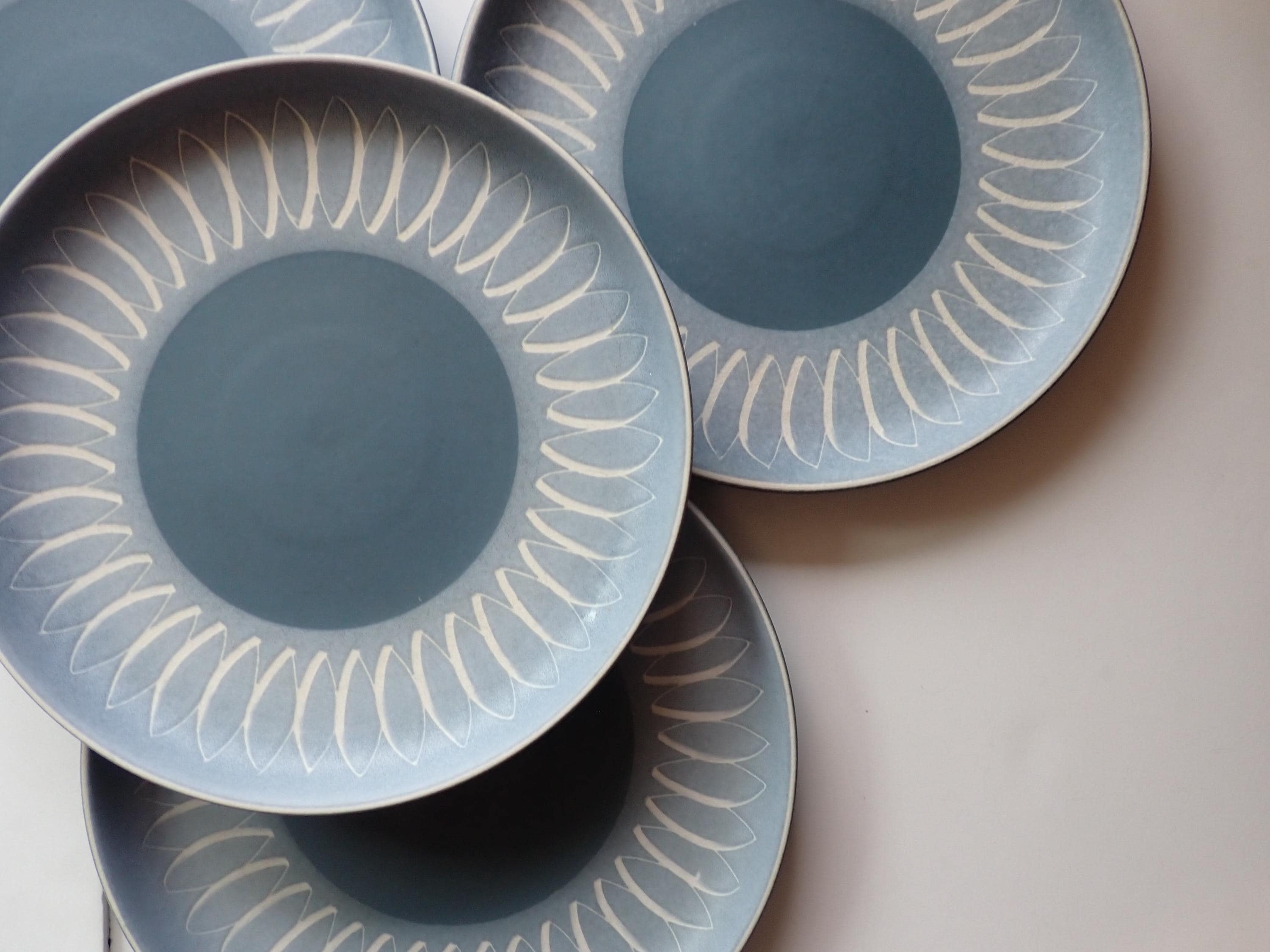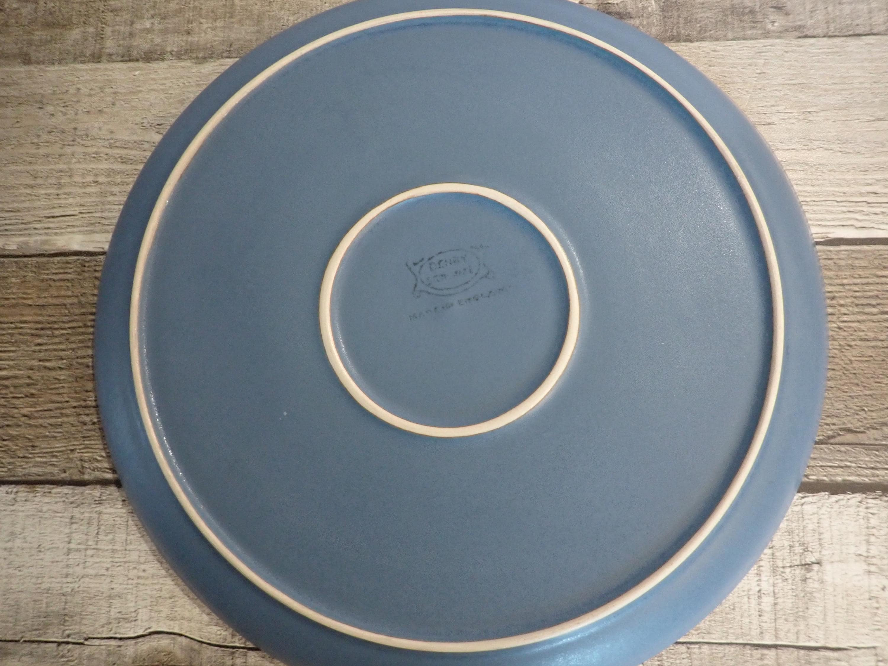 This set of stoneware plates by Denby are in the Blue Echo pattern. These plates are the Dinner Plates and are 10" in diameter. They are a blue stoneware with a smooth matte finish, and has a white leaf shaped design around the border. The bottoms are marked with a Denby makers marks. All 5 plates are in very good condition with no chips or cracks, however there are some light surface scratches from use.