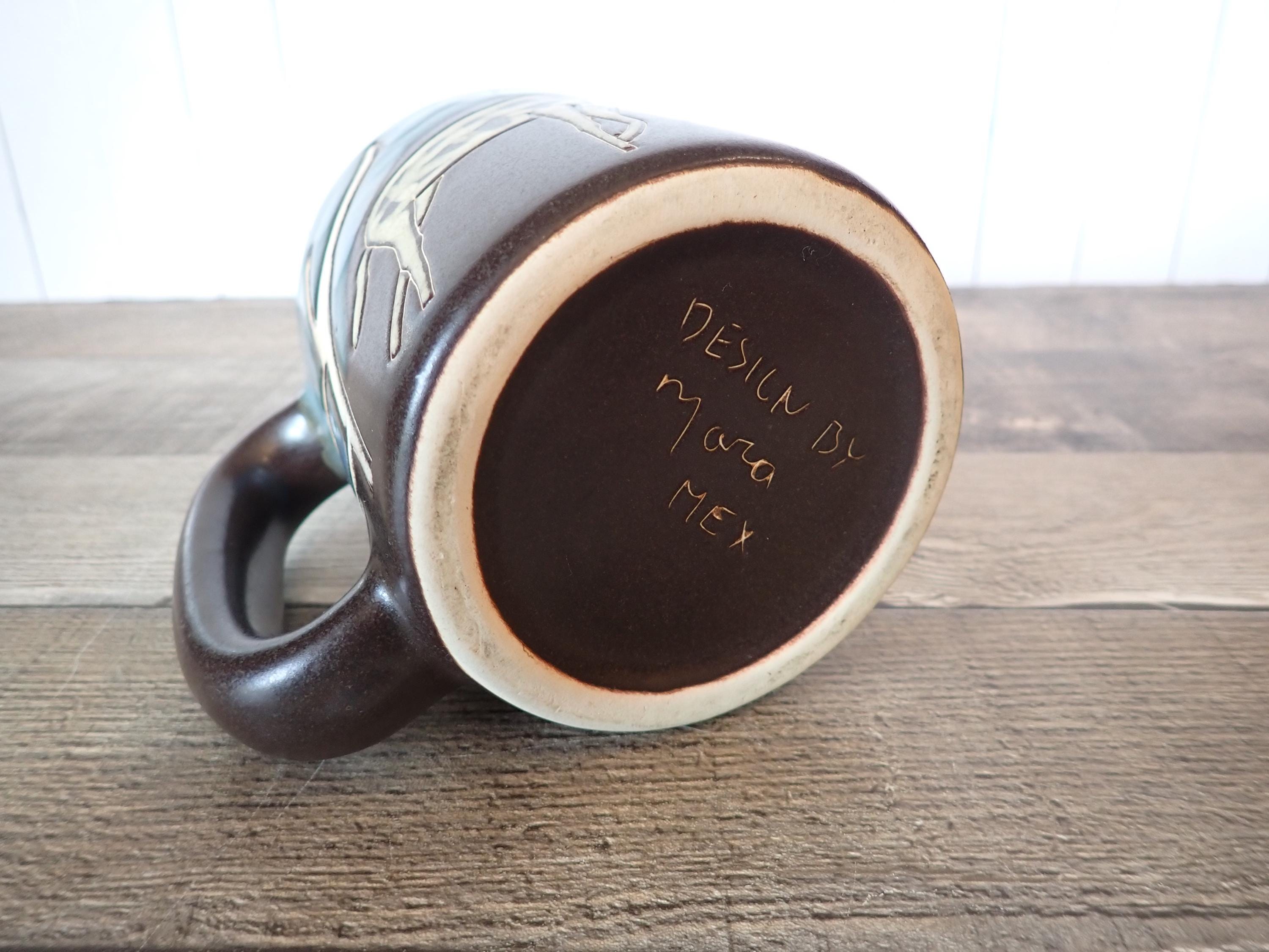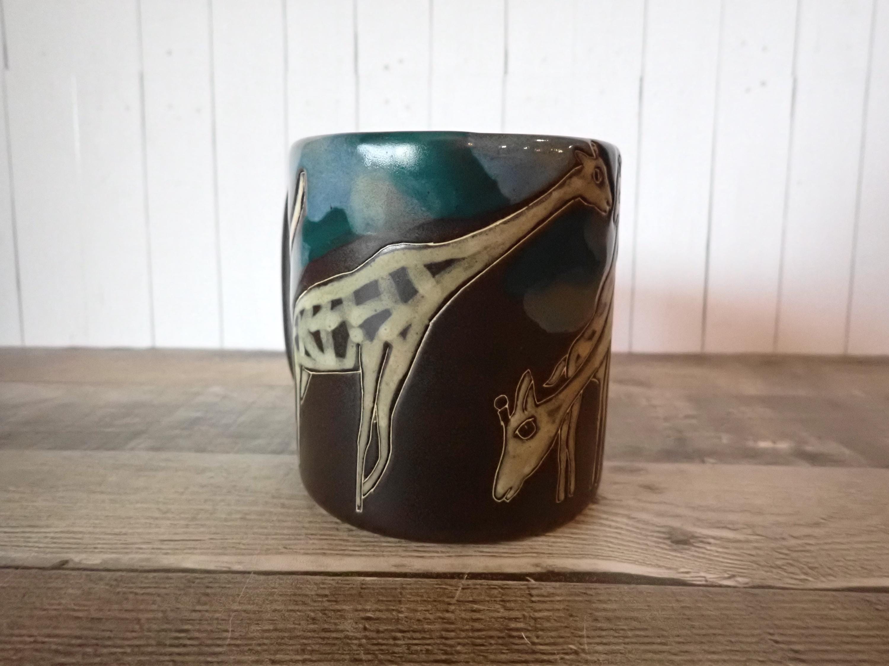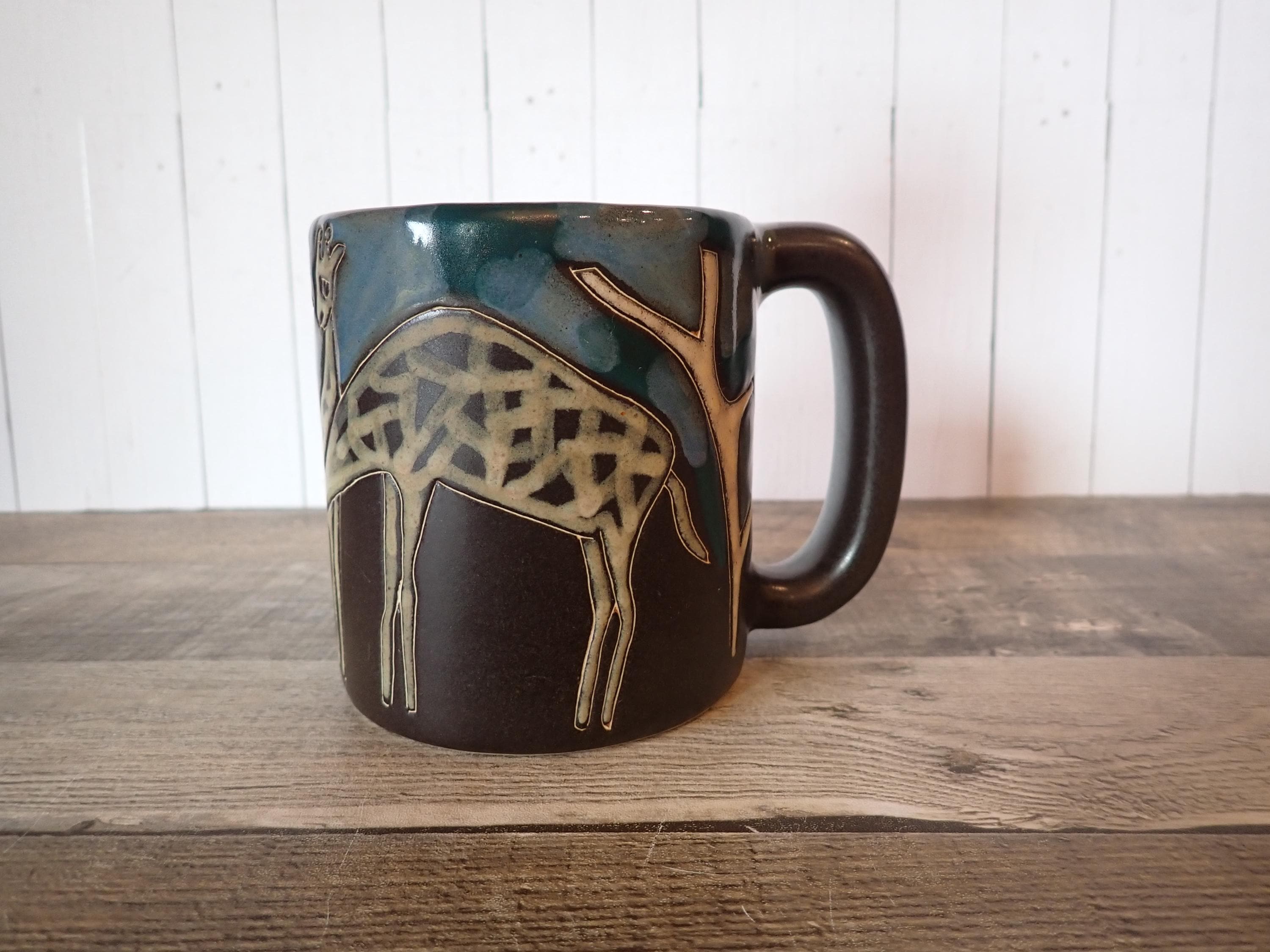 This pottery mug by Mara is brown, blue, and tan and has an design of 3 giraffes and trees. The mug is 4.5" tall and 3.75" in diameter. With the handle it is 5.5" wide. The bottom is marked: DESIGN BY MARA MEX. The large mug can hold 18 oz. filled to the rim. The mug is in very nice condition with no chips or cracks.