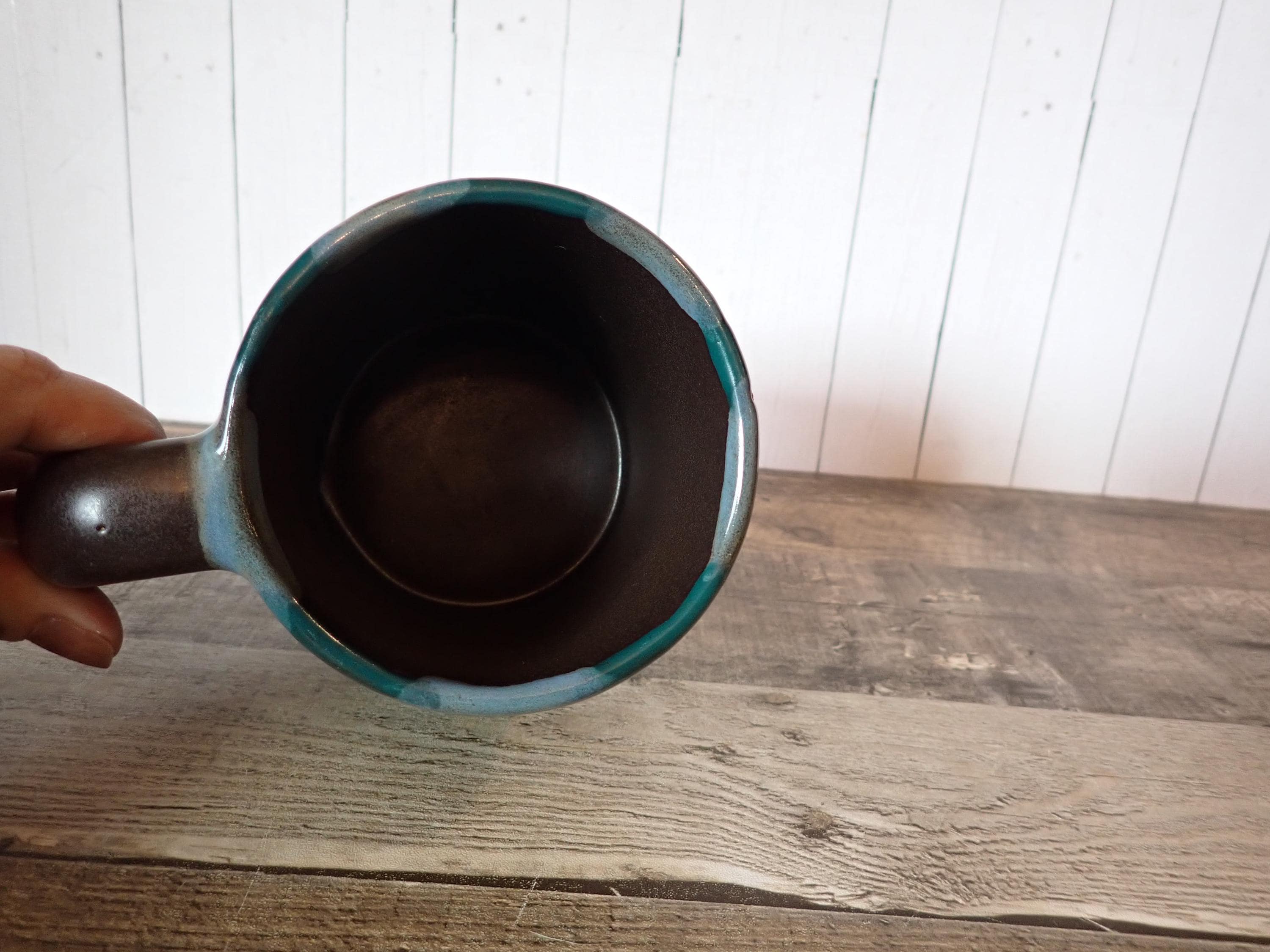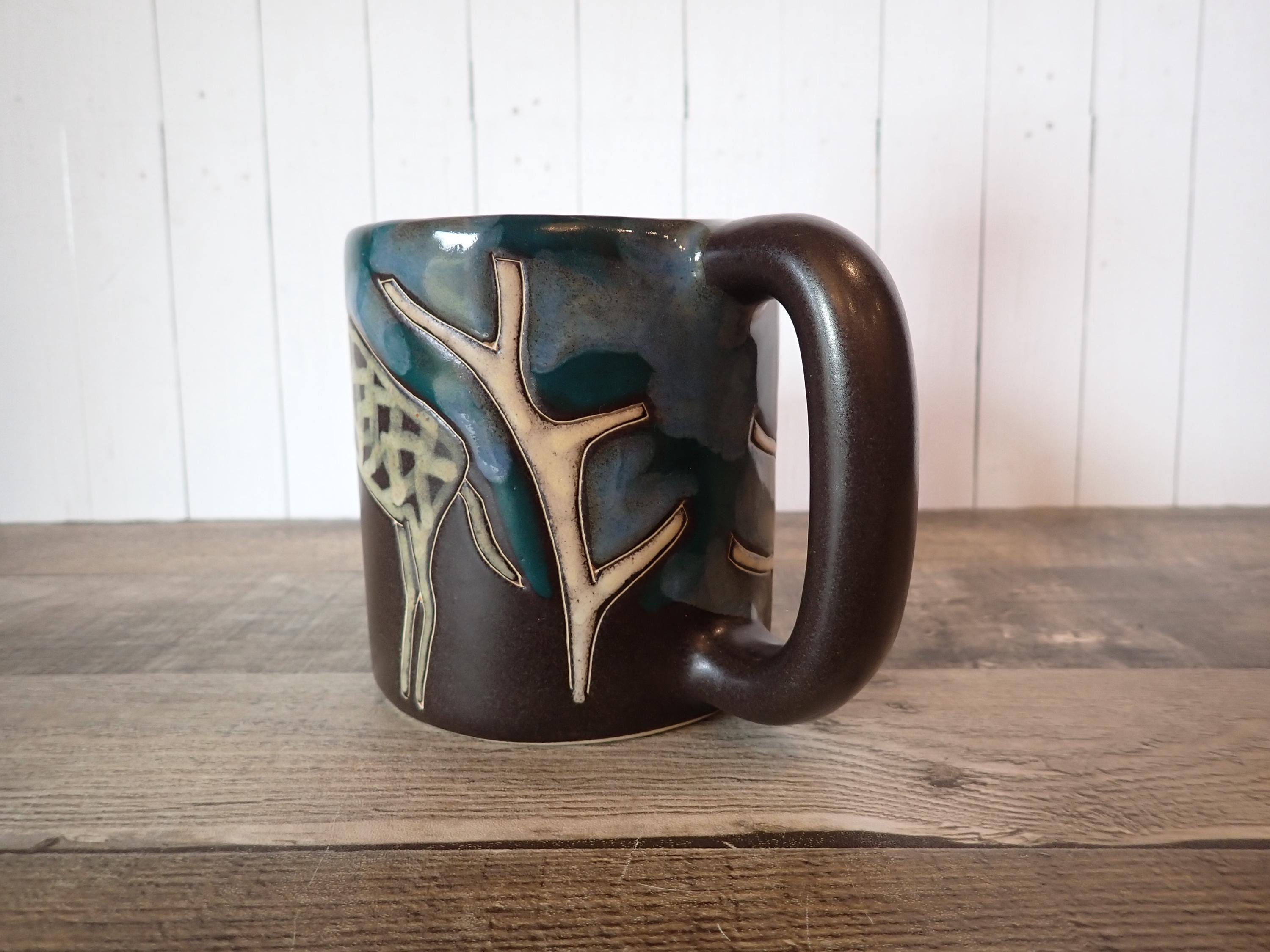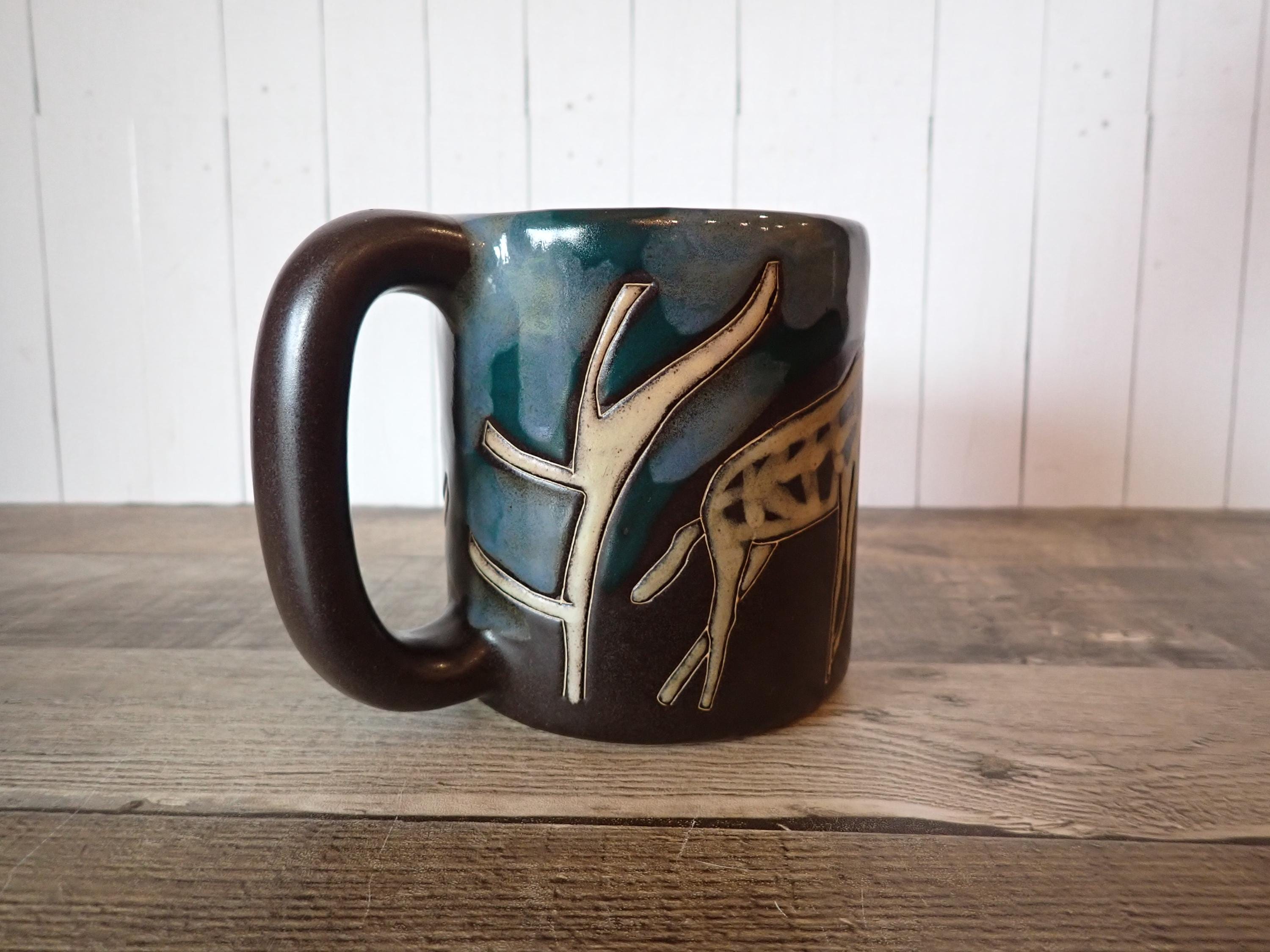This pottery mug by Mara is brown, blue, and tan and has an design of 3 giraffes and trees. The mug is 4.5" tall and 3.75" in diameter. With the handle it is 5.5" wide. The bottom is marked: DESIGN BY MARA MEX. The large mug can hold 18 oz. filled to the rim. The mug is in very nice condition with no chips or cracks.
