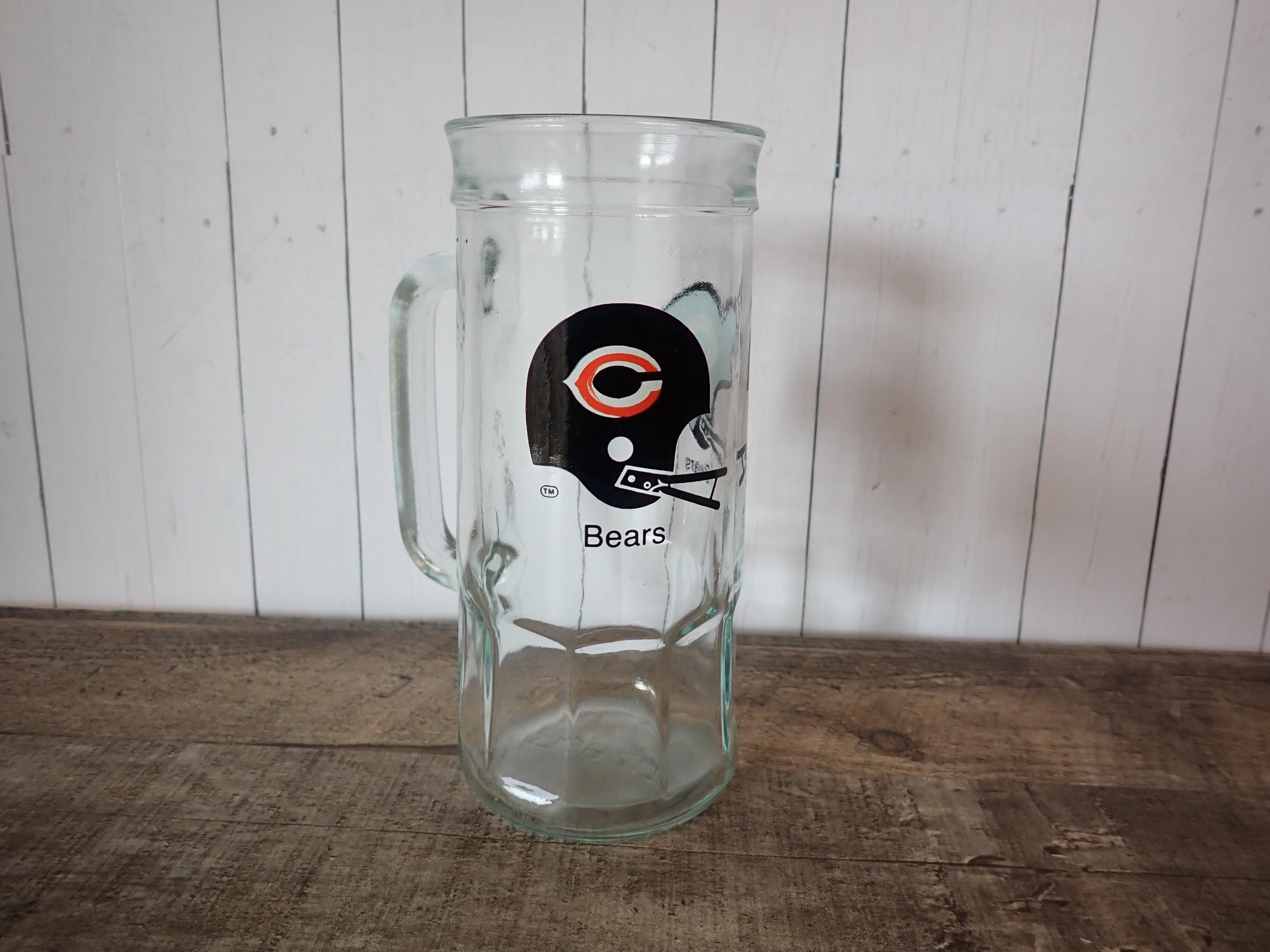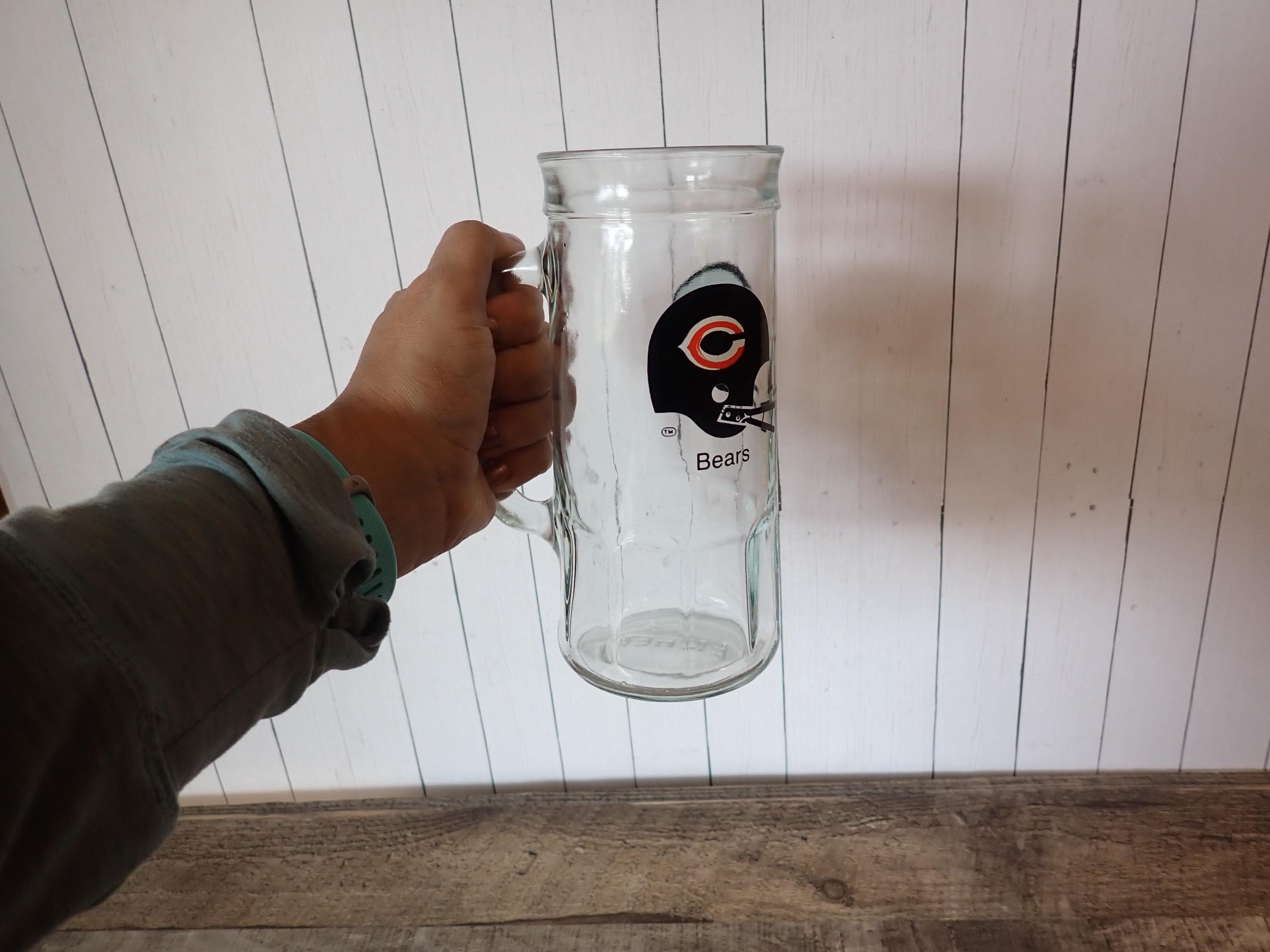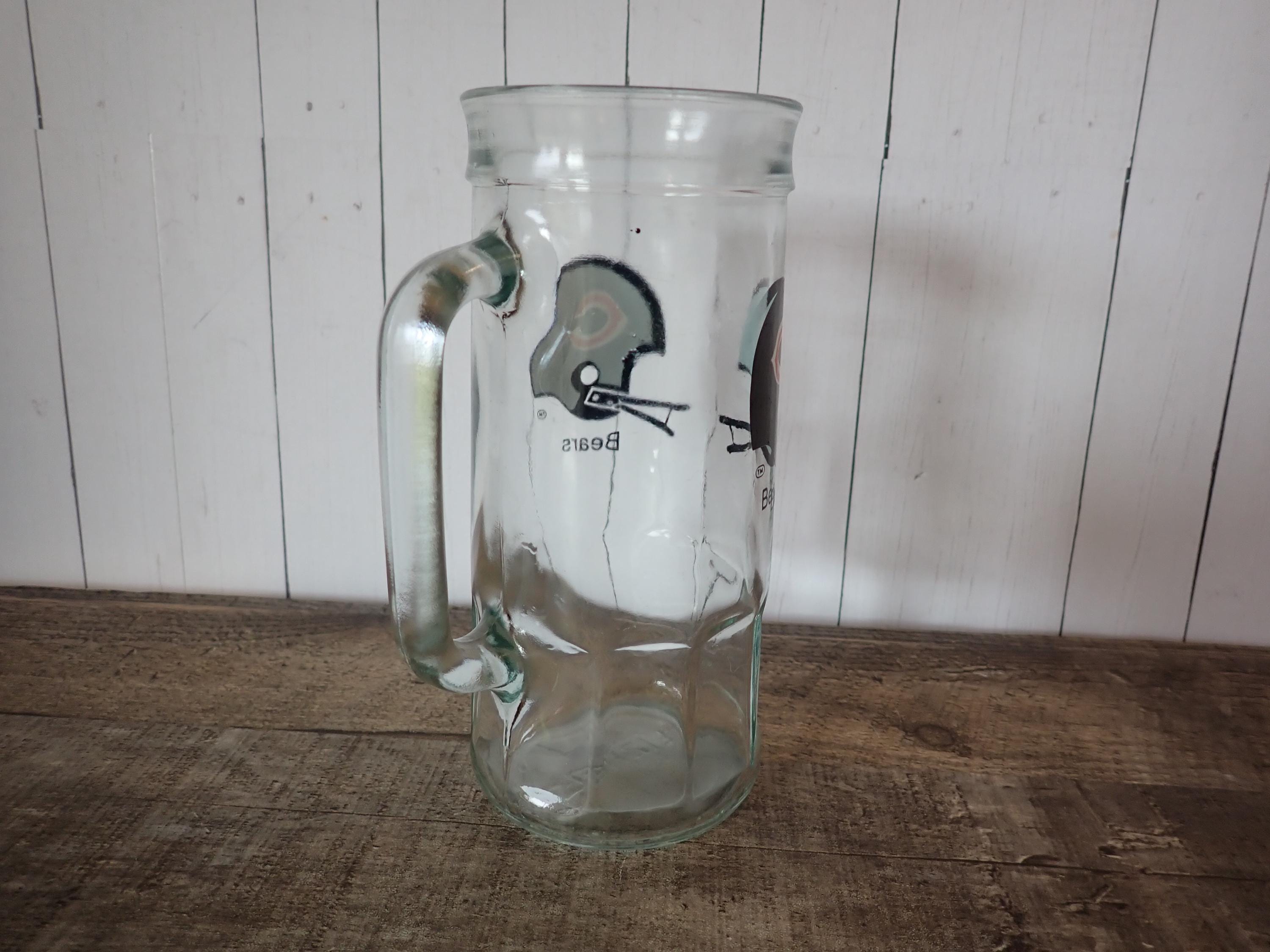 This clear glass mug or beer stein is clear glass, and has a Chicago Bears football logo on the front and back sides of the mug. The mug is large, measuring 7" tall and 2.75" in diameter at the top. It has a solid glass handle on one side. The mug can comfortably hold 18oz of liquid - it is filled to the rim with 20 oz. This vintage mug is marked FISHER on the bottom. The mug is in very good condition with no chips or cracks, and the graphics are very bright and clear.