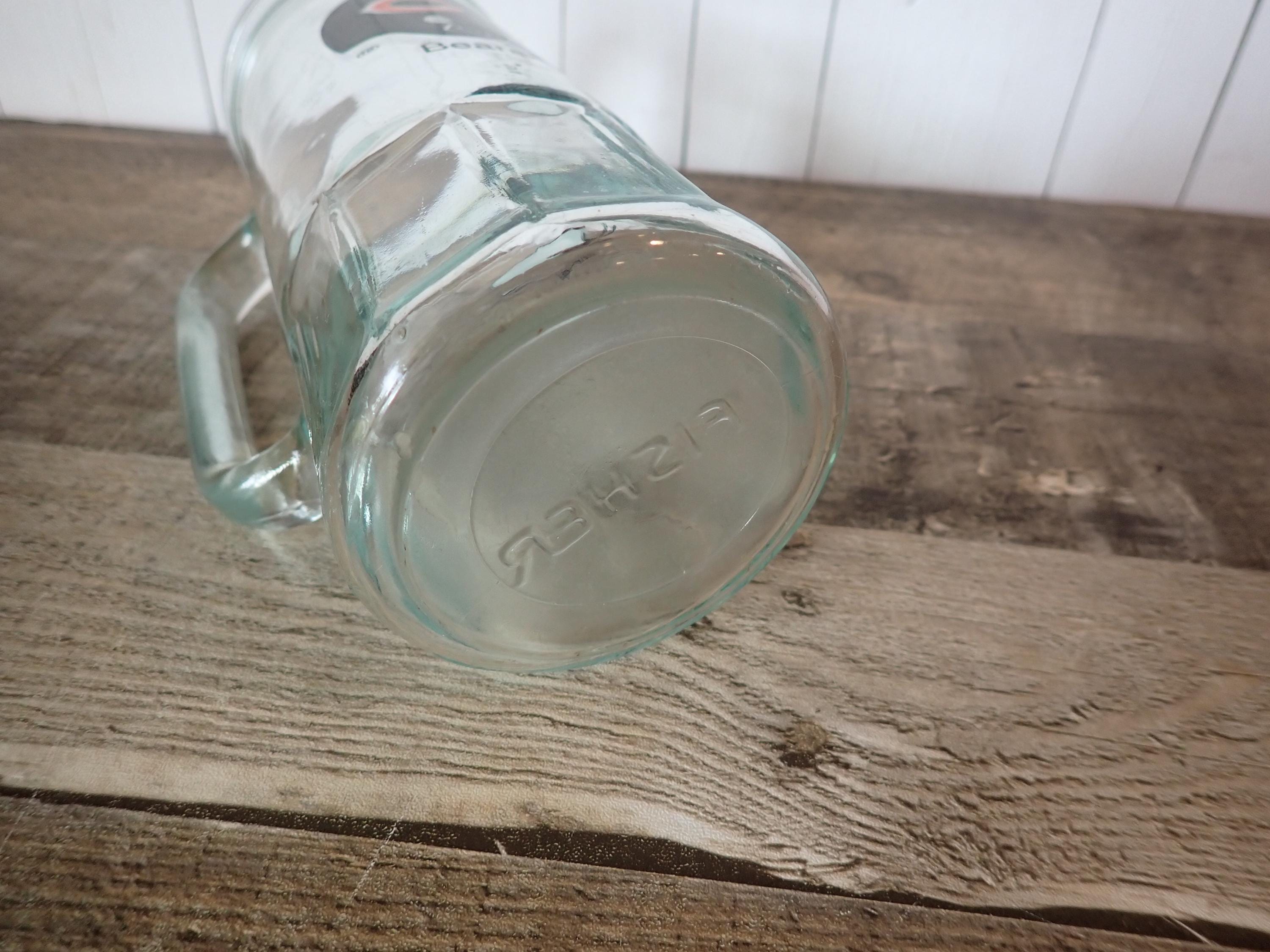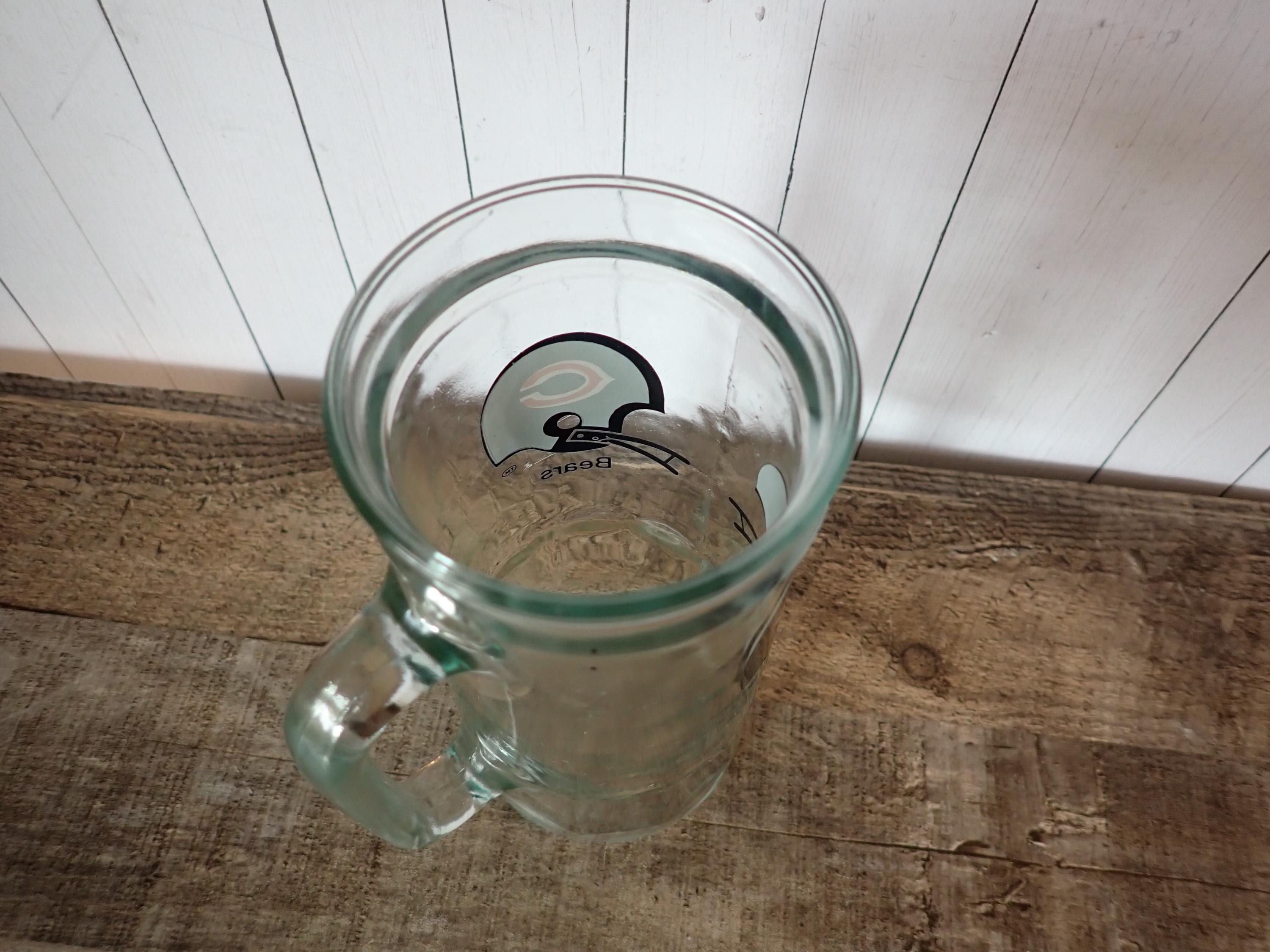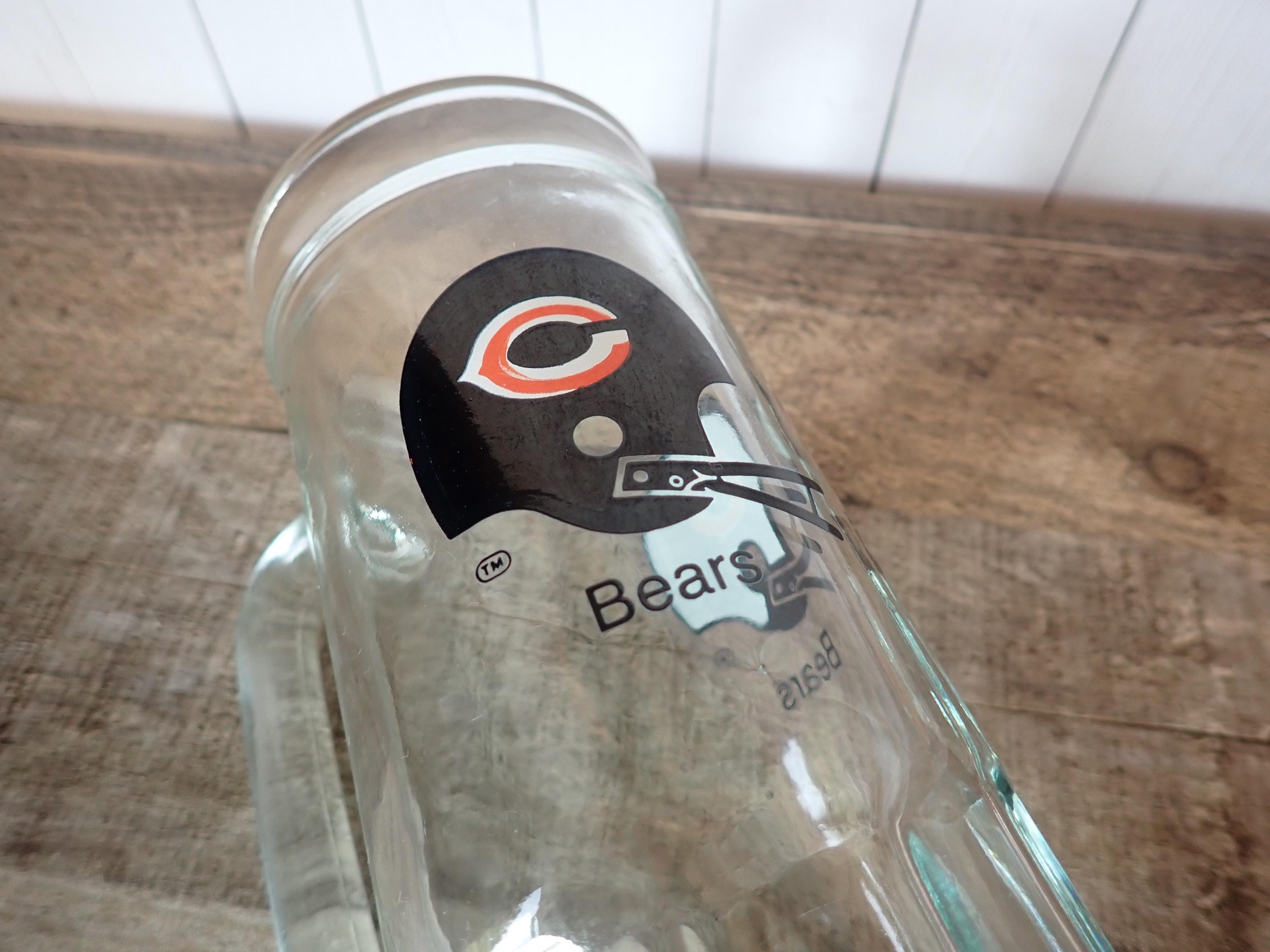 This clear glass mug or beer stein is clear glass, and has a Chicago Bears football logo on the front and back sides of the mug. The mug is large, measuring 7" tall and 2.75" in diameter at the top. It has a solid glass handle on one side. The mug can comfortably hold 18oz of liquid - it is filled to the rim with 20 oz. This vintage mug is marked FISHER on the bottom. The mug is in very good condition with no chips or cracks, and the graphics are very bright and clear.
