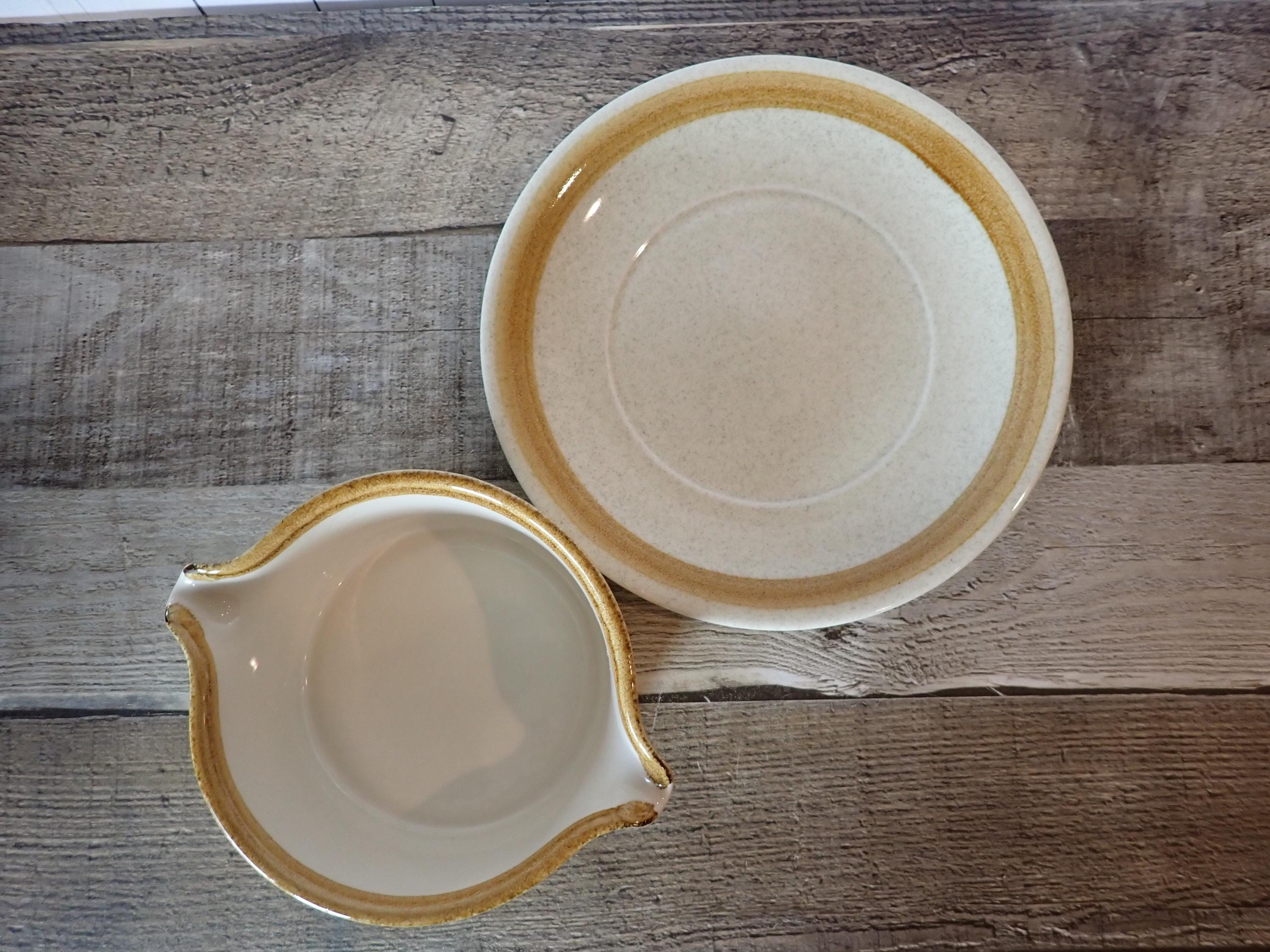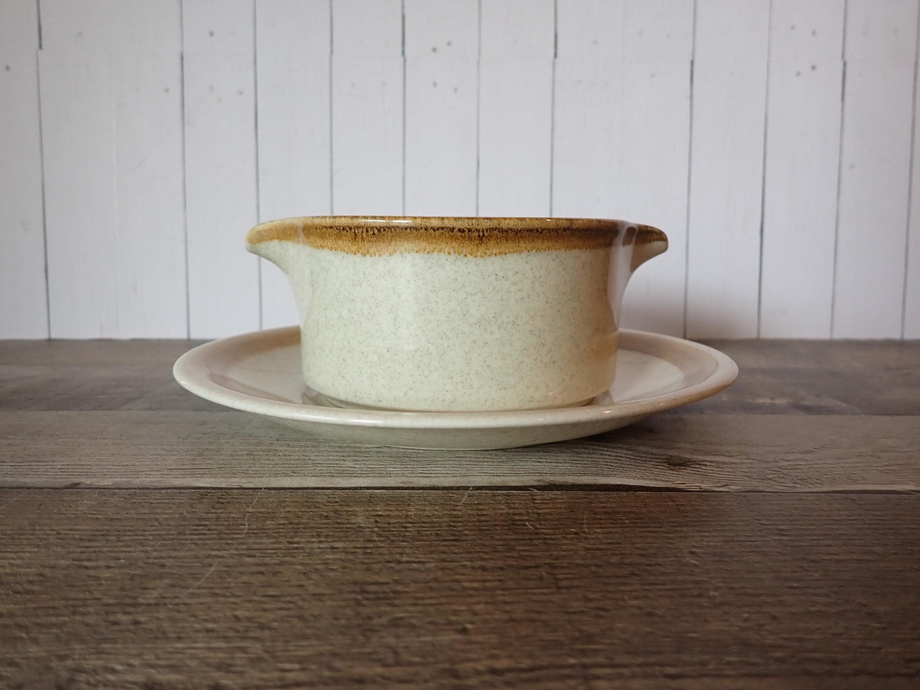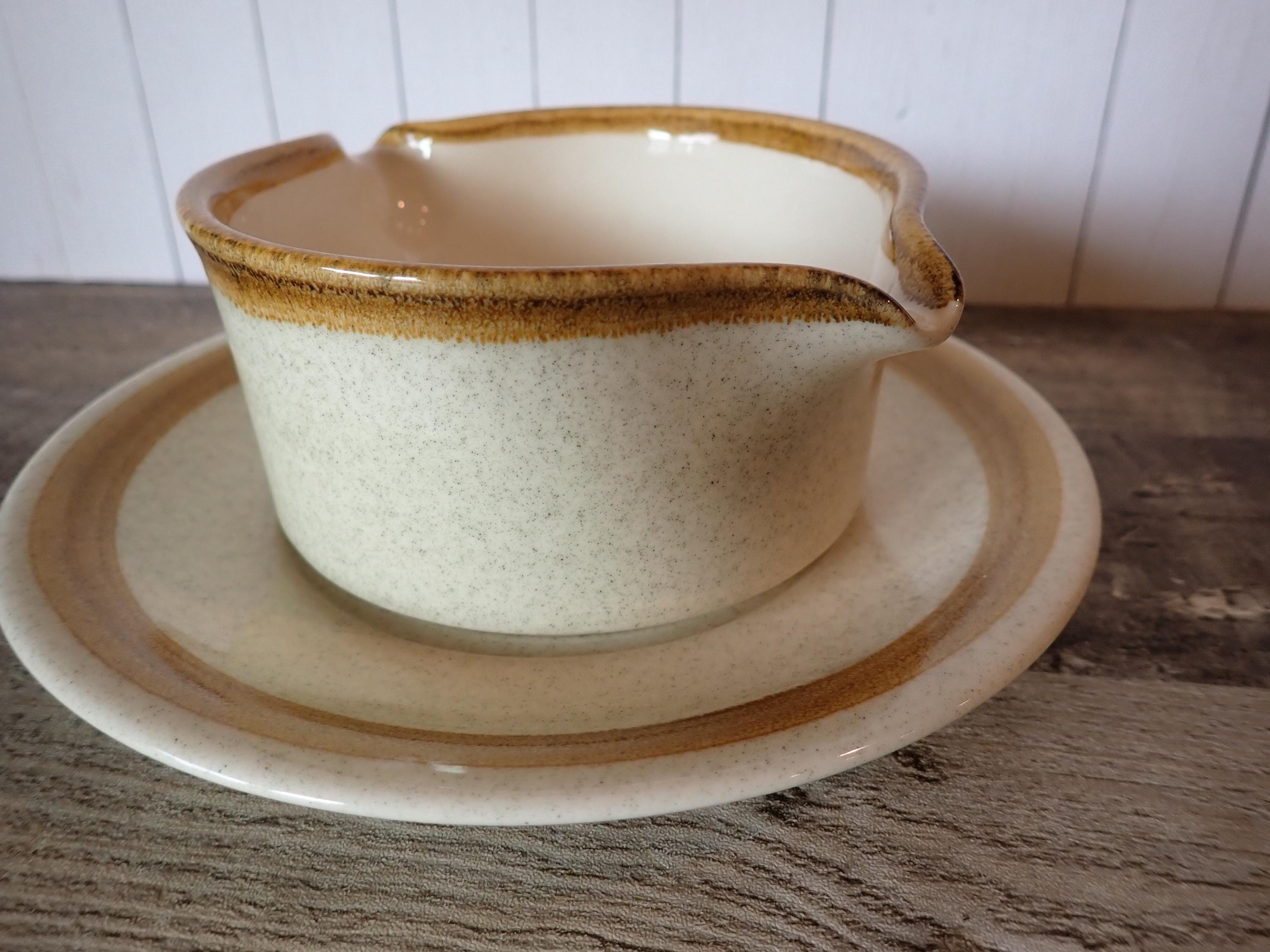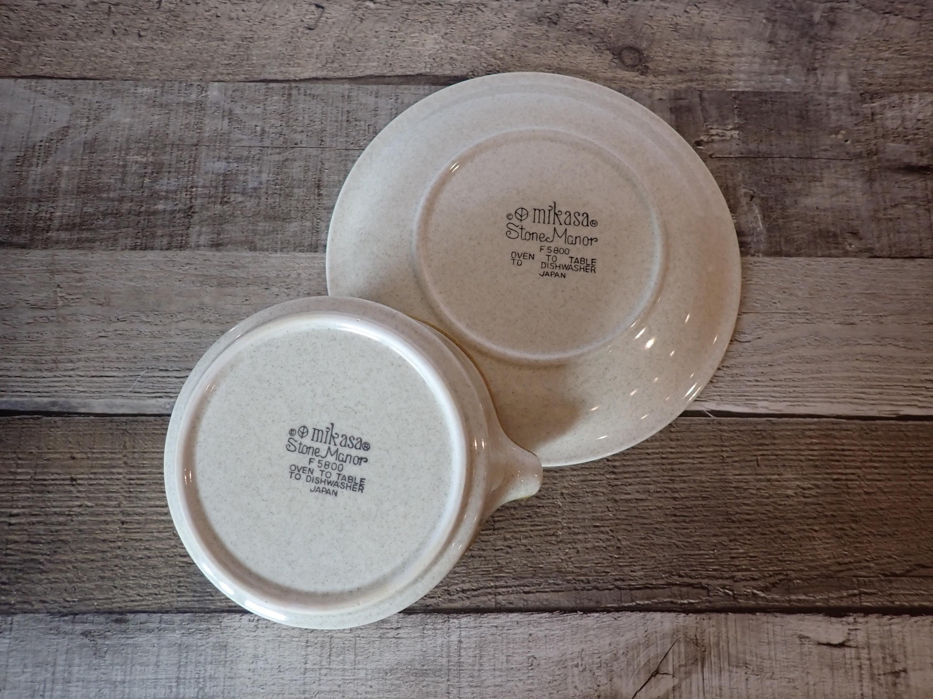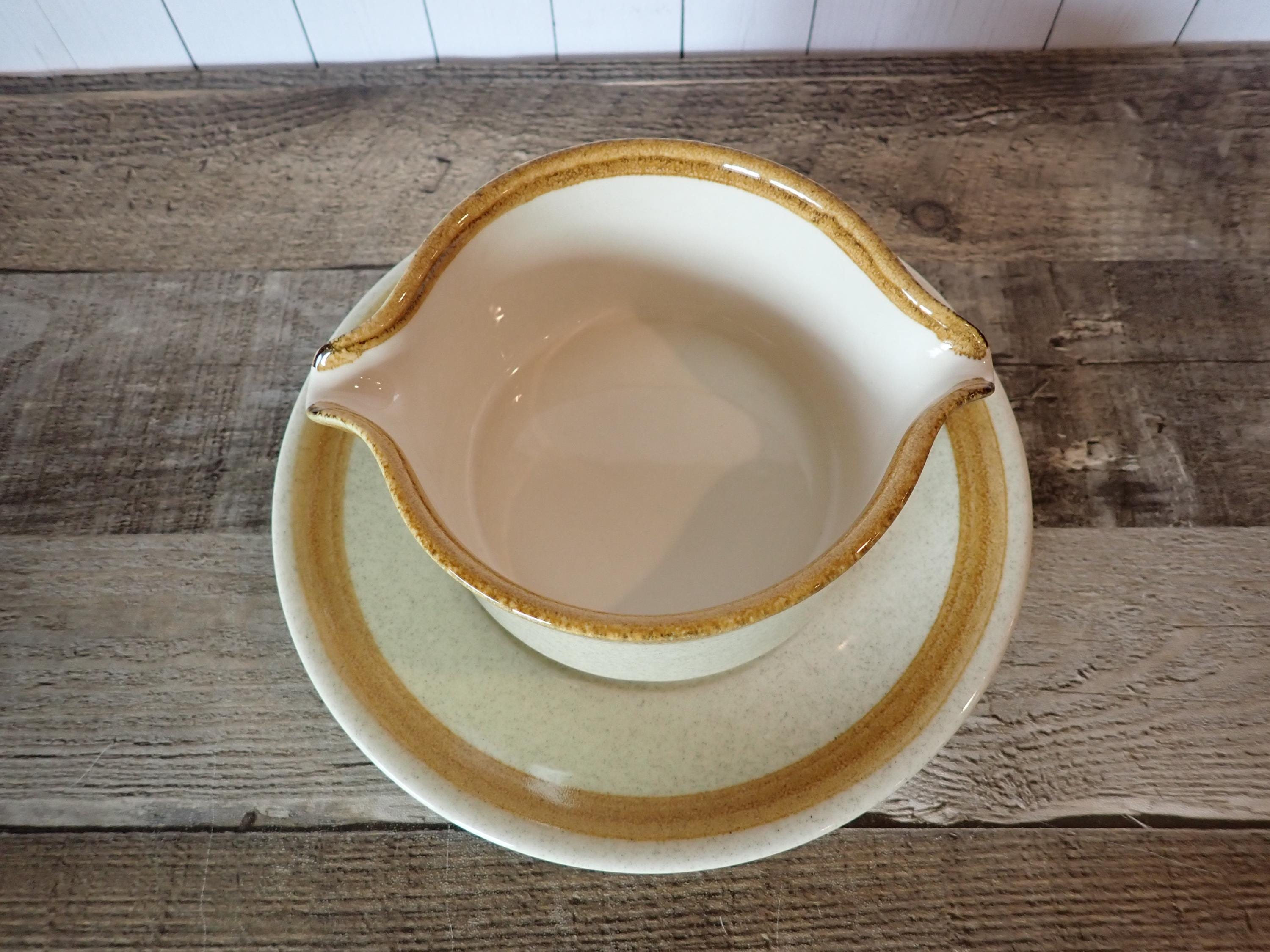 This stoneware gravy boat and underplate by Mikasa is in the Stone Manor pattern and is a tan stoneware with a brown band around the rim. The gravy boat is 5" in diameter and 2.75" high, and the underplate is 7.75" in diameter. The bottoms are marked: MIKASA / STONE MANOR / F5800 / OVEN TO TABLE TO DISHWASHER / JAPAN. Both pieces are in very good condition with no chips or cracks.