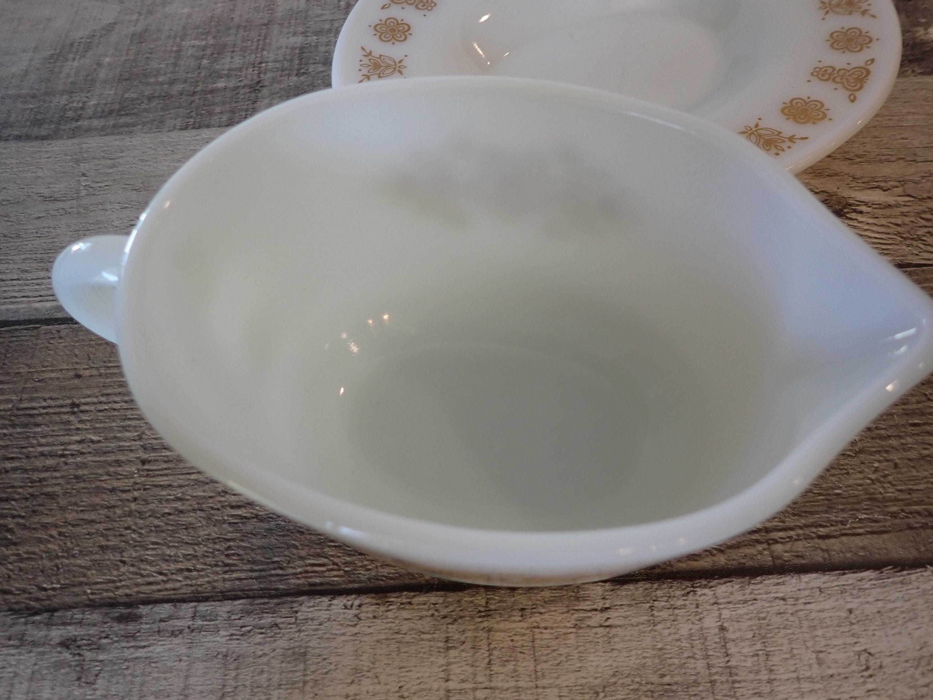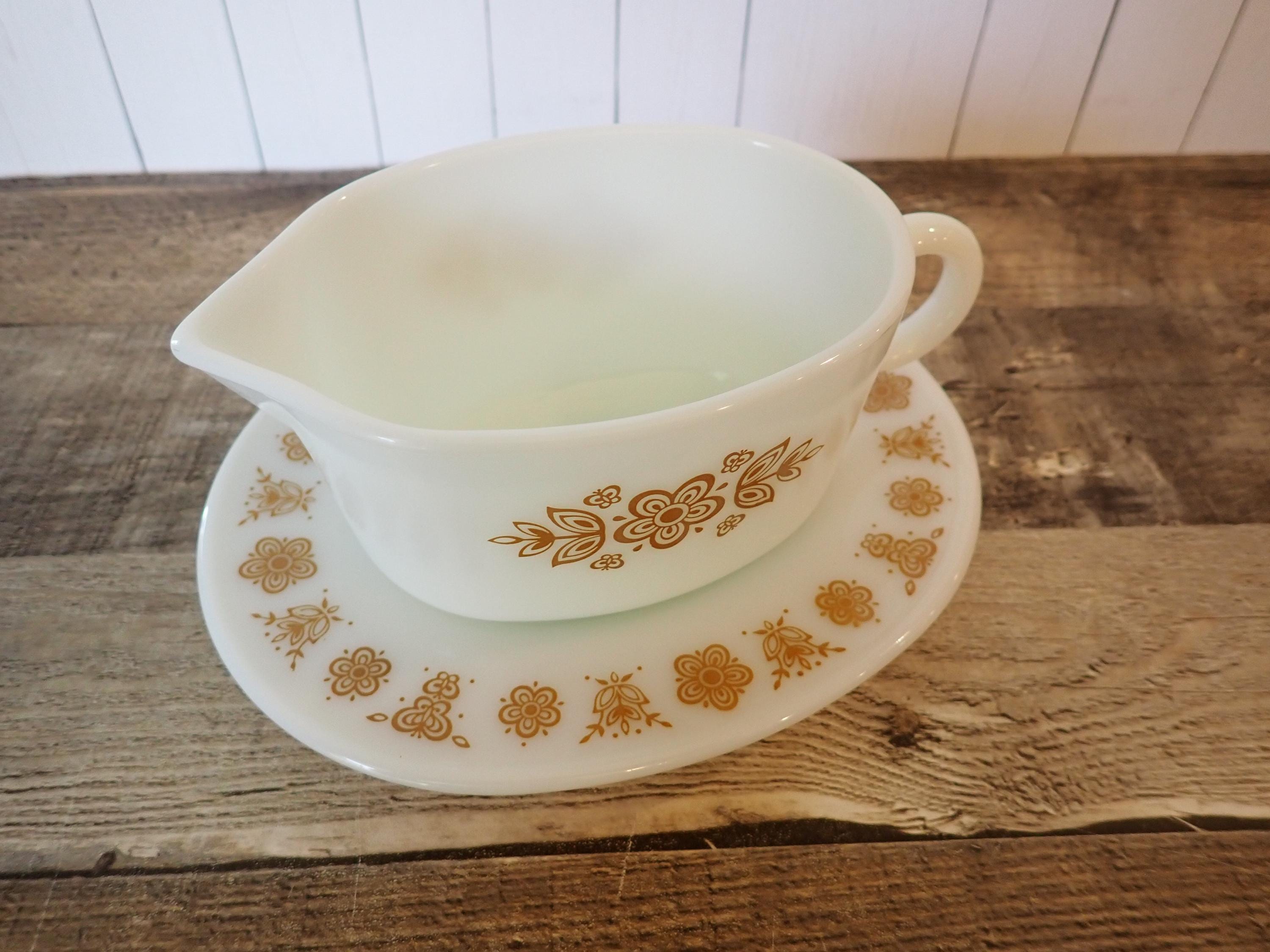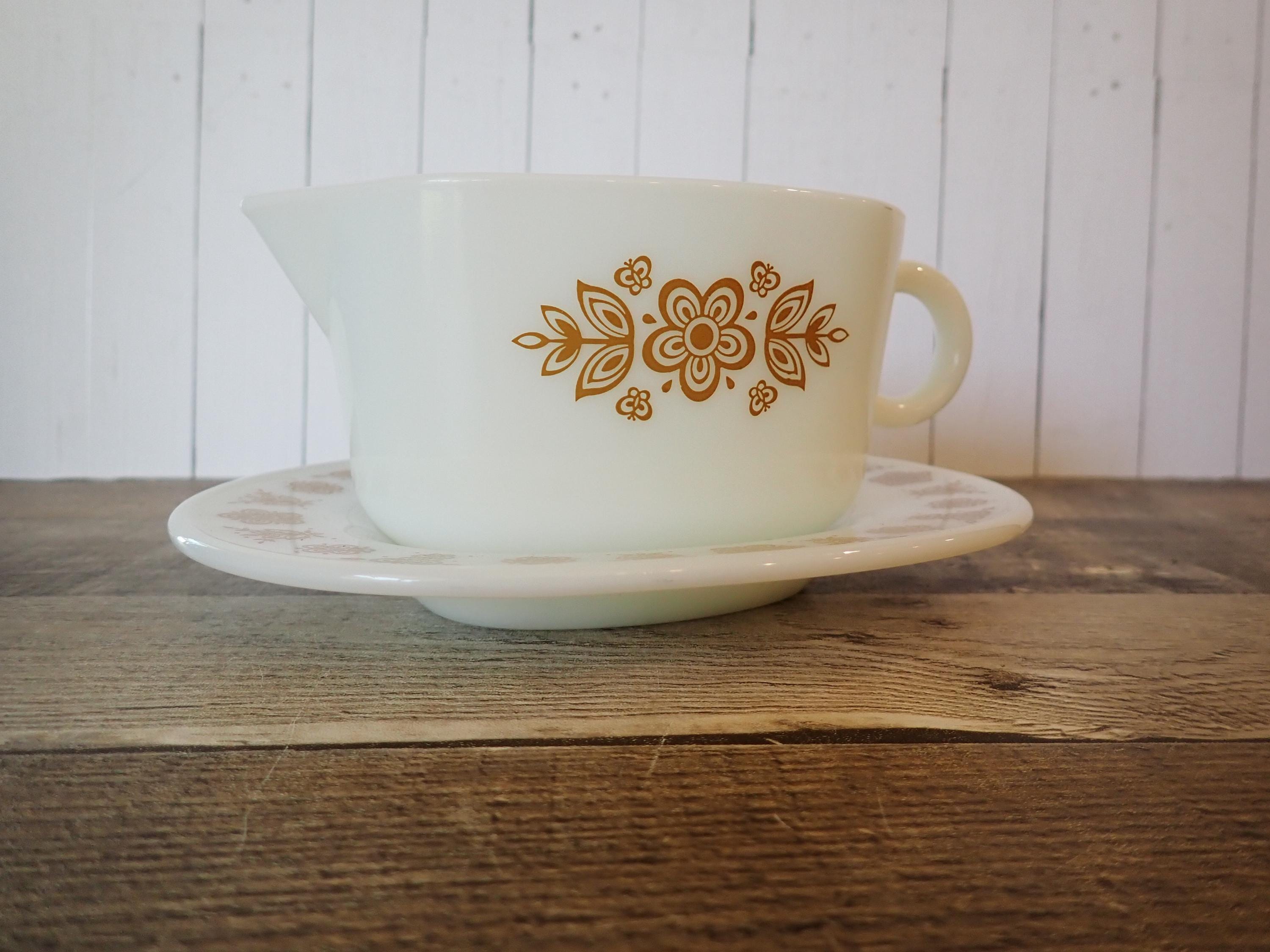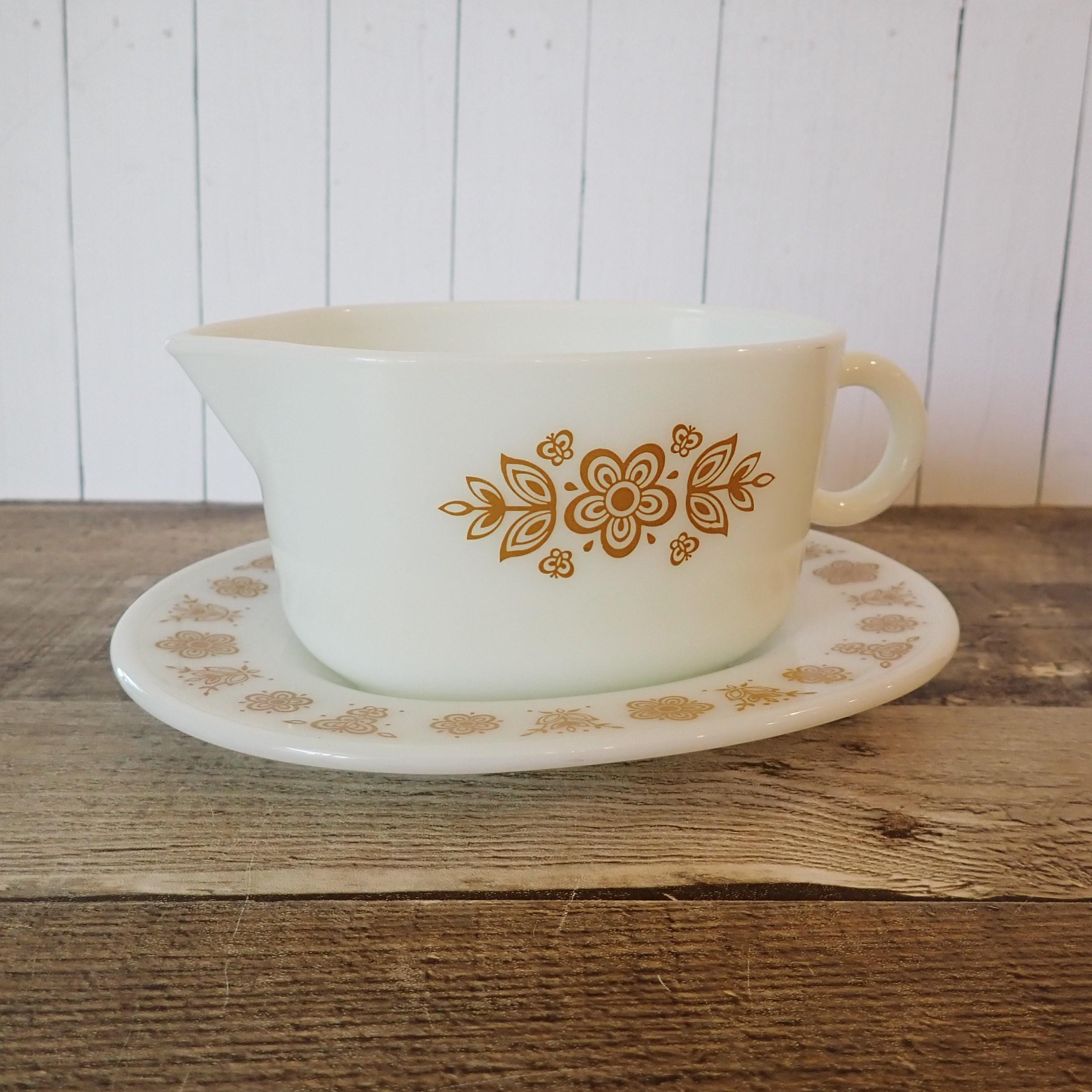 This gravy boat and underplate by Pyrex are in the Butterfly Gold pattern. They are a white glass, with a pretty yellow floral design on both sides of the gravy boat and around the rim of the underplate. The underplate is 7" long by 6" wide, and the gravy boat is6.5" long (with the handle) by 4" wide. Both pieces are marked PYREX CORNING, NY, USA / SAFE FOR OCEN AND MICROWAVE / NOT FOR STOVE OR BROILER. Both pieces are in very good condition with no chips or cracks, and the graphics are bright and clear on both pieces.