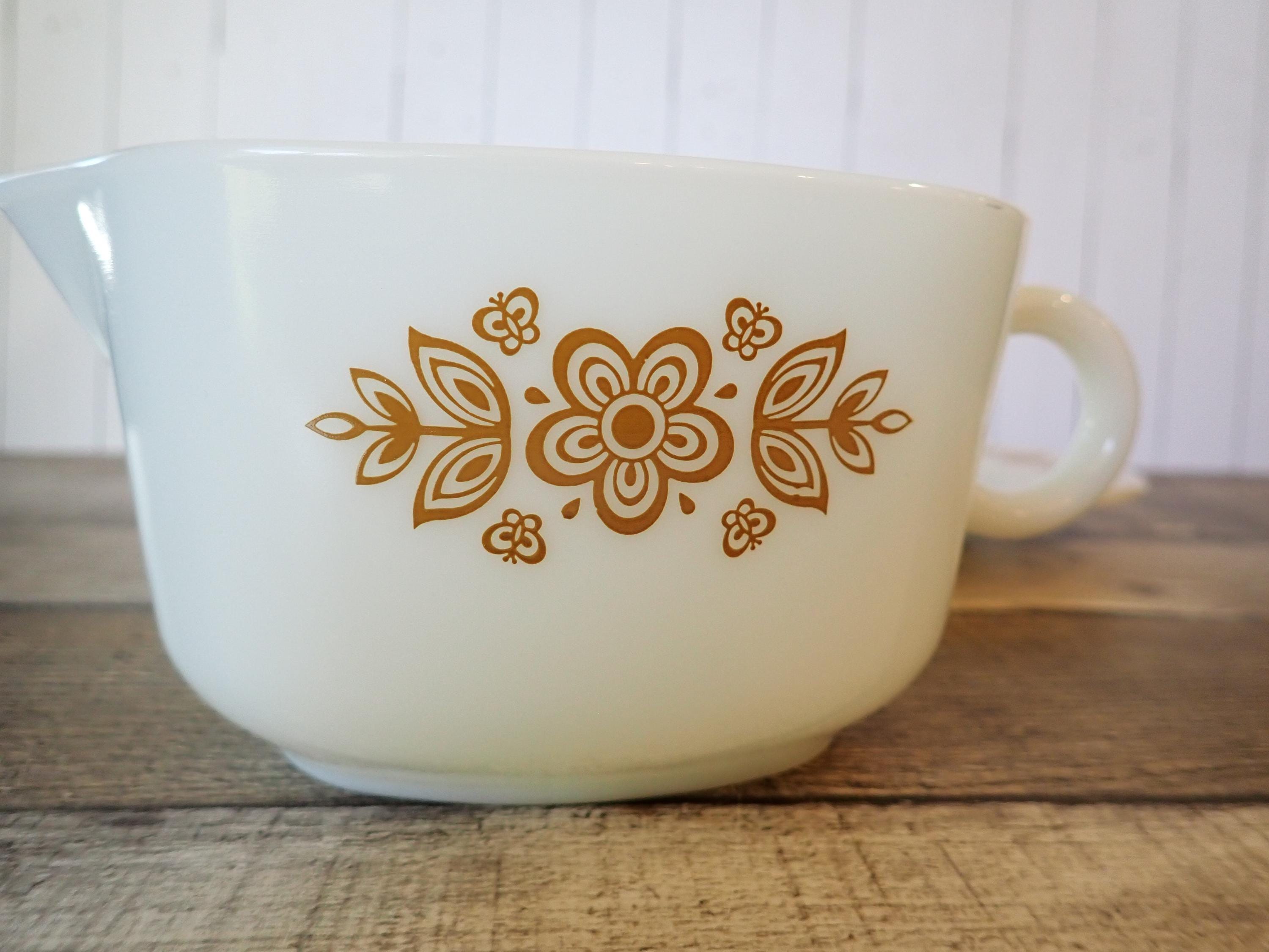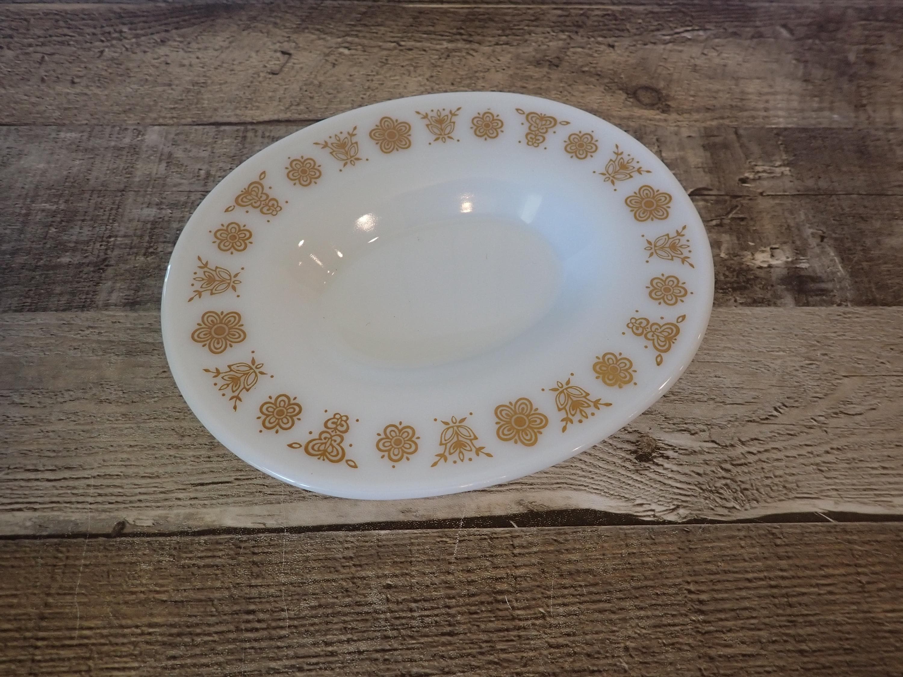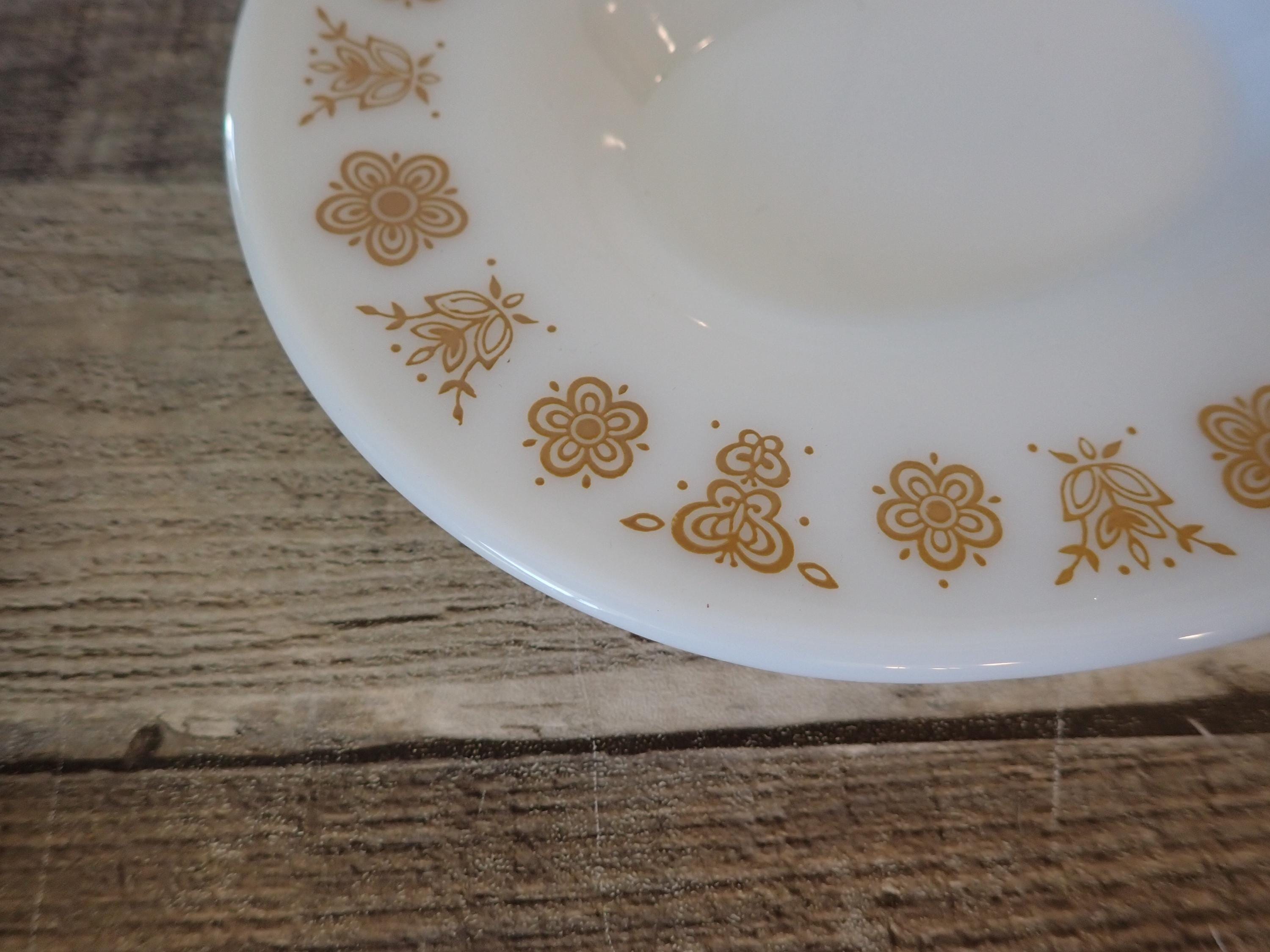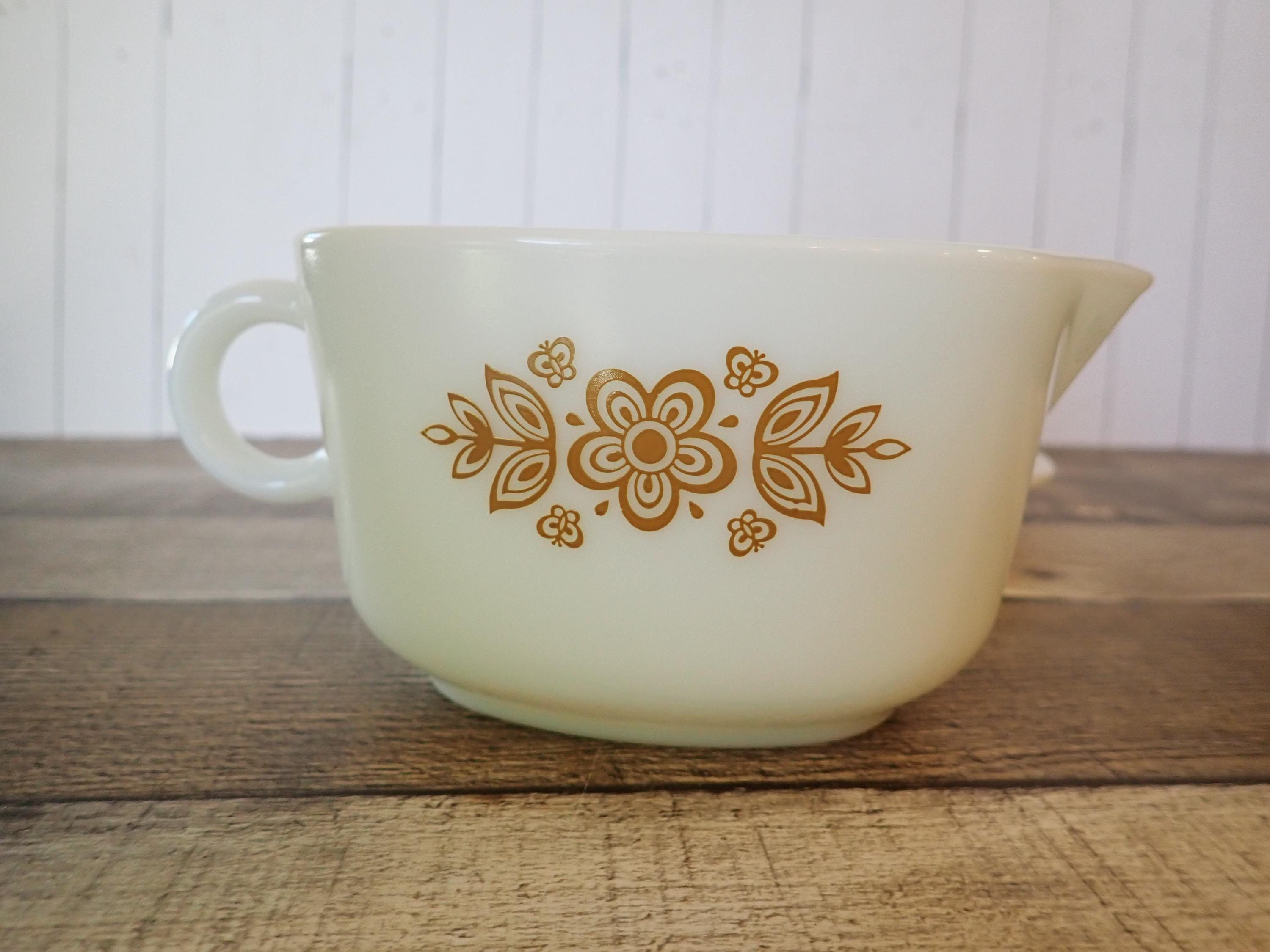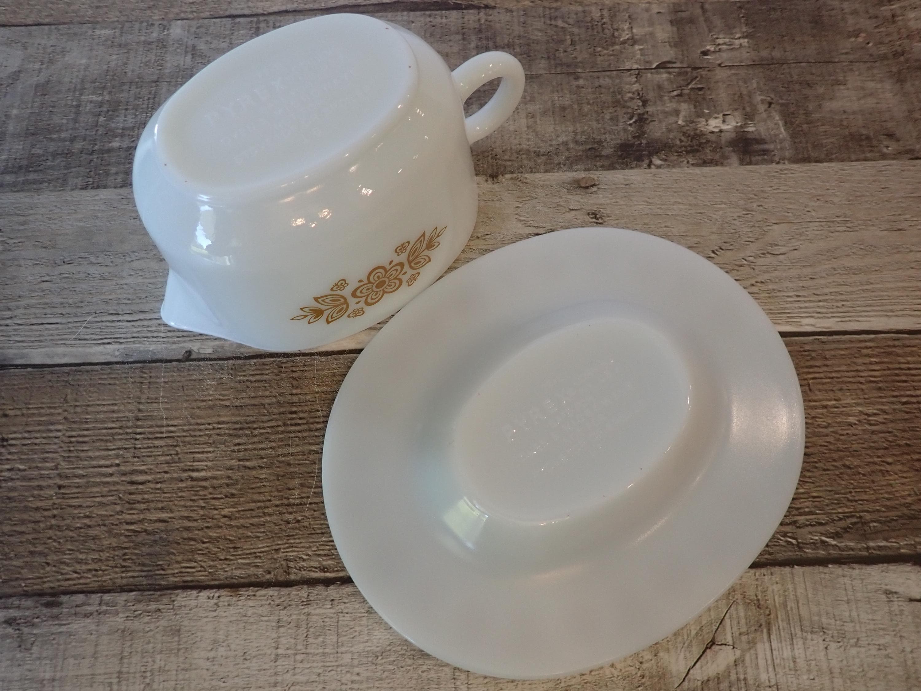 This gravy boat and underplate by Pyrex are in the Butterfly Gold pattern. They are a white glass, with a pretty yellow floral design on both sides of the gravy boat and around the rim of the underplate. The underplate is 7" long by 6" wide, and the gravy boat is6.5" long (with the handle) by 4" wide. Both pieces are marked PYREX CORNING, NY, USA / SAFE FOR OCEN AND MICROWAVE / NOT FOR STOVE OR BROILER. Both pieces are in very good condition with no chips or cracks, and the graphics are bright and clear on both pieces.