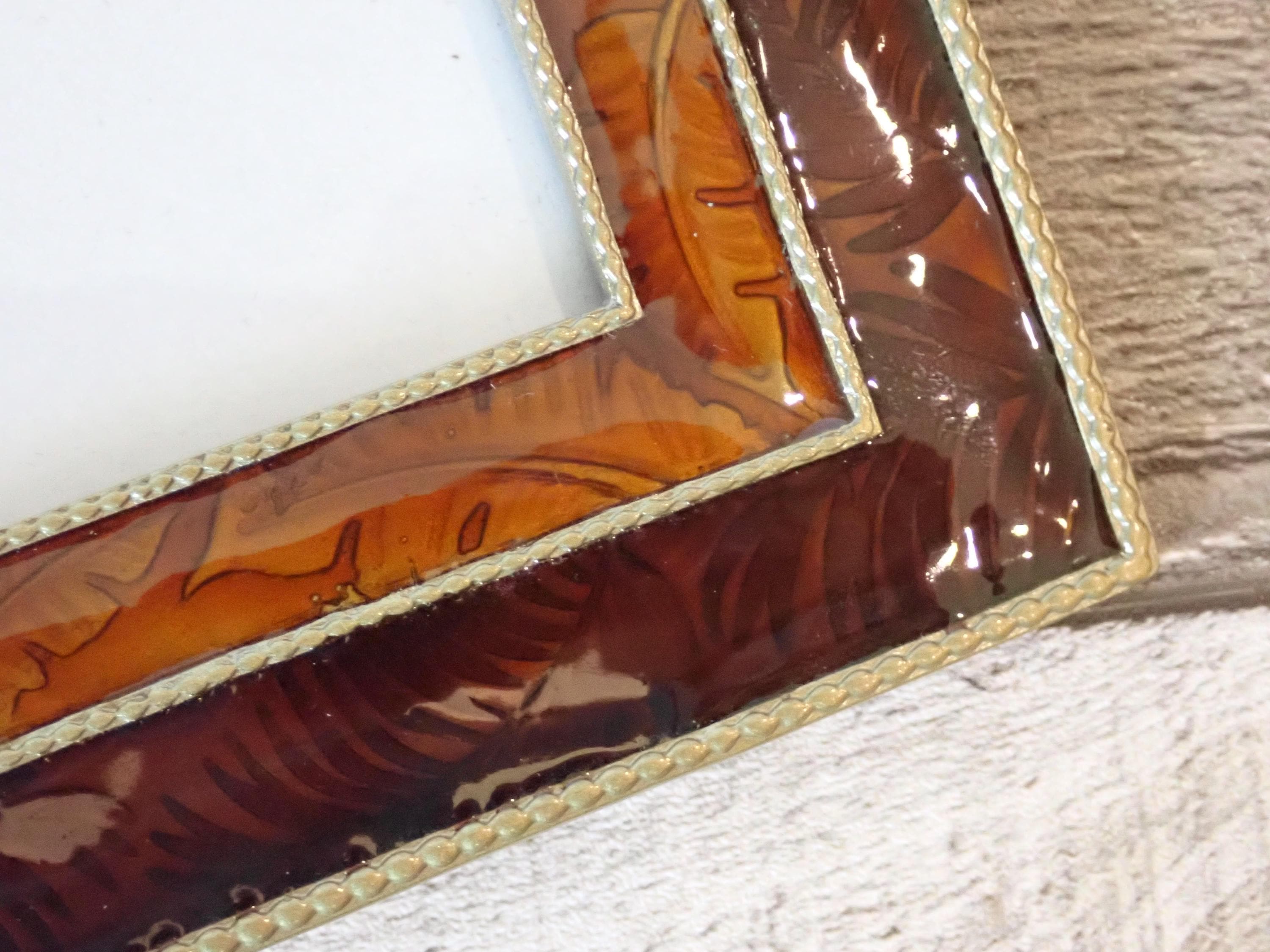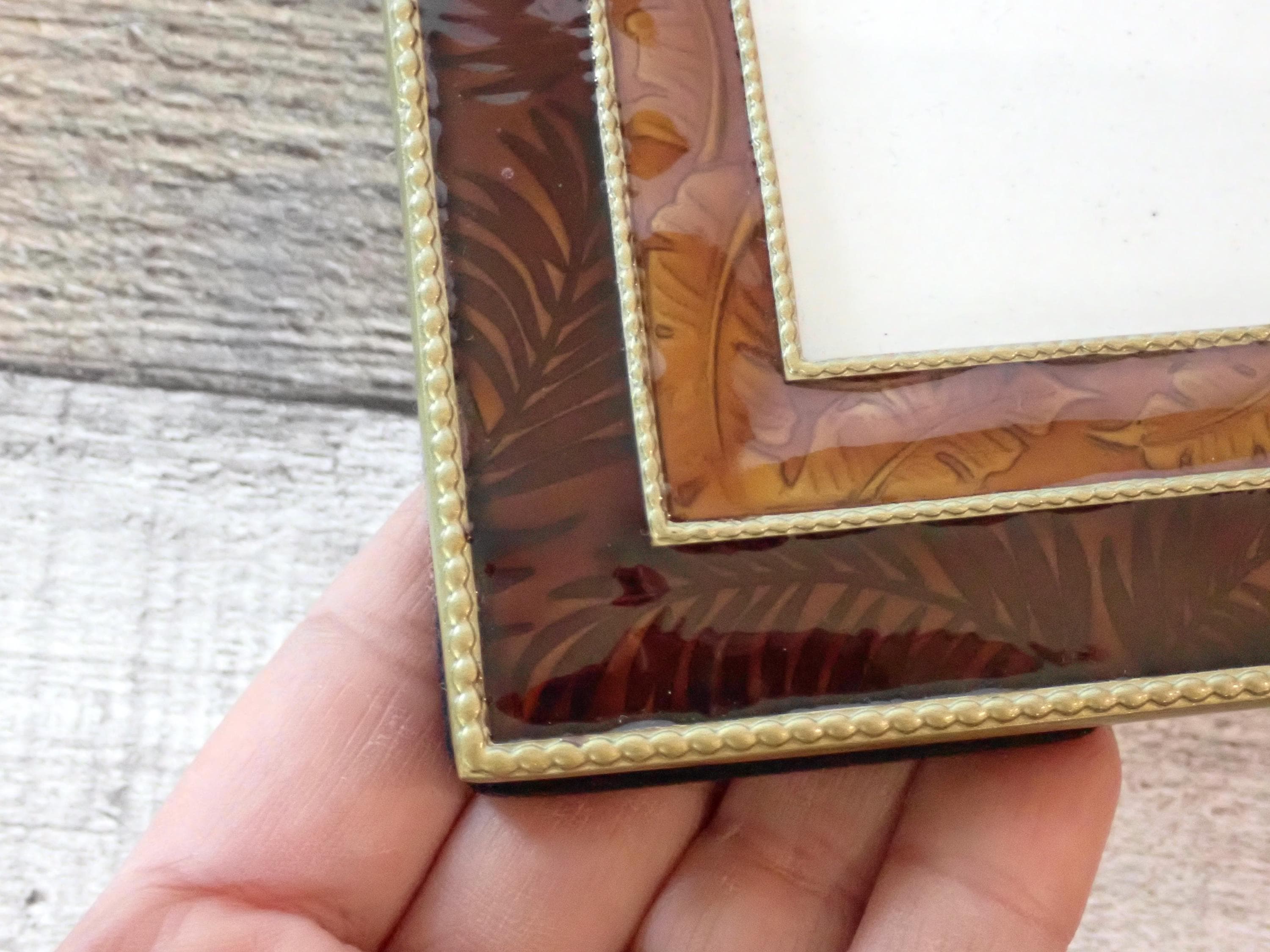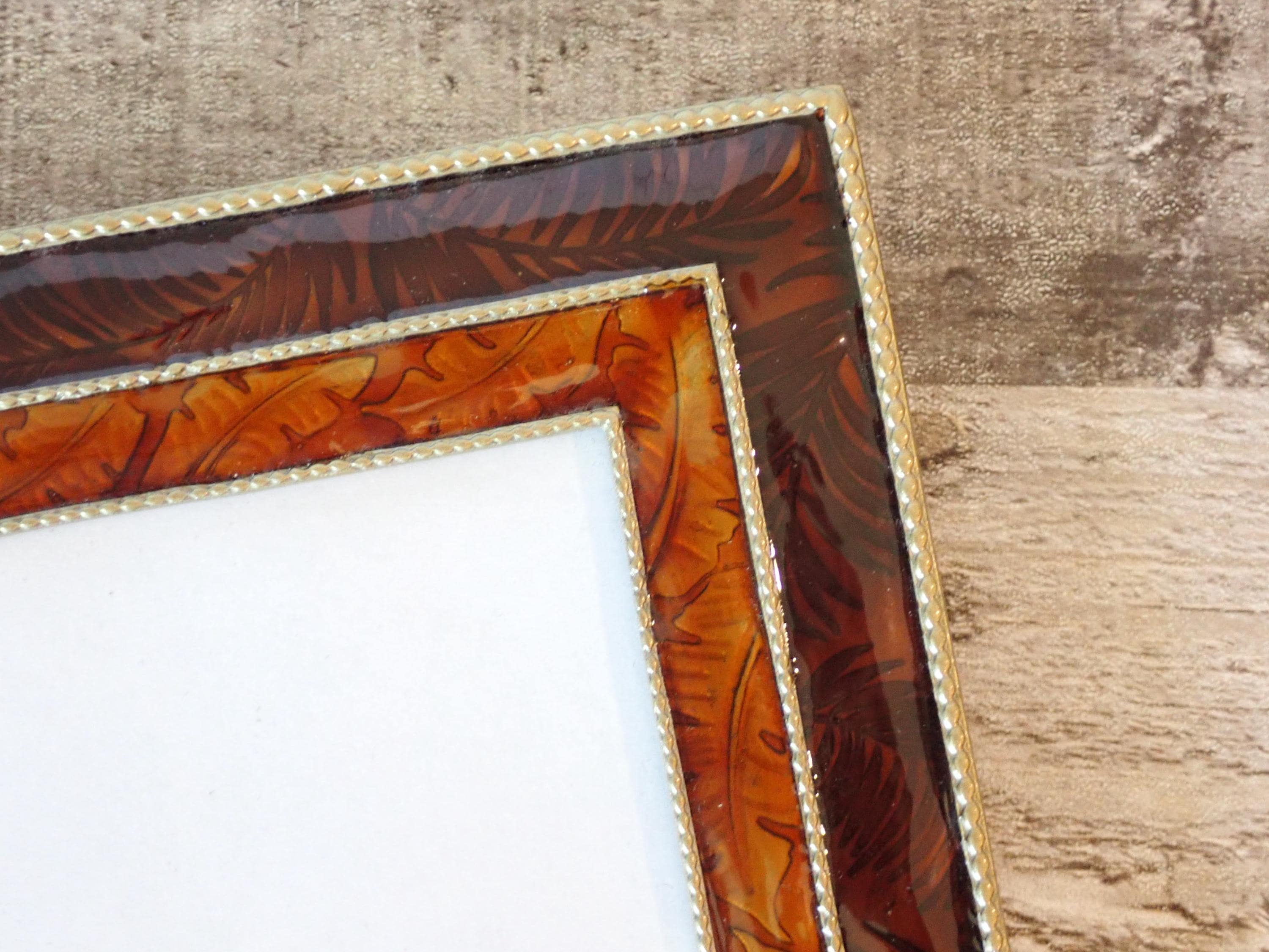 This 4x6 photo frame is a dark red/orange enamel with leaf accents. The frame has a piece of clear glass over the photo opening and a cardboard backing piece with a photo stand. The frame can stand either vertically or horizontally. The frame is in very nice condition but there are some light scratches on the frames here and there.