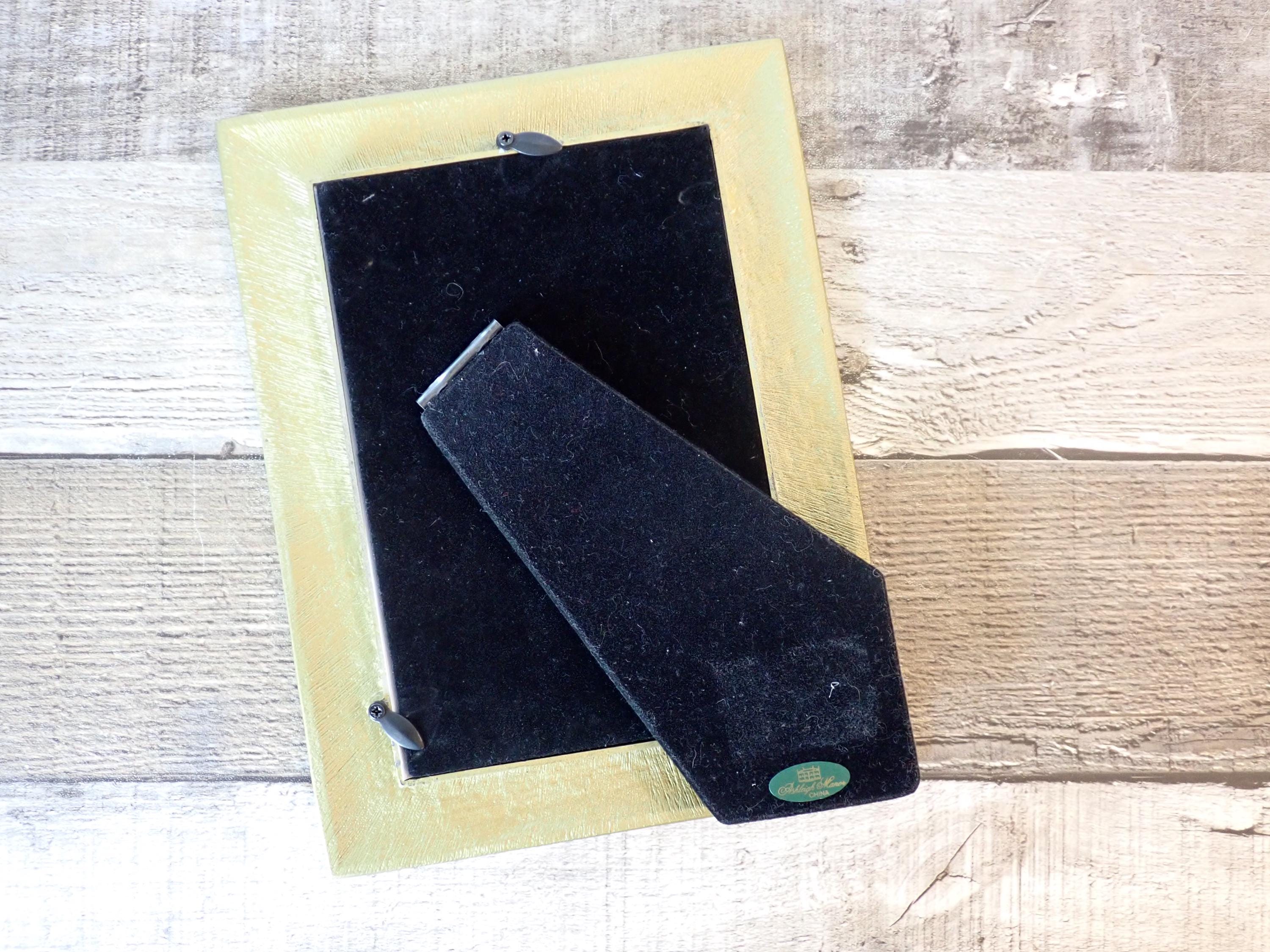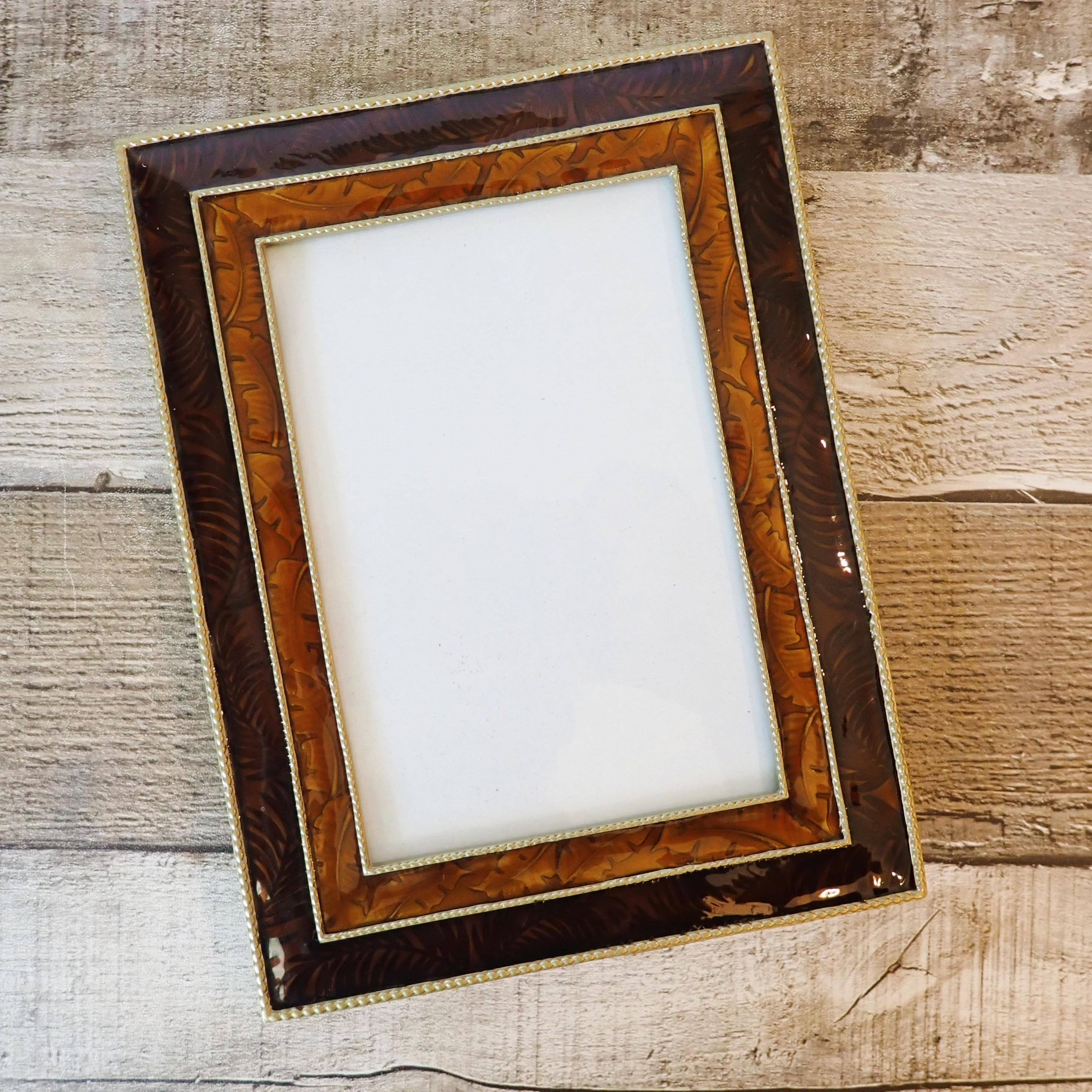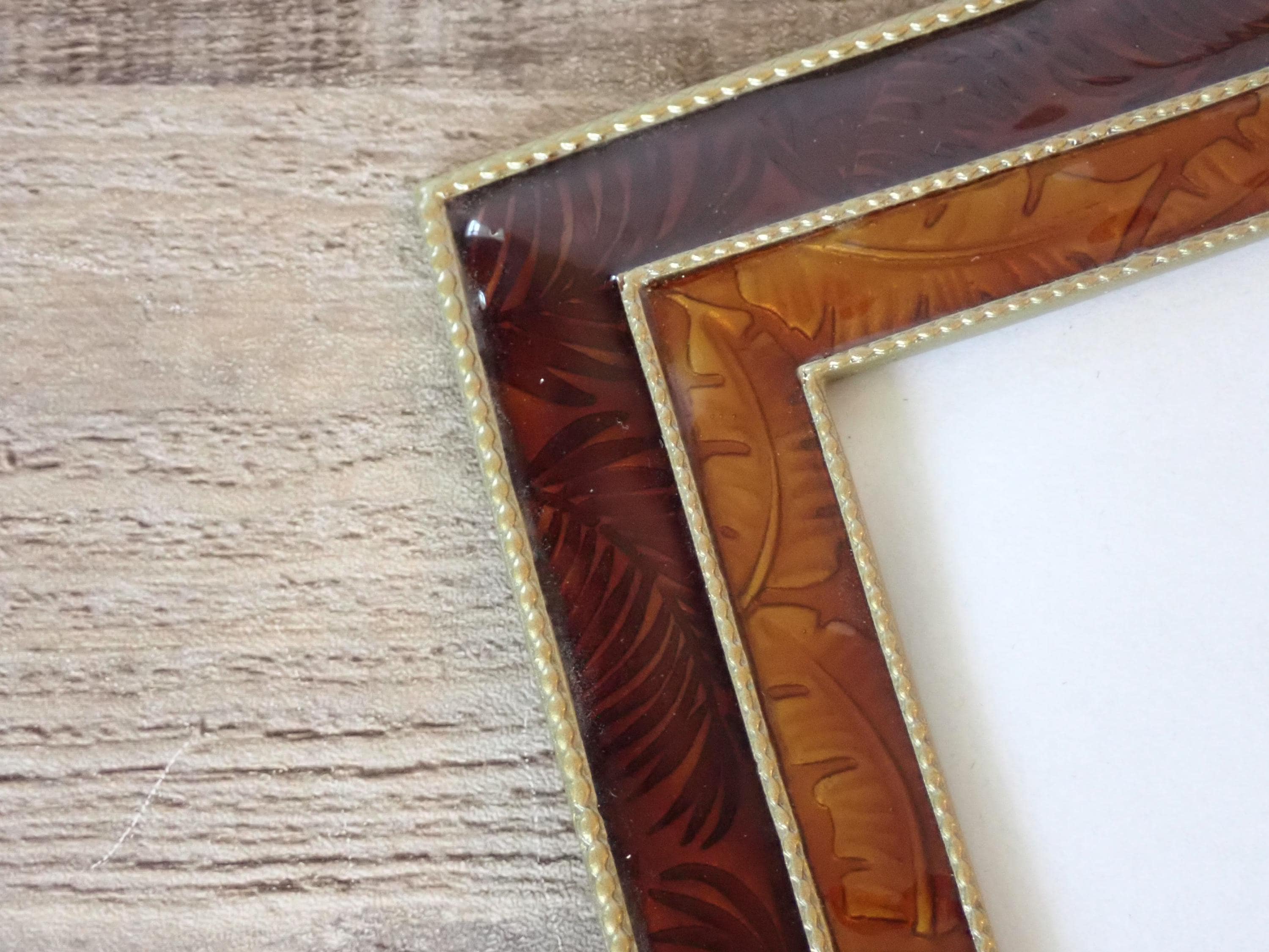 This 4x6 photo frame is a dark red/orange enamel with leaf accents. The frame has a piece of clear glass over the photo opening and a cardboard backing piece with a photo stand. The frame can stand either vertically or horizontally. The frame is in very nice condition but there are some light scratches on the frames here and there.