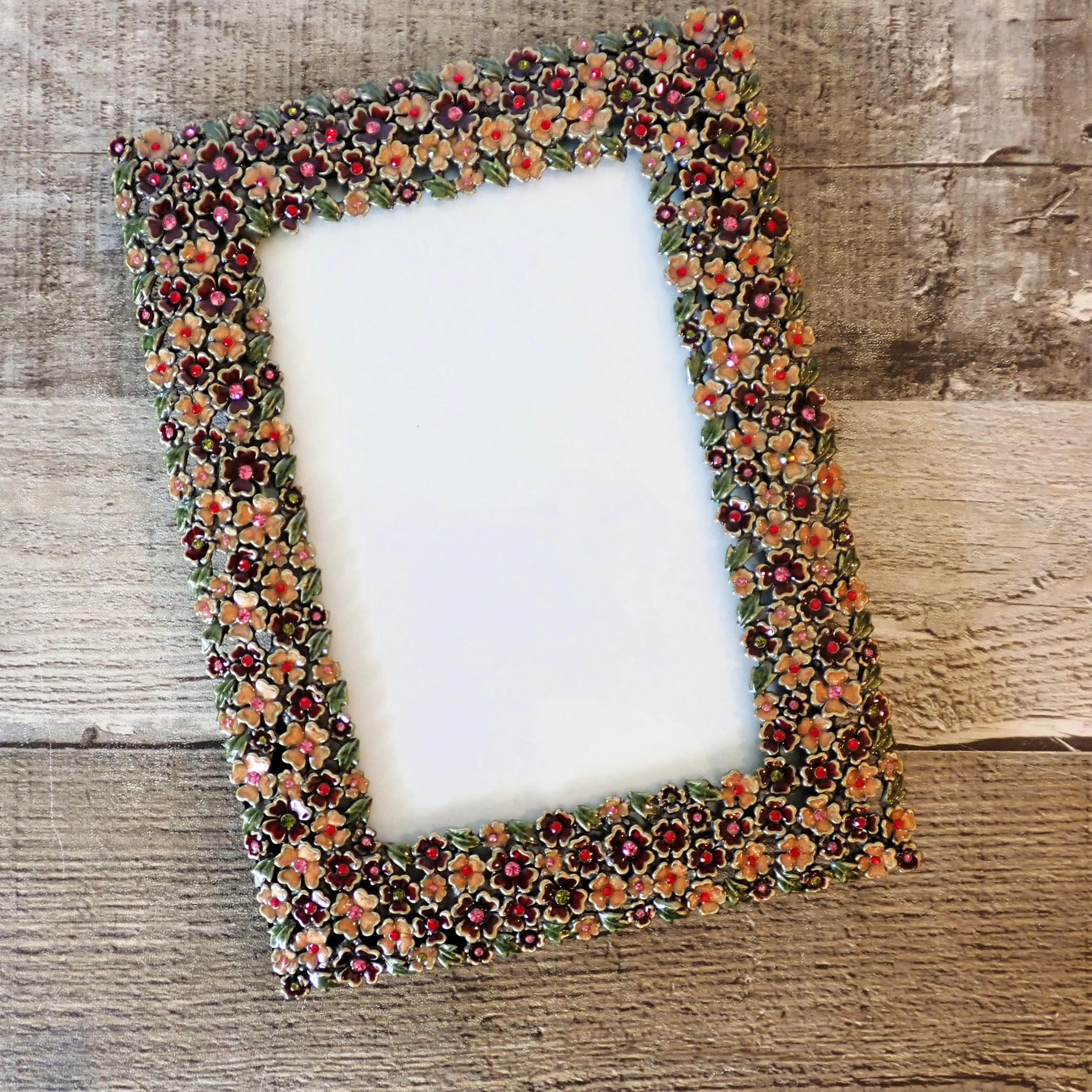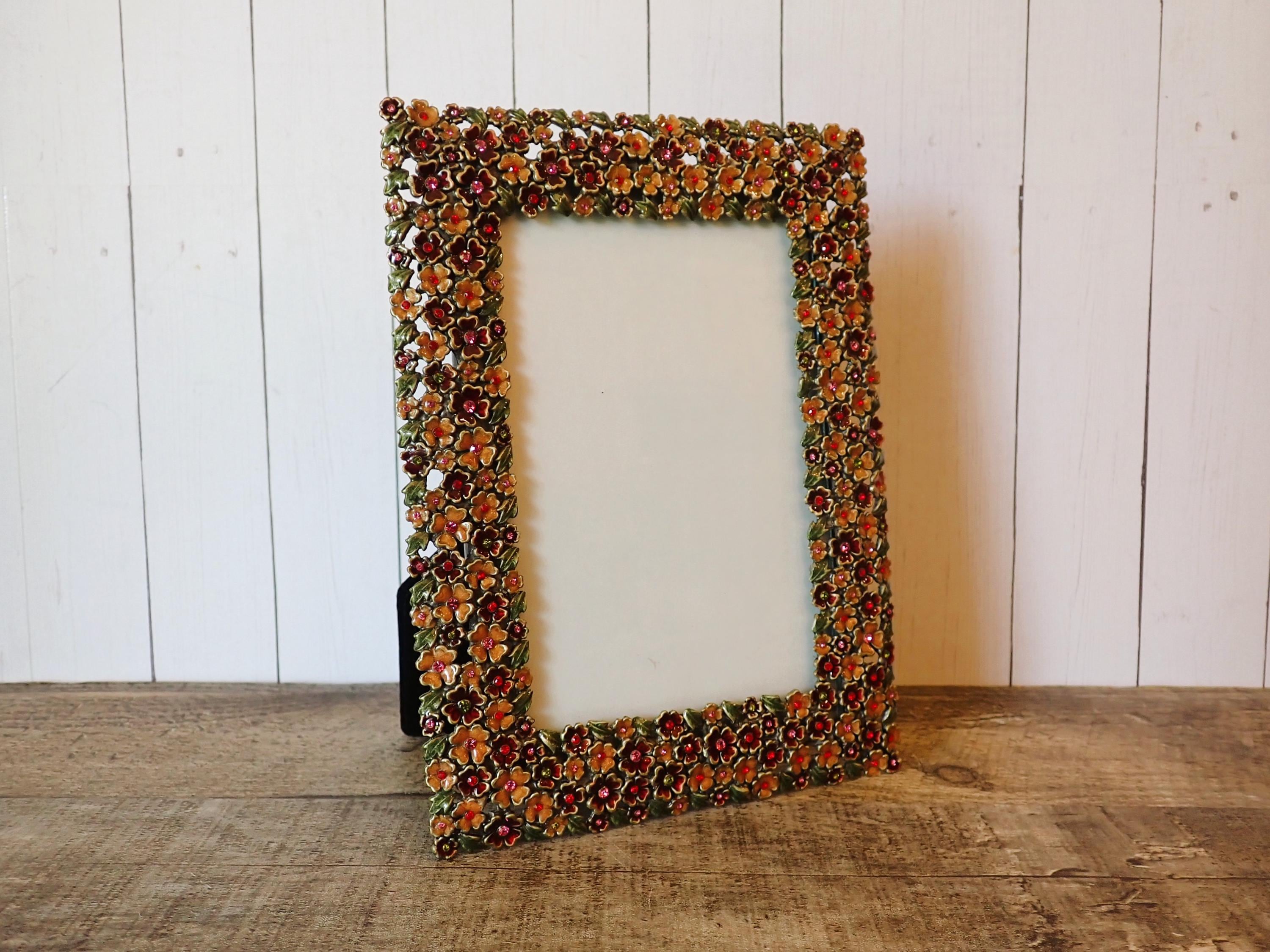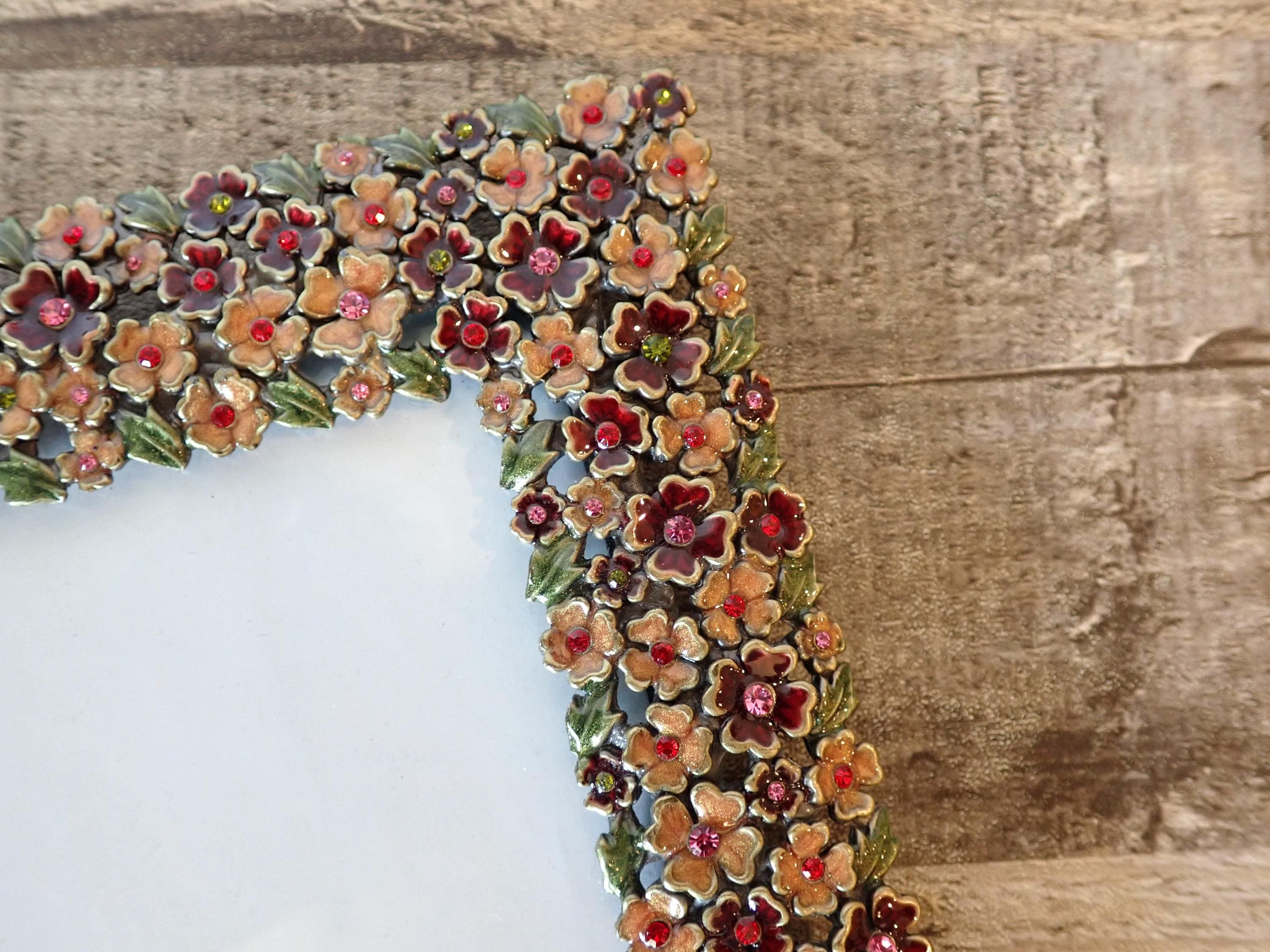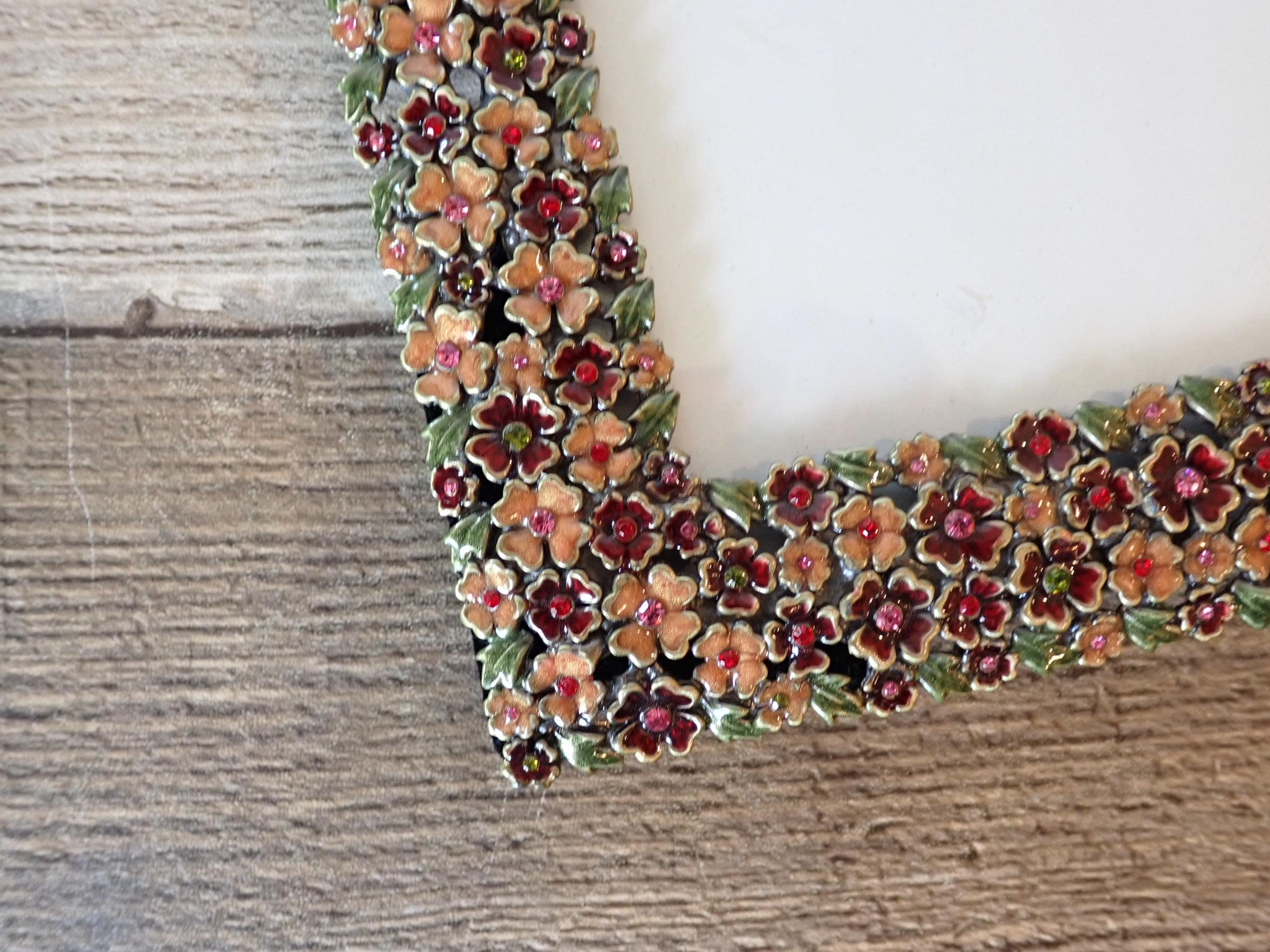 This 4x6 photo frame is a bronze colored metal with a pink, purple, and green enamel flower and leaf design. The frame has a piece of clear glass over the photo opening and a cardboard backing piece with a photo stand. The frame can stand either vertically or horizontally. The frame is in very nice condition.