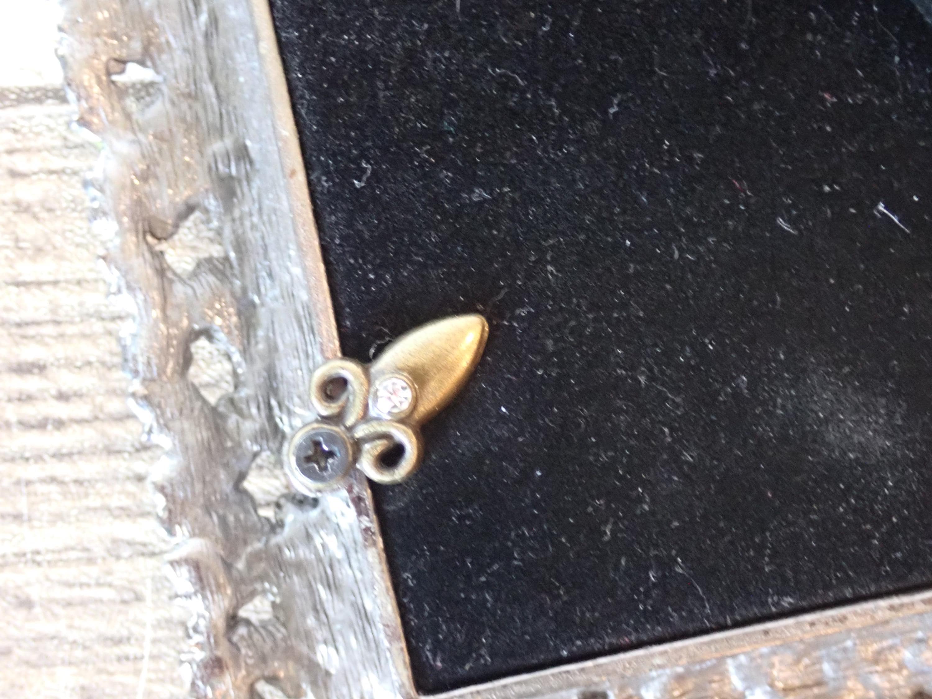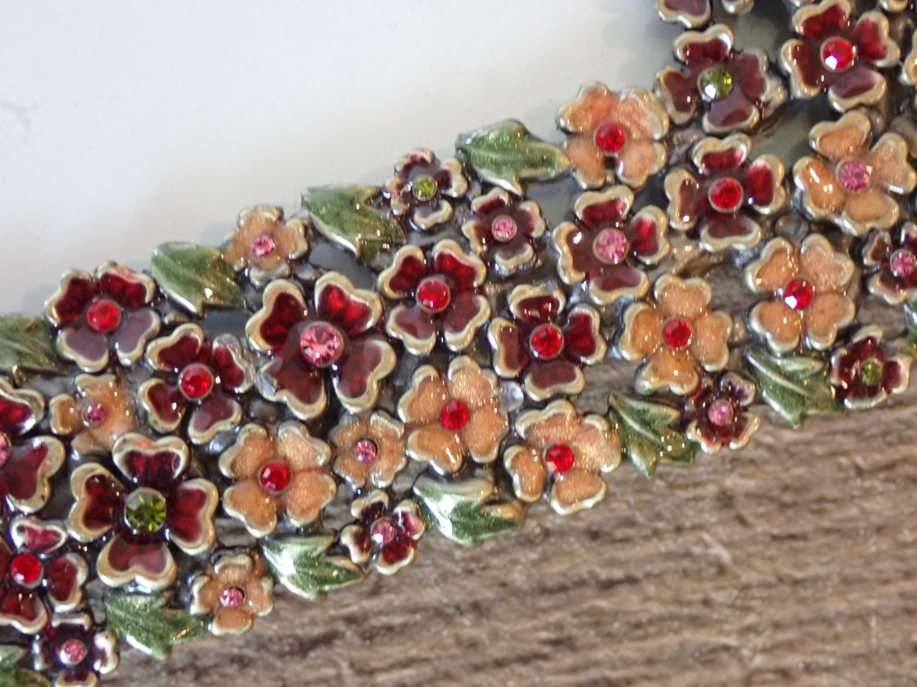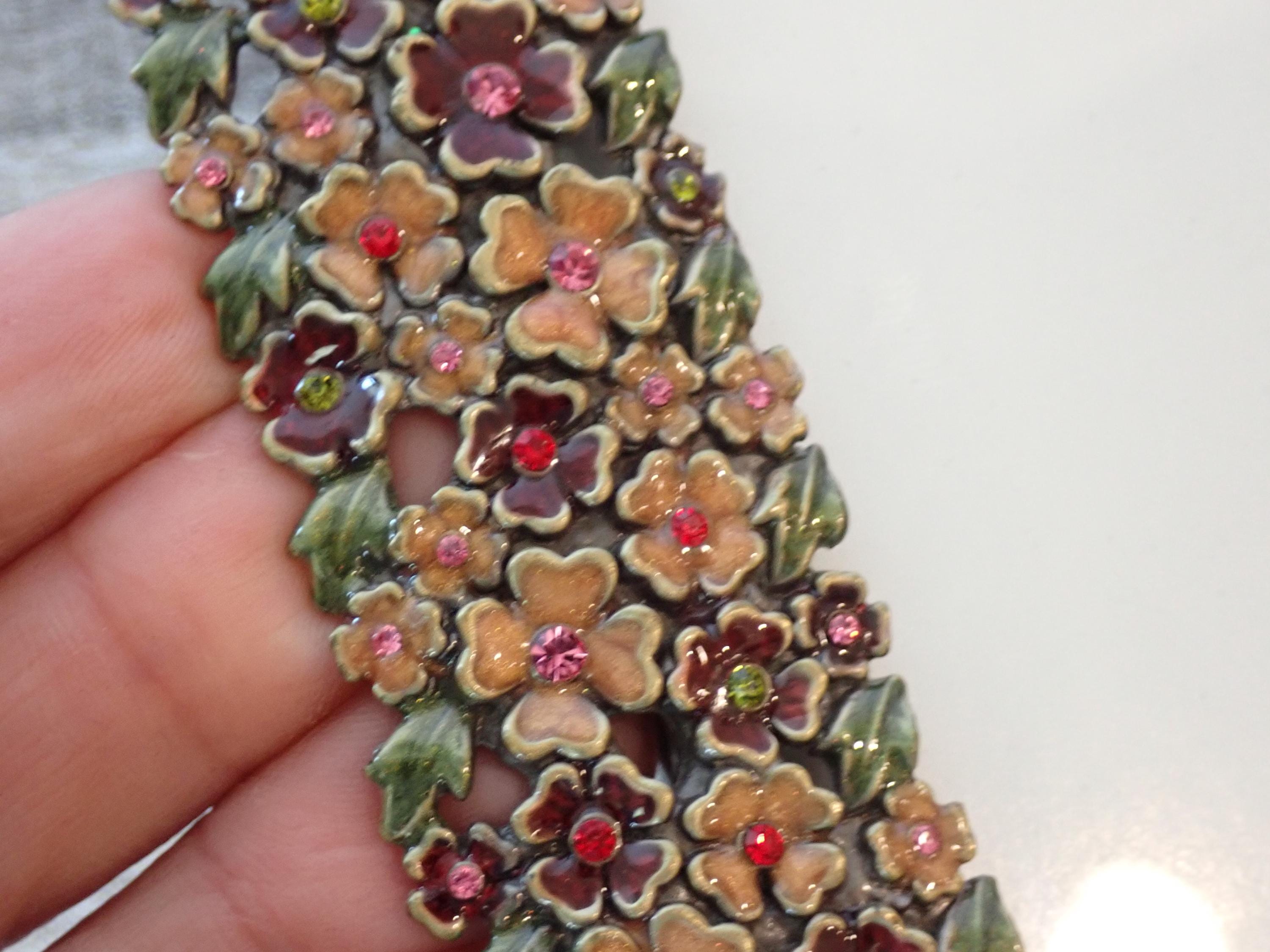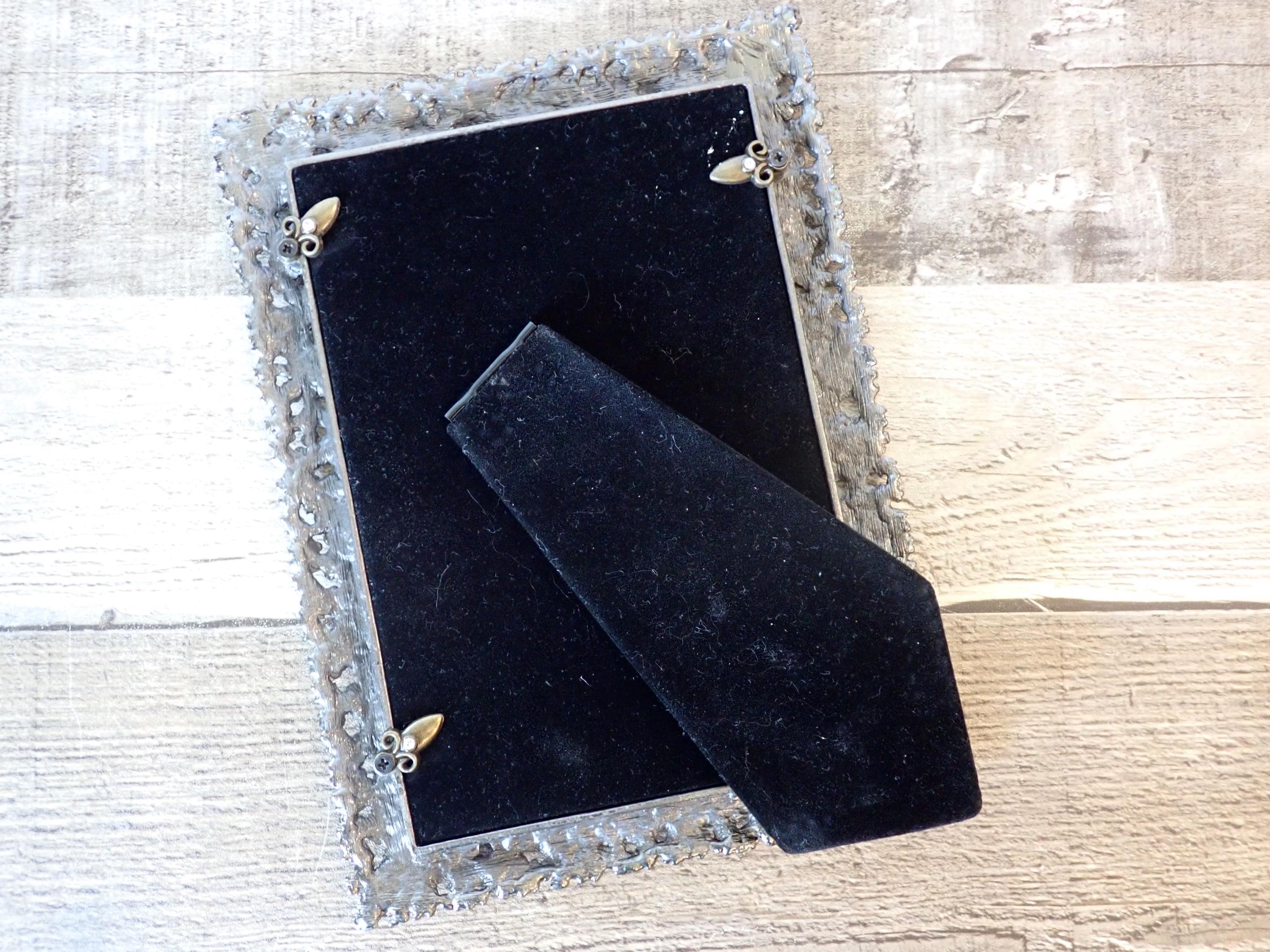 This 4x6 photo frame is a bronze colored metal with a pink, purple, and green enamel flower and leaf design. The frame has a piece of clear glass over the photo opening and a cardboard backing piece with a photo stand. The frame can stand either vertically or horizontally. The frame is in very nice condition.