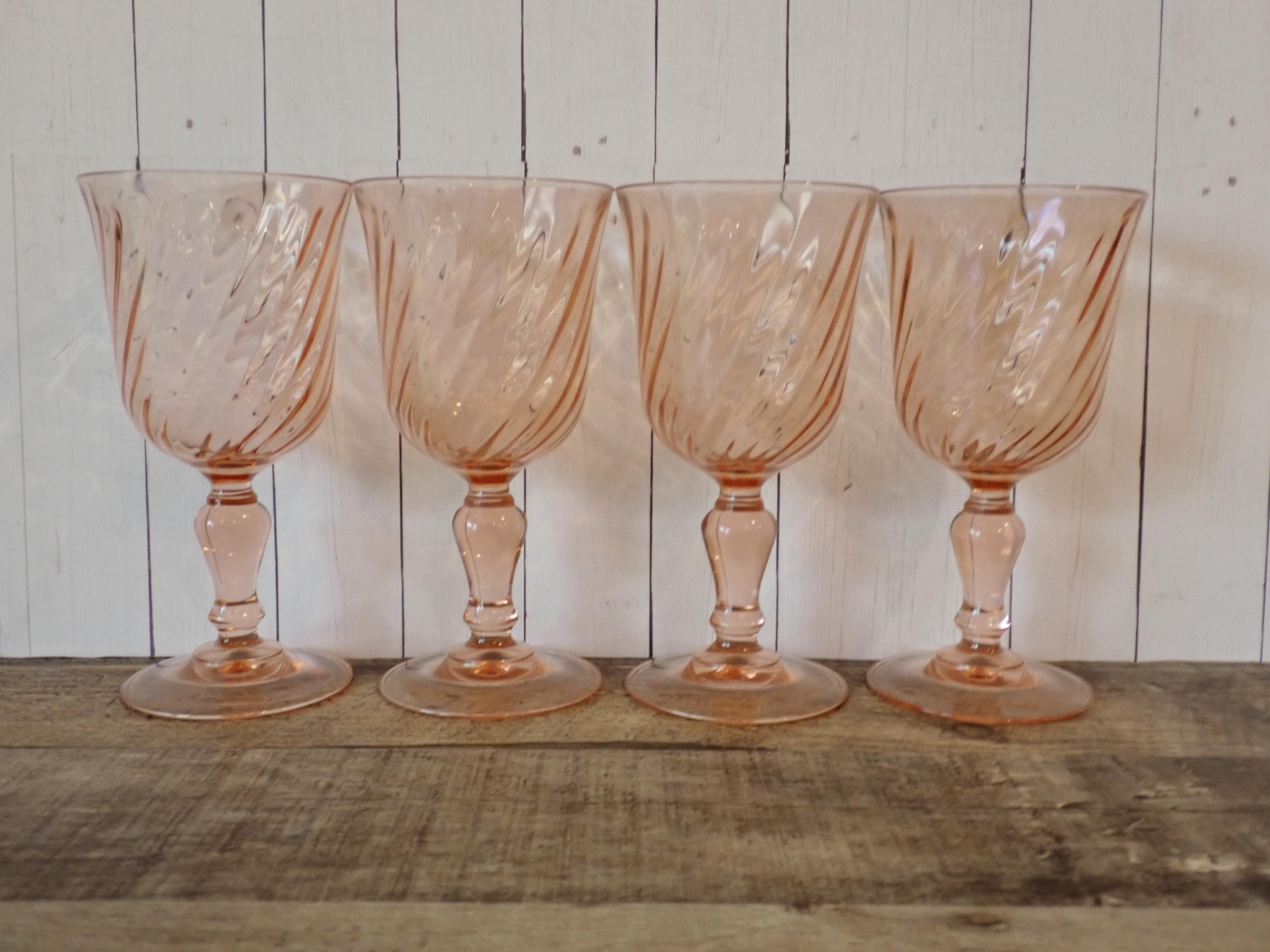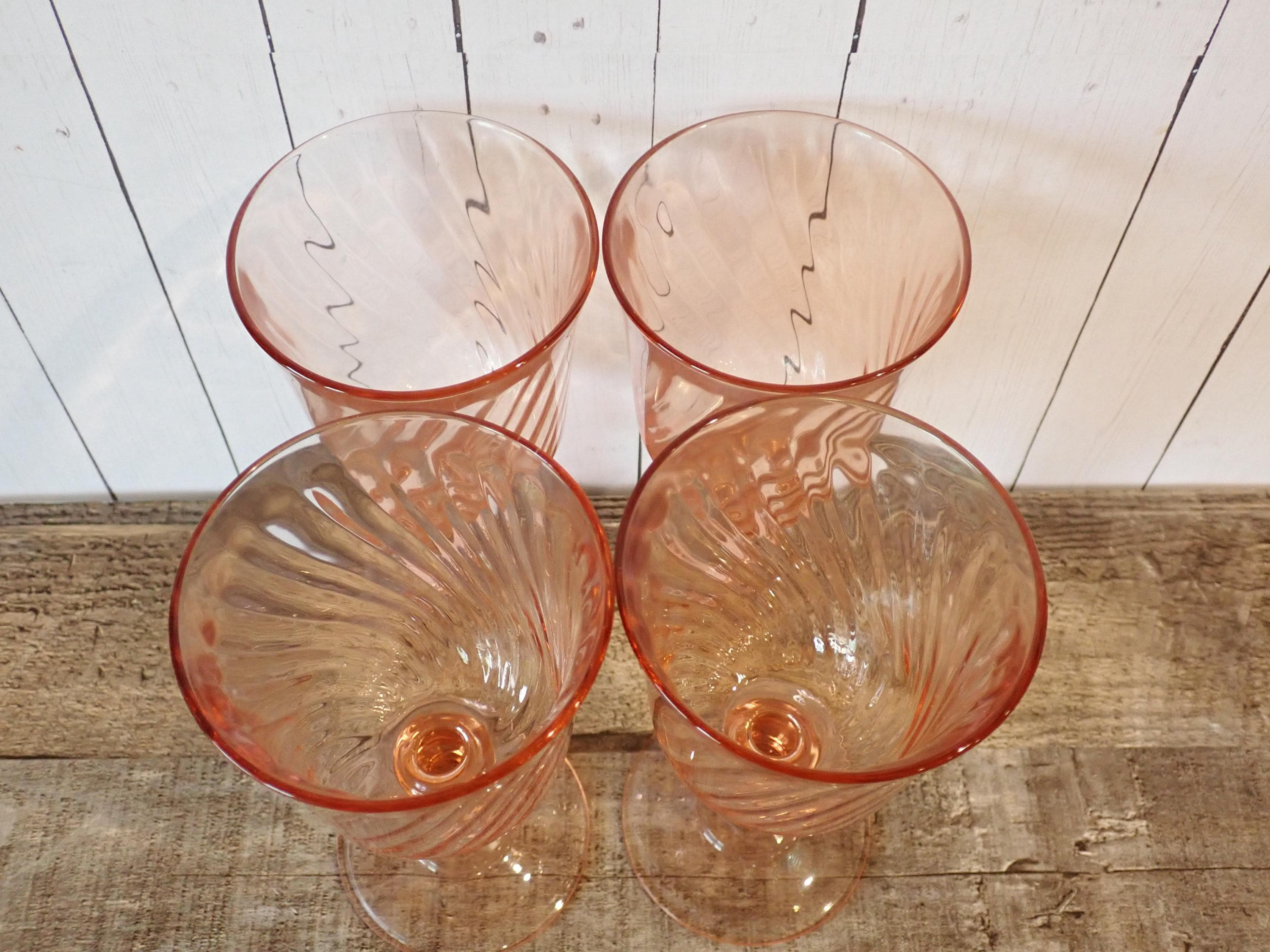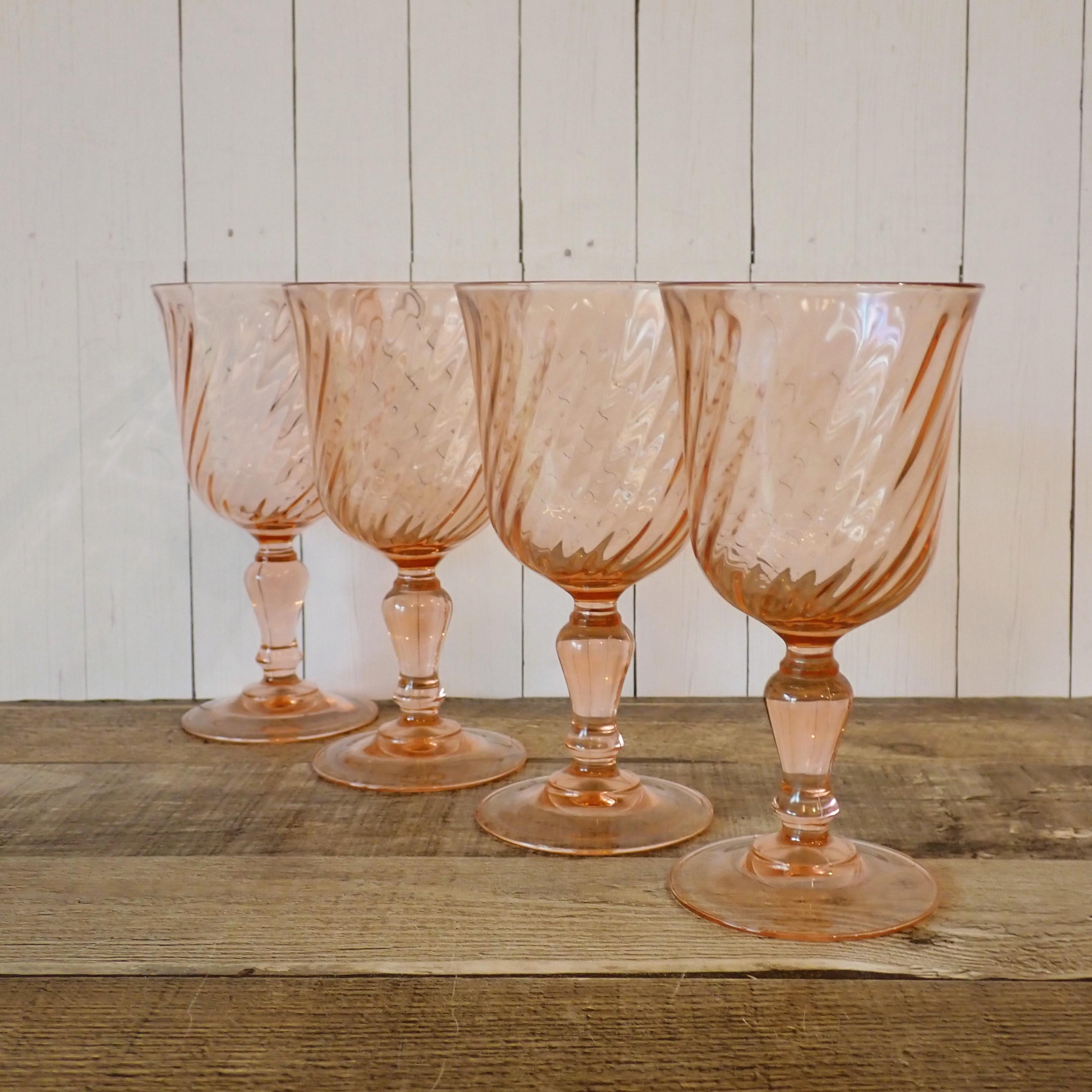 This lovely set of 4 water goblets by Cristal D'Arques-Durand are in the Rosaline. Each glass is 6.5" tall and 3.5" in diameter. These are the larger size glasses available in this pattern. The glasses have a pink swirl design in the glass. All 4 of the glasses are in very good condition with no chips or cracks, and very few scratches.