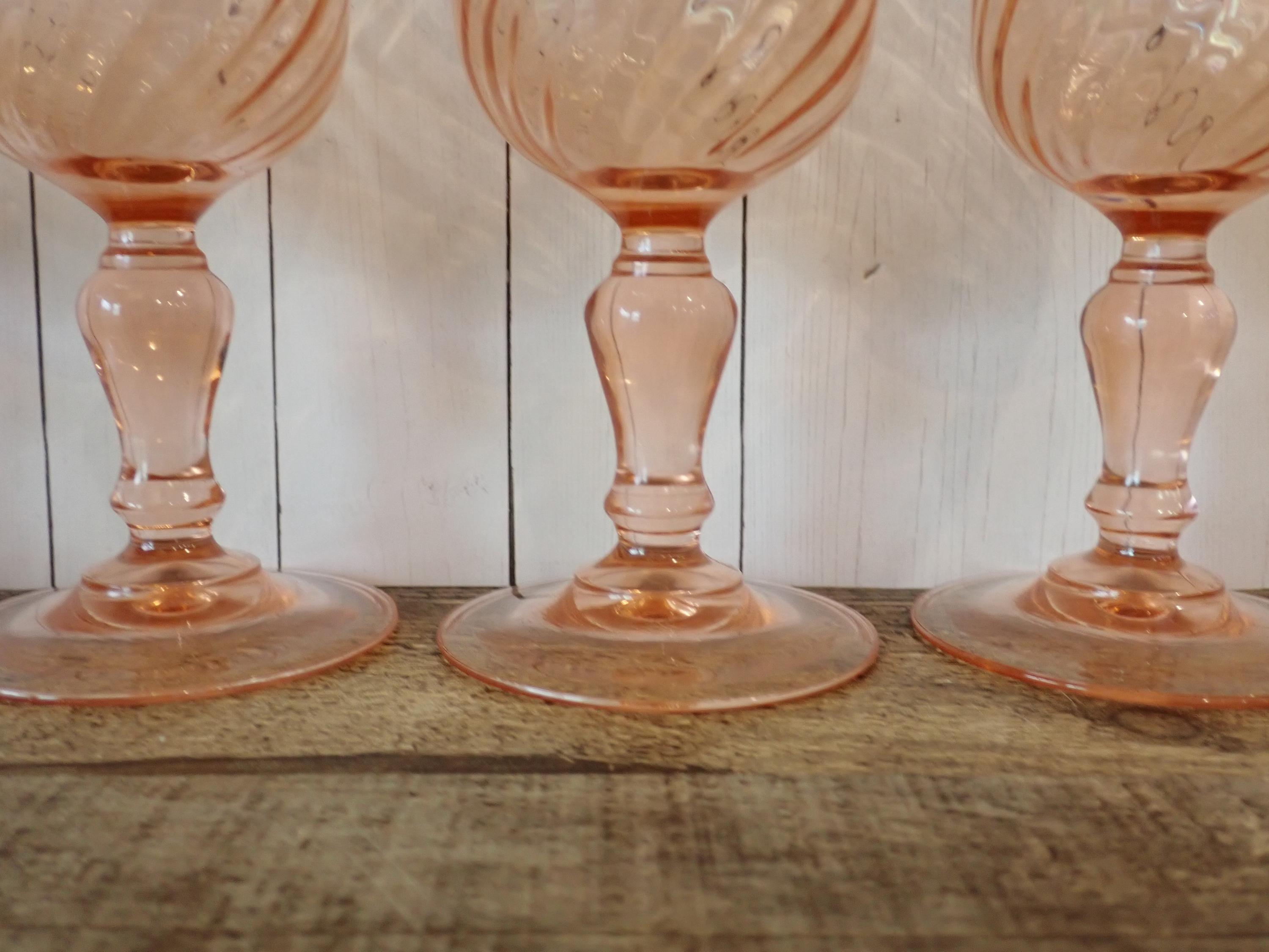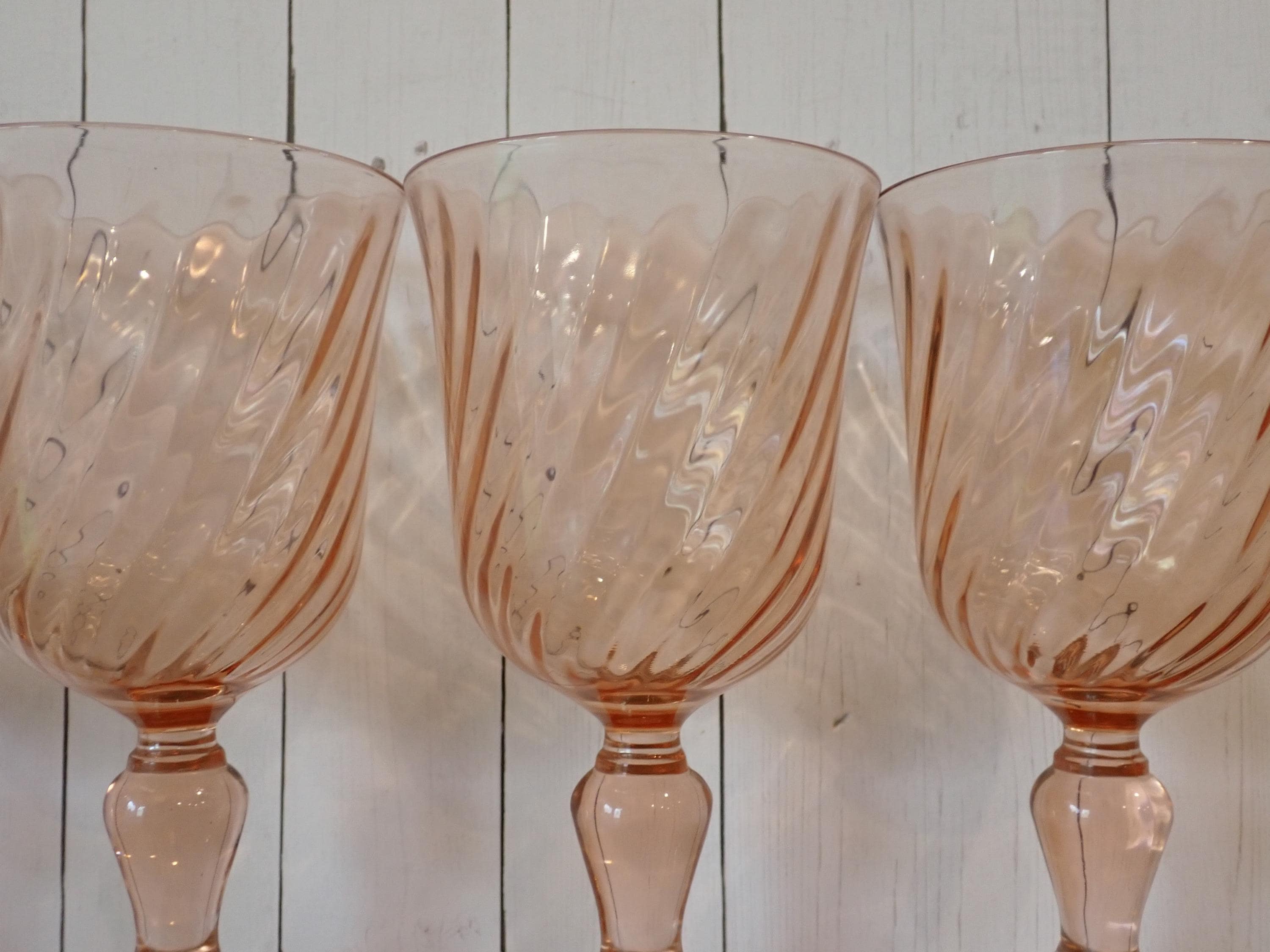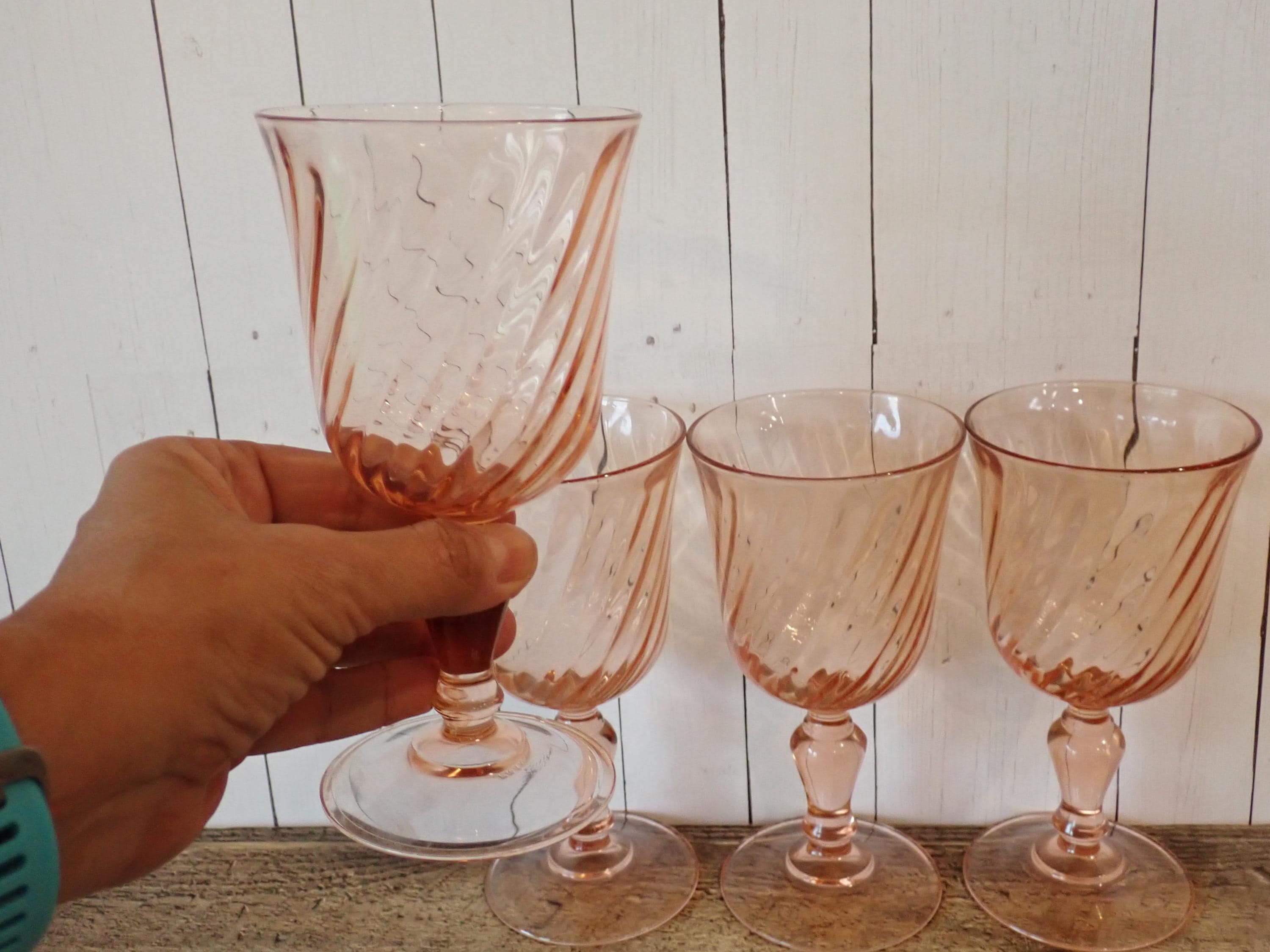 This lovely set of 4 water goblets by Cristal D'Arques-Durand are in the Rosaline. Each glass is 6.5" tall and 3.5" in diameter. These are the larger size glasses available in this pattern. The glasses have a pink swirl design in the glass. All 4 of the glasses are in very good condition with no chips or cracks, and very few scratches.