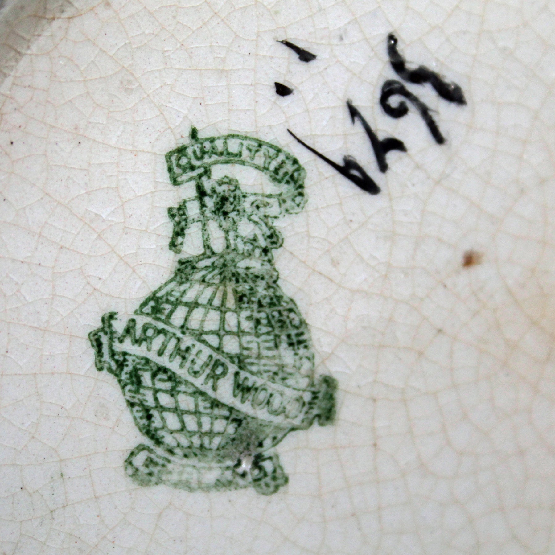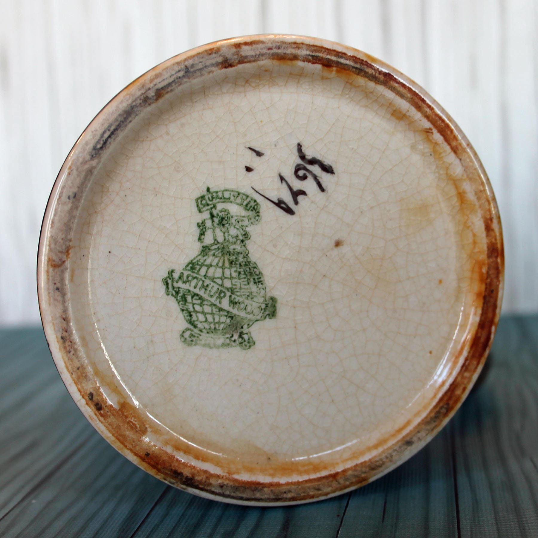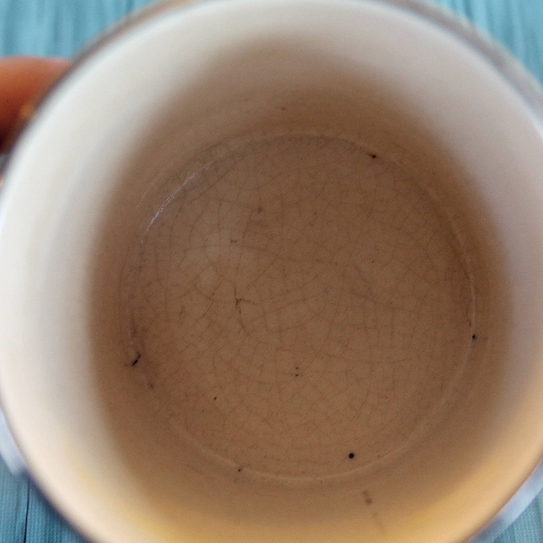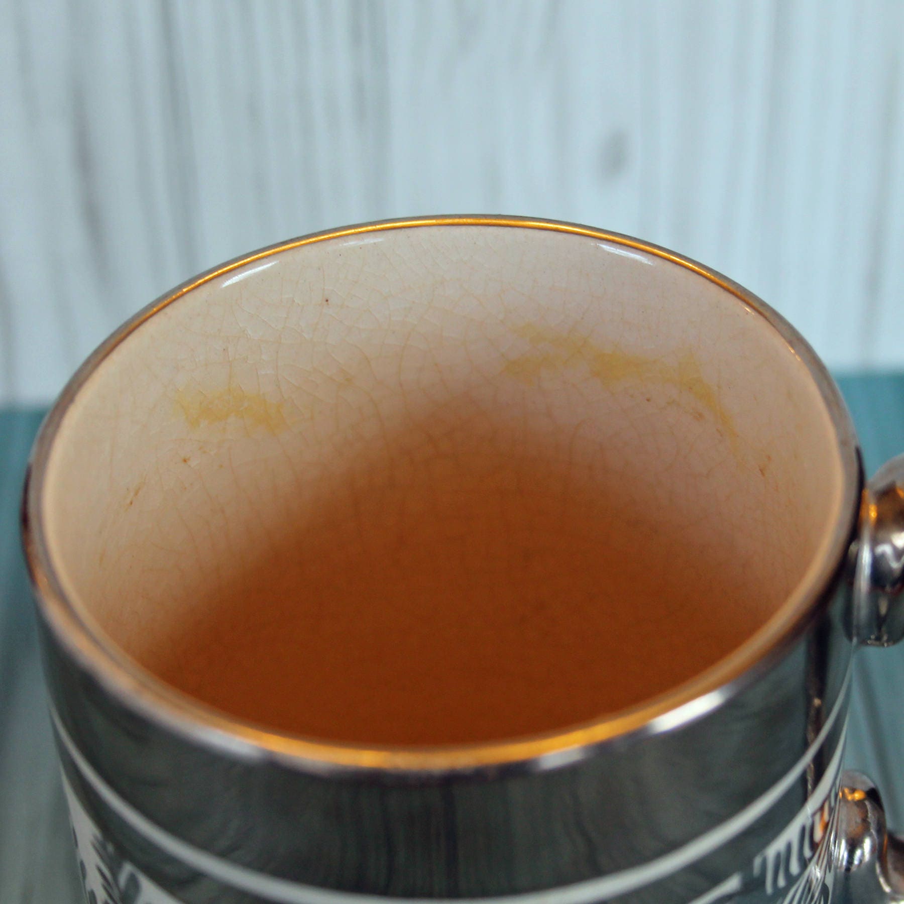 There are no chips or cracks in the mug, but there are a few issues with condition which are expected due to its age. The bottom has some rust colored discoloring on the unglazed parts of the base. There is crazing throughout the mug, and areas of silver worn off along the rim and base. The inside of the mug has some yellow-ish discoloring near the rim. Please see the last 4 photos for details on the condition. This is a very early, beautiful mug.
