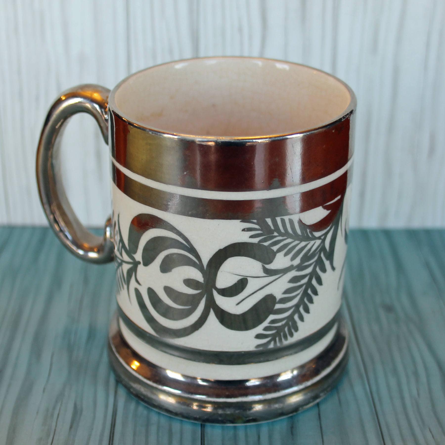This beautiful silver luster Arthur Wood mug is decorated with a silver and white leaf design. The mug is 4" tall and 3.25" in diameter at the base. The bottom is marked with the Arthur Wood makers mark.