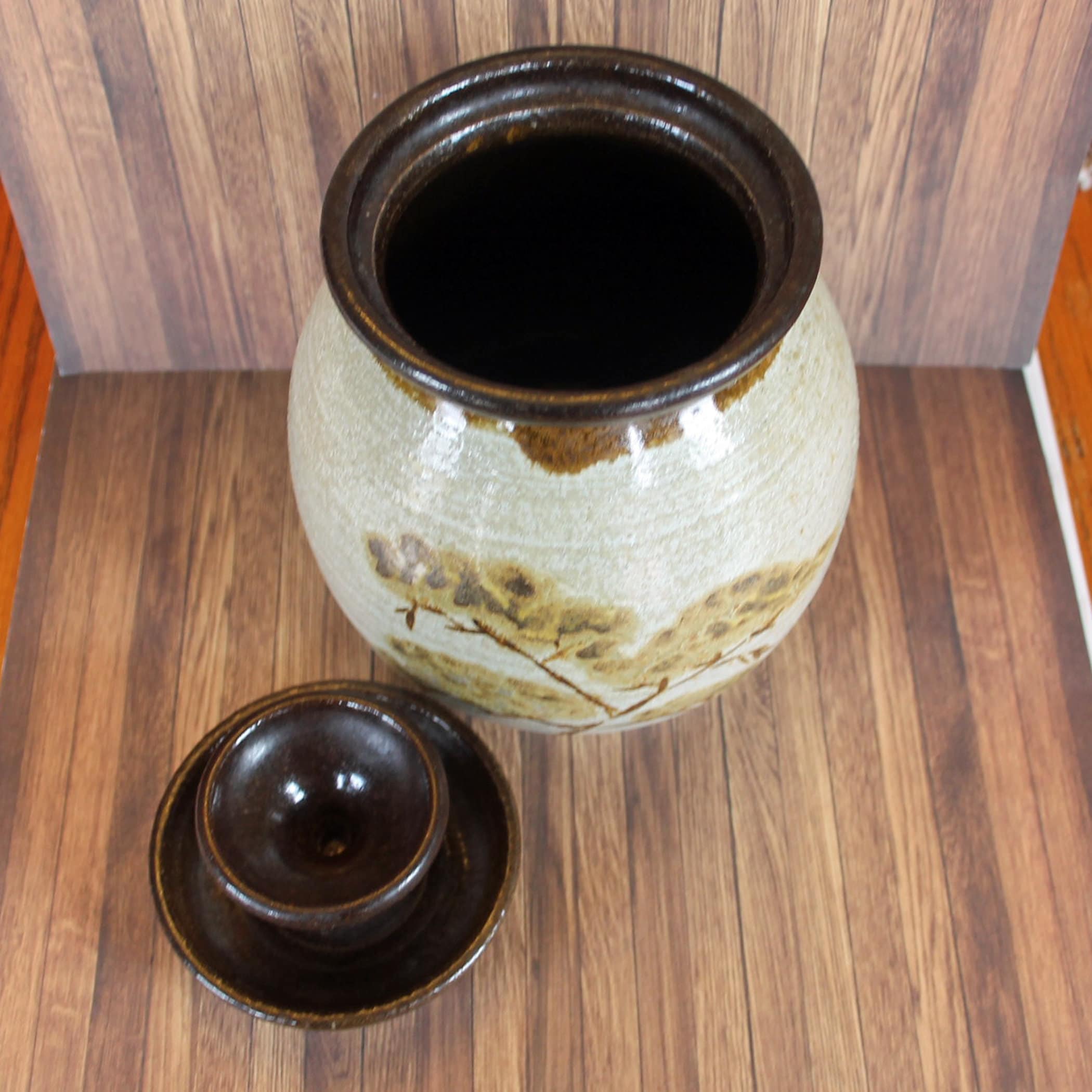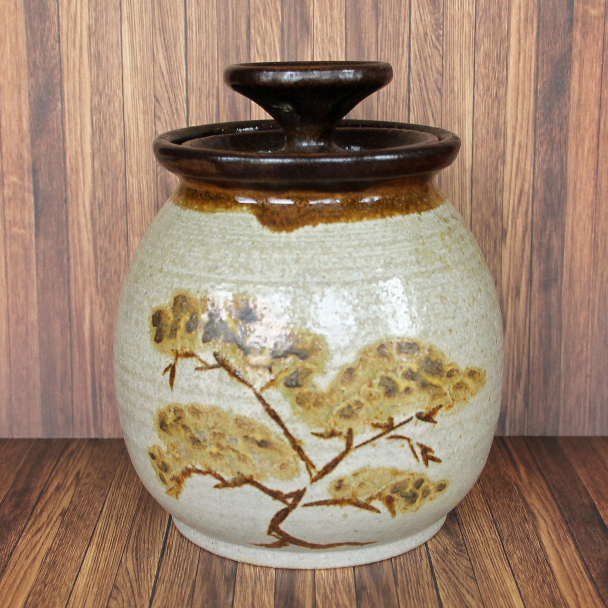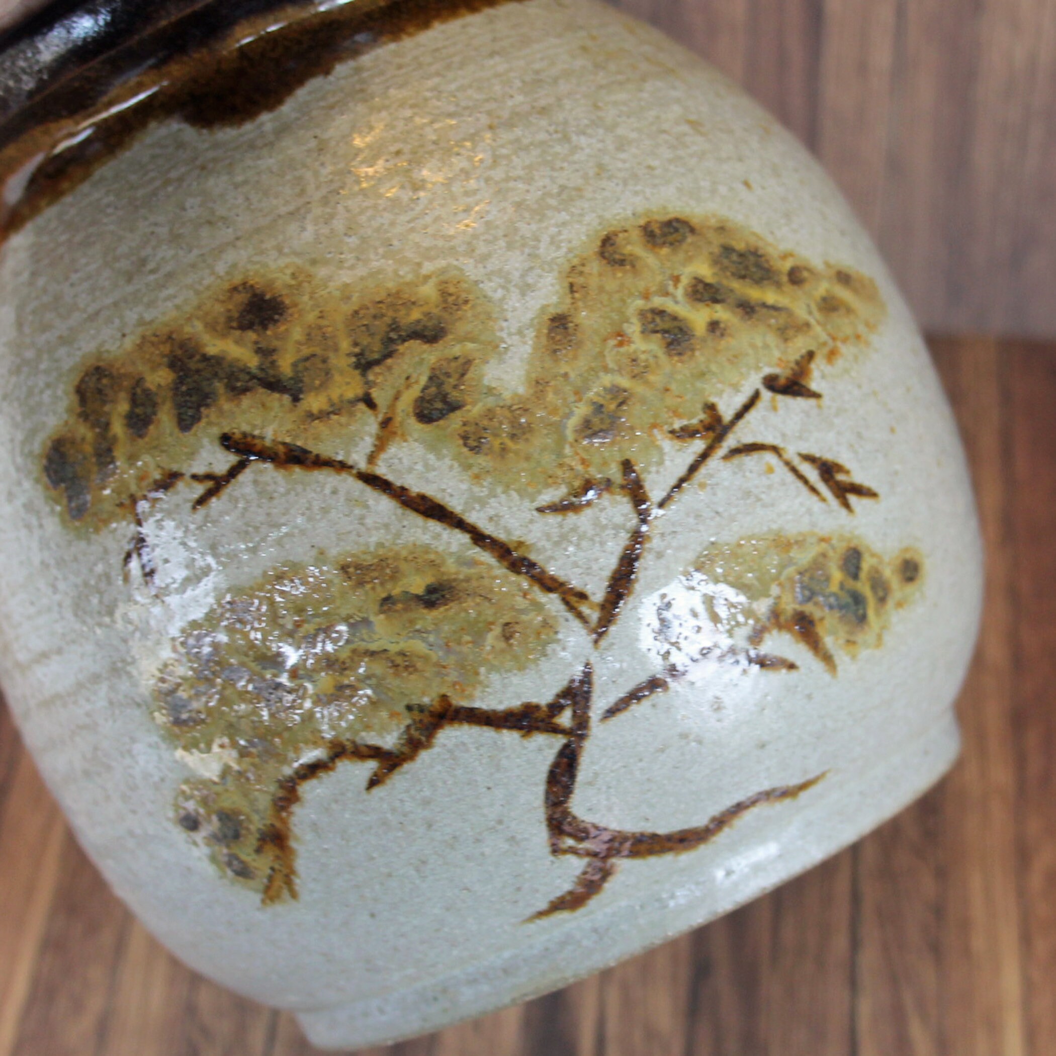 This beautiful stoneware canister is a studio pottery piece that includes the canister and the lid. The canister is a a light grey banded stoneware with a bard drown glaze at the top and on the lid. The front of the canister depicts a hand painted tree in shades of brown and a light gold color. The canister measures 5.75" tall without the lid, 7" tall with the lid. It is 5.5" wide at the widest point, and the opening at the top is 3.75" in diameter. The botton of the piece is signed by the potter.