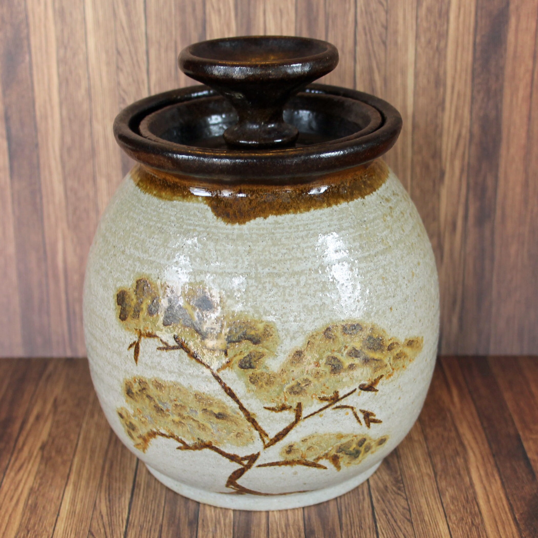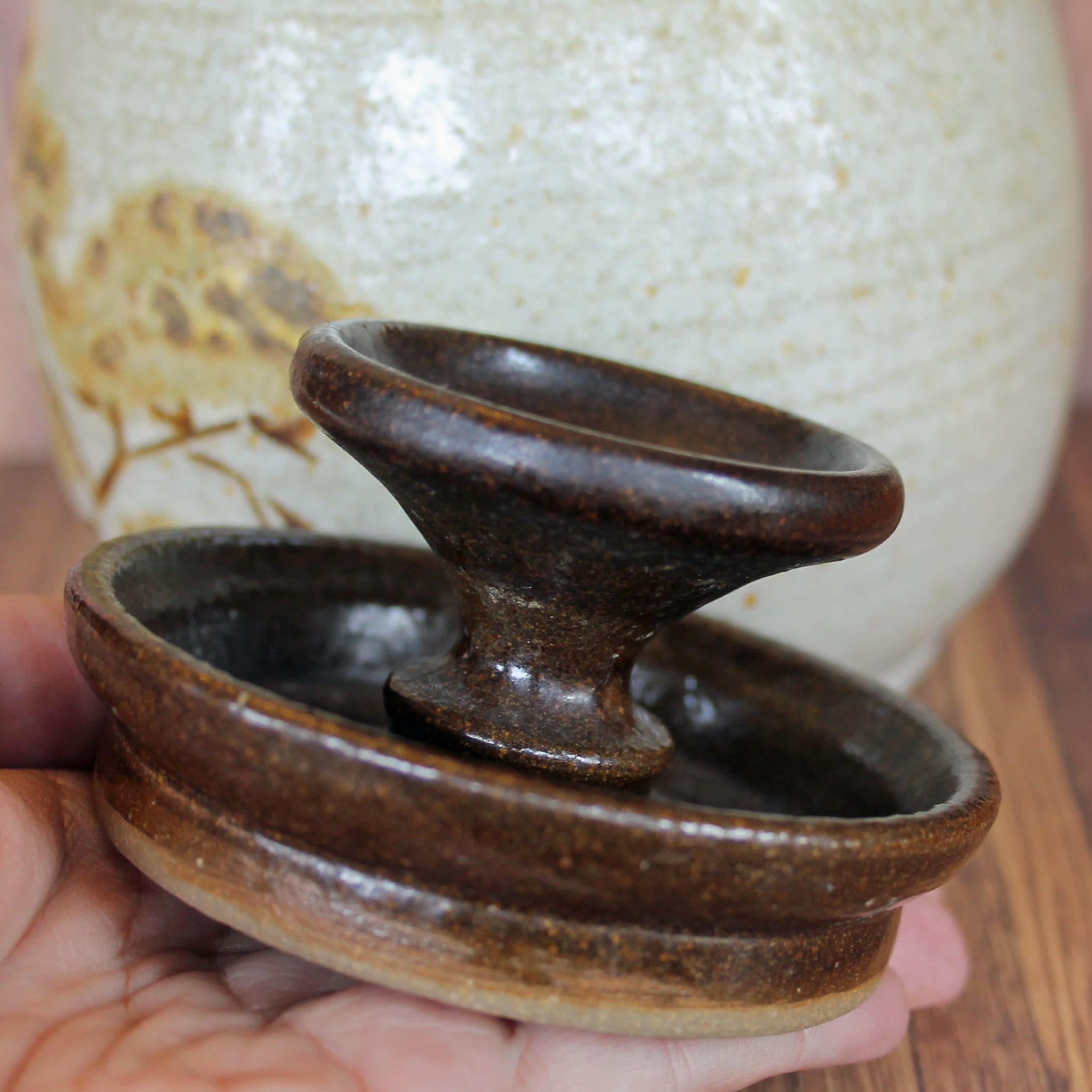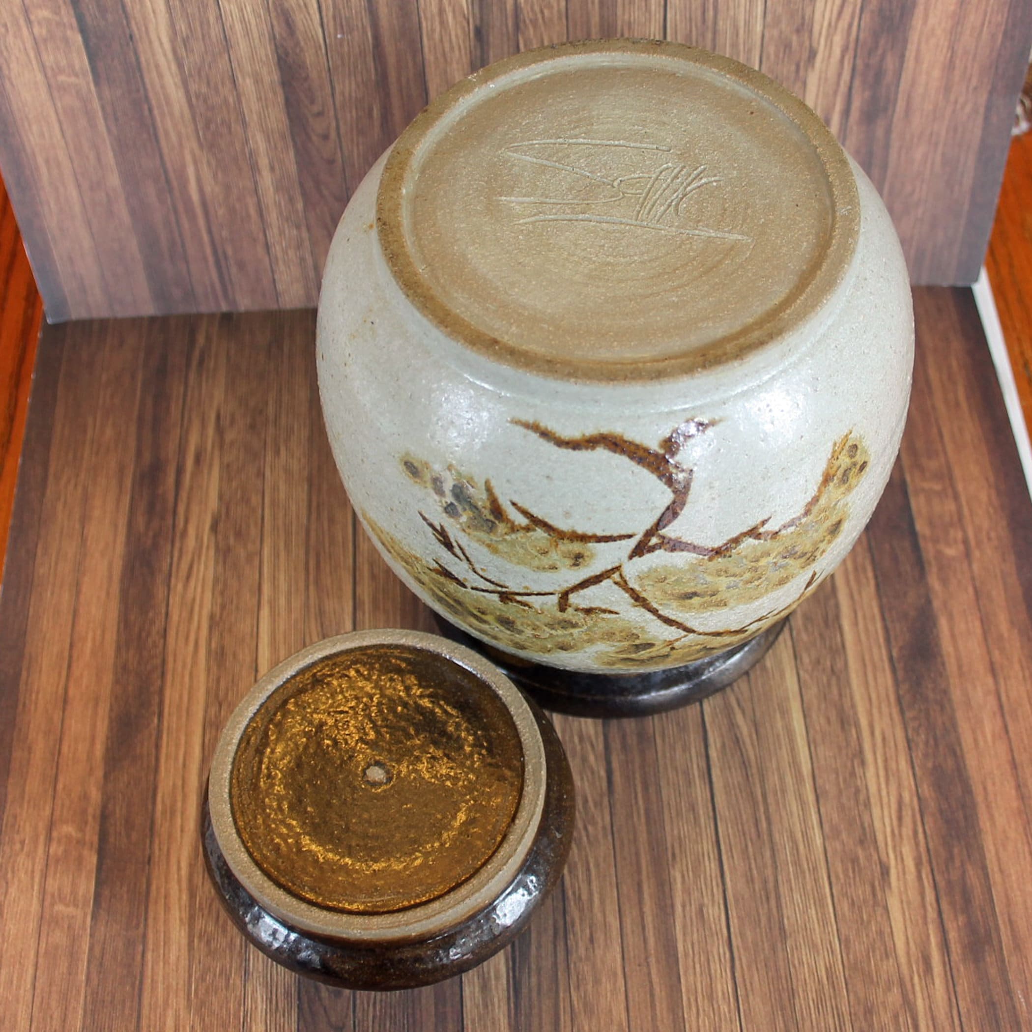 This beautiful stoneware canister is a studio pottery piece that includes the canister and the lid. The canister is a a light grey banded stoneware with a bard drown glaze at the top and on the lid. The front of the canister depicts a hand painted tree in shades of brown and a light gold color. The canister measures 5.75" tall without the lid, 7" tall with the lid. It is 5.5" wide at the widest point, and the opening at the top is 3.75" in diameter. The botton of the piece is signed by the potter.
