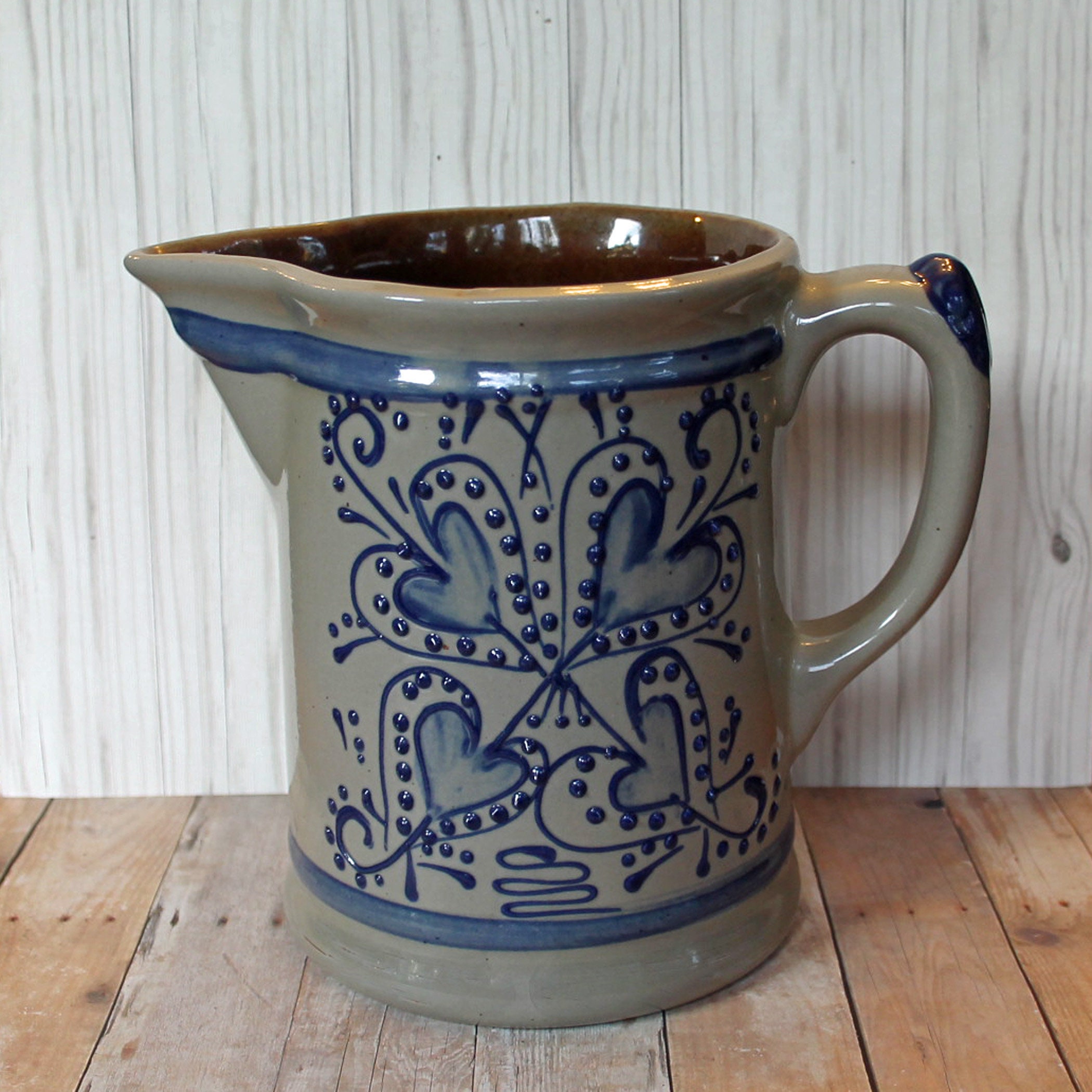 This great stoneware pitcher is from Beaumont Brothers Pottery. The pitcher is 6.25" tall and 5" in diameter at the base. From handle to spout, it is 7.5" wide. It is a gray stoneware accented with a blue heart and dot design on the front of the pitcher. The blue design is heavily applied creating a thick texture on the front of the pitcher. There is a horizontal blue band around the top and bottom of the pitcher. It is marked on the bottom BBP.