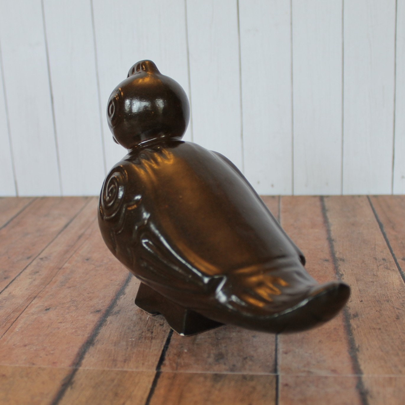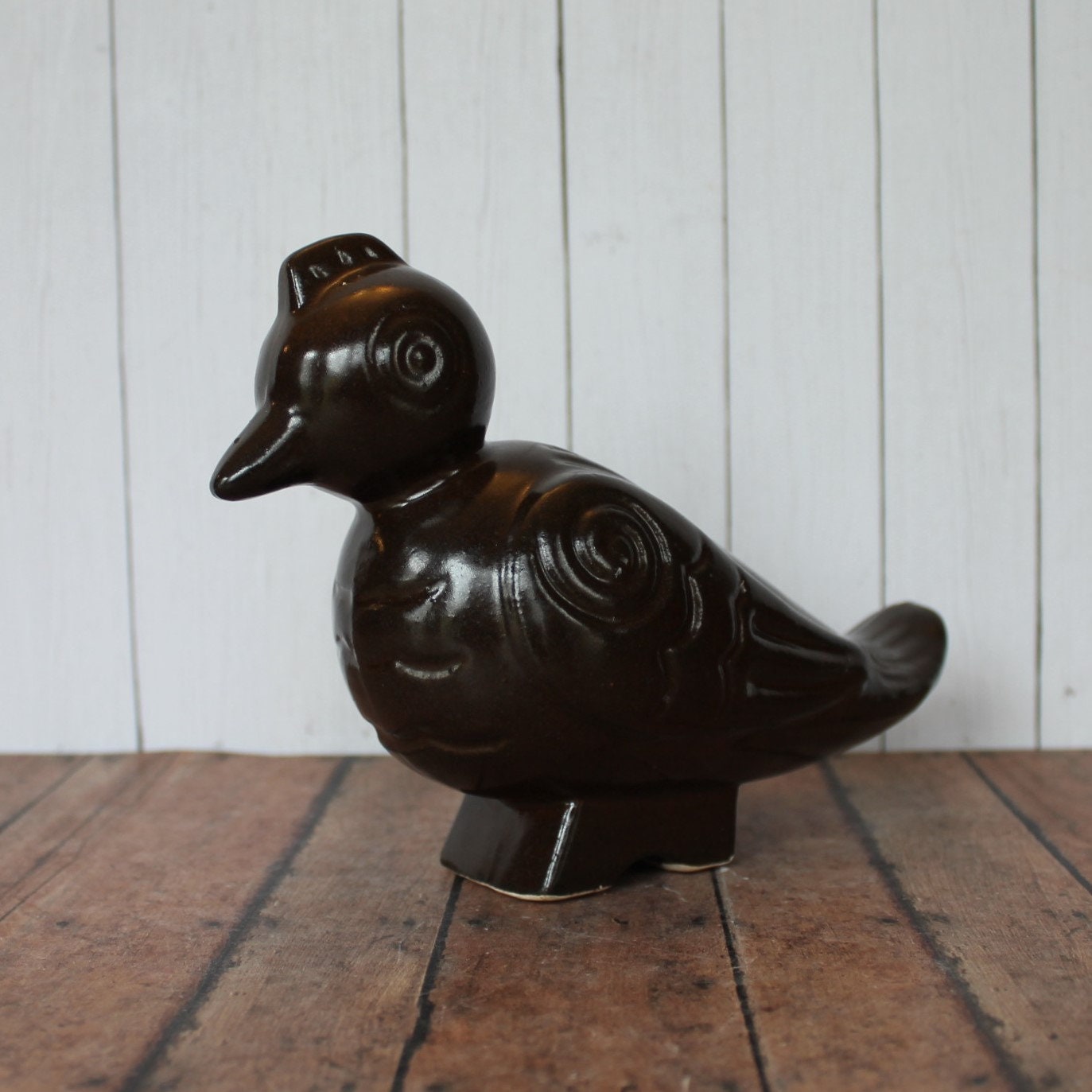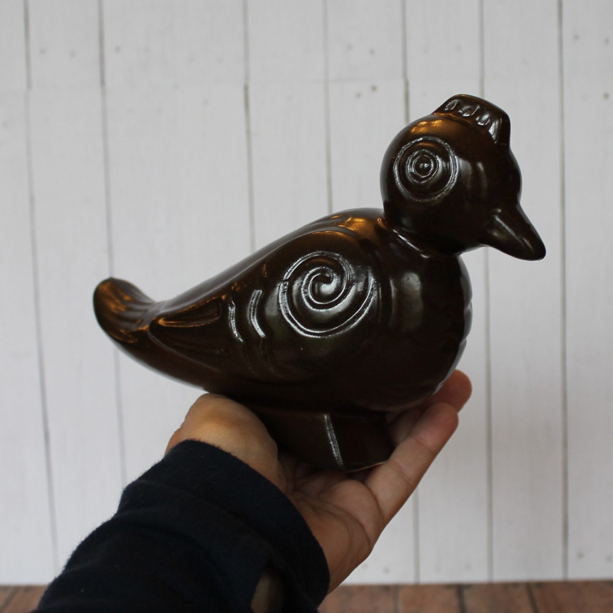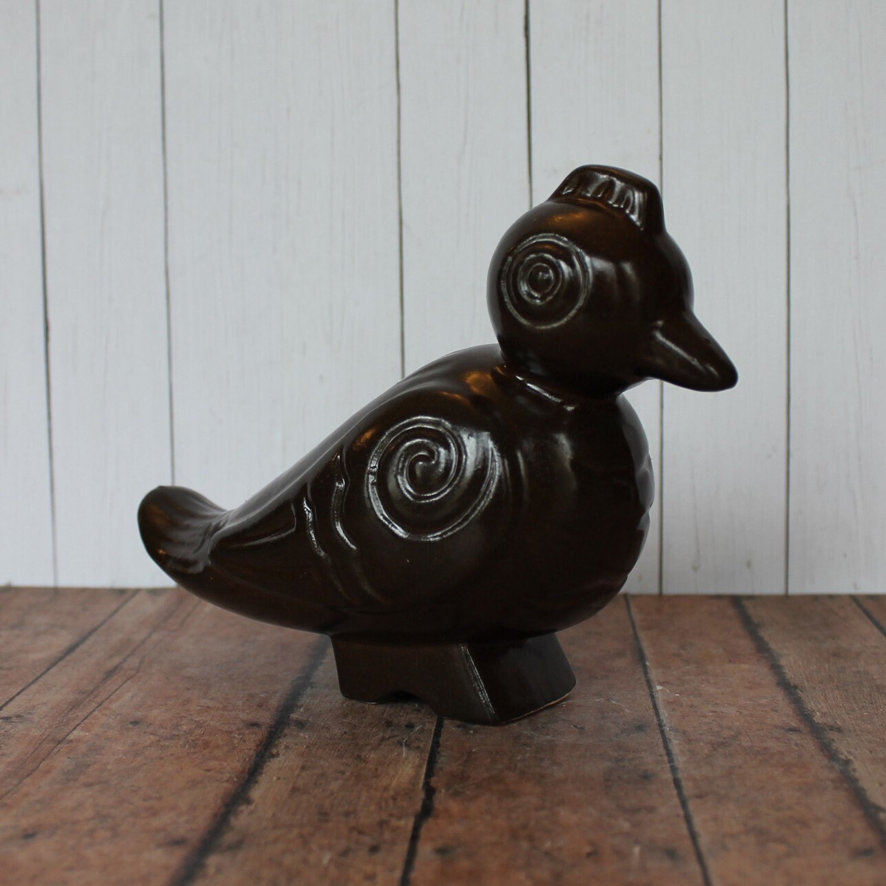 This cool modern bird is a nice size and has a fun and unique design. The figurine is 8" long and 3.5" wide, and stands 5.5" tall. It is a solid dark brown ceramic piece with a modern design and subtle patterns on the birds wings, head, and tail. There are no makers marks on the bird.