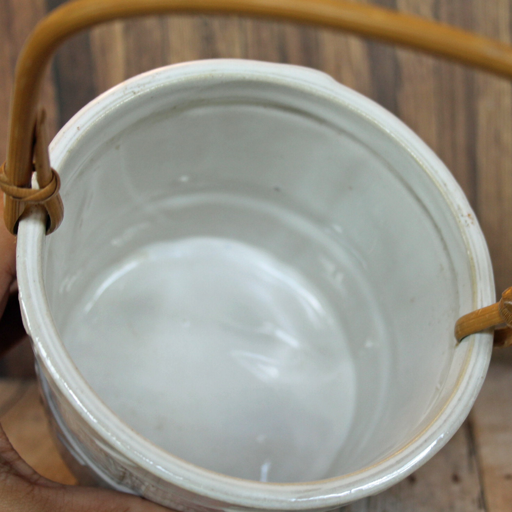 This small white ceramic bucket is 4.5" in diameter and 3.5" tall. It has a bent wood handle attached to each side, when stoood upright makes the overall height 7.5". The bucket has a great wood grain textured design of vertical panels and horizontal bands. It has a light white glaze over a tan ceramic, giving it a whitewashed look. The bottom of the piece is marked C9519.