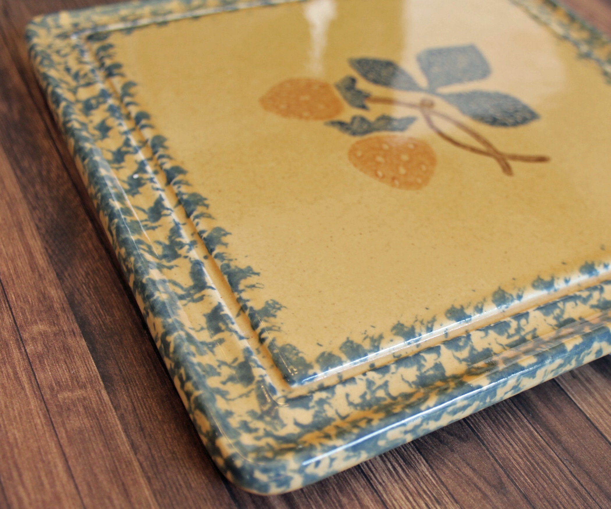 This great ceramic trivet by Pfaltzgraff is 8" square and 1/2" high. It is a cream colored trivet, accented with a blue and red sponge painted design of strawberries, and accented with a blue border. The back is marked: THE STRAWBERRIES OF PERFECTION / TRIVET / THE FRIENDSHIP COLLECTION / PFALTZGRAFF COLLECTIONS / 1995.