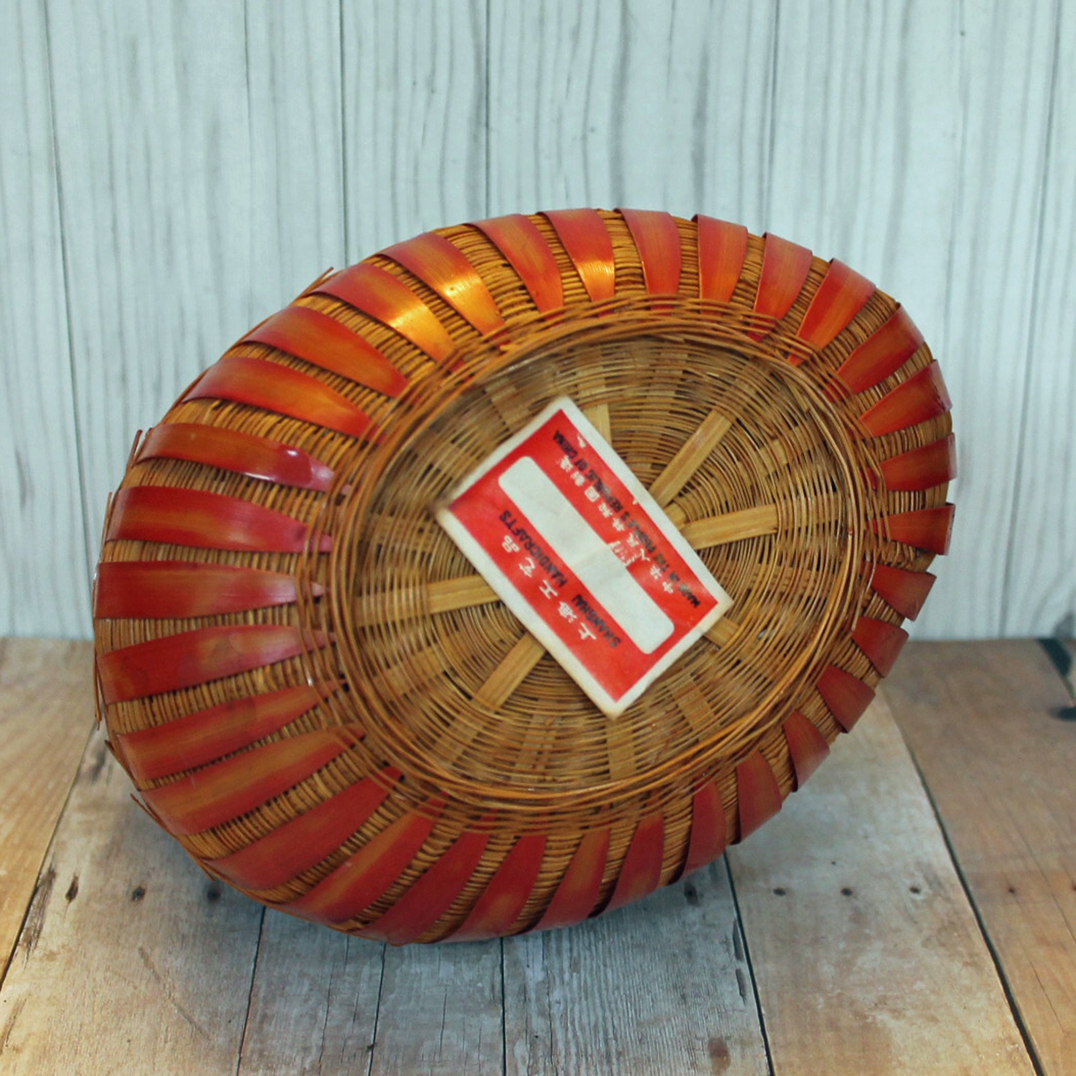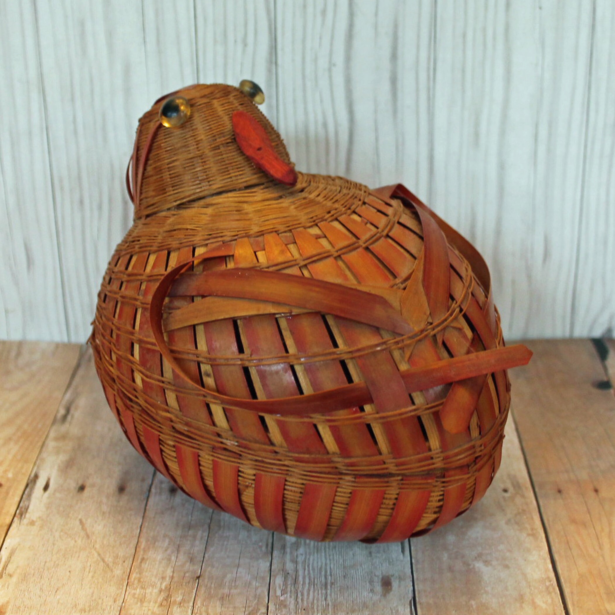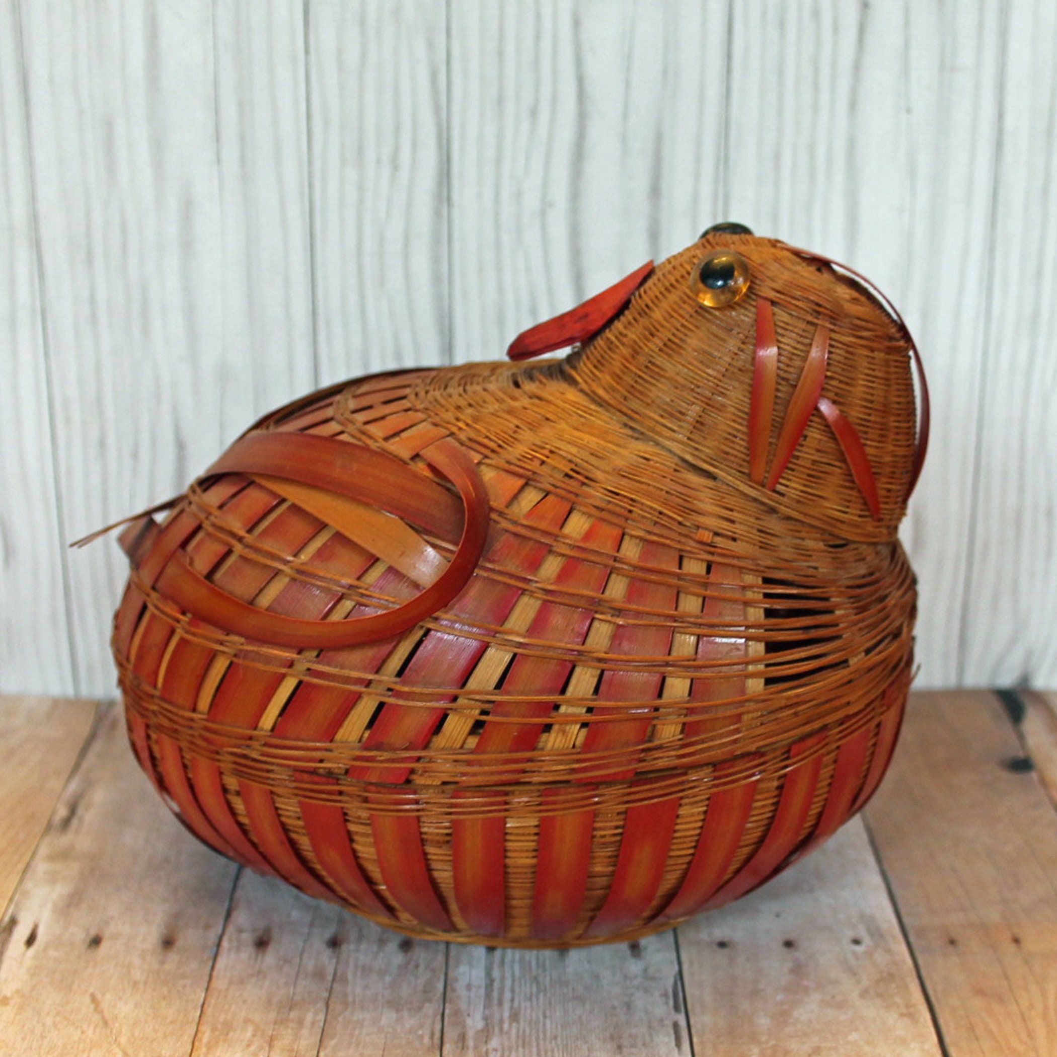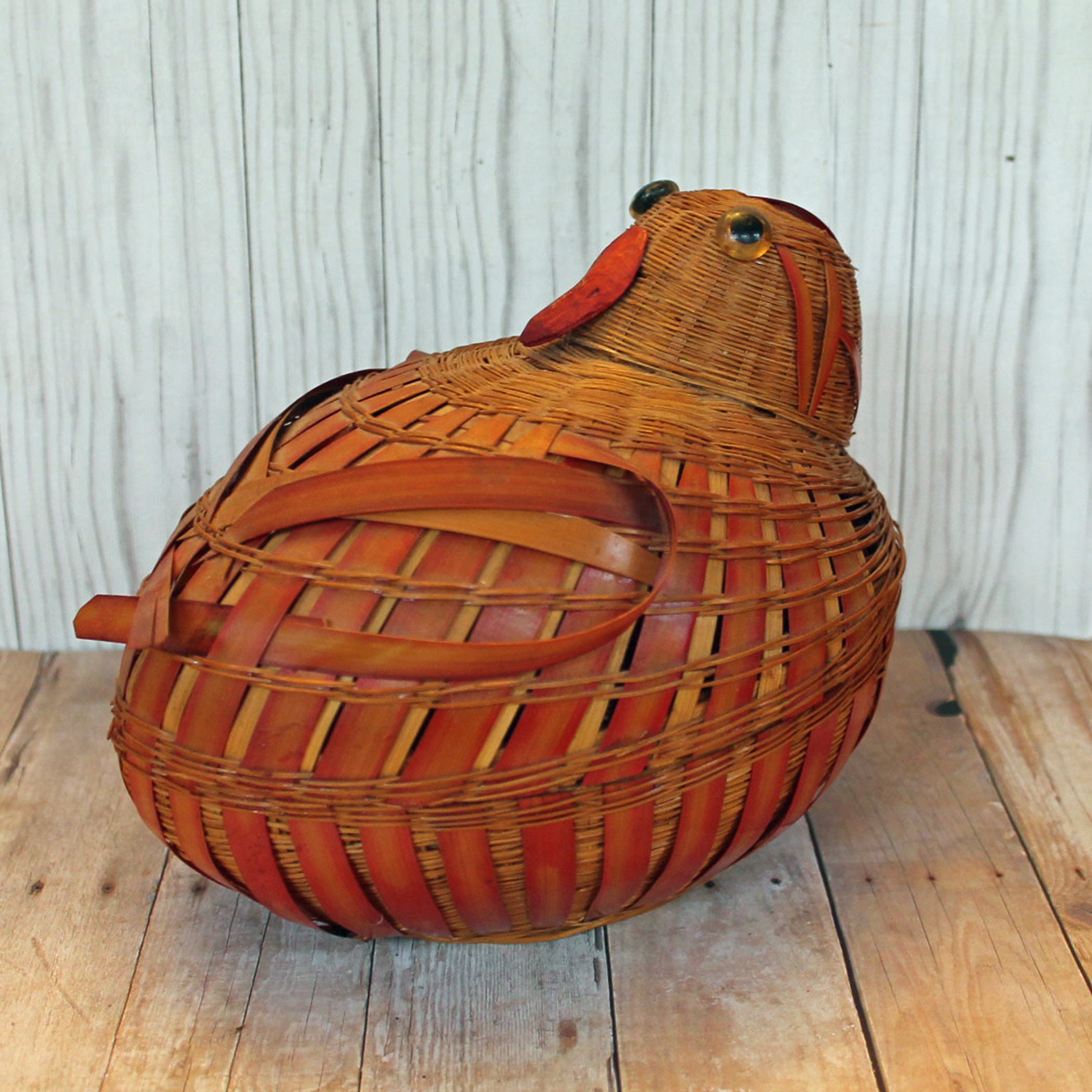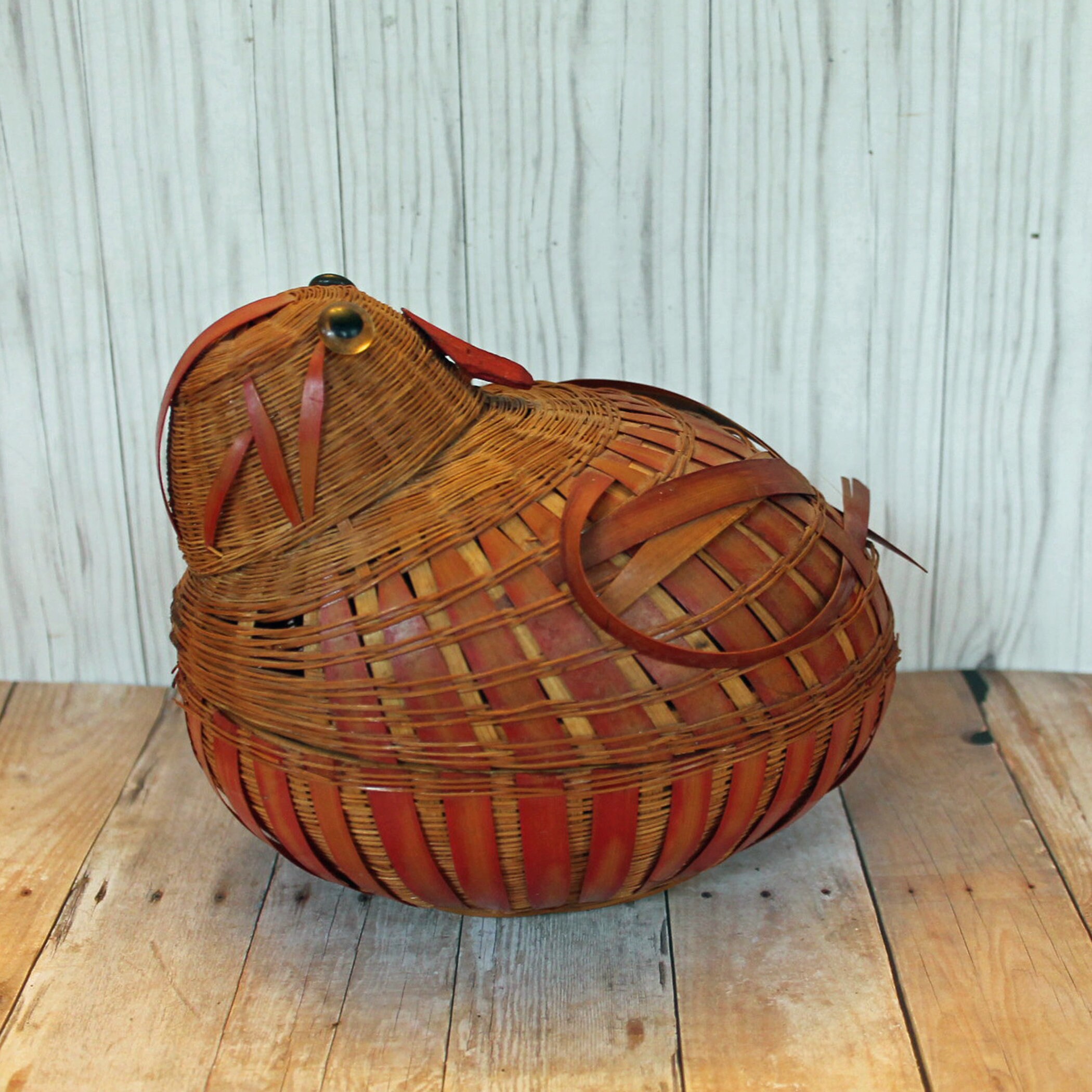 This great bird basket includes a 2 piece bird that measures 6" long by 4.5" wide, and 5" tall. The bird is a tightly woven wicker that has been coated with a clear finish. This cute bird has it's head turned toward it's back, and has plastic eyes that look upward. There is an original label on the bottom that reads: SHANGHAI HANDICRAFTS / MADE IN THE PEOPLES REPUBLIC OF CHINA.