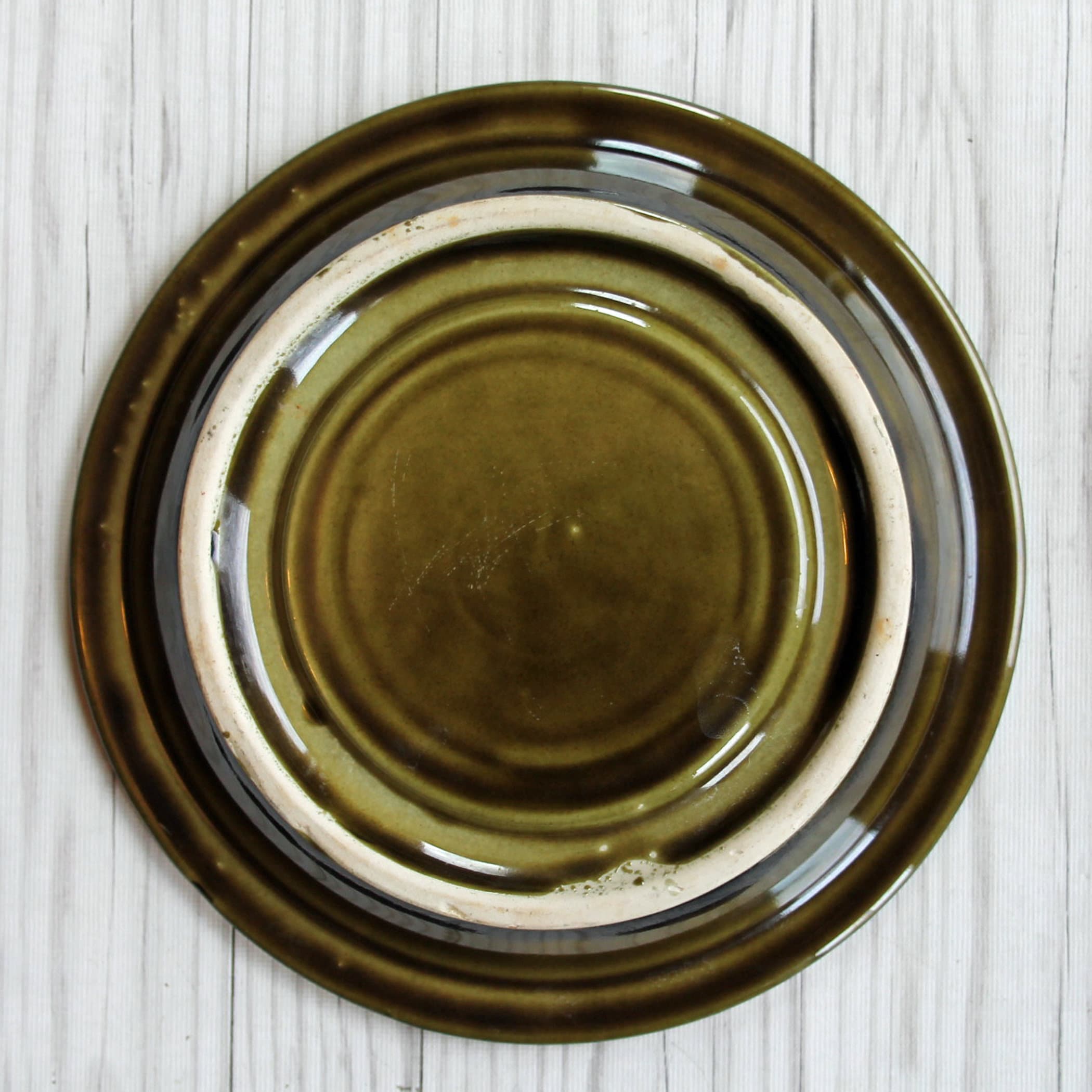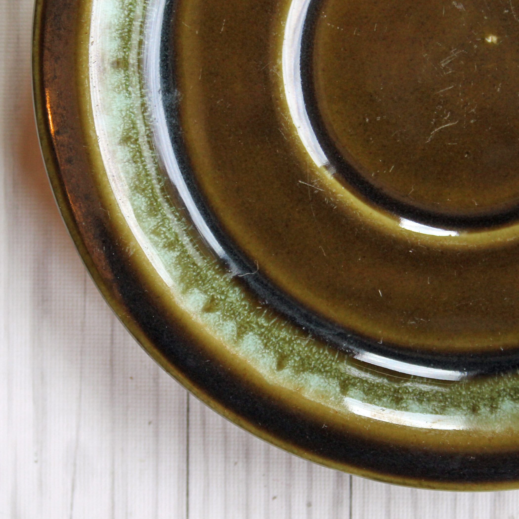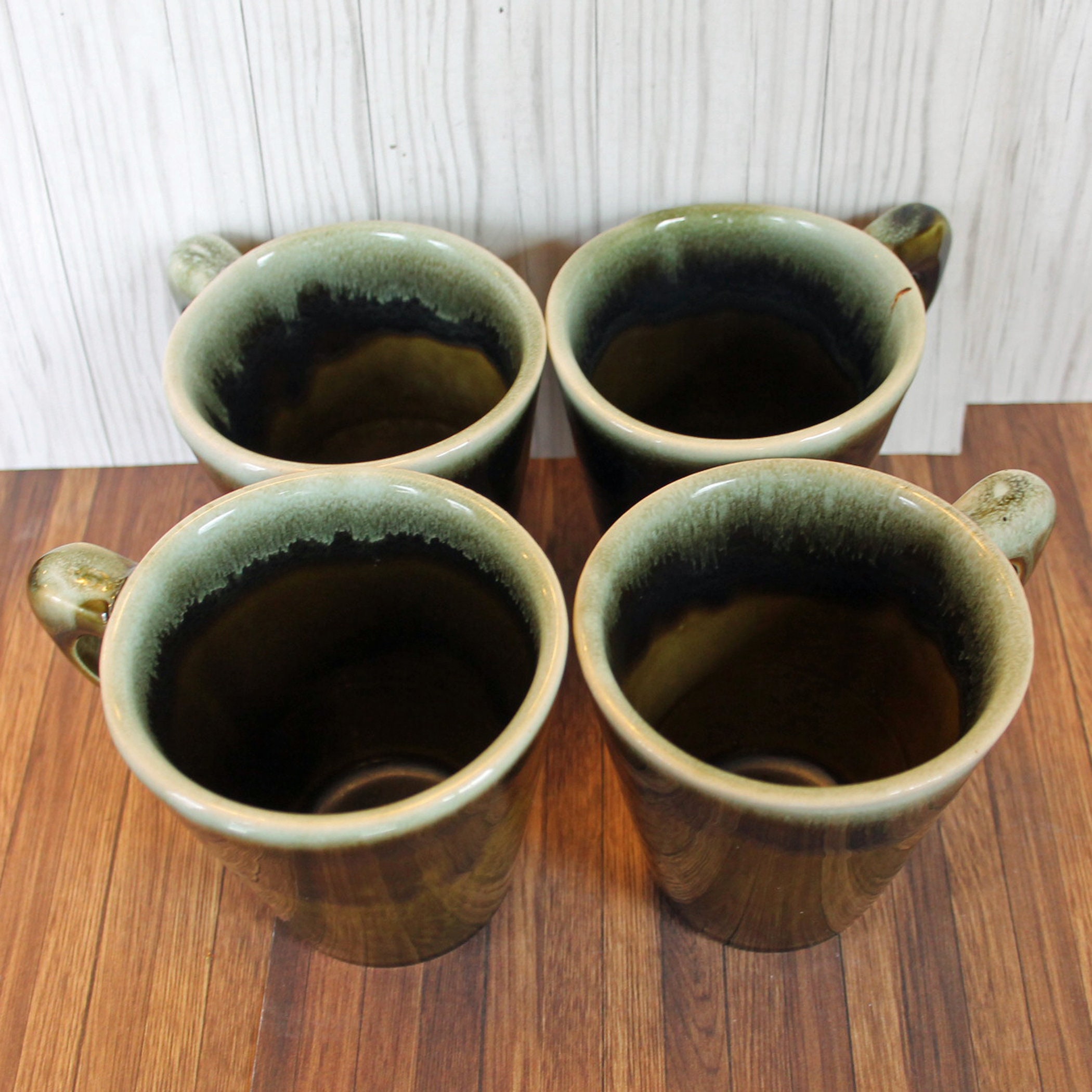 They are all in very good condition with chips or cracks. There are some glaze skips here and there on the mugs, and some light surface scratches on the saucers. Wonderful set of Pfaltzgraff Copper Green!